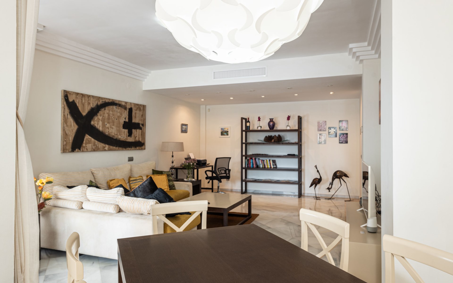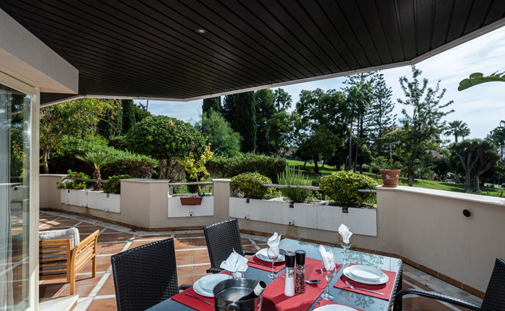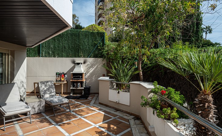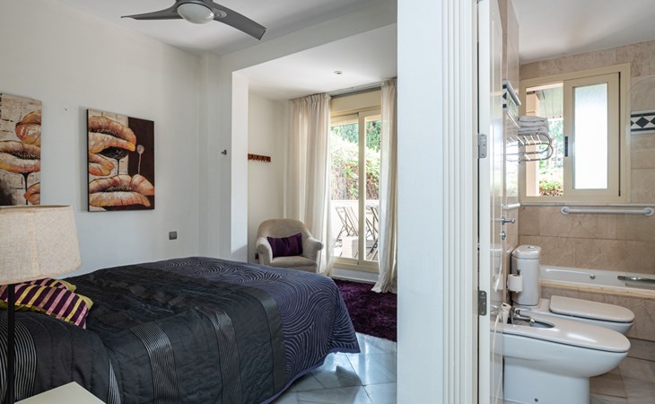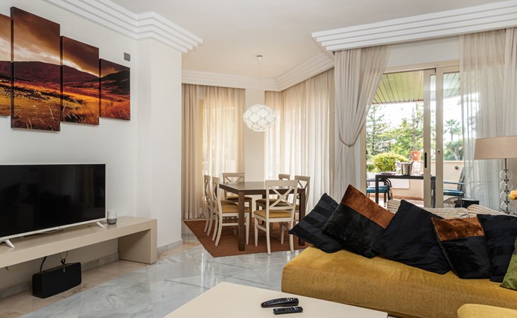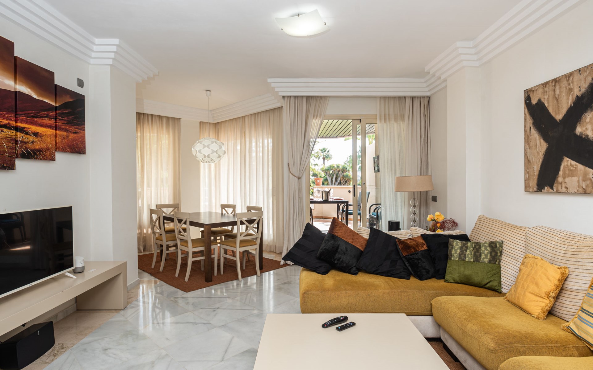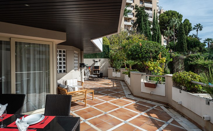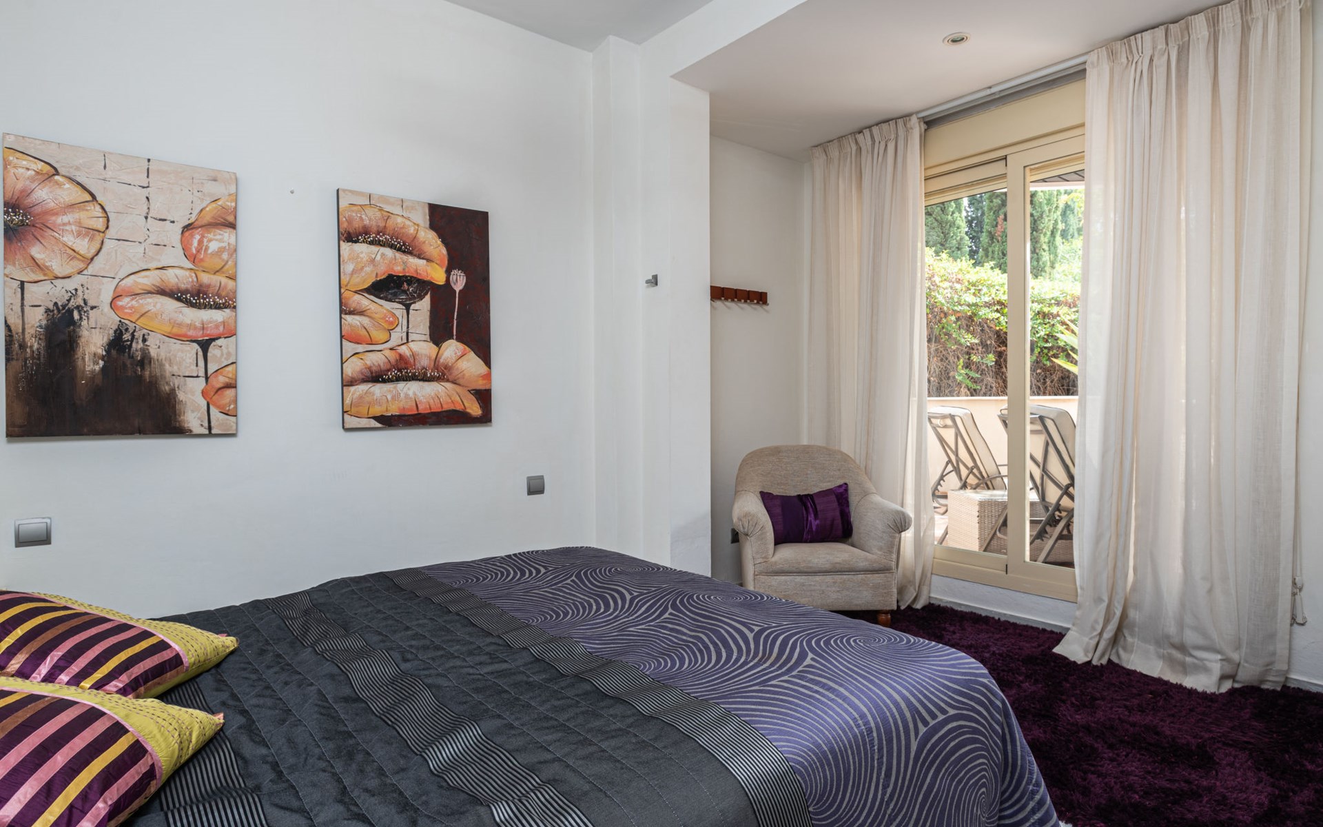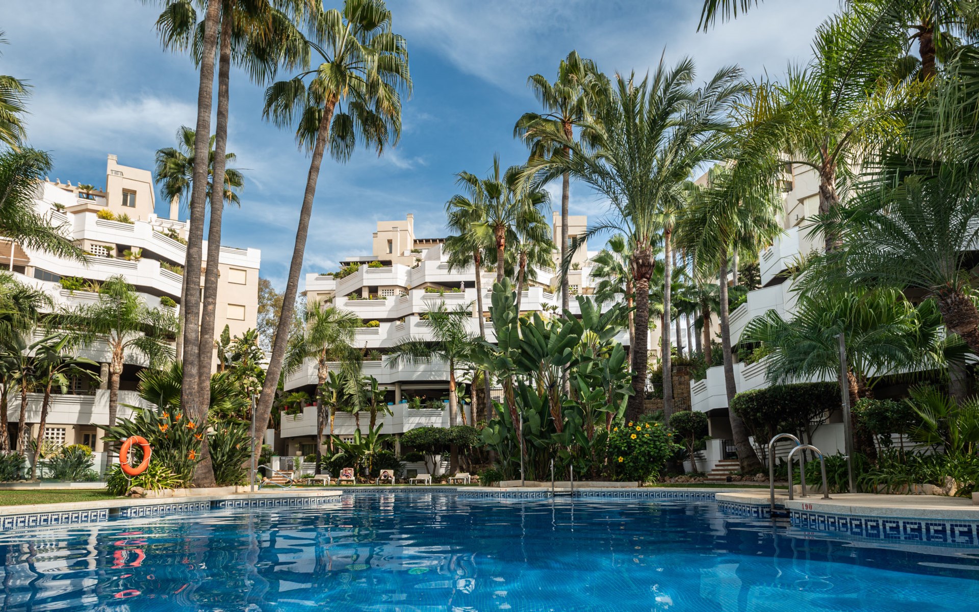 Nueva Andalucia: Cosy, comfortable apartment block "Fuente Aloha". In the resort Nueva Andalucía, 2 km from the centre of Puerto Banús, 7 km from the centre of Marbella, in a quiet, sunny position, 2.3 km from the sea, 2.3 km from the beach. For shared use: property (fenced), garden, 2 swimming pools heated (24 x 10 m, depth 130 - 210 cm, seasonal availability: 01.Jan. - 31.Dec.) with internal staircase. Outdoor shower. In the complex: sauna, fitness room, steam room, relaxation room, lift. Roofed, parking space n 81. Supermarket 500 m, restaurant 100 m, bus stop "Los Dragos" 650 m, sandy beach 1.2 km. Golf course (18 hole) 1.8 km. The owner does not accept any youth groups. There is a heated indoor pool size 8x4 m. depth: 0,8-1,5m.
