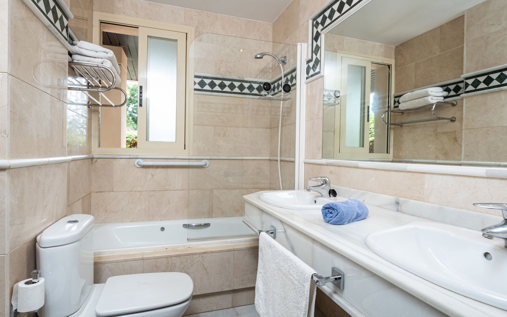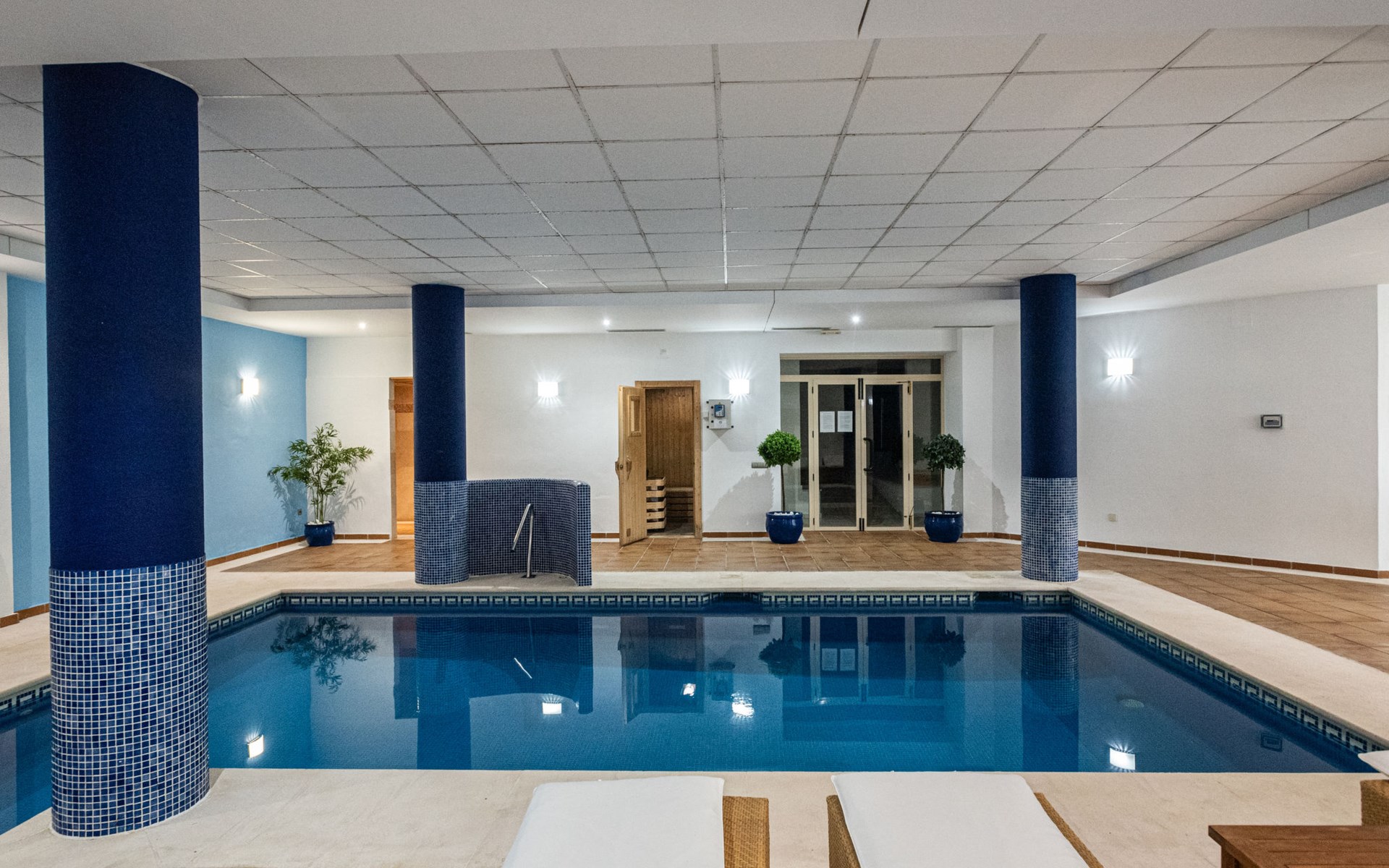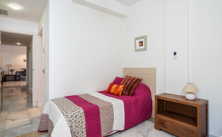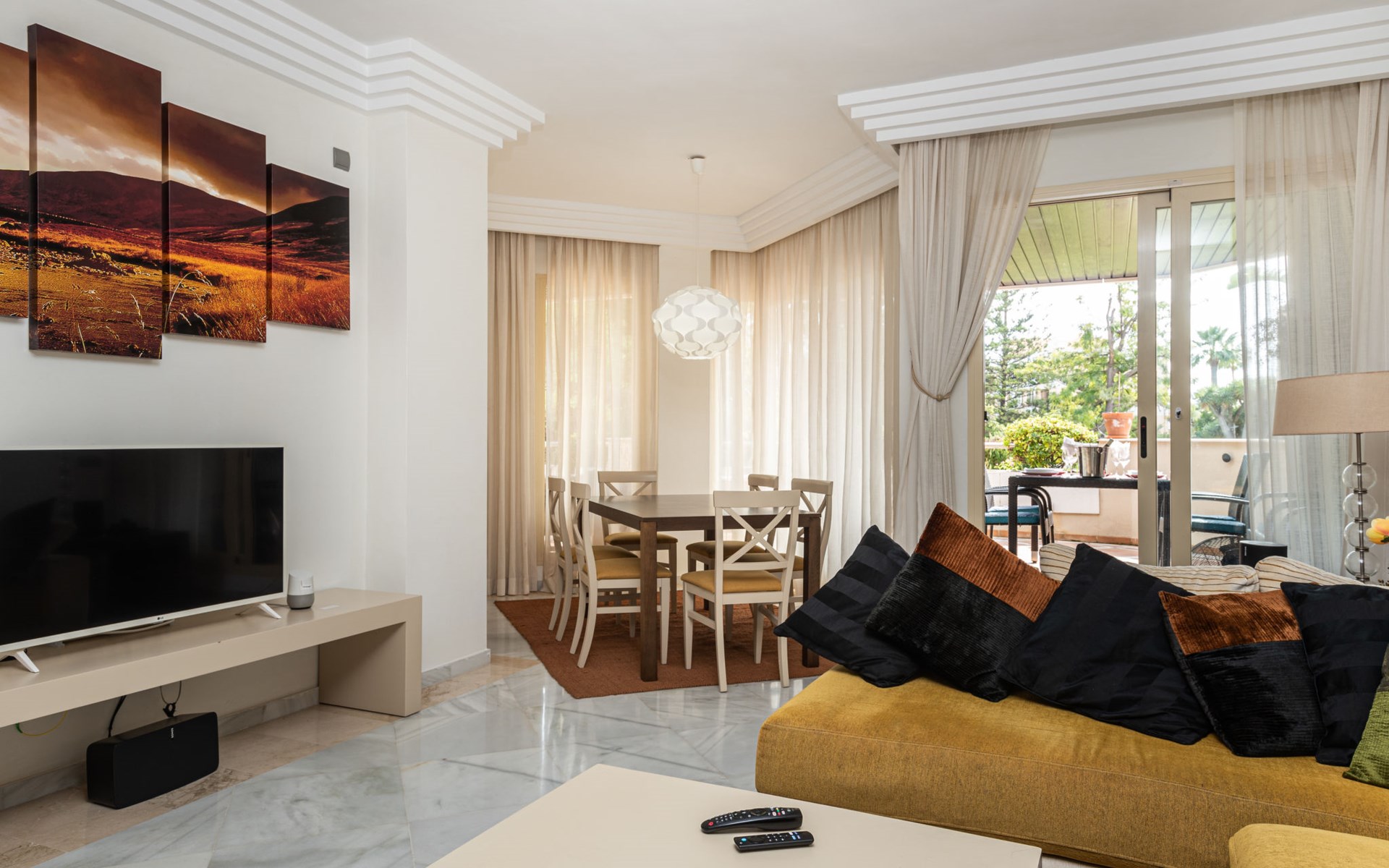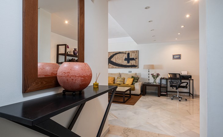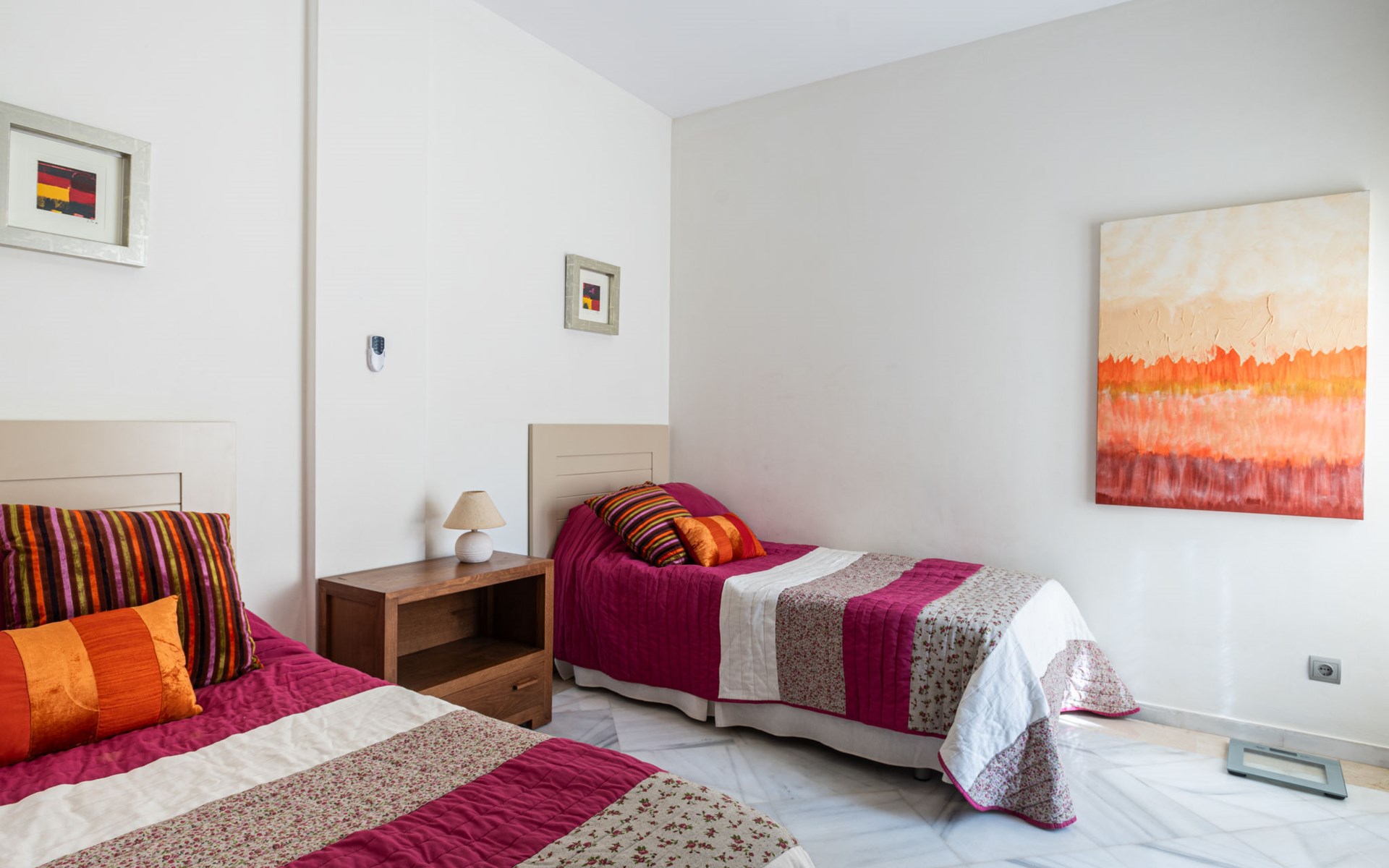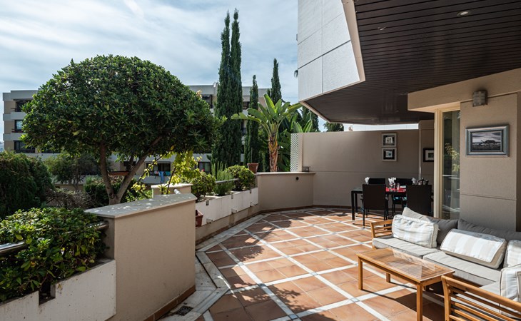 Nueva Andalucia: Cosy, comfortable apartment block "Fuente Aloha". In the resort Nueva Andalucía, 2 km from the centre of Puerto Banús, 7 km from the centre of Marbella, in a quiet, sunny position, 2.3 km from the sea, 2.3 km from the beach. For shared use: property (fenced), garden, 2 swimming pools heated (24 x 10 m, depth 130 - 210 cm, seasonal availability: 01.Jan. - 31.Dec.) with internal staircase. Outdoor shower. In the complex: sauna, fitness room, steam room, relaxation room, lift. Roofed, parking space n 81. Supermarket 500 m, restaurant 100 m, bus stop "Los Dragos" 650 m, sandy beach 1.2 km. Golf course (18 hole) 1.8 km. The owner does not accept any youth groups. There is a heated indoor pool size 8x4 m. depth: 0,8-1,5m.