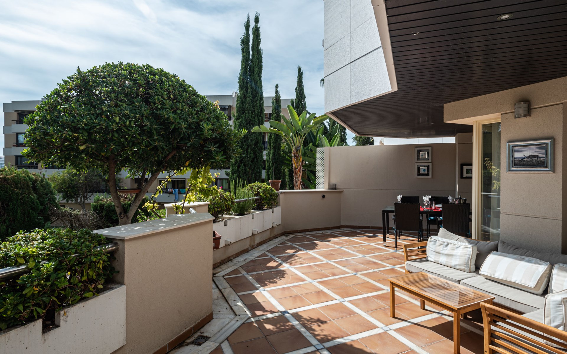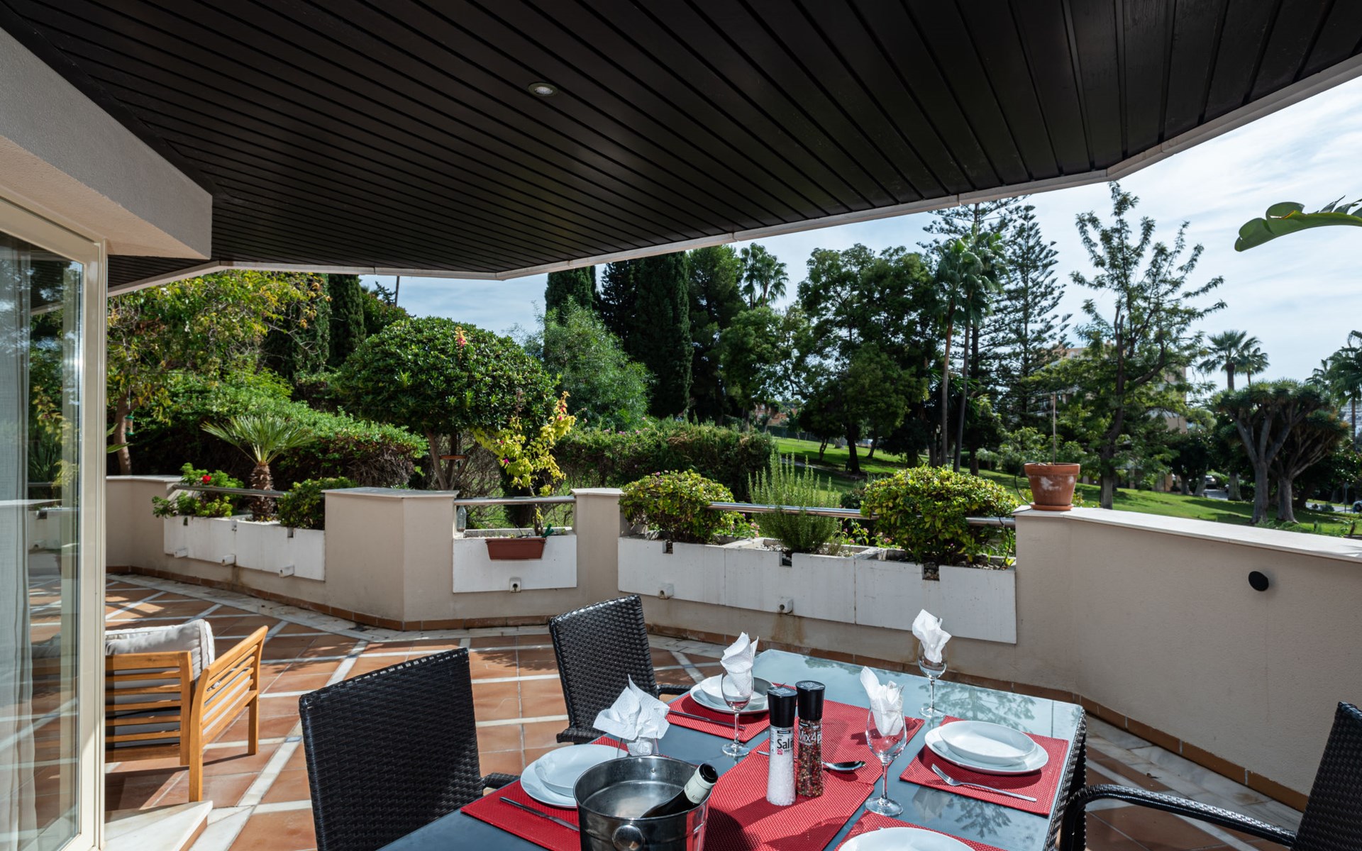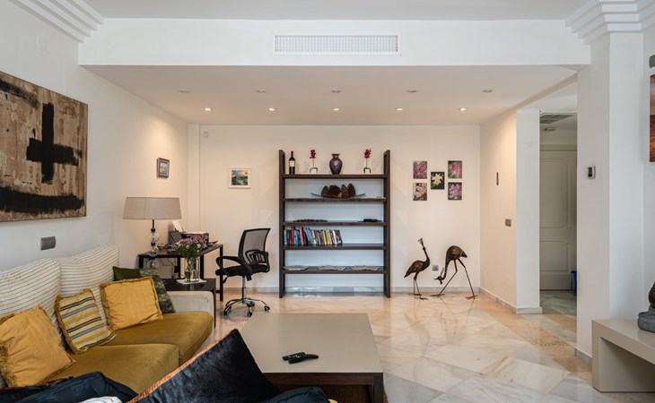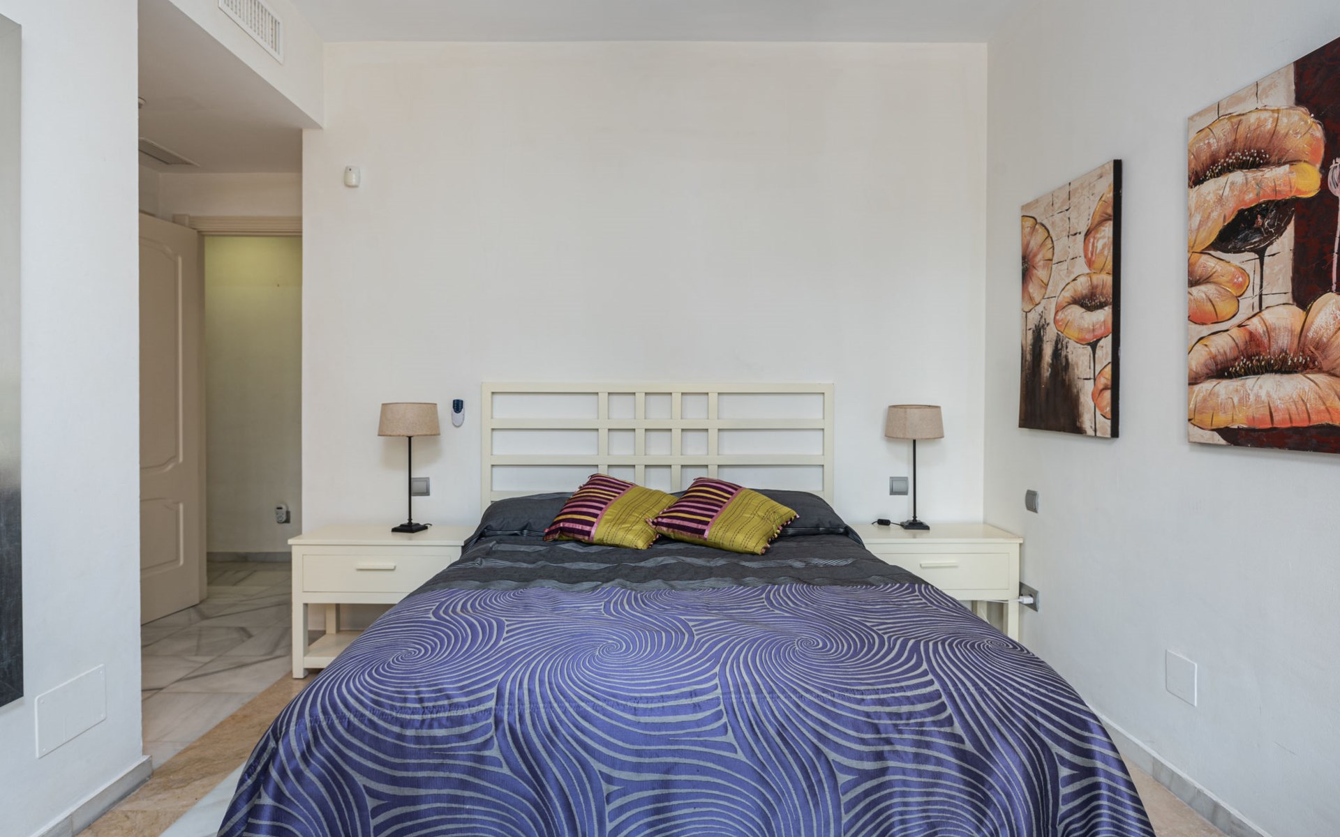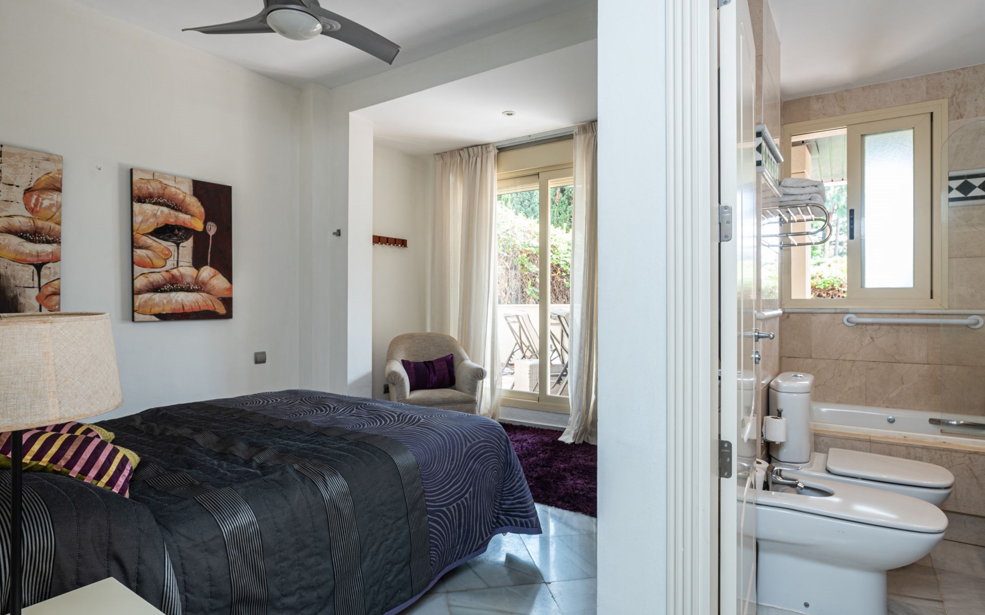 Nueva Andalucia: Cosy, comfortable apartment block "Fuente Aloha". In the resort Nueva Andalucía, 2 km from the centre of Puerto Banús, 7 km from the centre of Marbella, in a quiet, sunny position, 2.3 km from the sea, 2.3 km from the beach. For shared use: property (fenced), garden, 2 swimming pools heated (24 x 10 m, depth 130 - 210 cm, seasonal availability: 01.Jan. - 31.Dec.) with internal staircase. Outdoor shower. In the complex: sauna, fitness room, steam room, relaxation room, lift. Roofed, parking space n 81. Supermarket 500 m, restaurant 100 m, bus stop "Los Dragos" 650 m, sandy beach 1.2 km. Golf course (18 hole) 1.8 km. The owner does not accept any youth groups. There is a heated indoor pool size 8x4 m. depth: 0,8-1,5m.