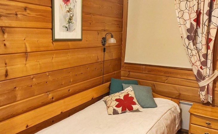27 km north of Kuusamo, Vuosseli (Eastern Ruka, Vuosseli parking place) 1.2 km. Semi-detached log cottage, built in 2002. Bedroom 1 (downstairs): doublebed, bedroom 2 (downstairs): 1 bed. Loft: 2 beds, bedroom (loft): doublebed. Combined kitchen/living room, electric sauna. Carport and lockable storage.