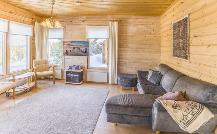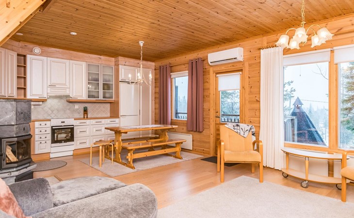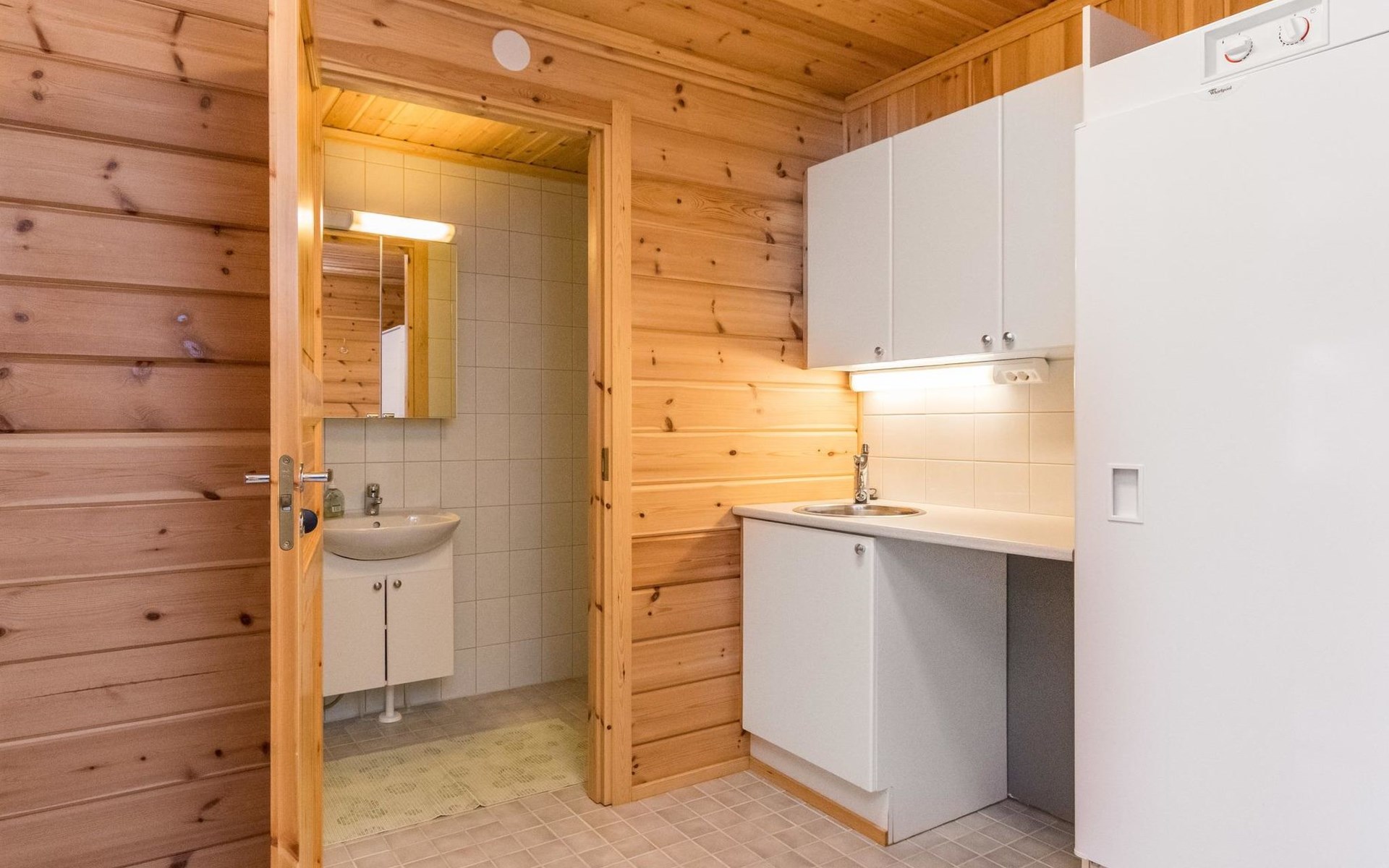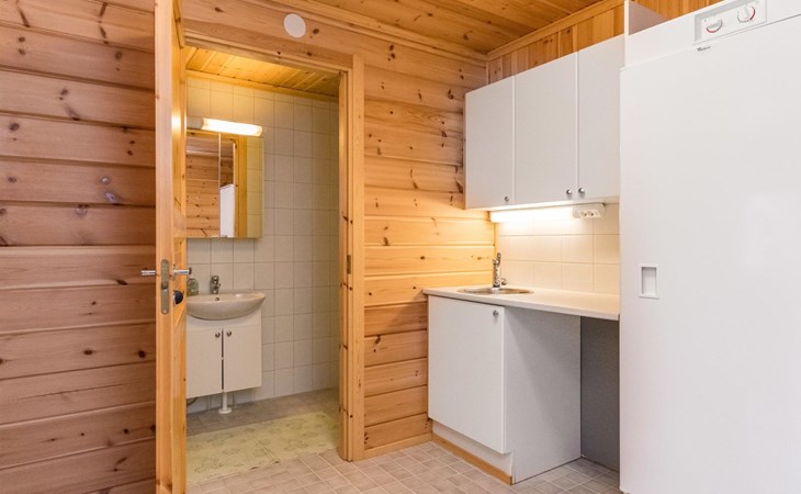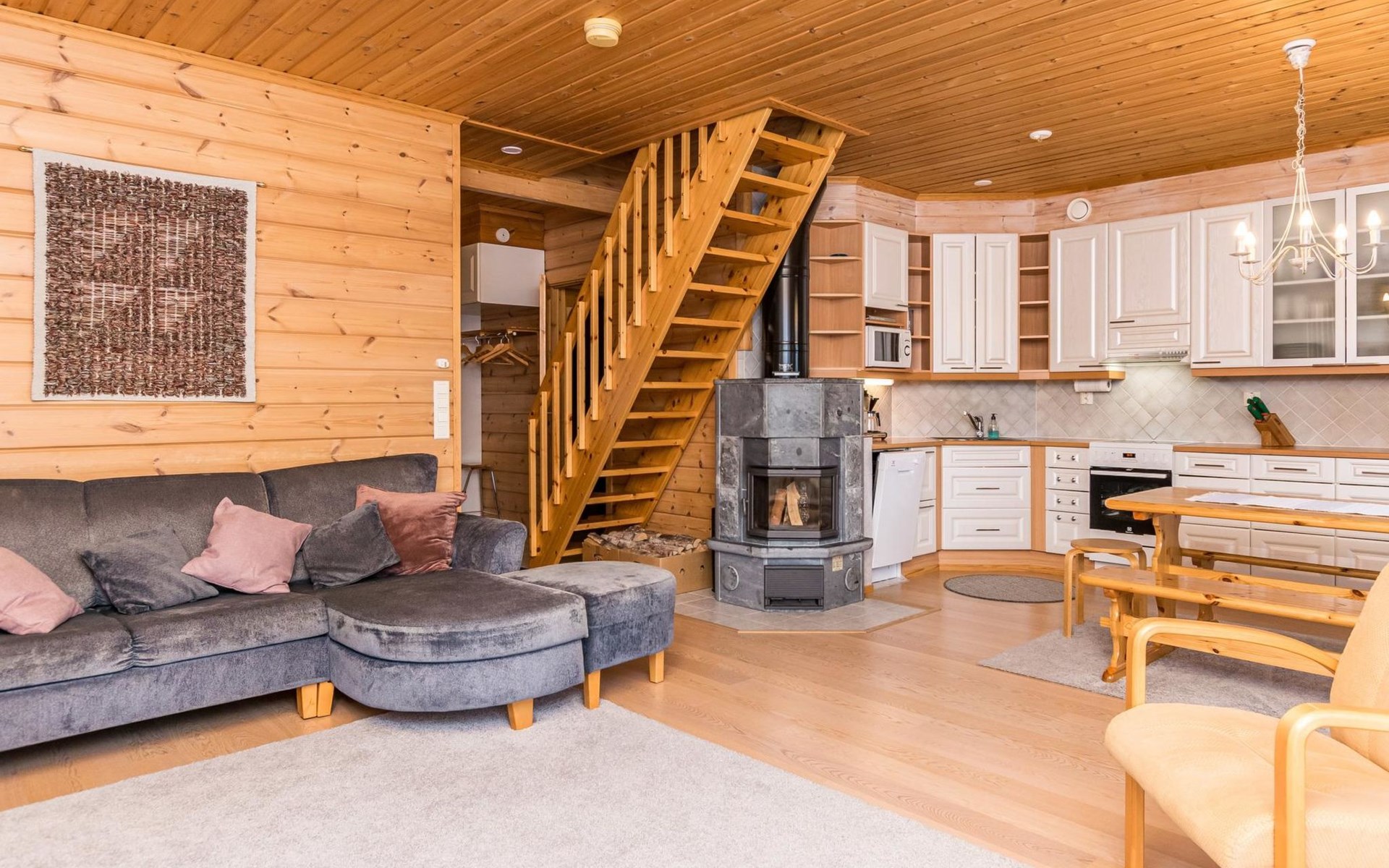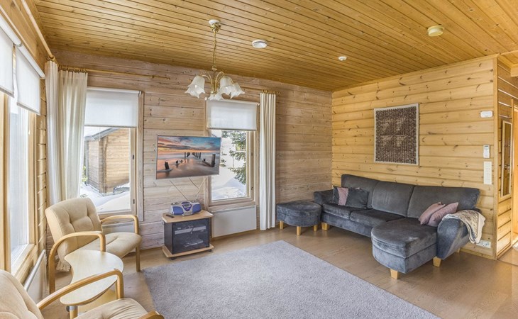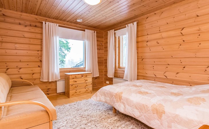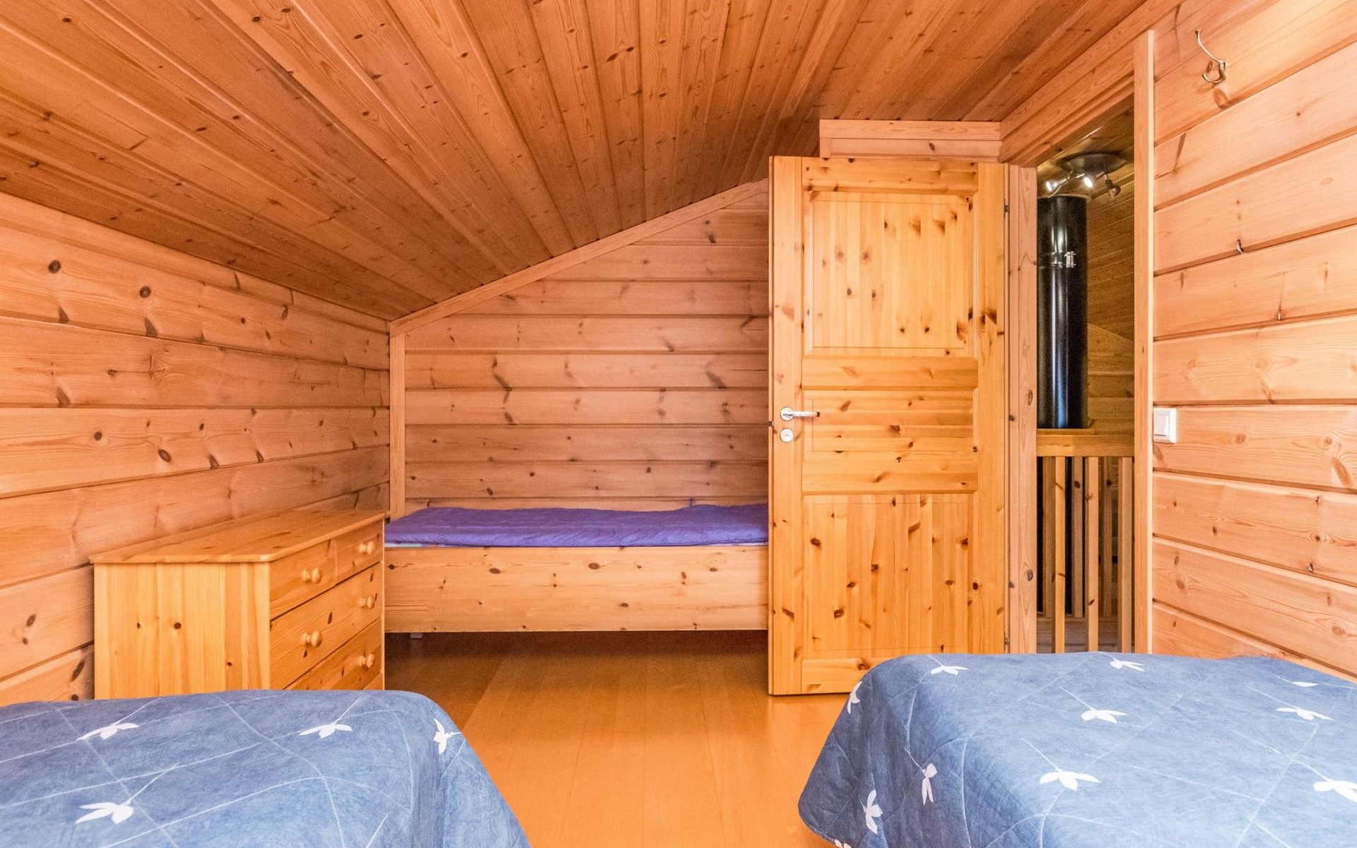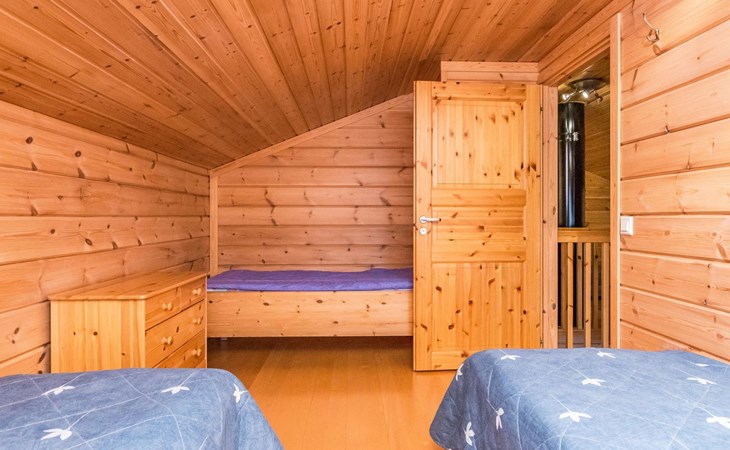 A semi-detached house built with love in 2002. Master bedroom with double bed downstairs. Bedrooms 2 and 3 upstairs, each with two beds. There is a bed in the upstairs hall and an additional sofabed/mattress. The room height upstairs is partly lower than normal. Open kitchen, living room, pantry, washroom, two toilets, electric sauna. Note: the refrigerator includes a freezer compartment.