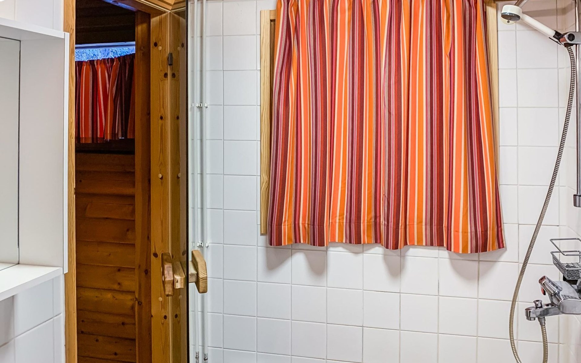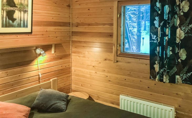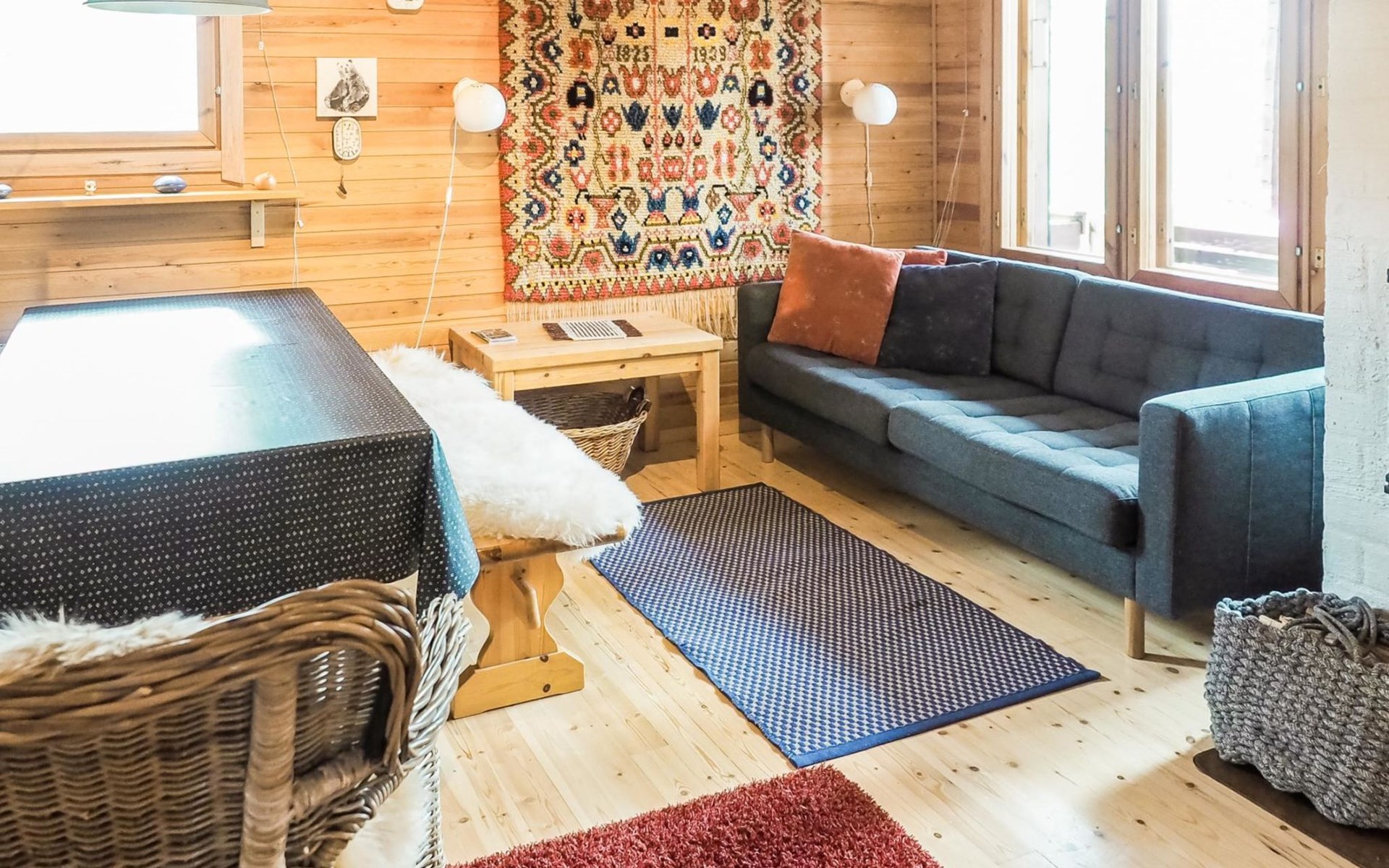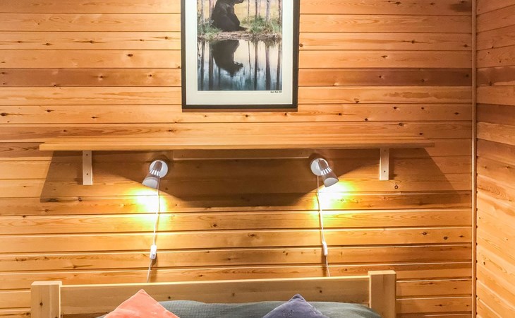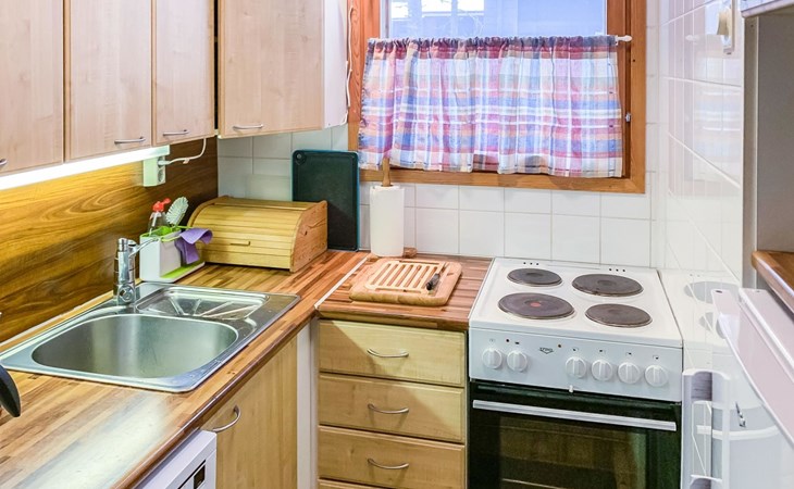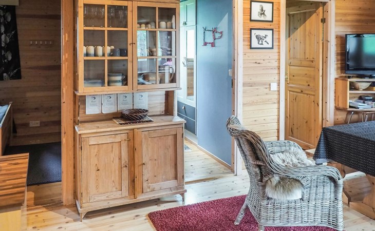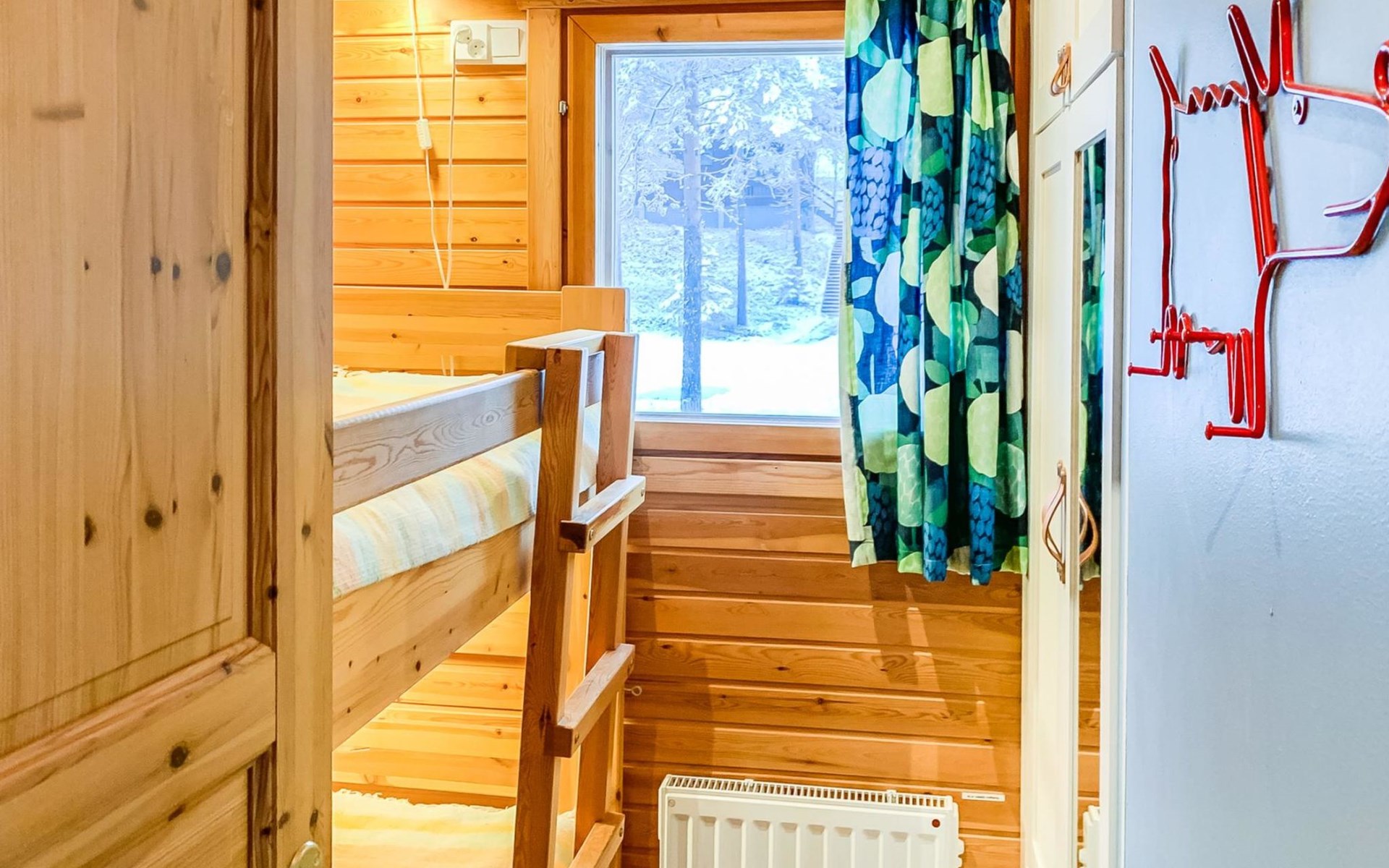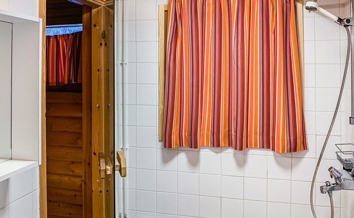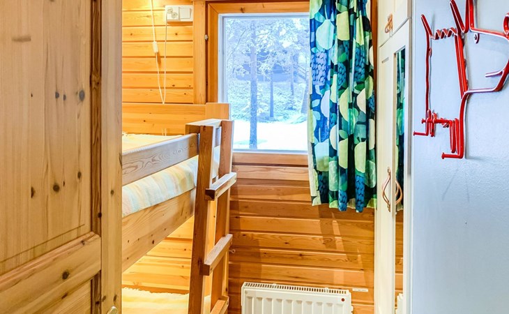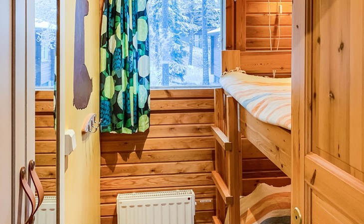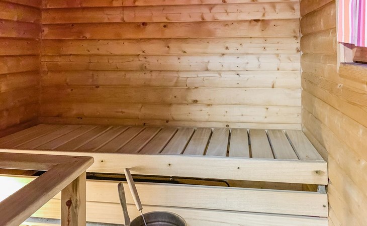 Living room and kitchenette, 3 bedrooms, one with double bed, 2 with bunk beds. Separate toilette and sauna/bathroom. Terrace.
