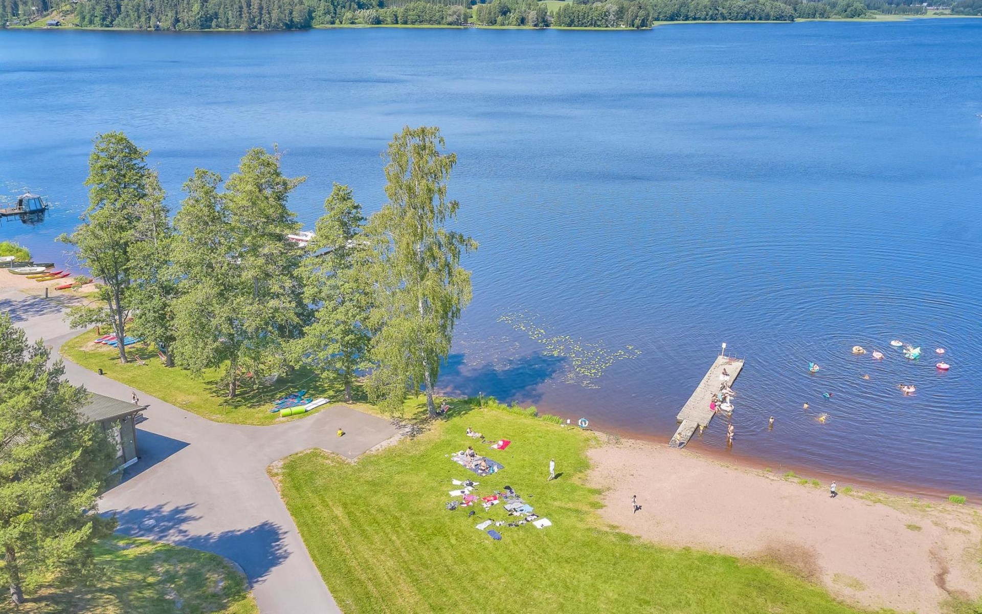 Lake Lohjanjärvi is approx. 150 meters away, offering a shared swimming beach with a gradually deepening sandy bottom. In summer, a lakeside kiosk serves pizza, allowing you to enjoy lake views. A lakeside sauna and grill hut can also be rented separately.