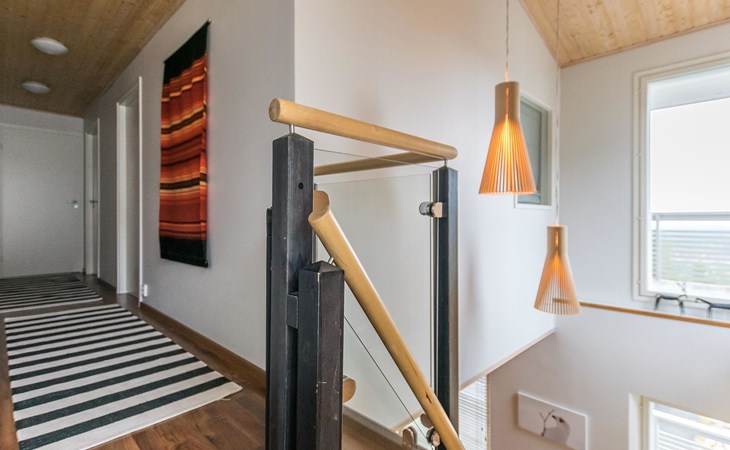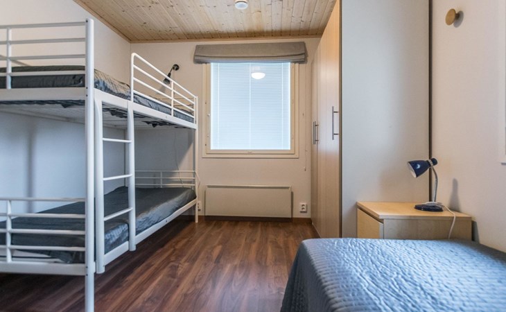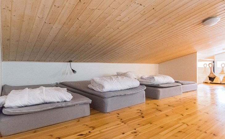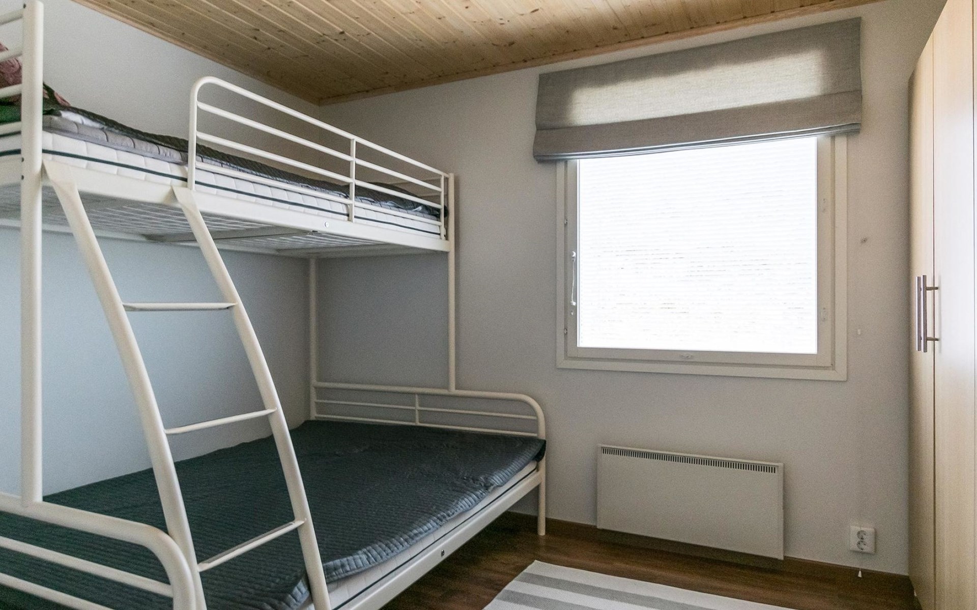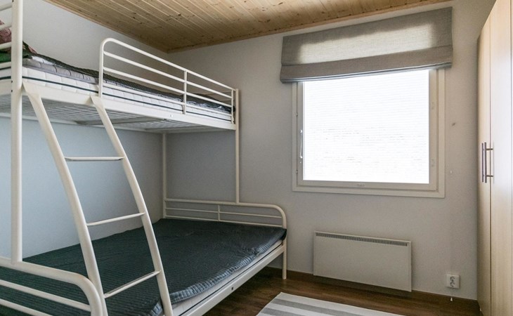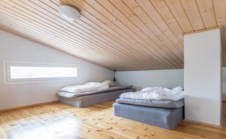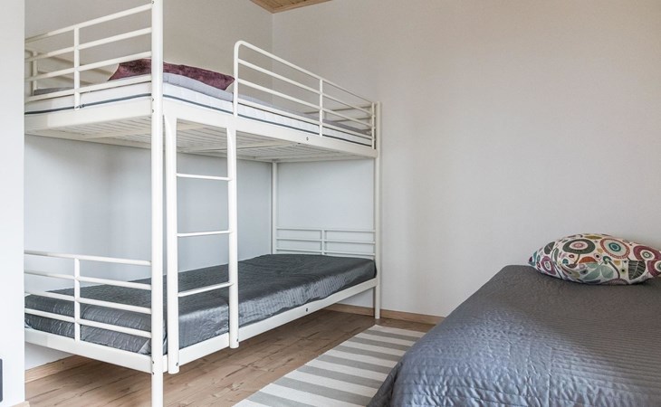Upstairs there is a toilet and shower, two bedrooms with two separate beds, one bedroom with bunk bed (lower bed 140*200cm, upper bed 90*200cm) and one bedroom with bunk bed and separate bed.