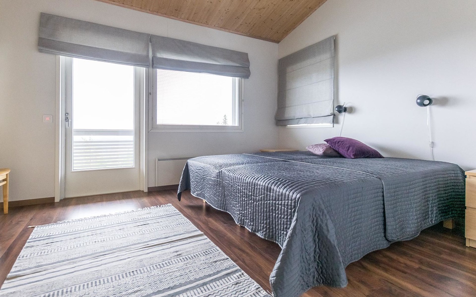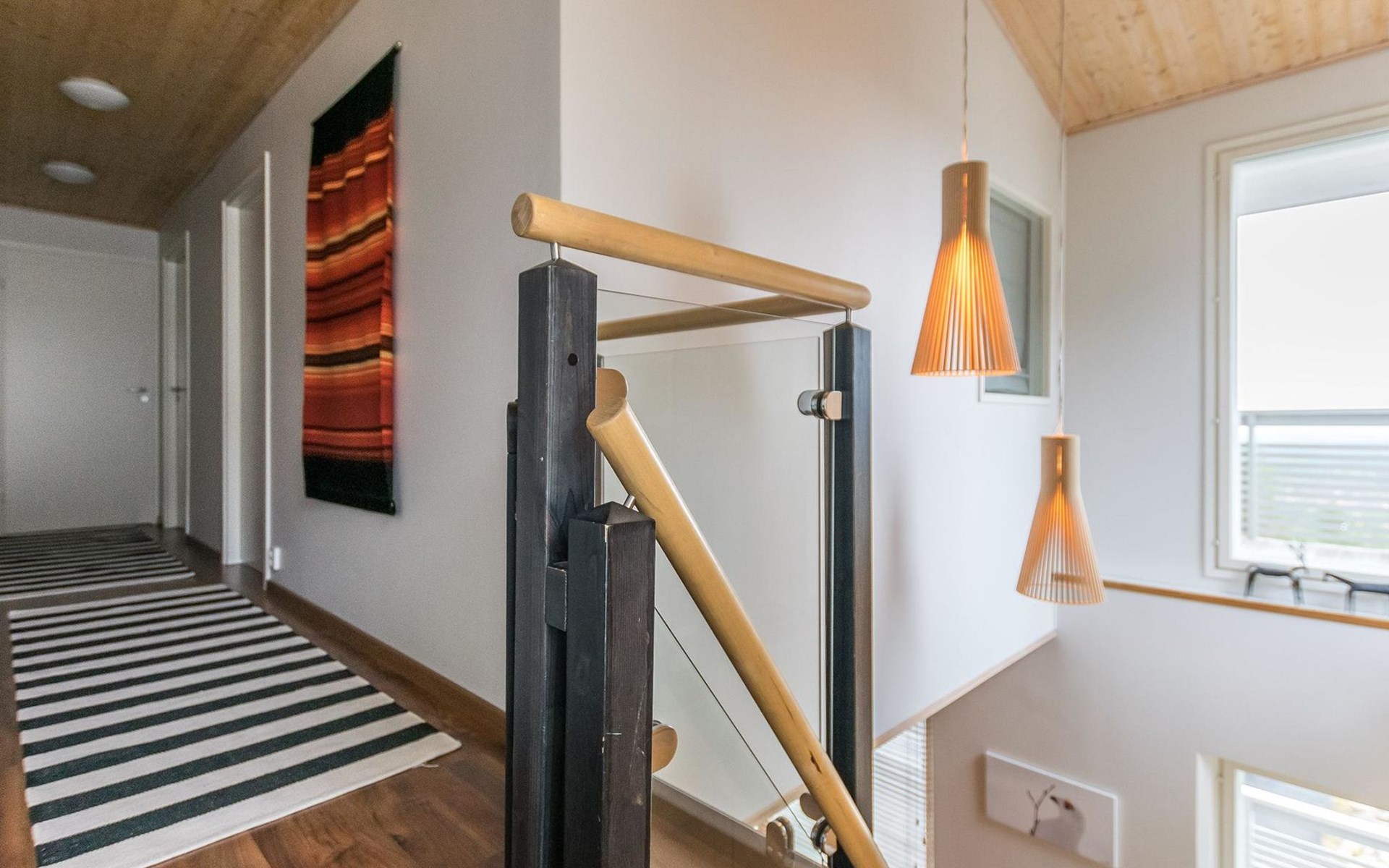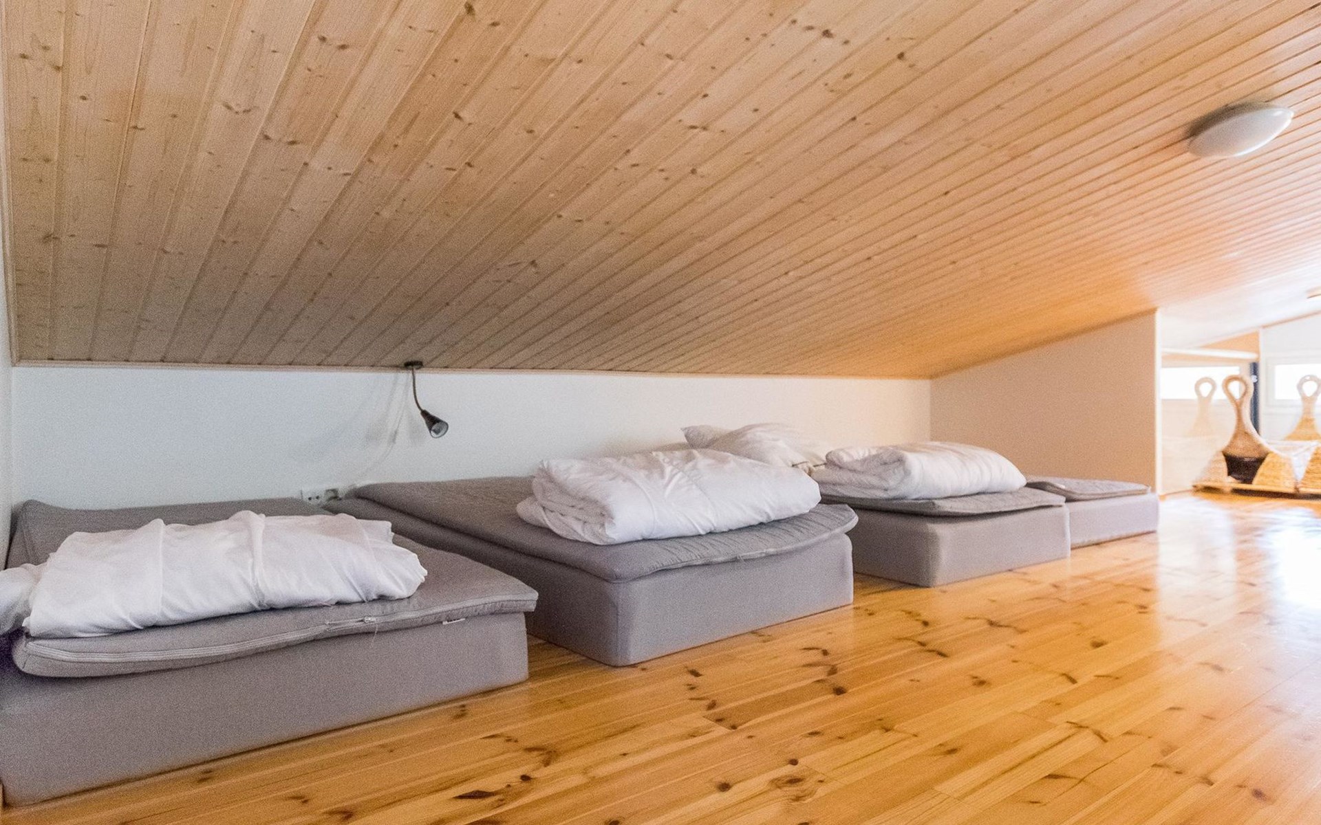 Upstairs there is a toilet and shower, two bedrooms with two separate beds, one bedroom with bunk bed (lower bed 140*200cm, upper bed 90*200cm) and one bedroom with bunk bed and separate bed.