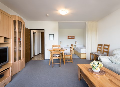 The apartment is furnished as you would want your own home: practical, cozy, and fully equipped. In the living room, there is a spacious seating area for five people, including a comfortable sofa bed and a separate armchair.