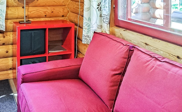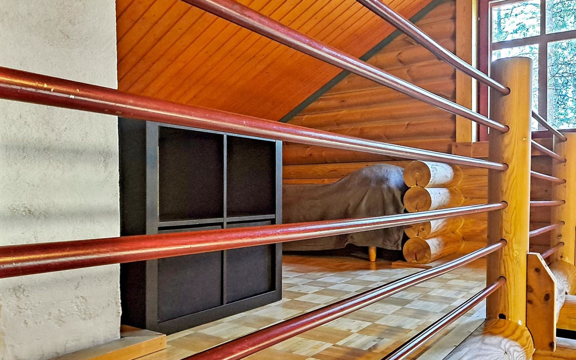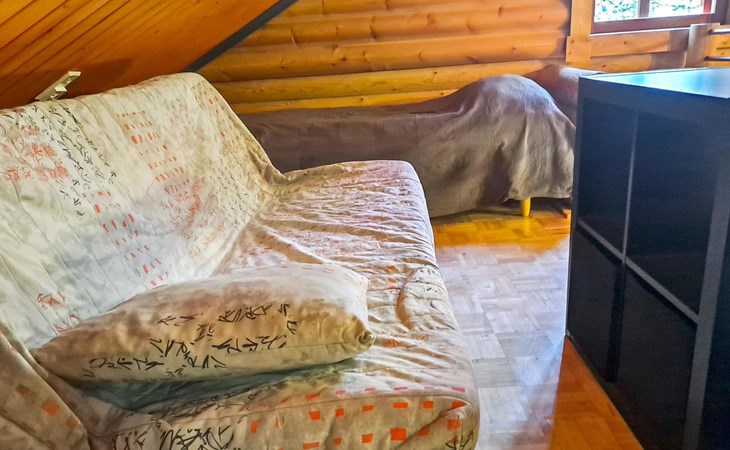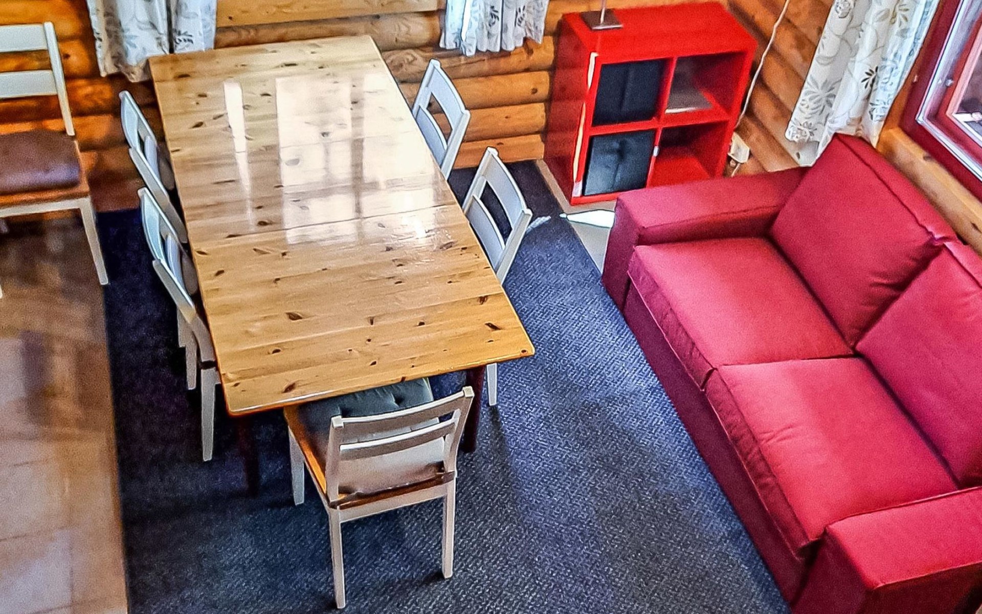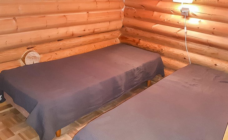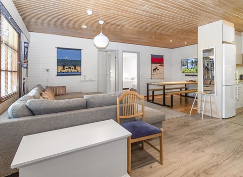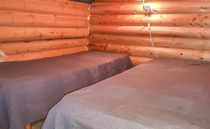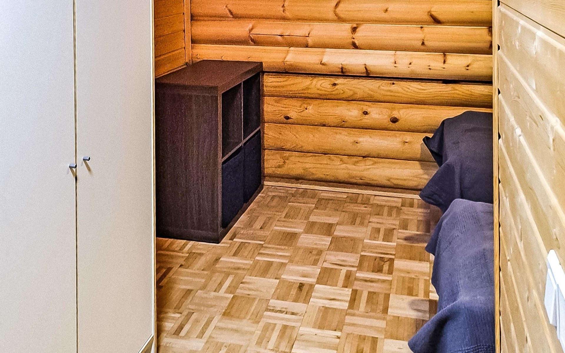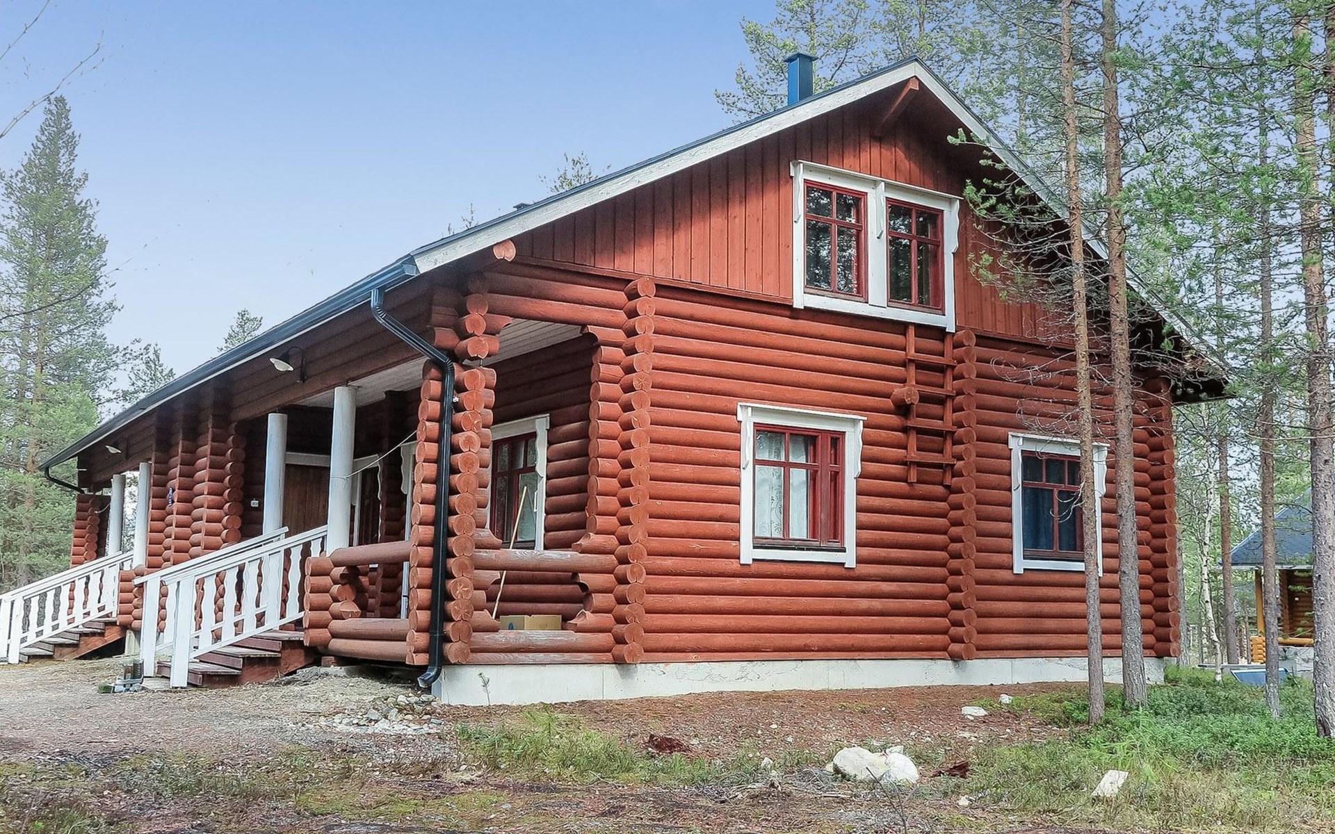 Apartment in log-built semi-detached house 2001, living room 2 extra beds, cooking recess, 2 bedrooms 2 beds in each, spacious sleeping loft with 4 beds, sauna, washroom, open porch, one toilet in downstairs and one in upstairs.