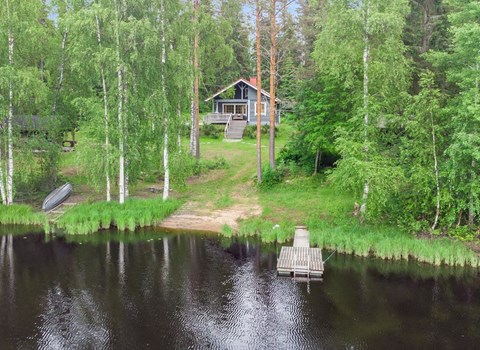 Upstairs bedroom with double bed (160*200cm), loft with two 140cm wide beds. Two TVs in the cabin, one downstairs and one upstairs. The cottage comfortably accommodates 4 to 6 people.