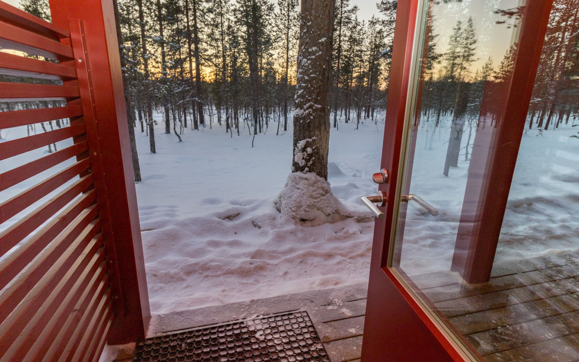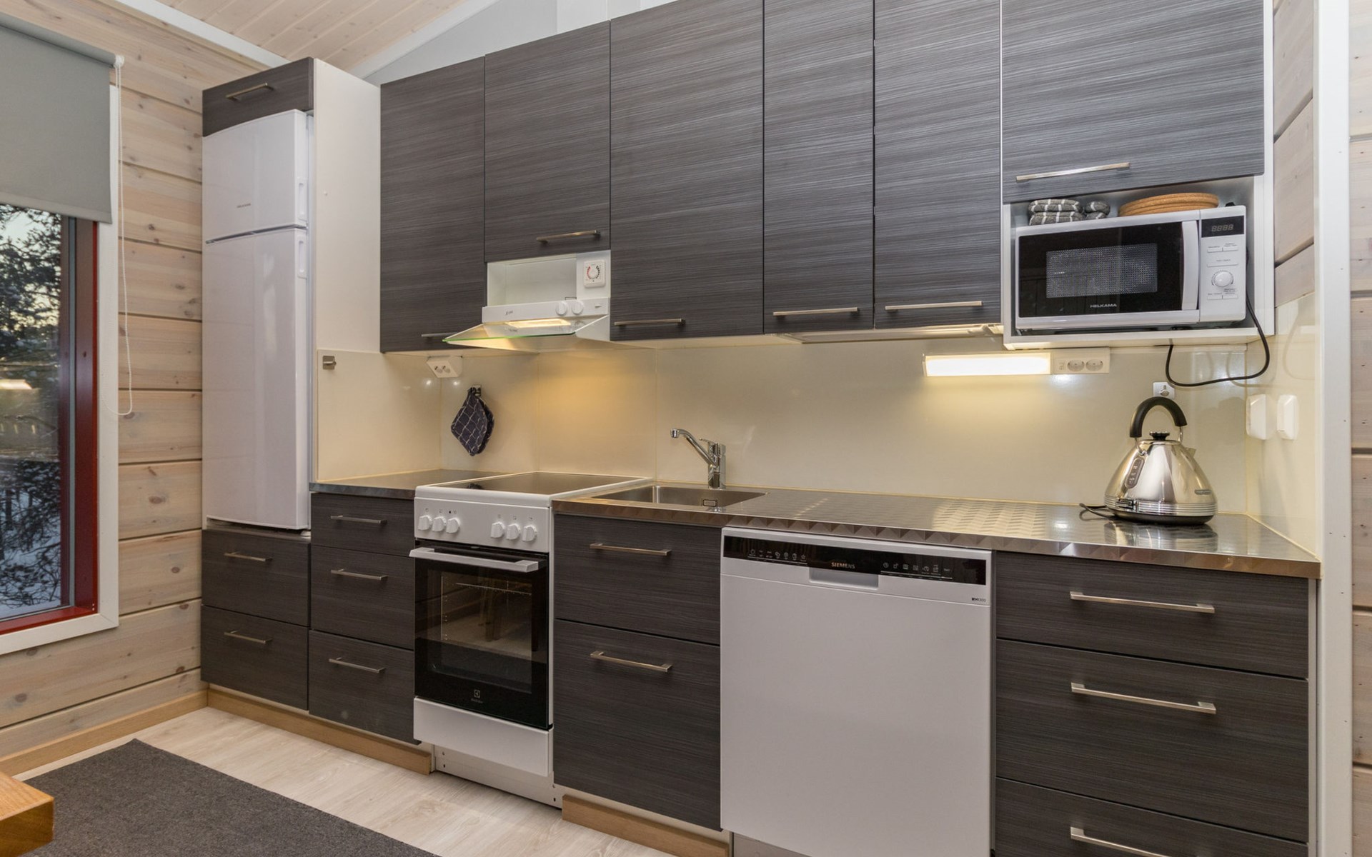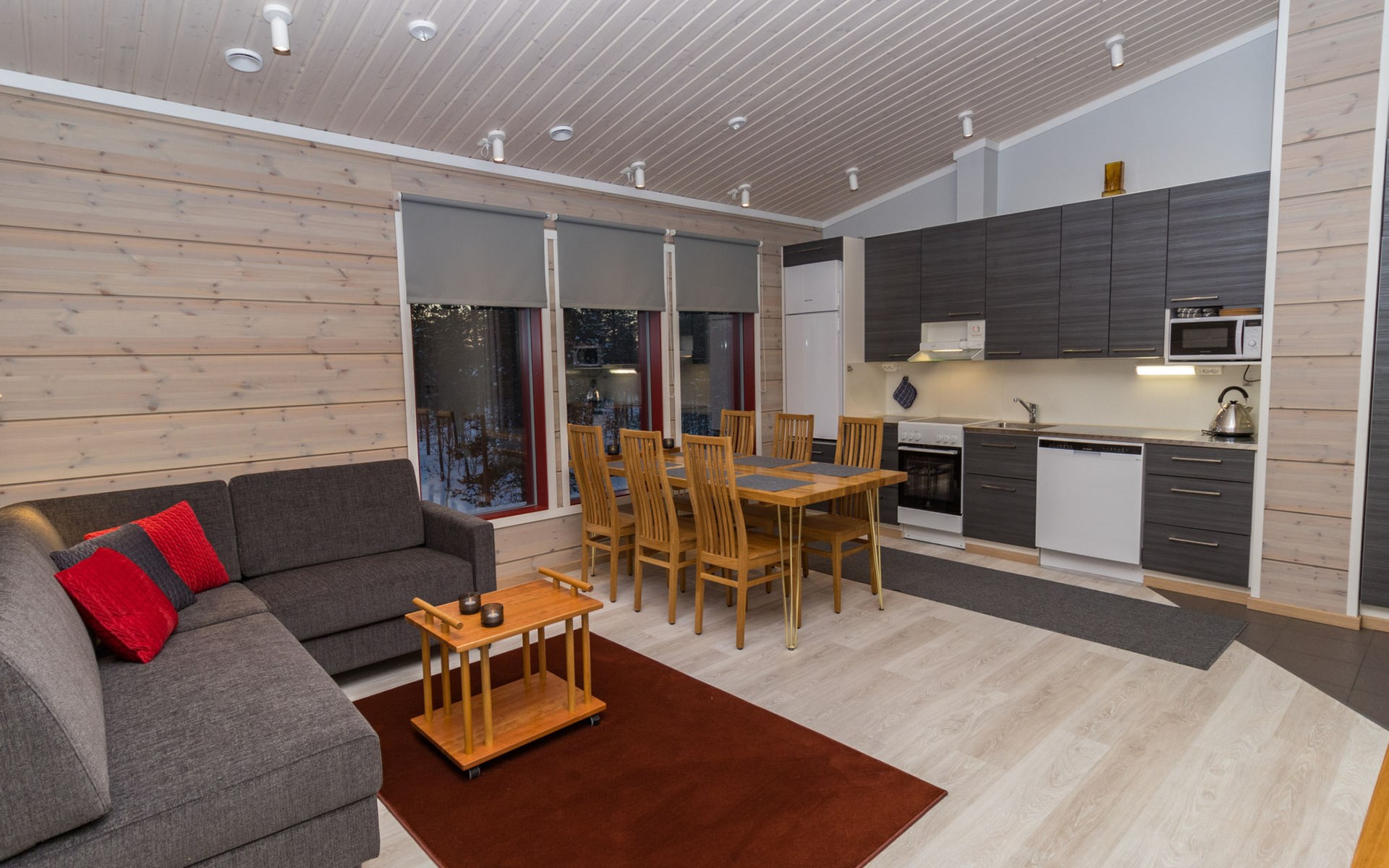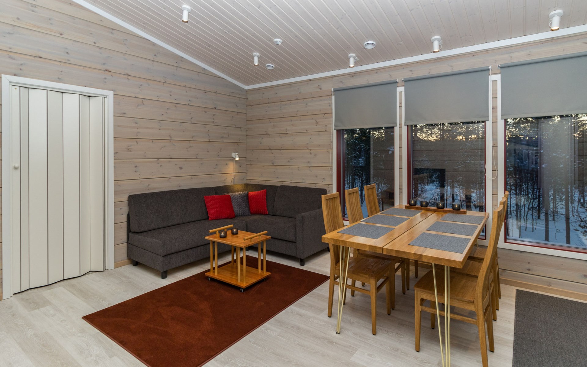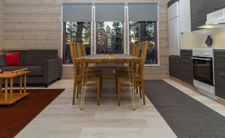 The cozy living room/kitchen is designed for shared moments. You can prepare delicious meals and relax in the spacious living area with 3-meter-high ceilings, where large windows offer stunning forest views. The open space includes a dining area and a lounge, ensuring a perfect holiday atmosphere.