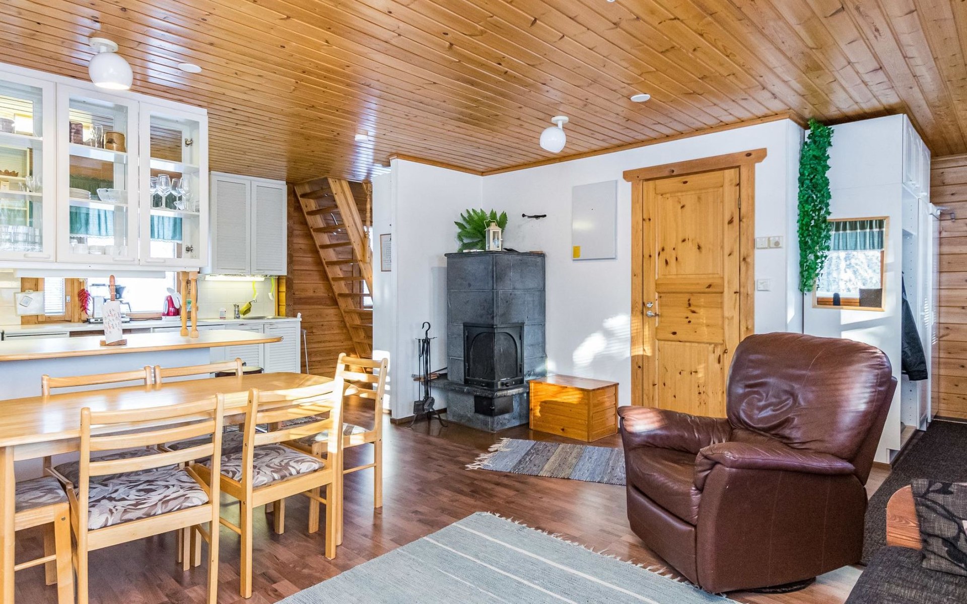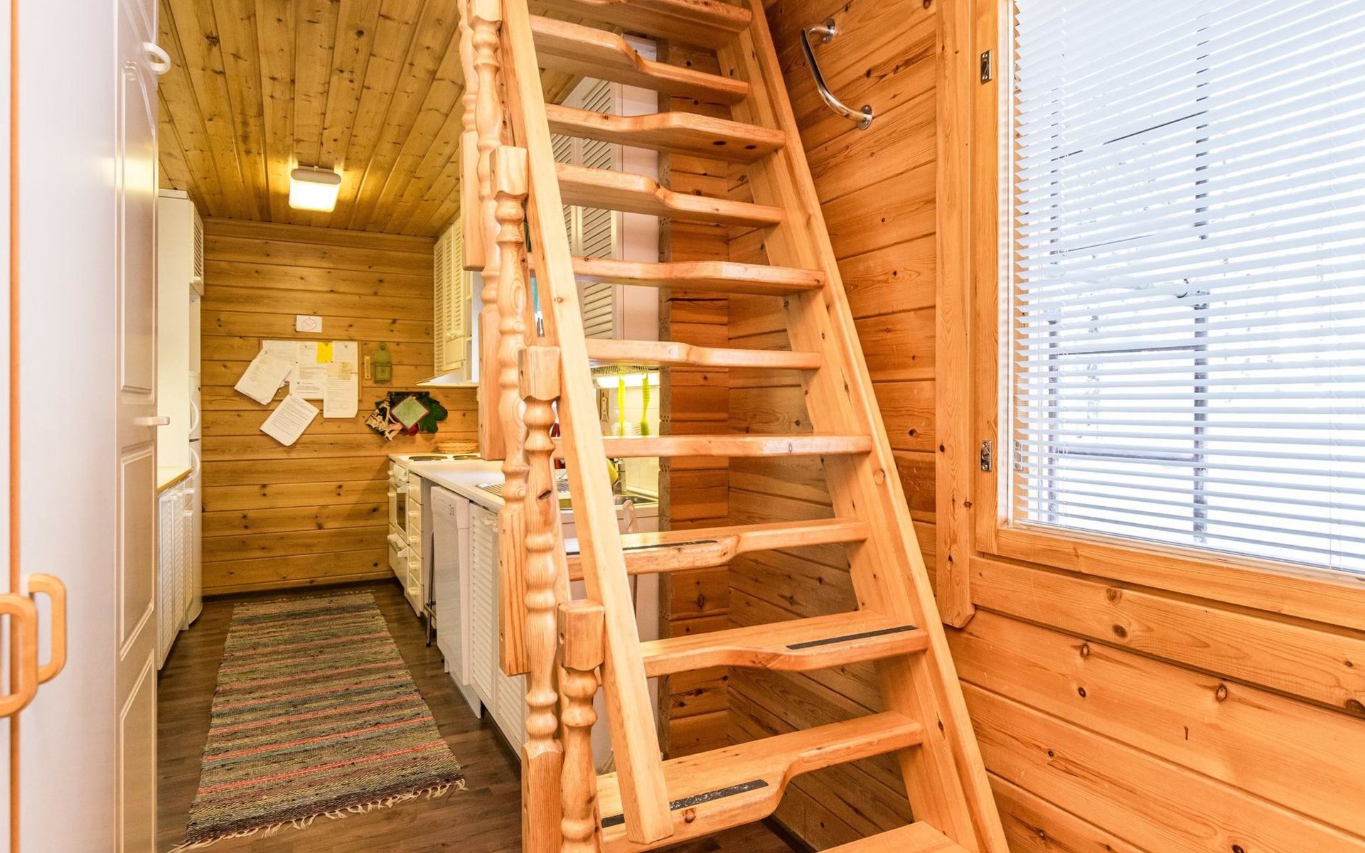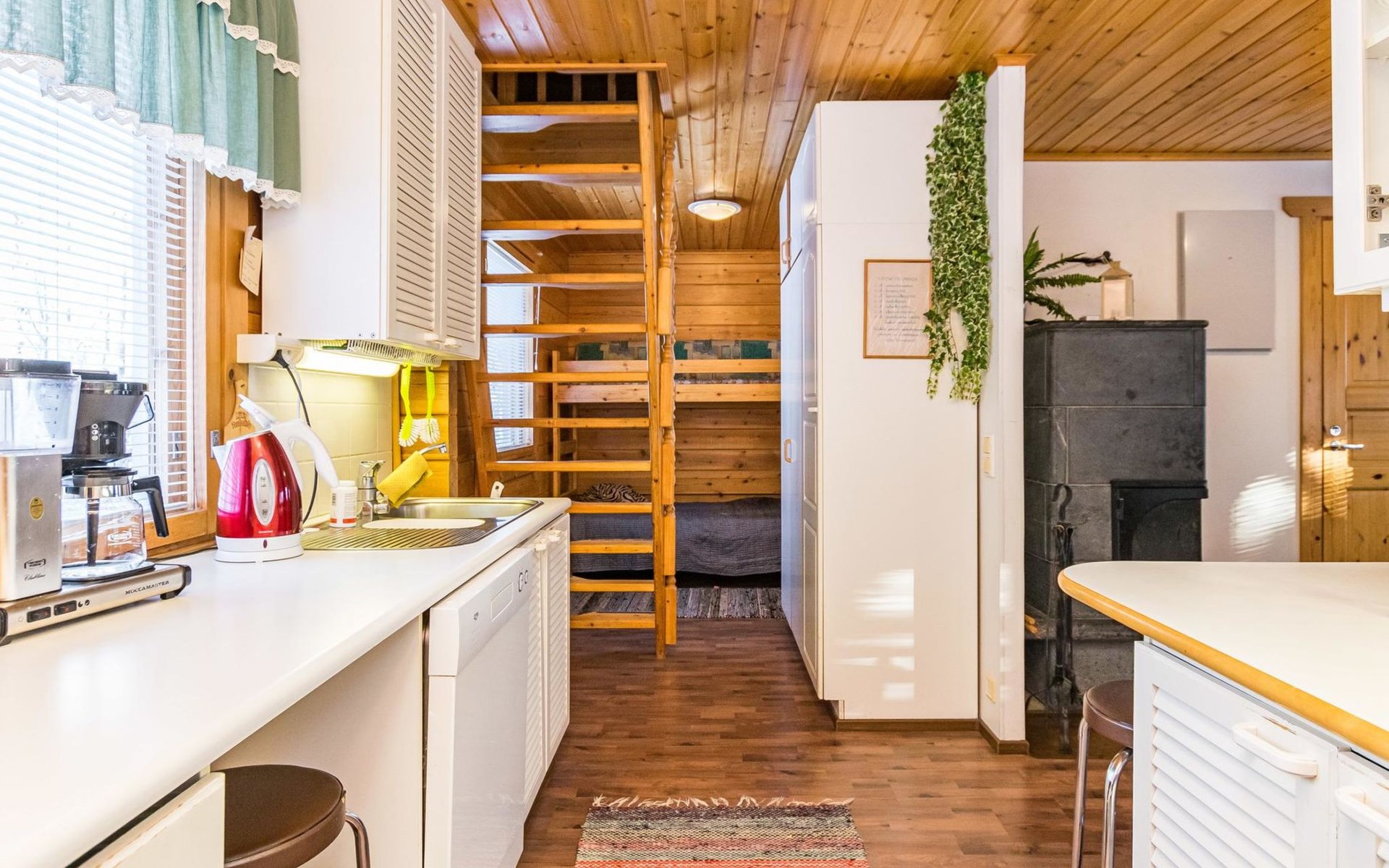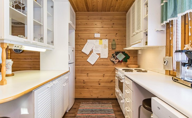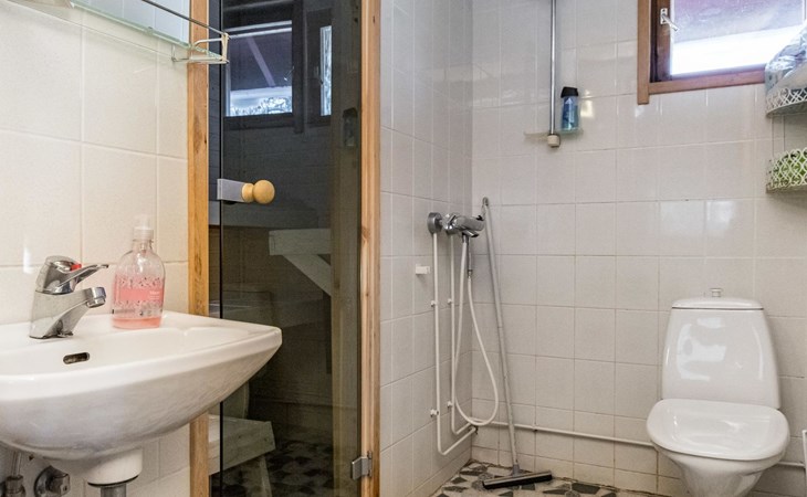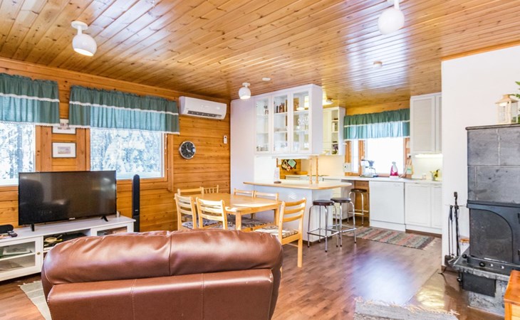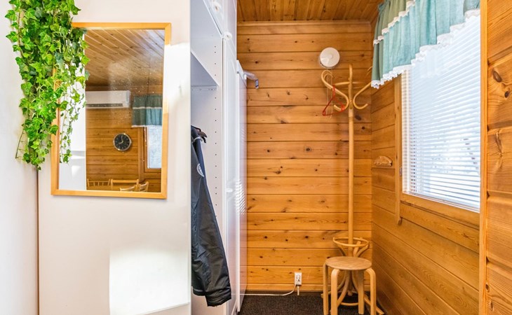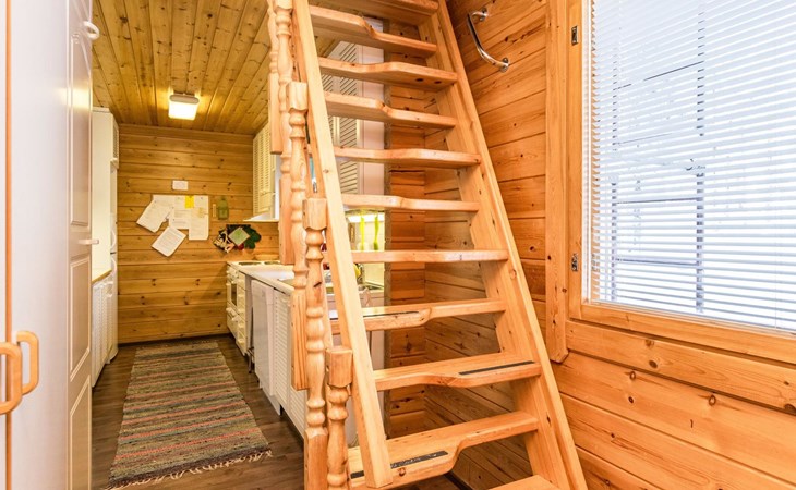 Kitchen, sleeping corner including a bunk bed, loft lobby, sauna, shower room/toilet, balcony, terrace, fireplace.