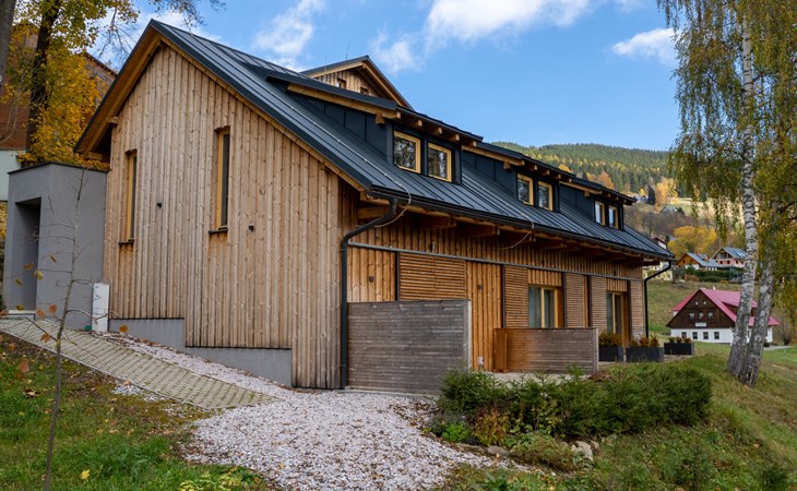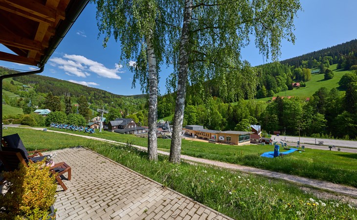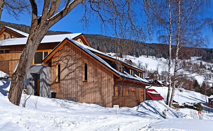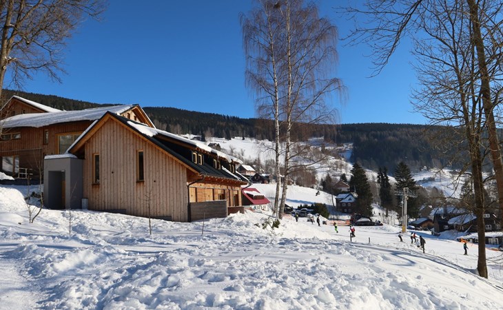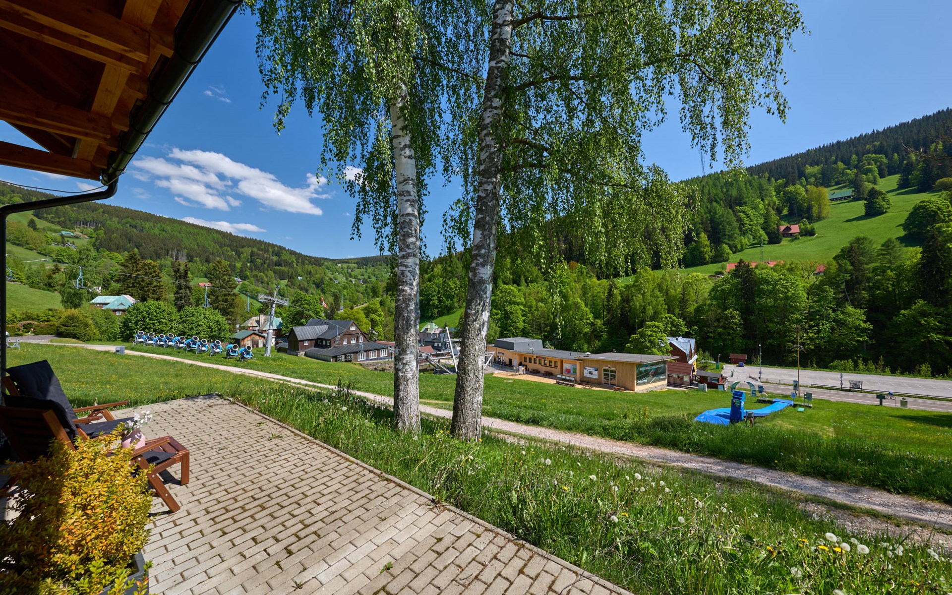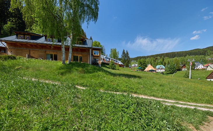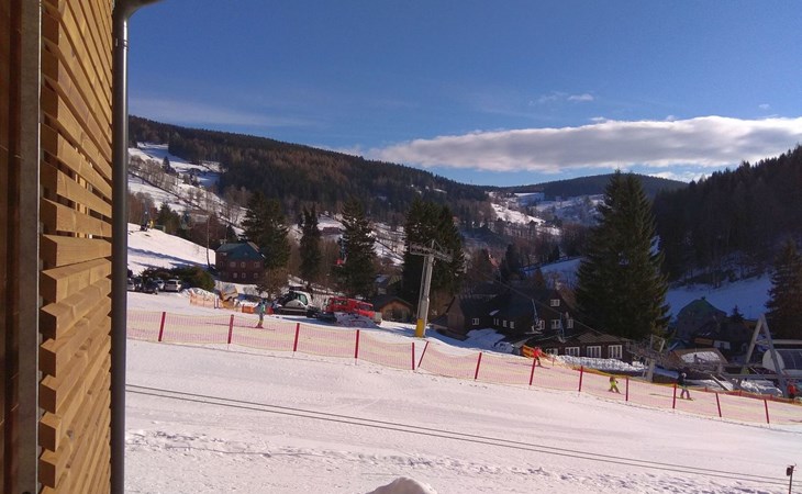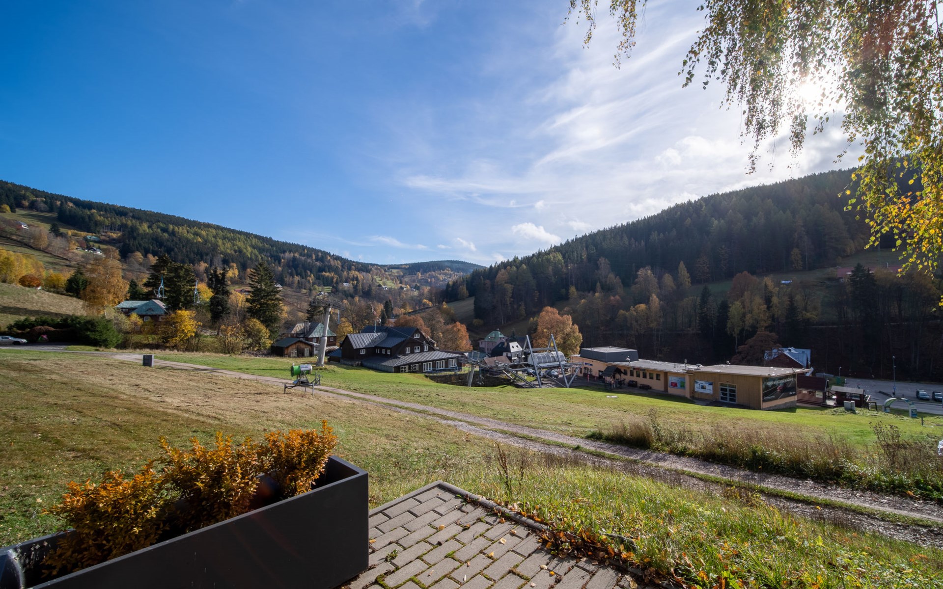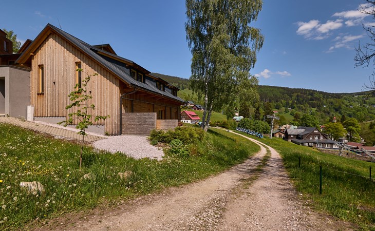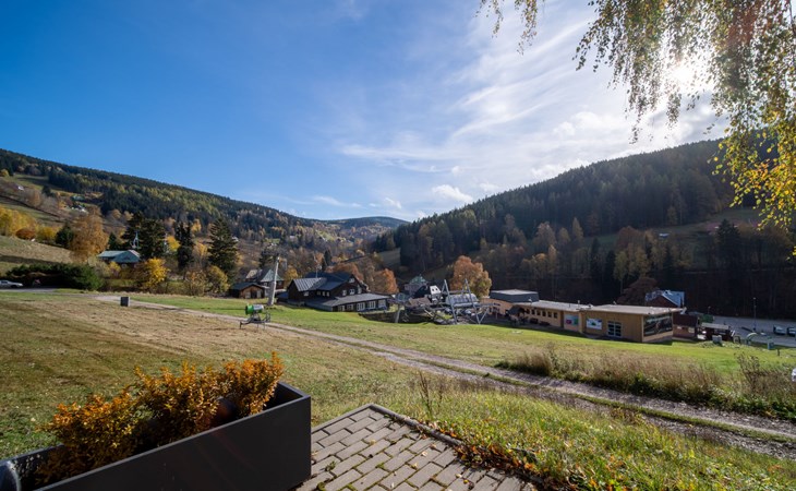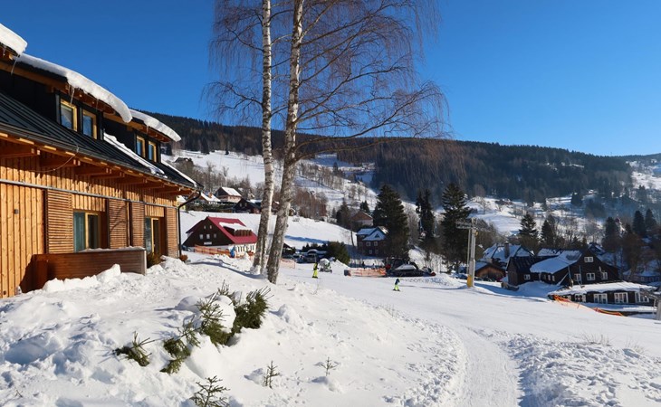 Child friendly, comfortable chalet "Portášky, Velká Úpa", 2 storeys. 3 apartments in the property. In the district of Velká Úpa 2 km from the centre of Pec pod Sněžkou, 12 km from the centre of Janské Lázně, 20 km from the centre of Trutnov, in a secluded, sunny, elevated position, directly by the skiing area. Breakfast on request (extra). Parking (in winter extra). Grocery 50 m, restaurant 100 m, bus stop "Pec pod Sněžkou, dopr. Terminál" 400 m. Golf course (18 hole) 15 km, tennis 2 km, ski lift, chair lift, slopes 10 m, ski rental, ski bus stop, ski school, children's ski school 100 m, children's playground 600 m. Nearby attractions: Bobová dráha/Relaxpark Pec pod Sněžkou 3 km, Sněžka (1603 m) 6 km, Mladé Buky 12 km, Kowary 26 km, Aquapark Vrchlabí 29 km, Park miniatur Mysłakowice, Karpacz 34 km, Adršpašsko-teplické skály 40 km, Jelenia Góra, Zoo Dvůr Králové, Kuks 45 km. Well-known ski regions can easily be reached: Portášky 10 m, Černá hora-Pec pod Sněžkou 3 km, Černá Hora-Janské Lázně 12 km. Well-known lakes can easily be reached: Dolce 25 km. Hiking paths: Krkonošský národní park. Please note: In case of good snow conditions, the house is accessible on skis. The apartments are adjacent to the pension Modřín with all services: wellness, restaurant (extra) - available only in high season. Parking in the winter season in guarded parking lots (150 m, extra). Baggage transport by roller (extra).