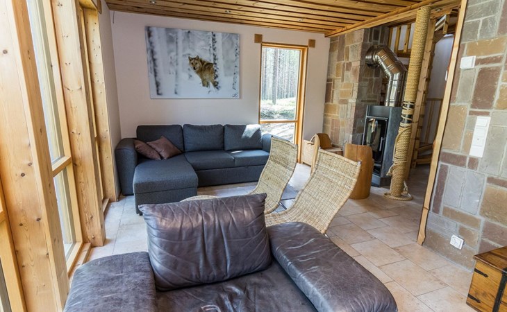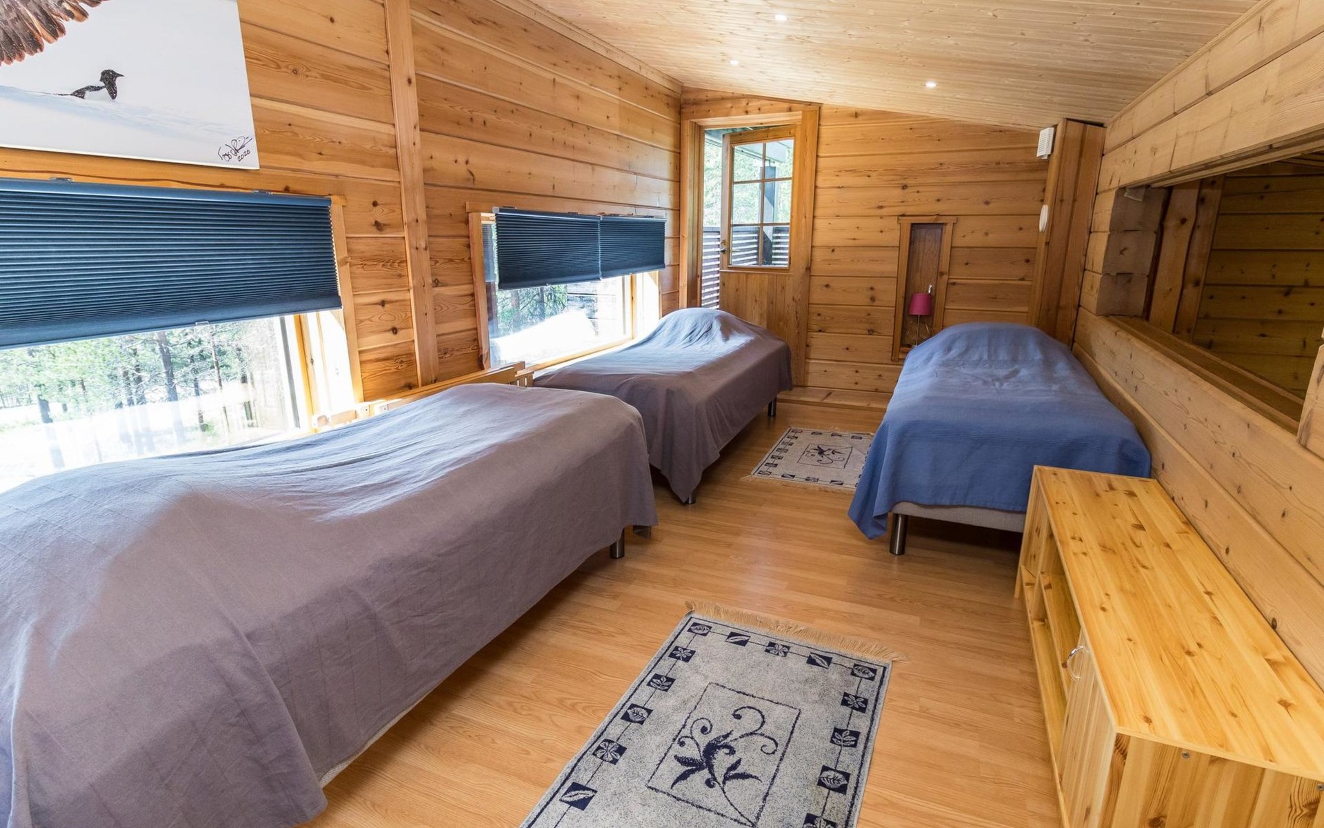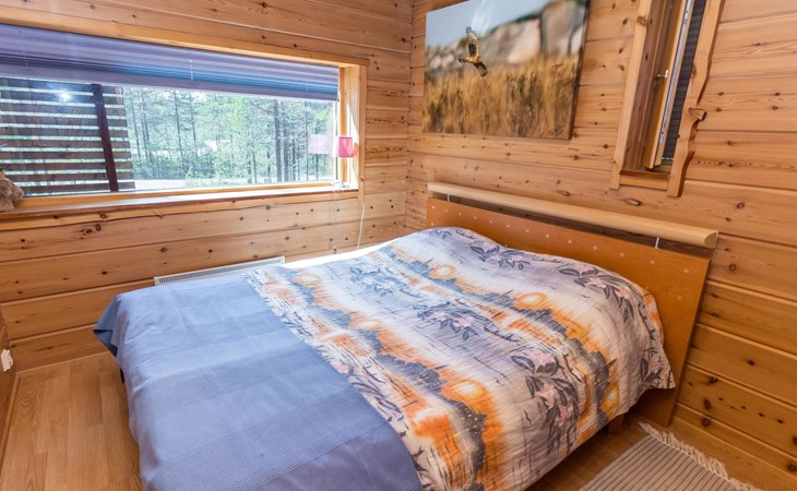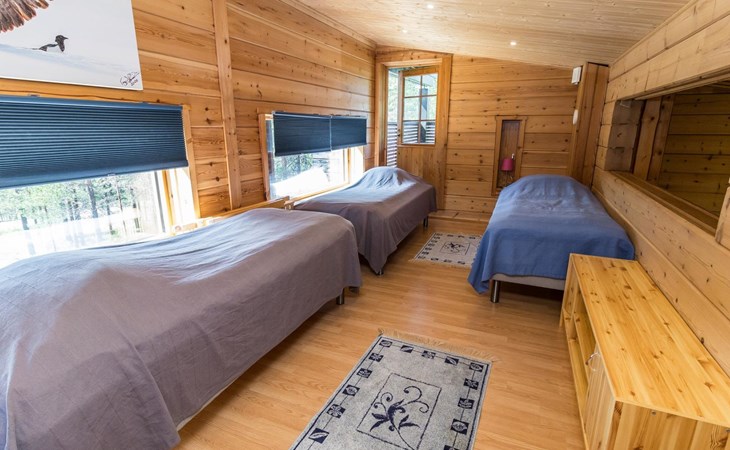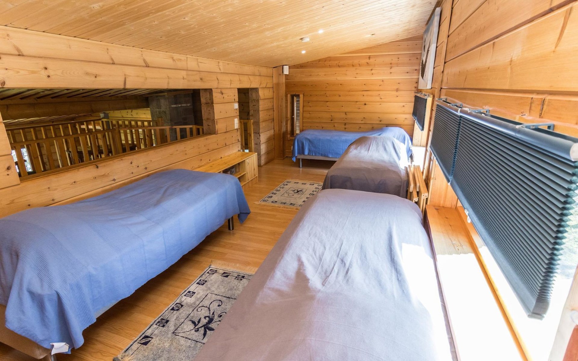 This holiday destination offers both space and atmosphere. On the middle floor, you'll find two bedrooms - one with a comfortable double bed and the other with two separate beds. Additionally, the spacious loft features four beds, and the basement includes a pull-out sofa. The cabin accommodates up to eight people.