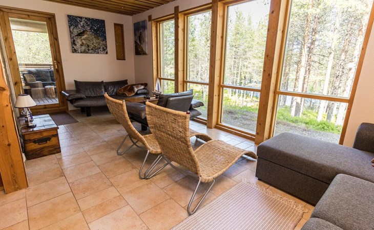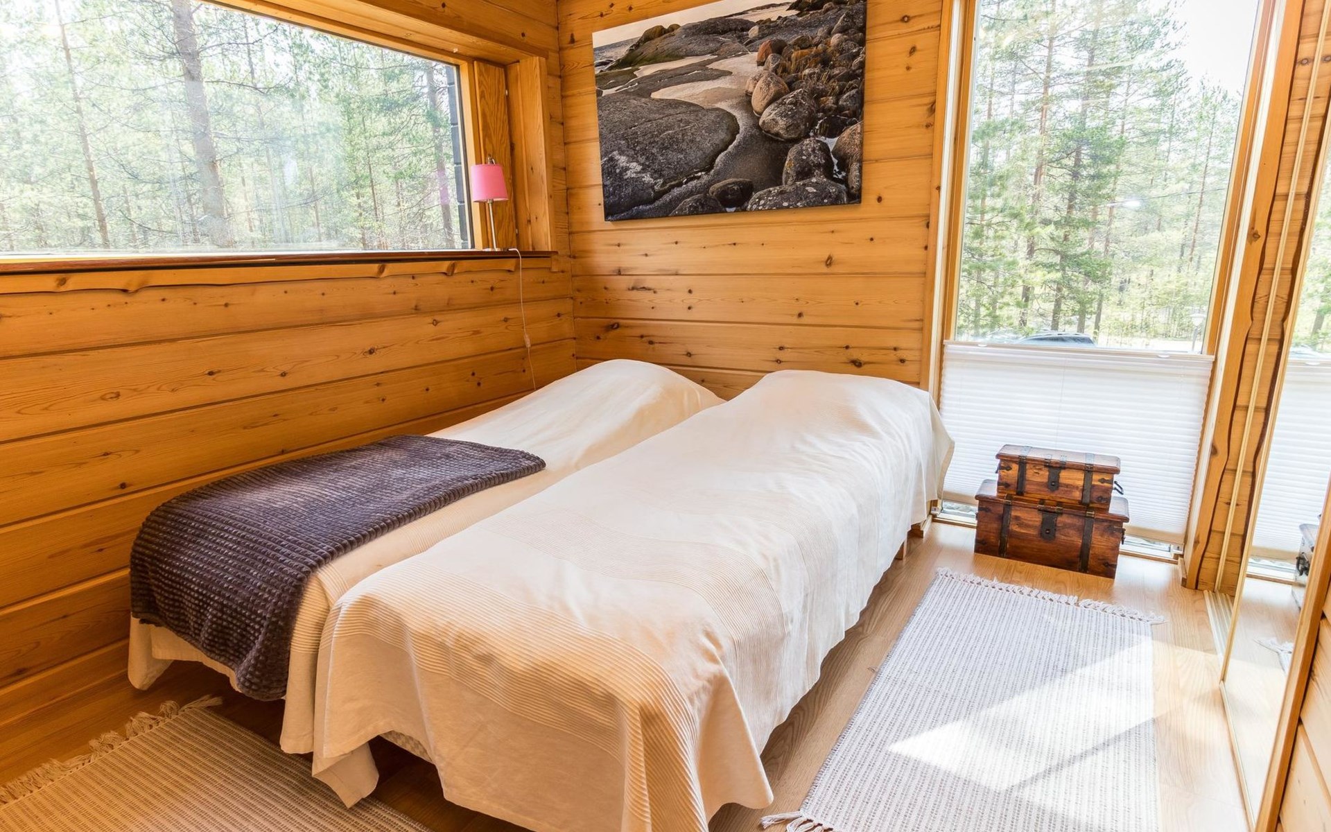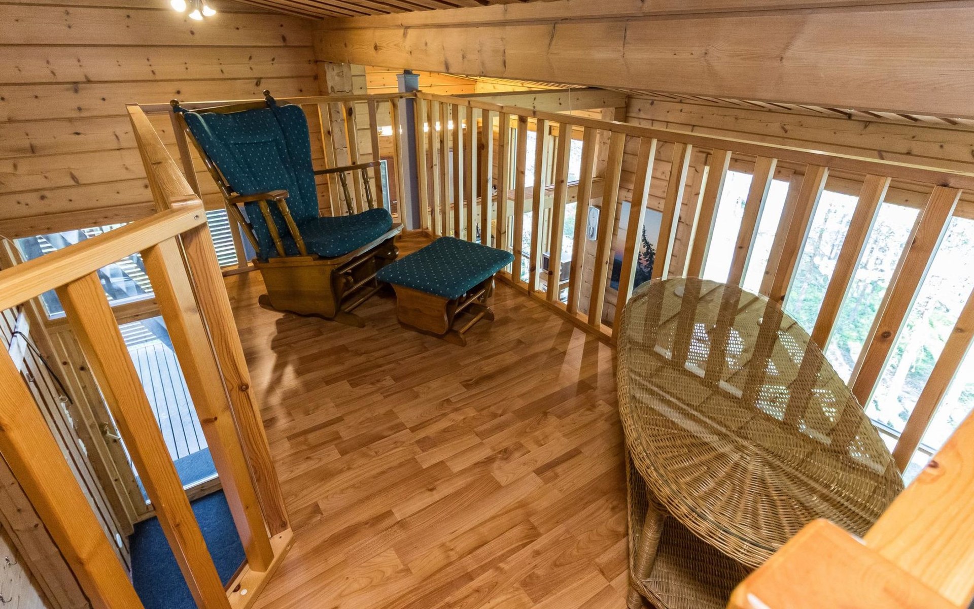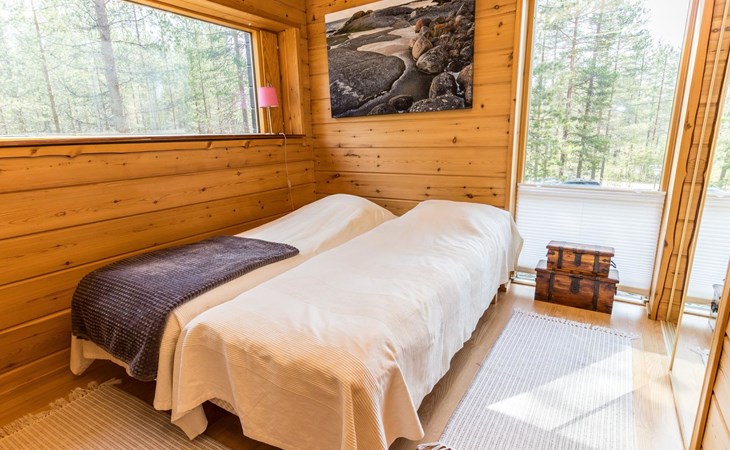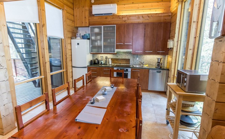 This holiday destination offers both space and atmosphere. On the middle floor, you'll find two bedrooms - one with a comfortable double bed and the other with two separate beds. Additionally, the spacious loft features four beds, and the basement includes a pull-out sofa. The cabin accommodates up to eight people.