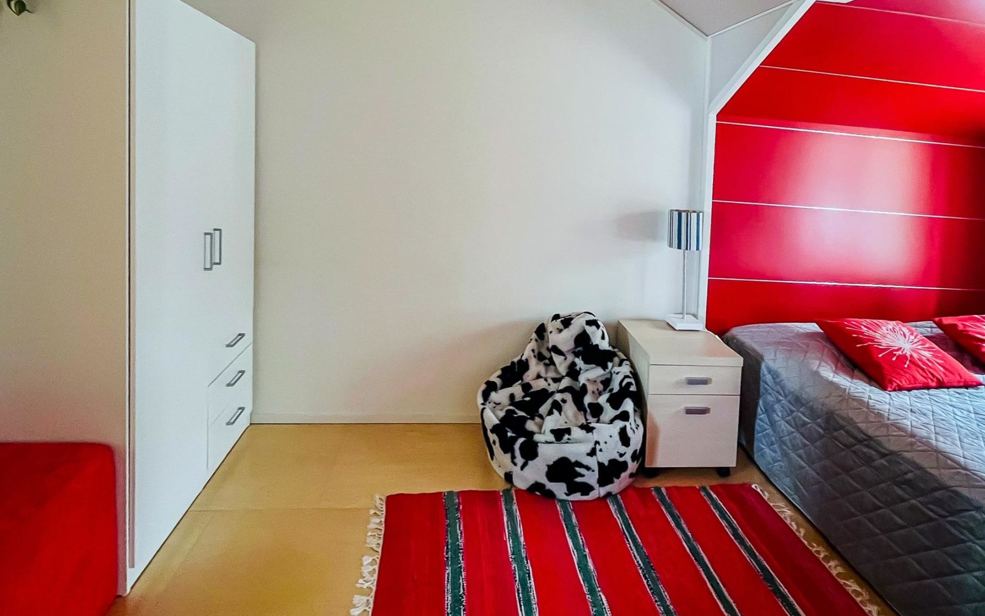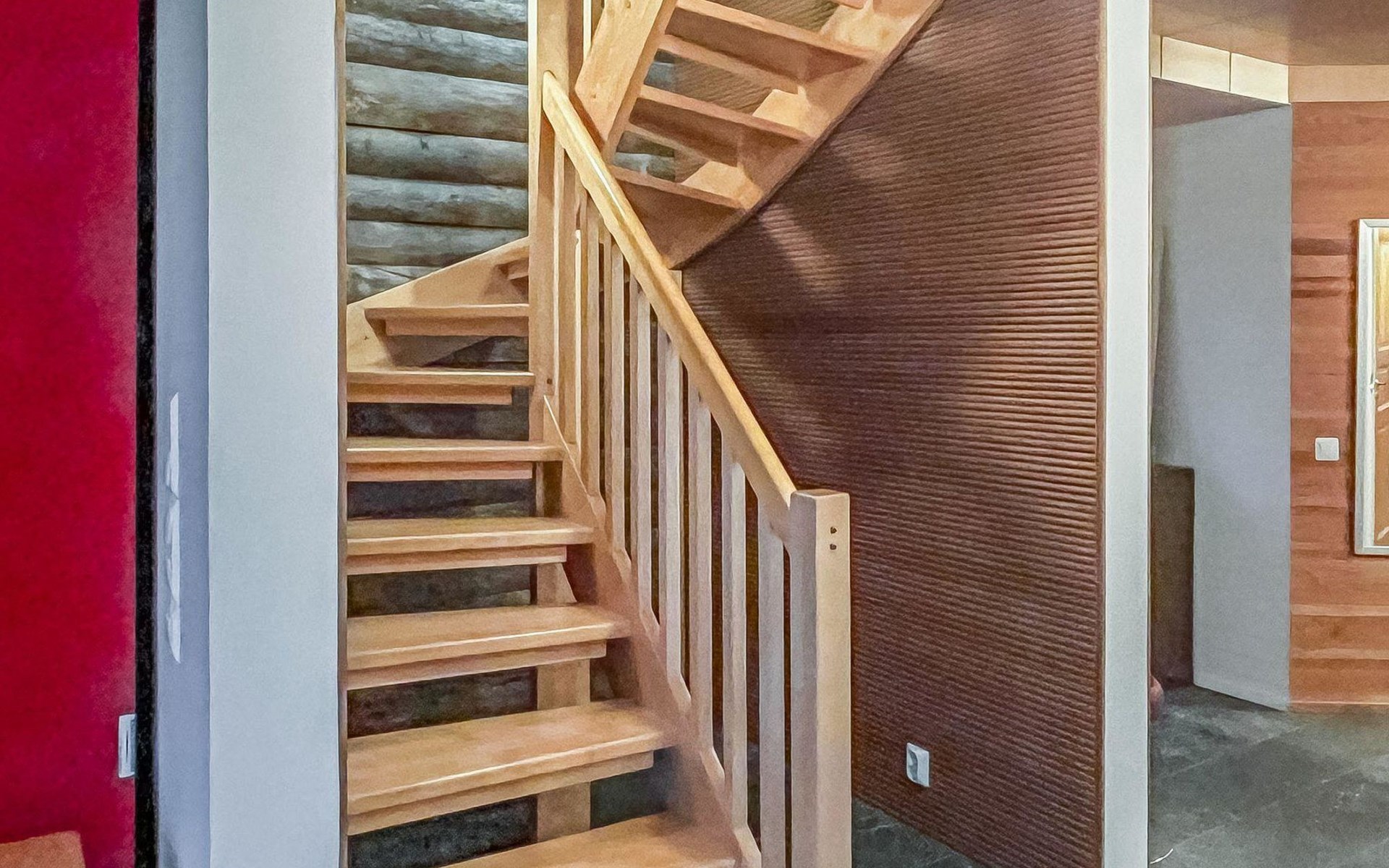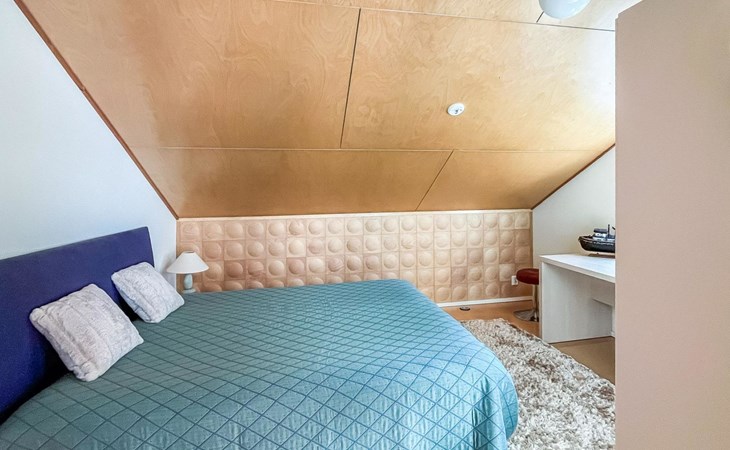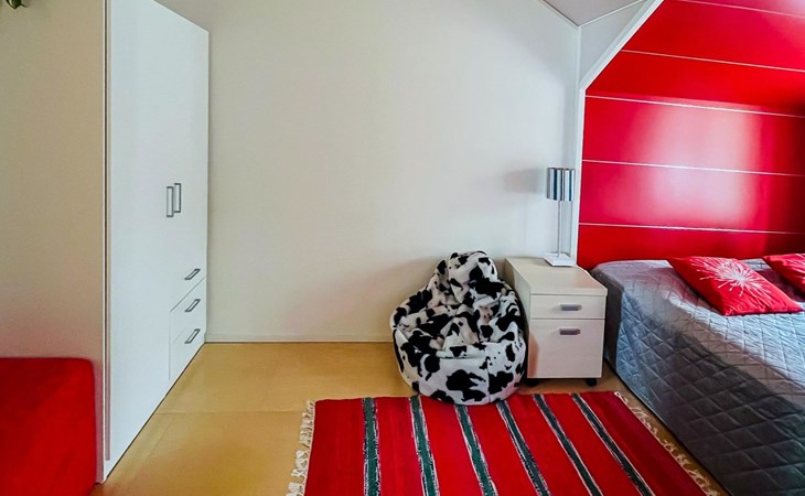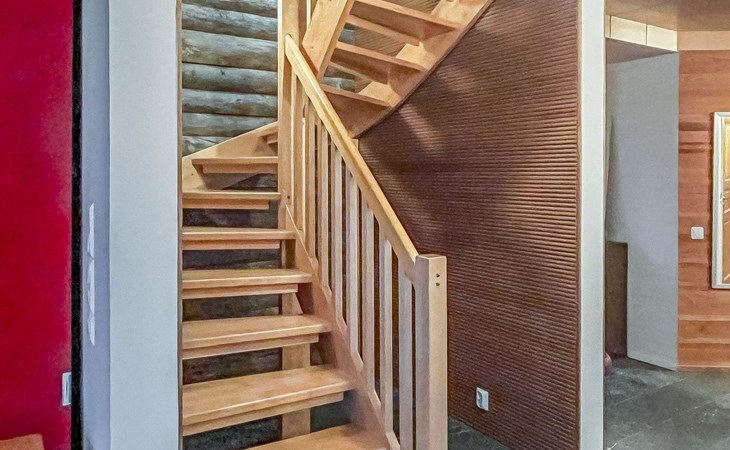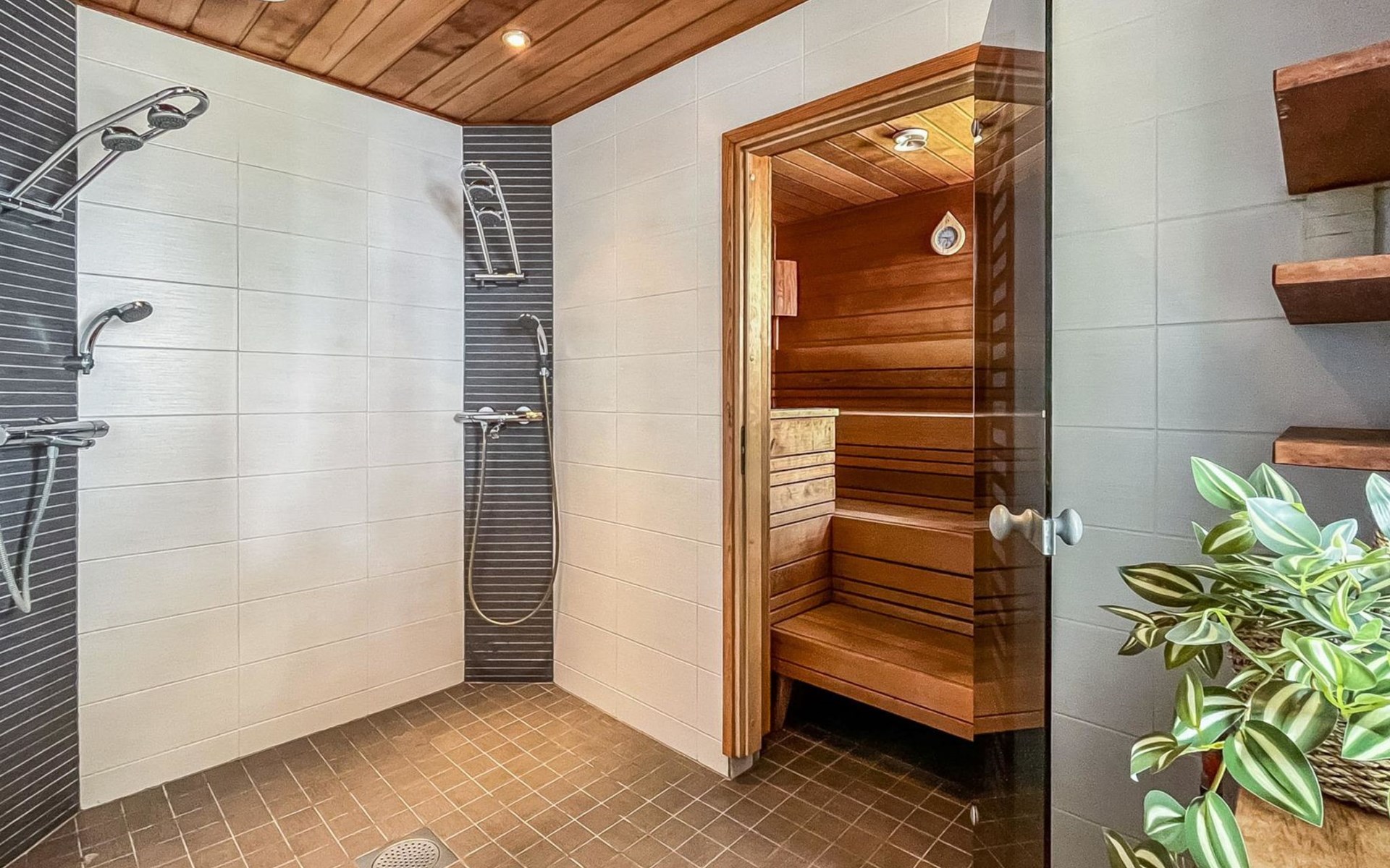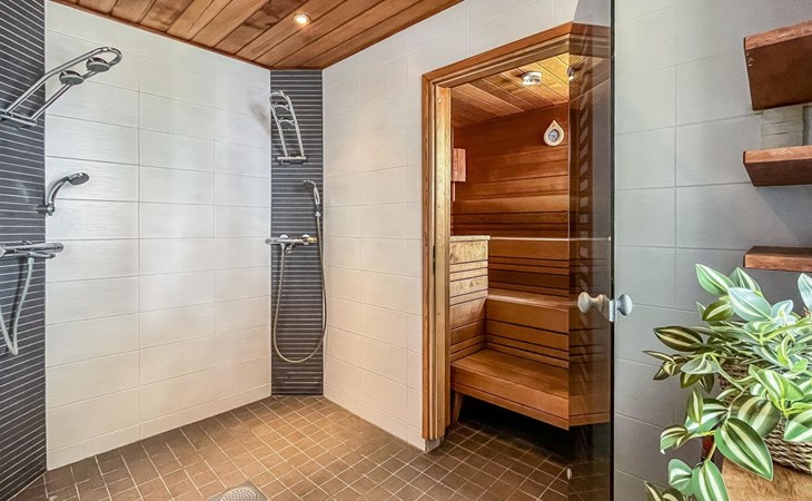 The sauna, showers, a small relaxation room with a sofa and a separate exit to the terrace, as well as the toilet on the ground floor can be separated from the rest of the living area with a wooden folding door and can therefore be used independently. The ground floor also has a spacious utility room with a washing machine, ironing board, and iron. A centrally operated vacuum cleaner is available for cleaning during your stay.