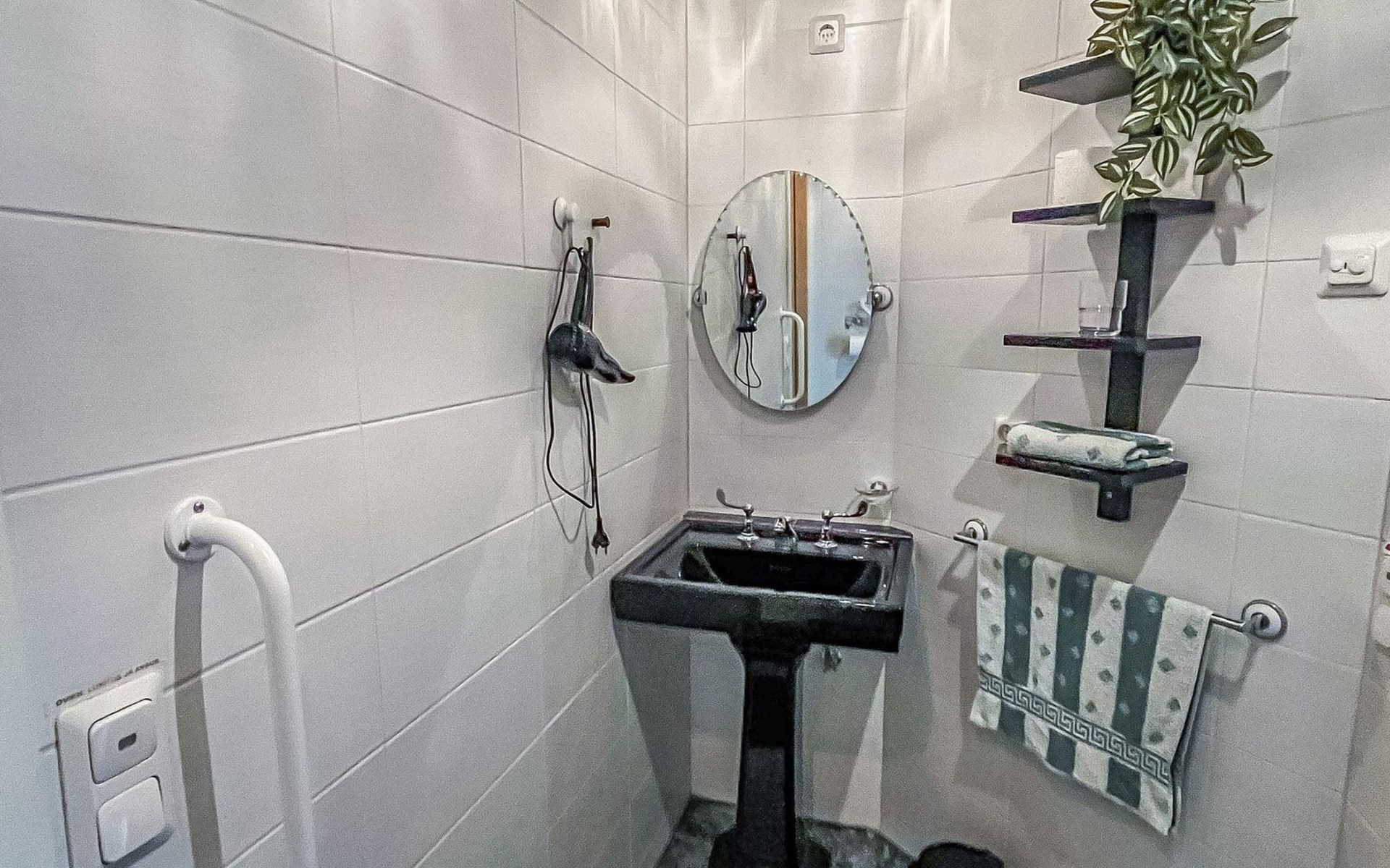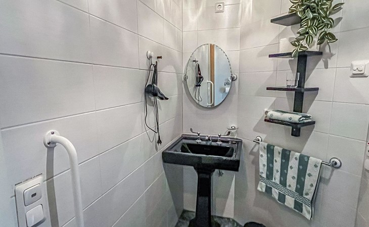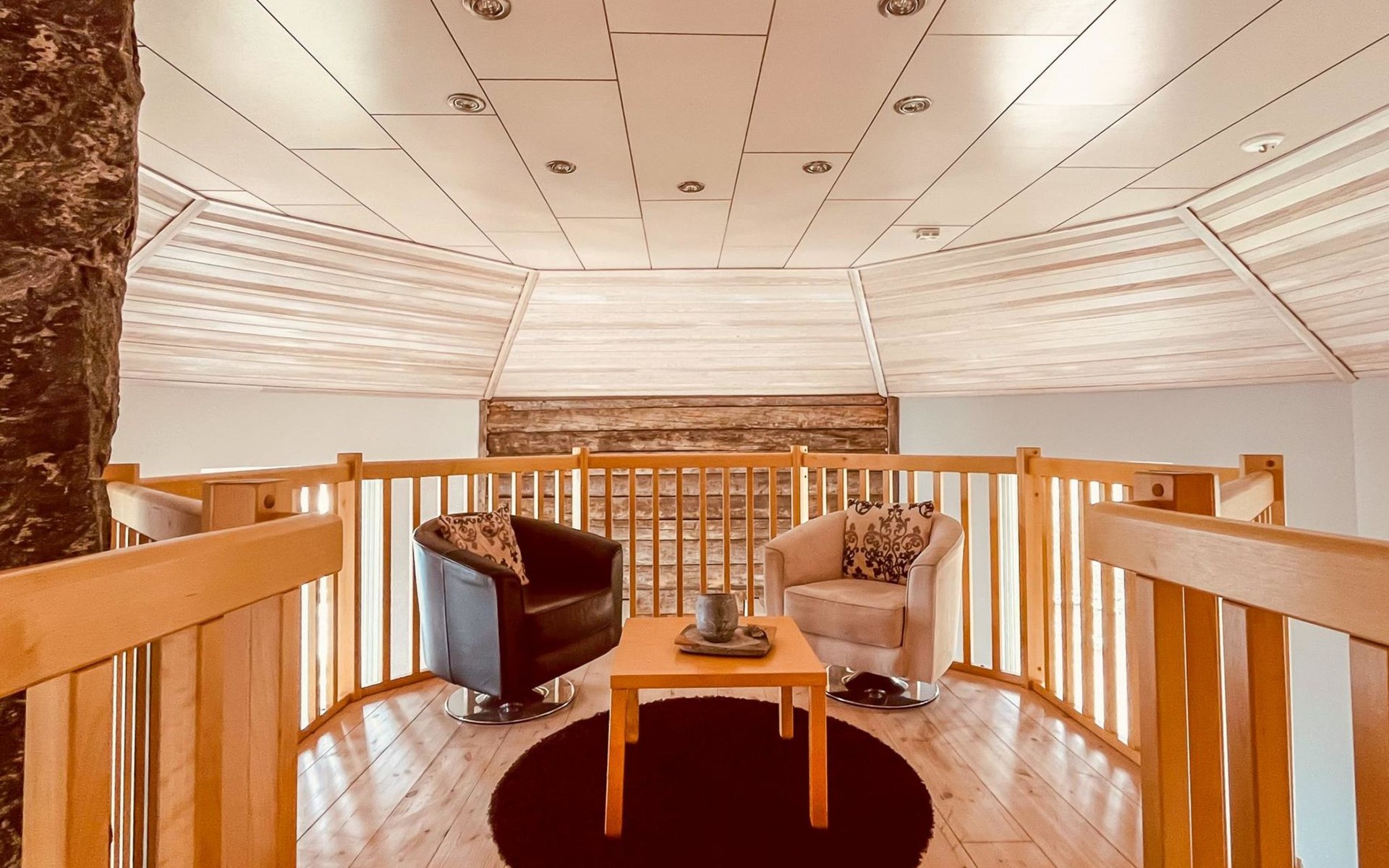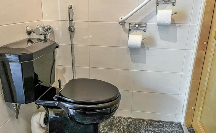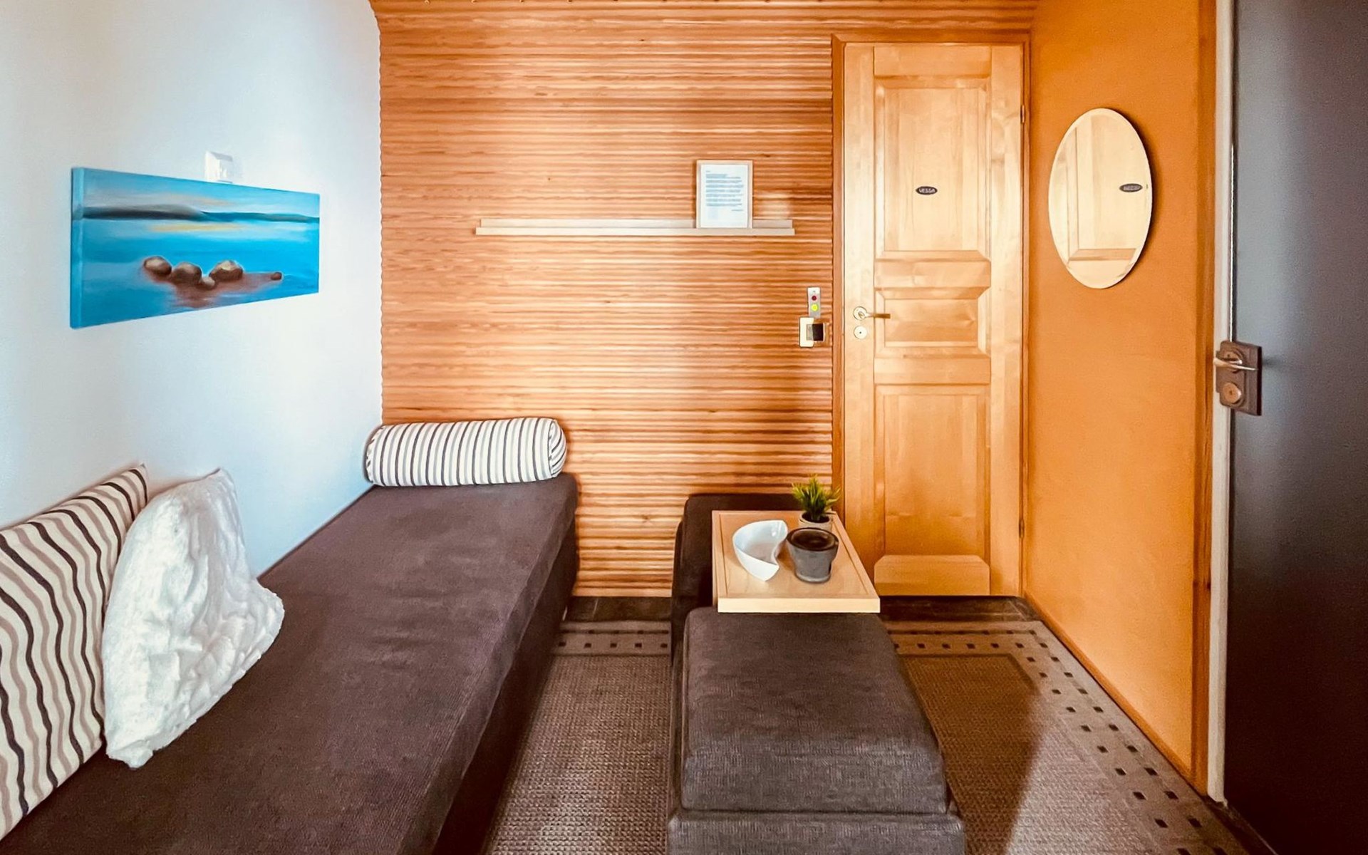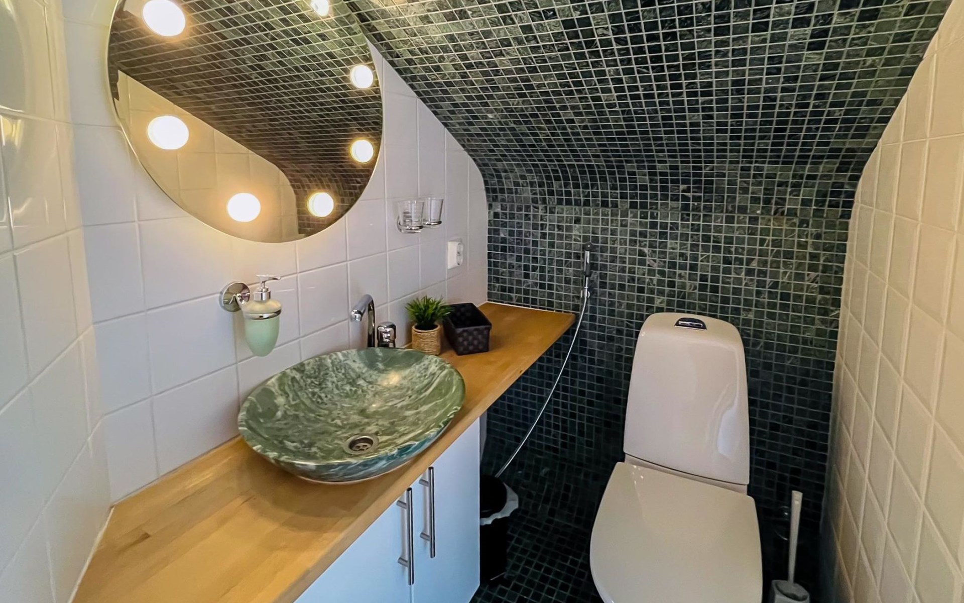 The sauna, showers, a small relaxation room with a sofa and a separate exit to the terrace, as well as the toilet on the ground floor can be separated from the rest of the living area with a wooden folding door and can therefore be used independently. The ground floor also has a spacious utility room with a washing machine, ironing board, and iron. A centrally operated vacuum cleaner is available for cleaning during your stay.