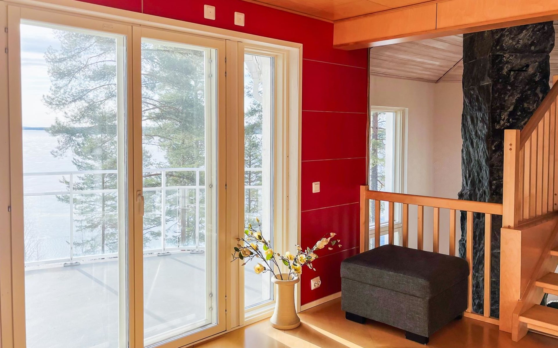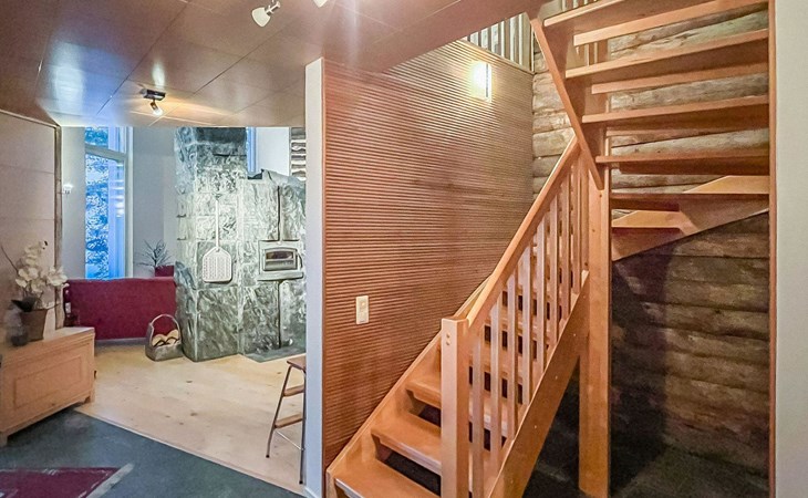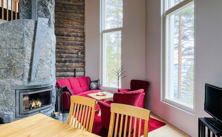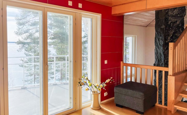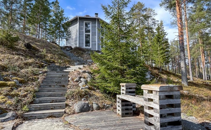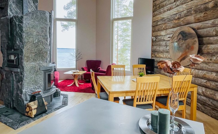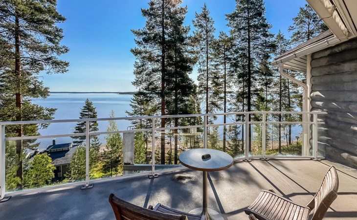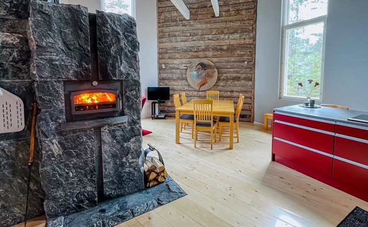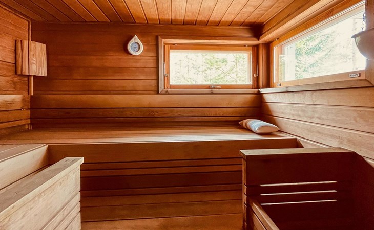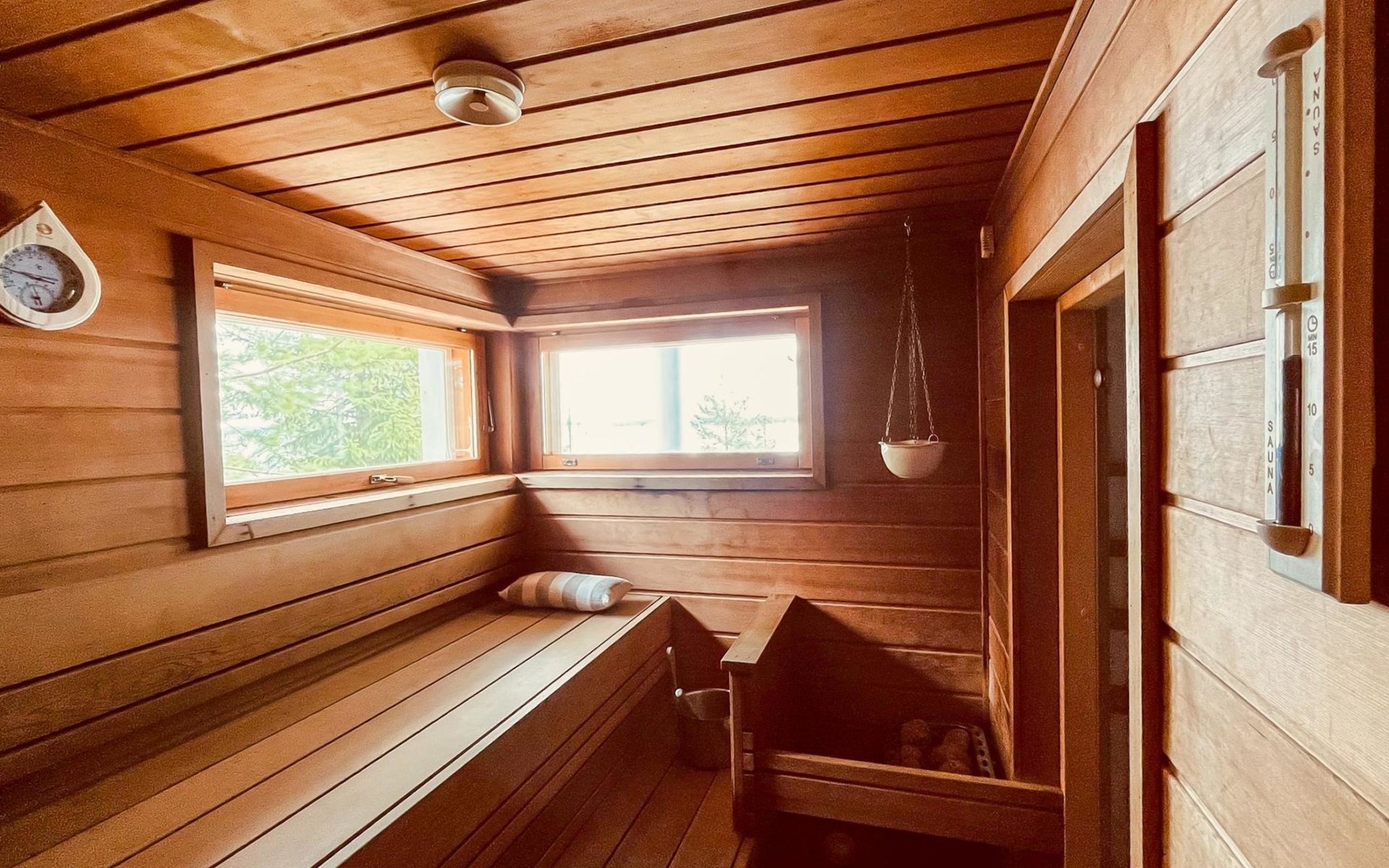 The well-equipped kitchen has 2 induction hobs, 2 gas burners, and an electric oven. For enthusiastic cooks, there is also a wood-fired baking owen by the fireplace, which you can use also as a pizza owen. The living/dining area has a smart TV, which can be used to receive Finnish TV channels as well as various streaming services and media libraries. The bedroom on the ground floor has 2 single beds and the three bedrooms on the upper floor each have 2 beds. The beds on the upper floor are set up as double beds but can also be separated and used as single beds. All bedrooms are equipped with a wardrobe. Upstairs there is also a lounge and a roof balcony with breathtaking views over the Pielinen. The TV upstairs is not connected to the terrestrial antenna, but has HDMI connections so you can connect the vacation home's Blu-ray player or your own device (e.g., laptop, game console). 4G Wi-Fi is available in the house. The sauna is electrically heated and has windows with beautiful views of the forest and the Pielinen.