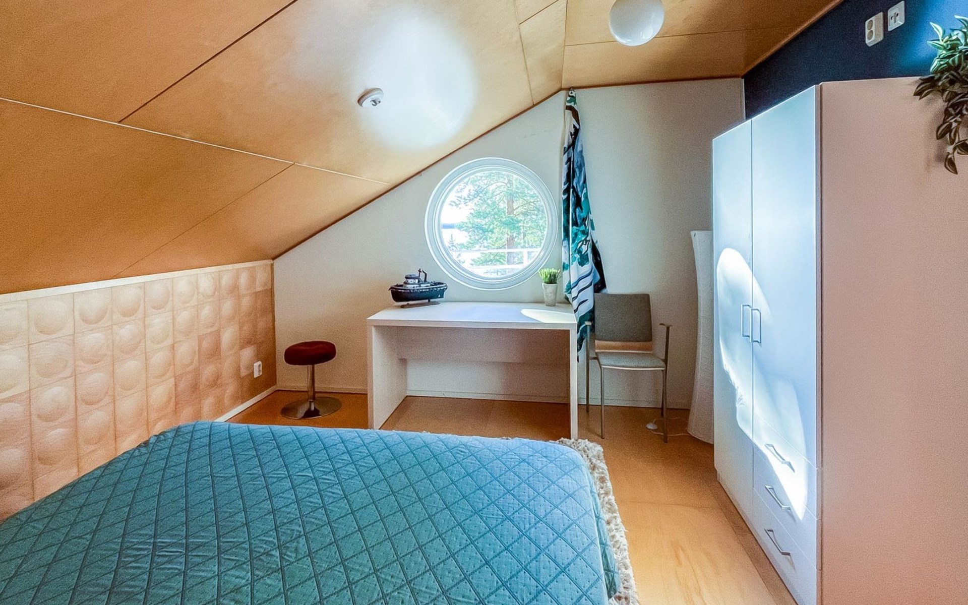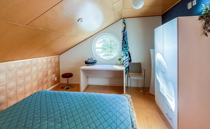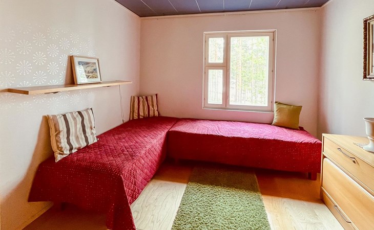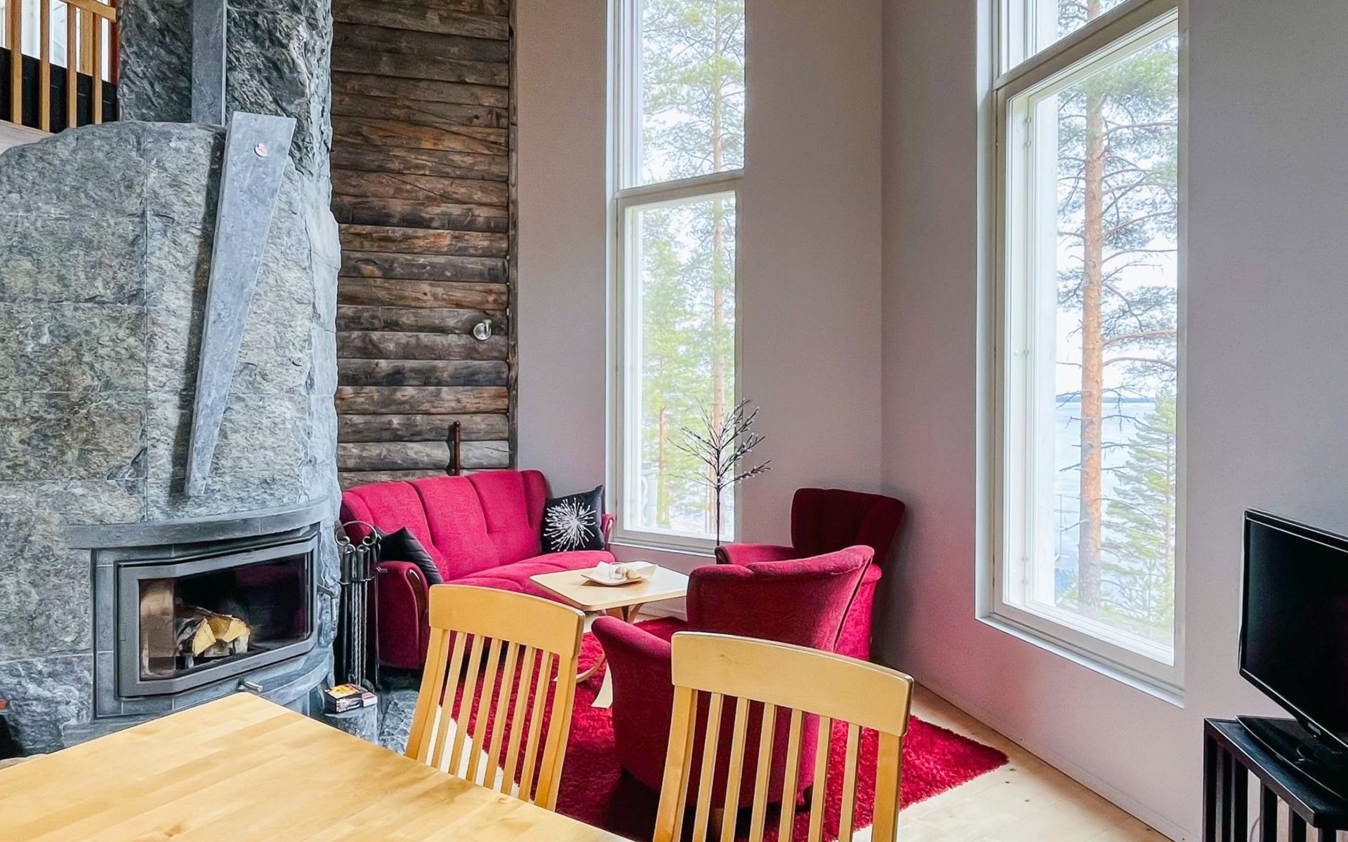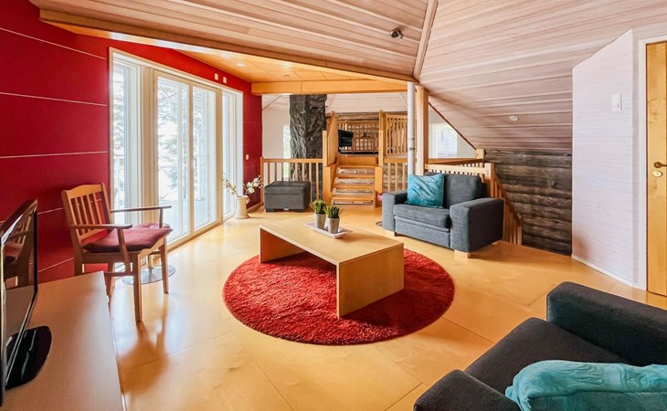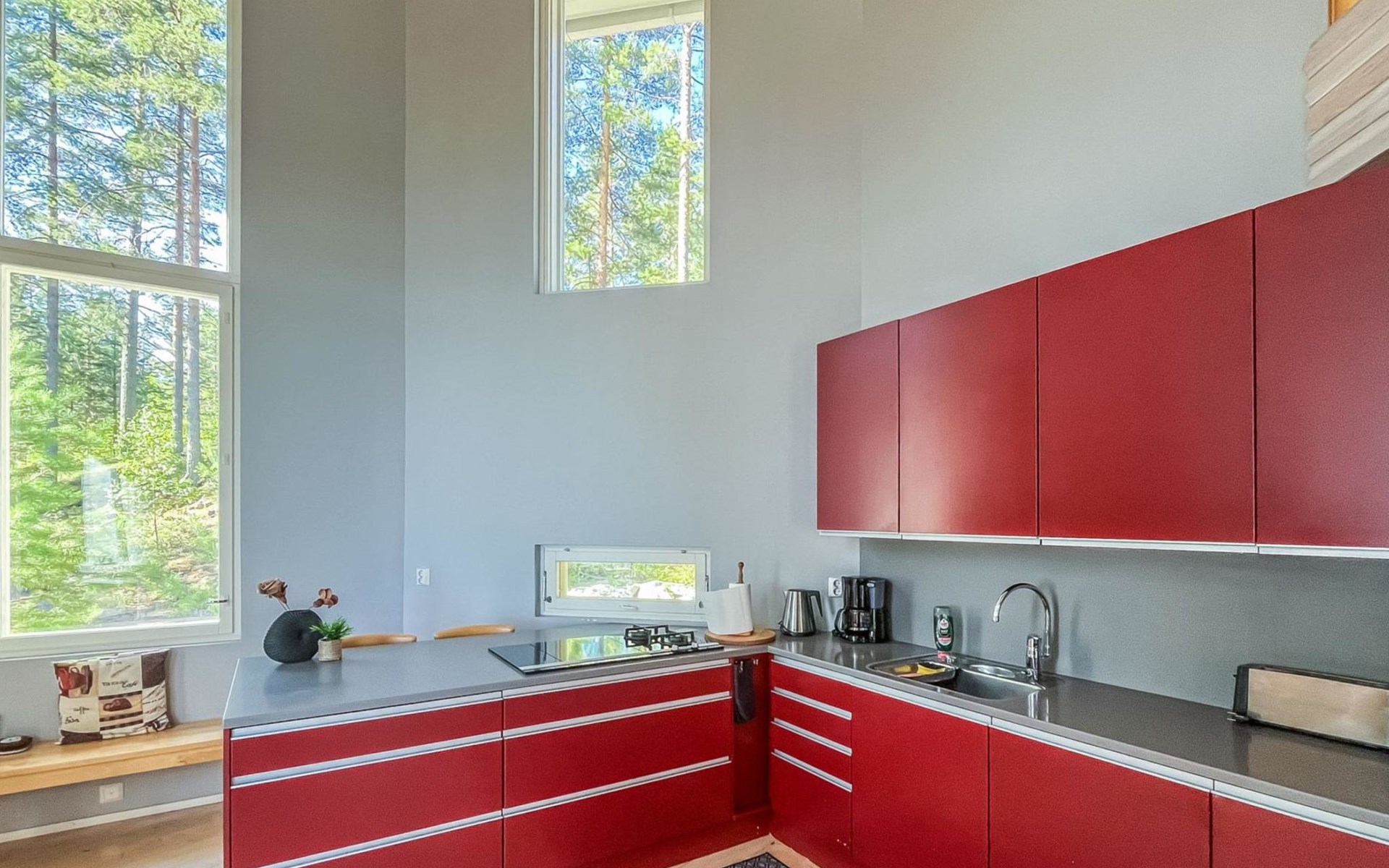 The well-equipped kitchen has 2 induction hobs, 2 gas burners, and an electric oven. For enthusiastic cooks, there is also a wood-fired baking owen by the fireplace, which you can use also as a pizza owen. The living/dining area has a smart TV, which can be used to receive Finnish TV channels as well as various streaming services and media libraries. The bedroom on the ground floor has 2 single beds and the three bedrooms on the upper floor each have 2 beds. The beds on the upper floor are set up as double beds but can also be separated and used as single beds. All bedrooms are equipped with a wardrobe. Upstairs there is also a lounge and a roof balcony with breathtaking views over the Pielinen. The TV upstairs is not connected to the terrestrial antenna, but has HDMI connections so you can connect the vacation home's Blu-ray player or your own device (e.g., laptop, game console). 4G Wi-Fi is available in the house. The sauna is electrically heated and has windows with beautiful views of the forest and the Pielinen.