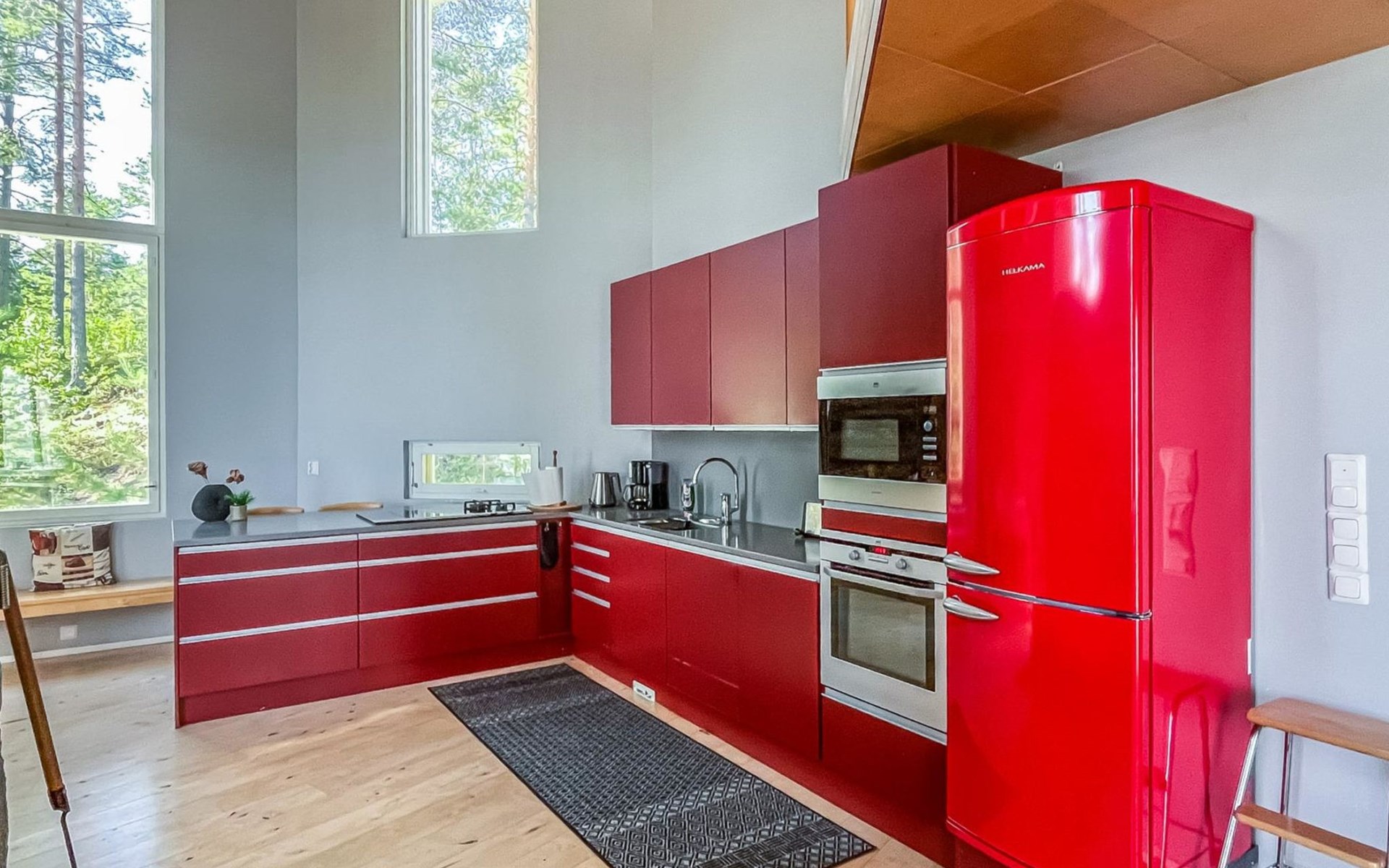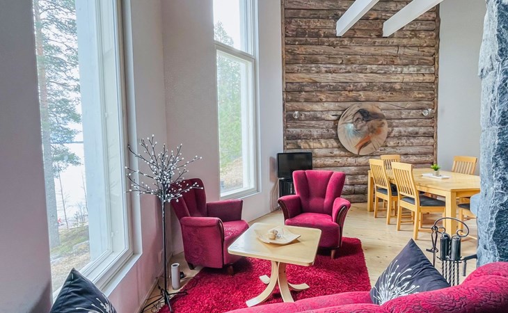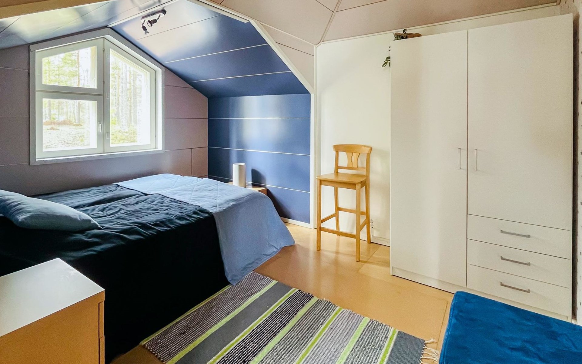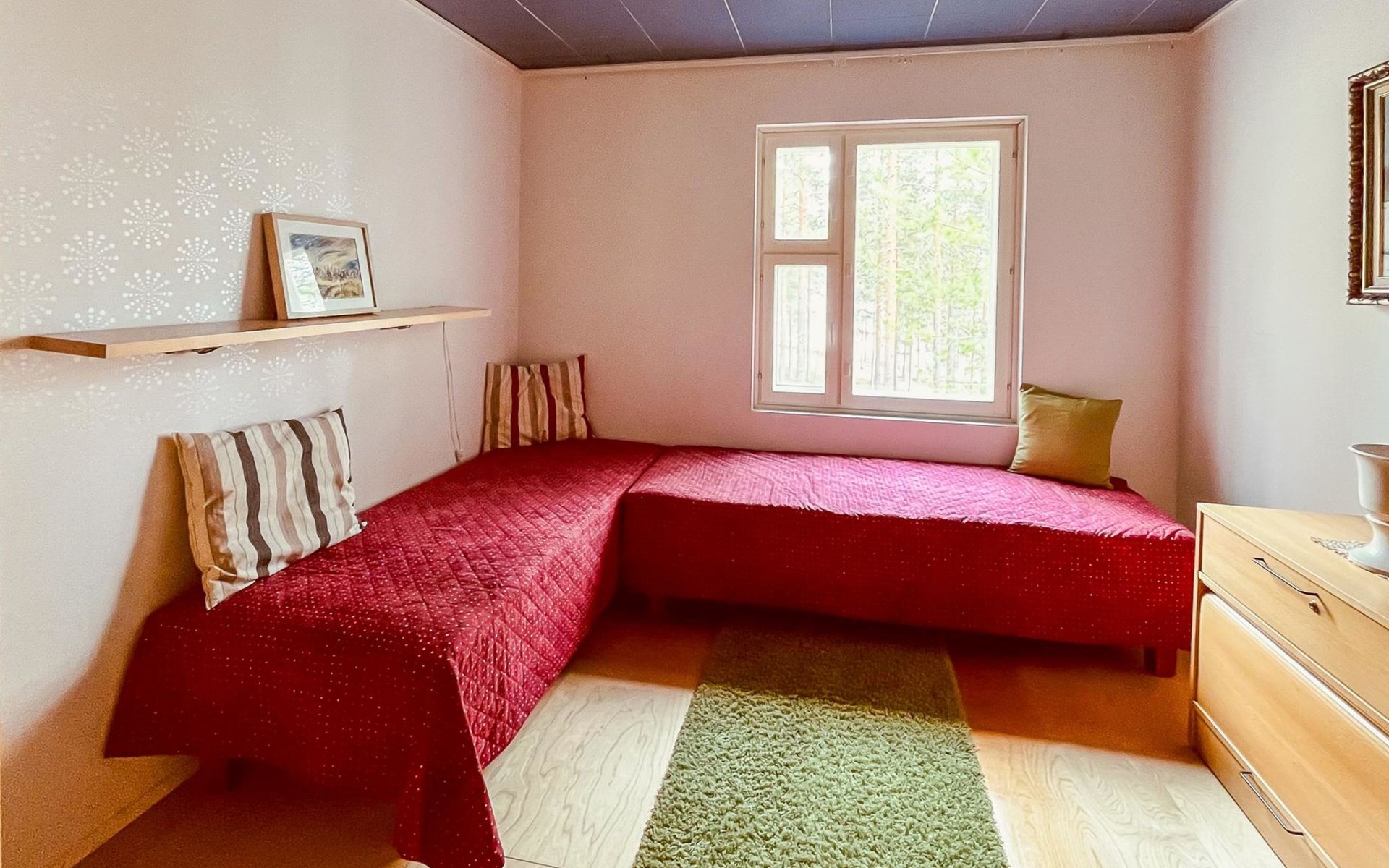 The well-equipped kitchen has 2 induction hobs, 2 gas burners, and an electric oven. For enthusiastic cooks, there is also a wood-fired baking owen by the fireplace, which you can use also as a pizza owen. The living/dining area has a smart TV, which can be used to receive Finnish TV channels as well as various streaming services and media libraries. The bedroom on the ground floor has 2 single beds and the three bedrooms on the upper floor each have 2 beds. The beds on the upper floor are set up as double beds but can also be separated and used as single beds. All bedrooms are equipped with a wardrobe. Upstairs there is also a lounge and a roof balcony with breathtaking views over the Pielinen. The TV upstairs is not connected to the terrestrial antenna, but has HDMI connections so you can connect the vacation home's Blu-ray player or your own device (e.g., laptop, game console). 4G Wi-Fi is available in the house. The sauna is electrically heated and has windows with beautiful views of the forest and the Pielinen.