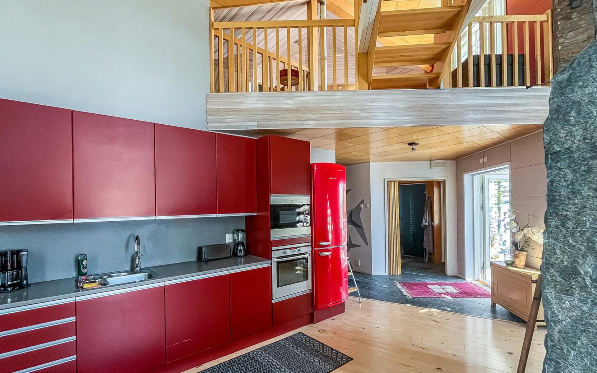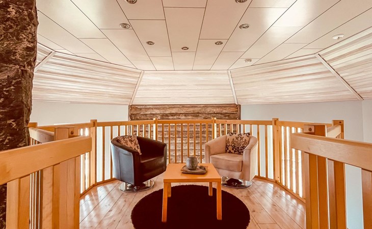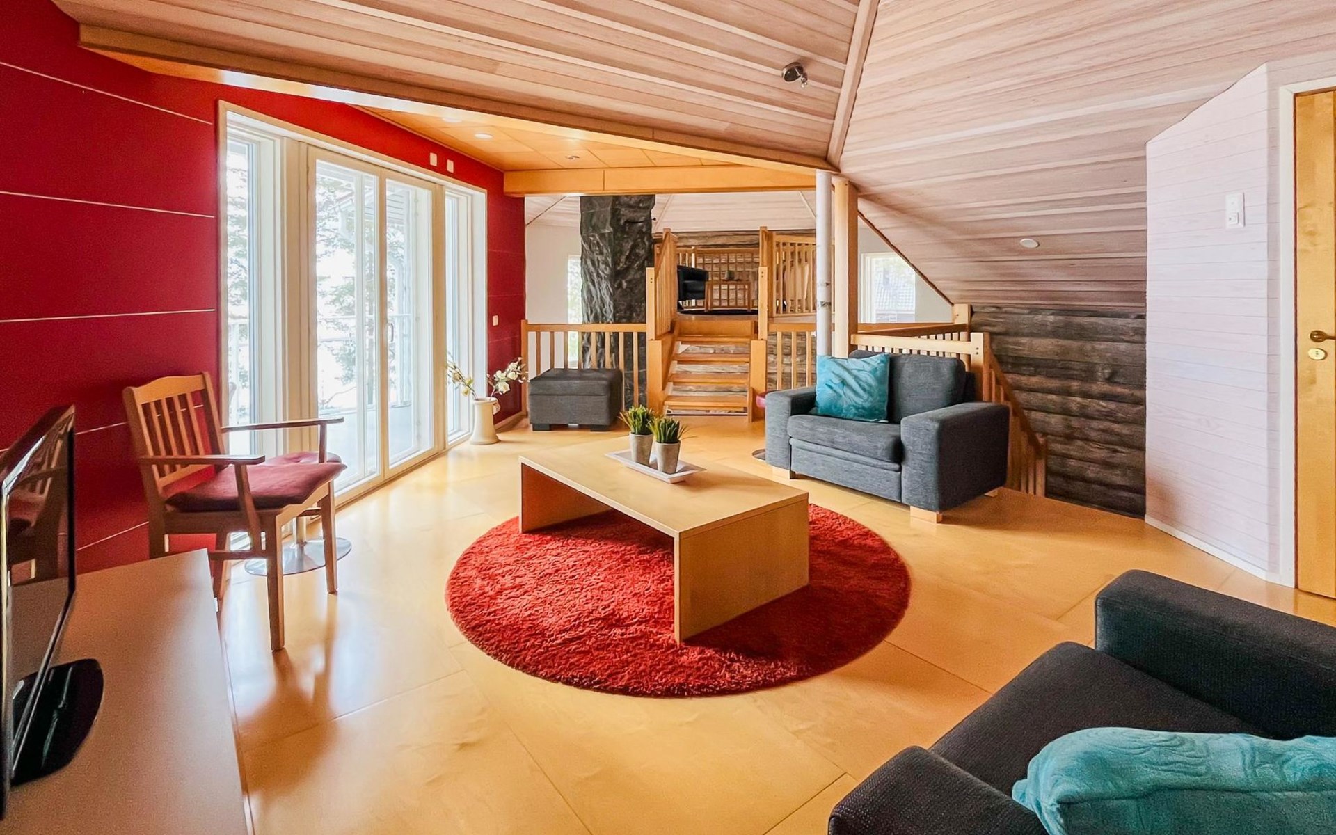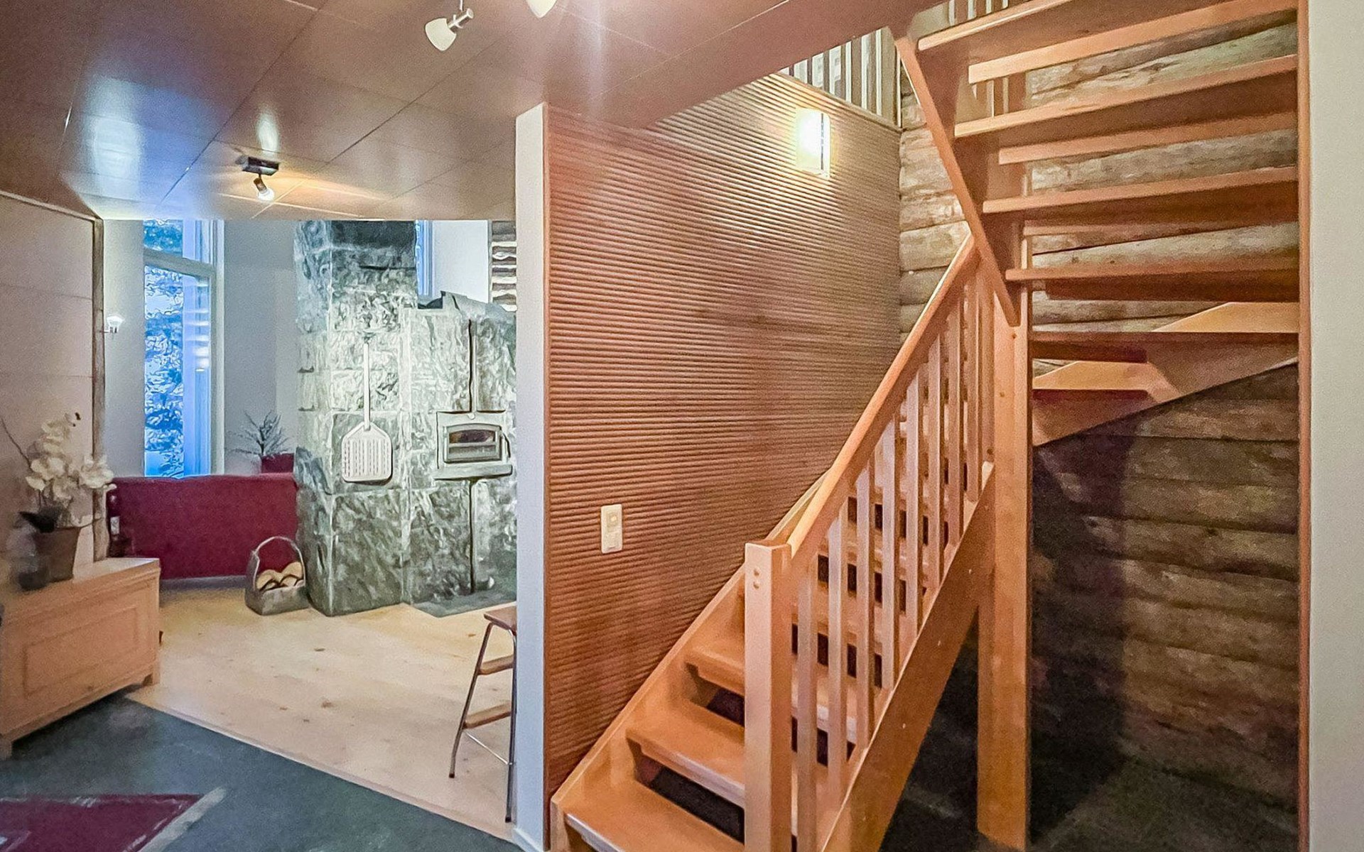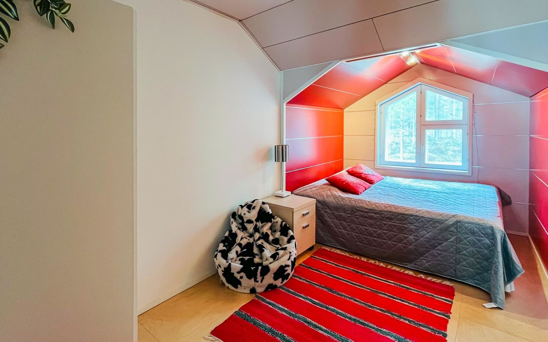The well-equipped kitchen has 2 induction hobs, 2 gas burners, and an electric oven. For enthusiastic cooks, there is also a wood-fired baking owen by the fireplace, which you can use also as a pizza owen. The living/dining area has a smart TV, which can be used to receive Finnish TV channels as well as various streaming services and media libraries. The bedroom on the ground floor has 2 single beds and the three bedrooms on the upper floor each have 2 beds. The beds on the upper floor are set up as double beds but can also be separated and used as single beds. All bedrooms are equipped with a wardrobe. Upstairs there is also a lounge and a roof balcony with breathtaking views over the Pielinen. The TV upstairs is not connected to the terrestrial antenna, but has HDMI connections so you can connect the vacation home's Blu-ray player or your own device (e.g., laptop, game console). 4G Wi-Fi is available in the house. The sauna is electrically heated and has windows with beautiful views of the forest and the Pielinen.