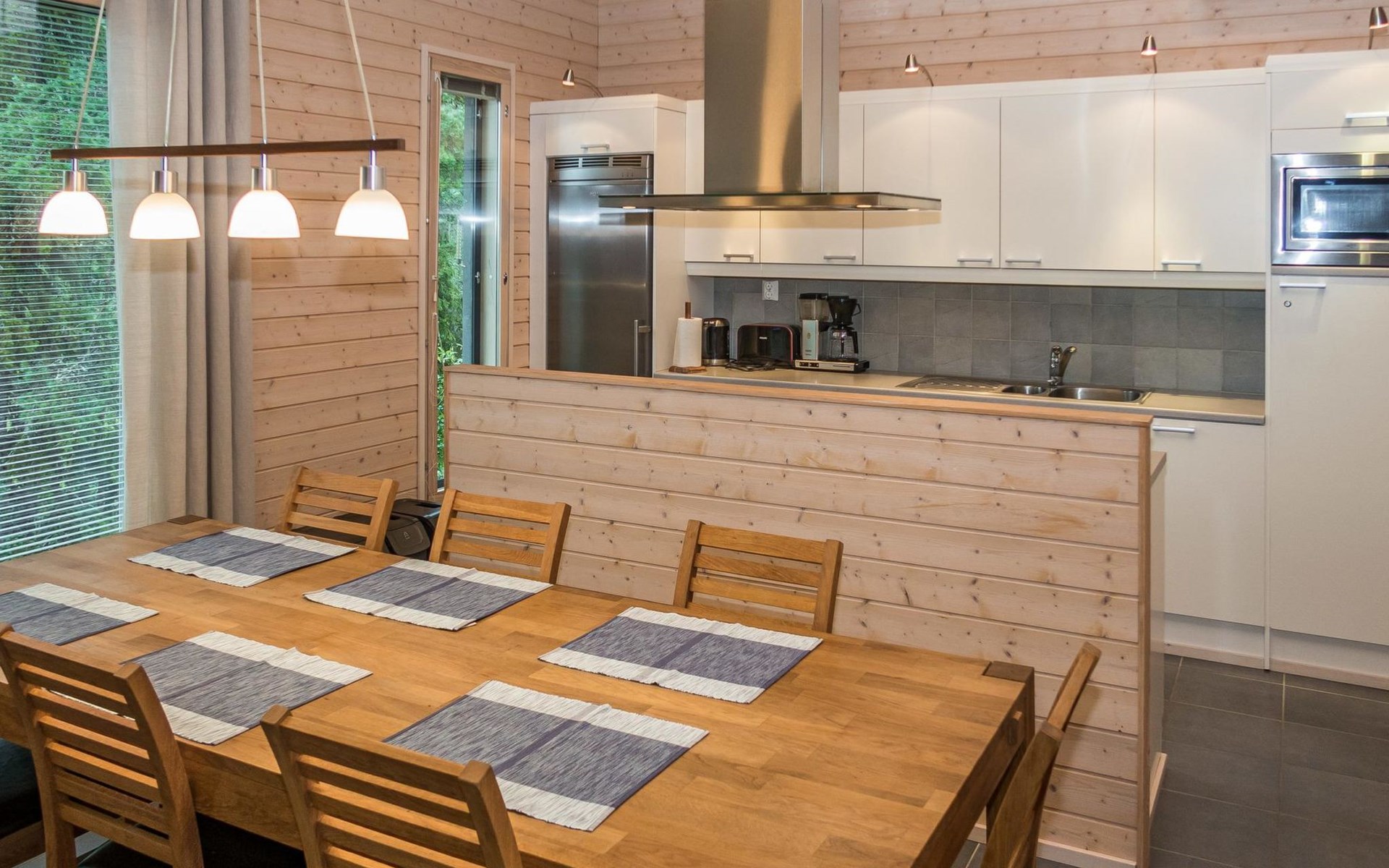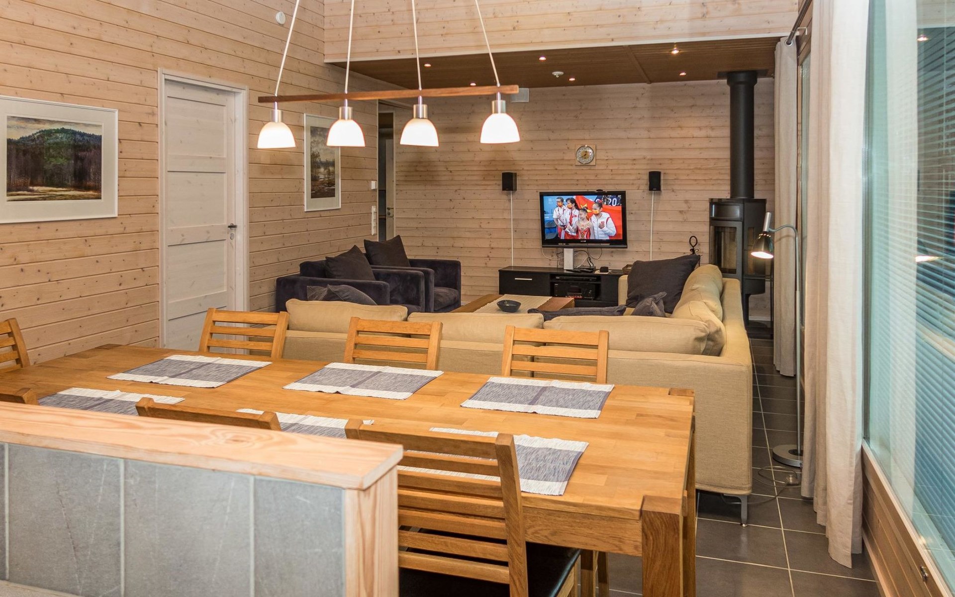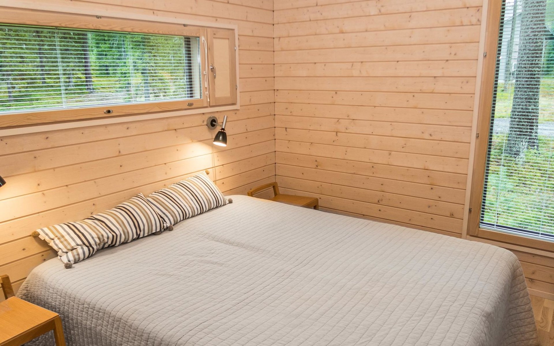 The large windows have great views over the pond Salmilampi and Salmilampi hill. The landscape changes according to the seasons, from summer green to the autumn colors and not forgetting the snow white in winter.