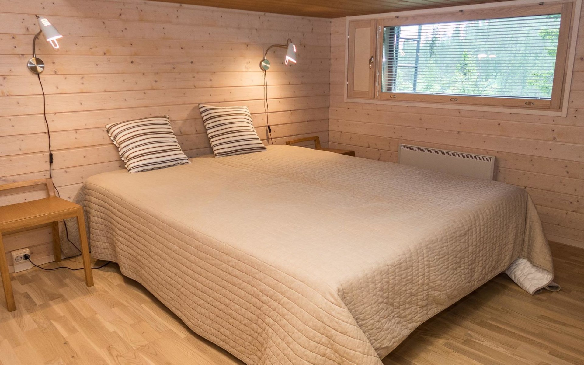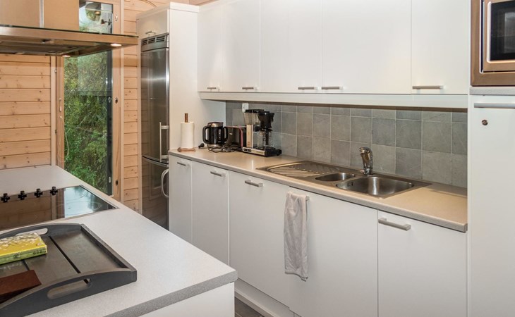 The kitchen has tableware for 12 people. On the ground floor three bedrooms, one with double bed and two with single beds. On the upper floor large bedroom (double bed + extra bed), part of the space has a low room height. Ground floor area is 99 m² and upstairs area 17,5 m², part of the space of upstairs has a low room height.