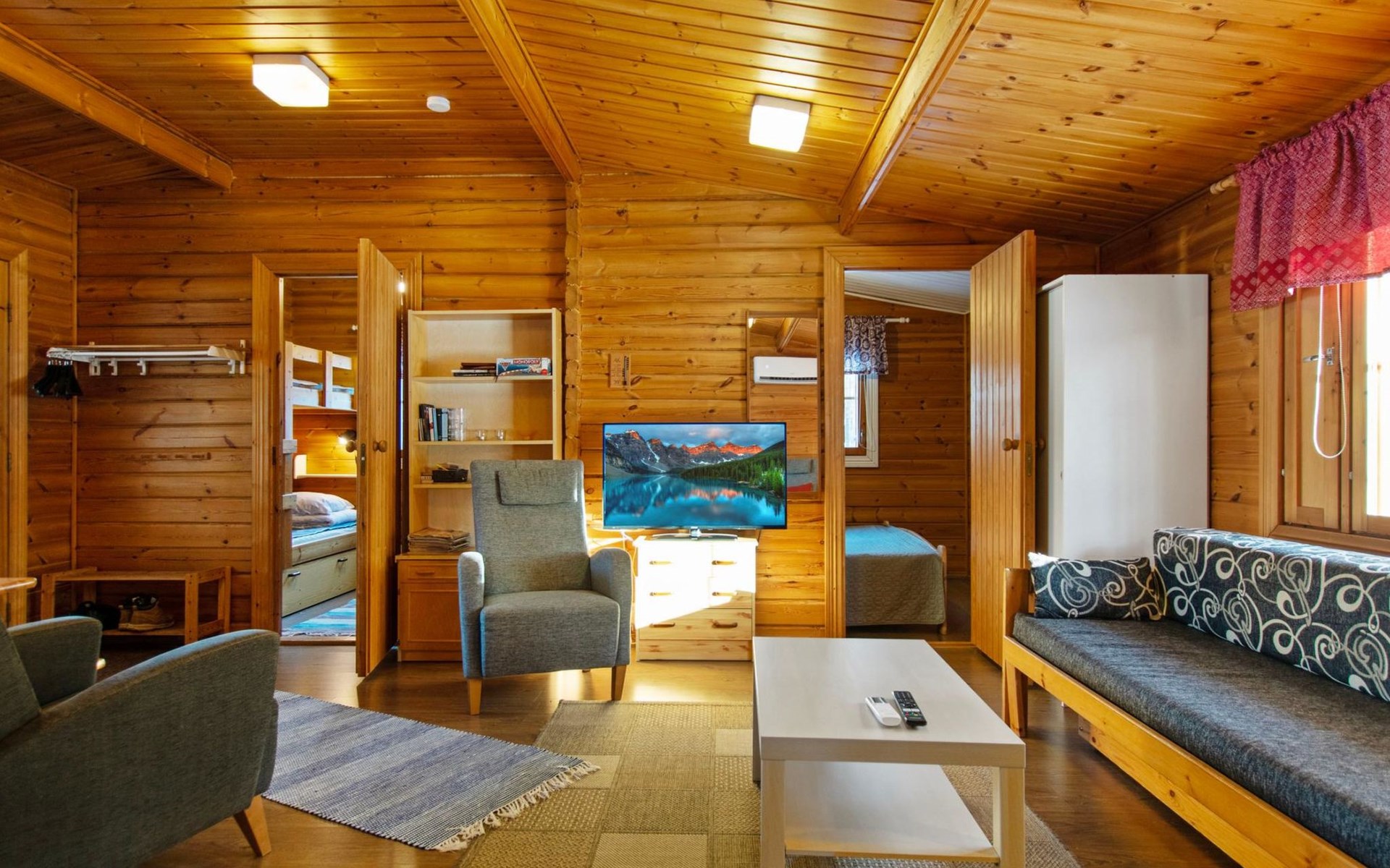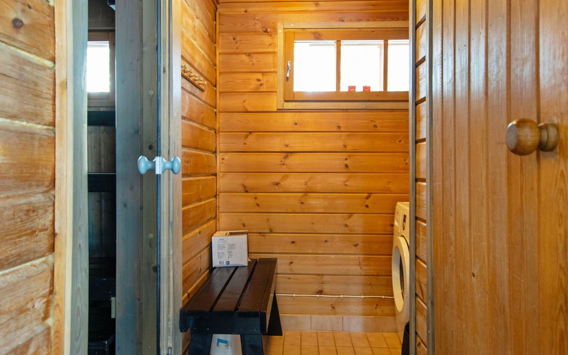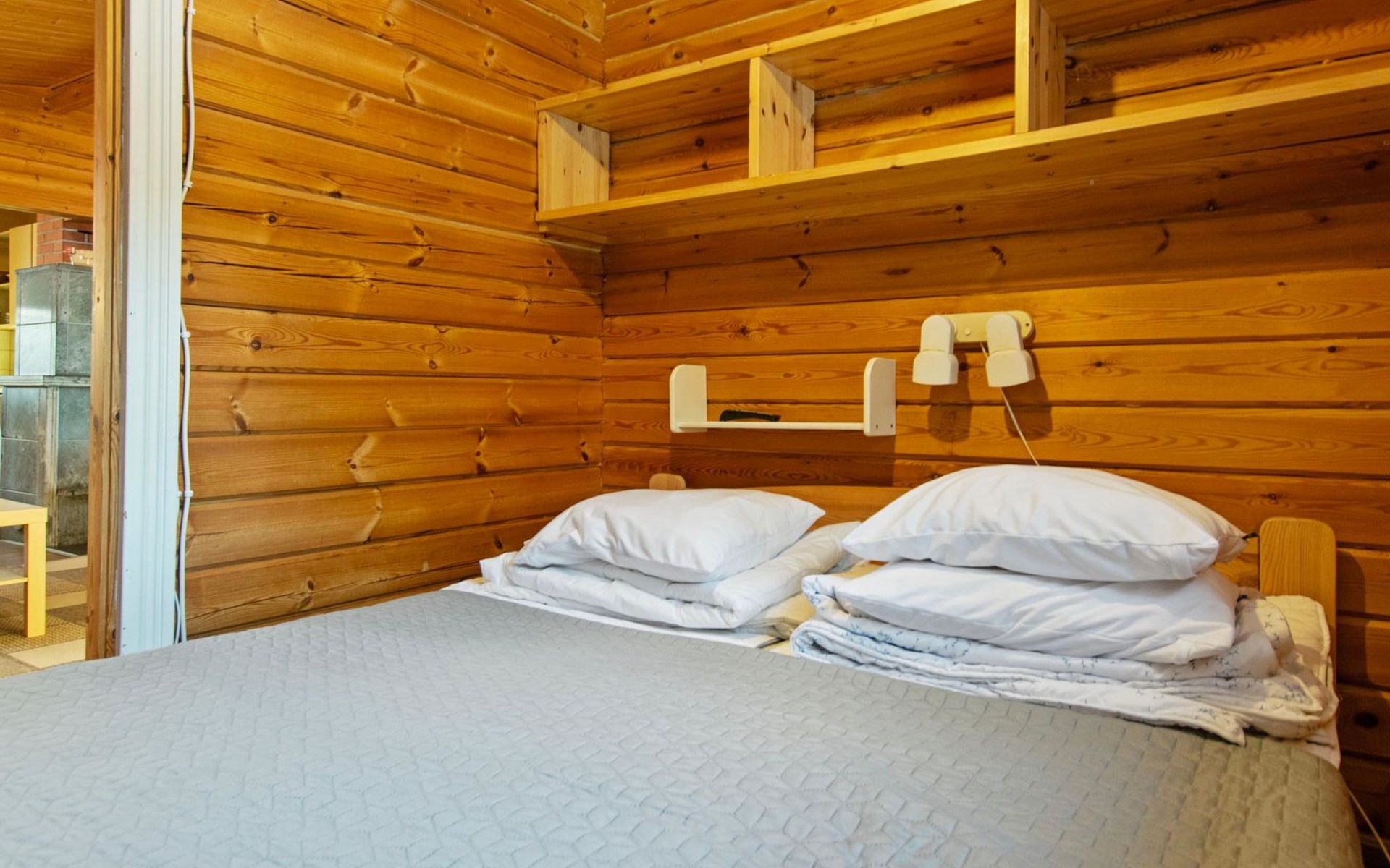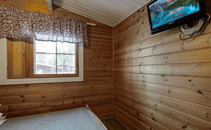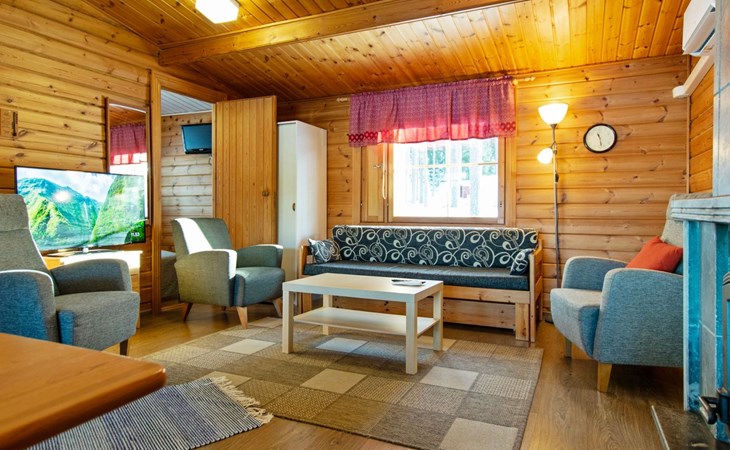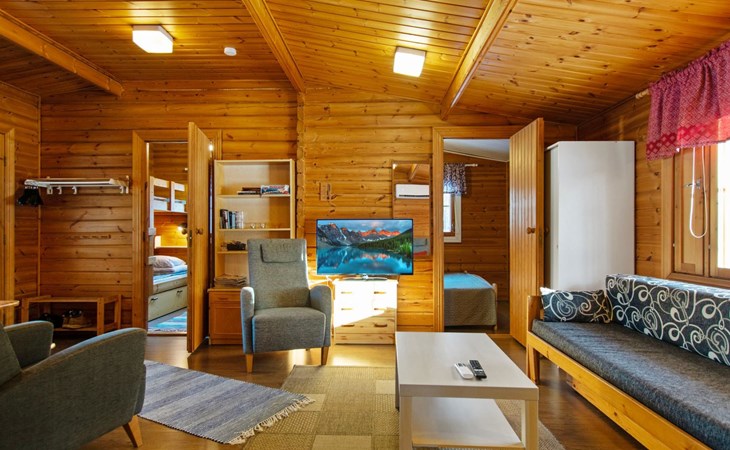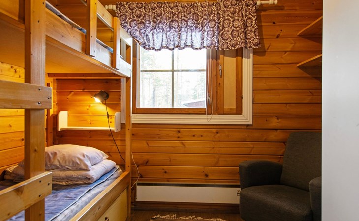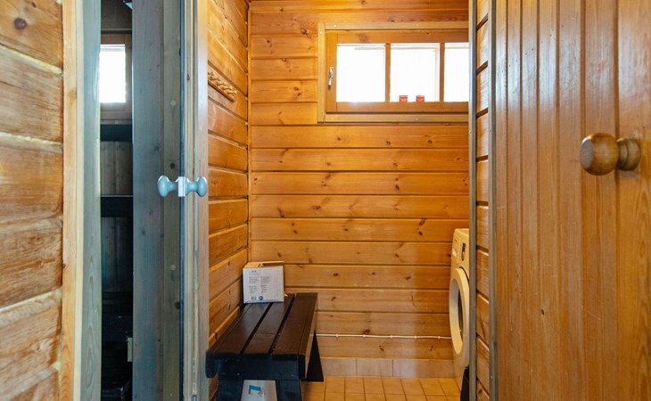 Log cabin 1991, kitchen, living room with 2 extra beds, bedroom with double bed, bedroom with bunk bed, dressing room, sauna and WC (entrance through veranda), open veranda.