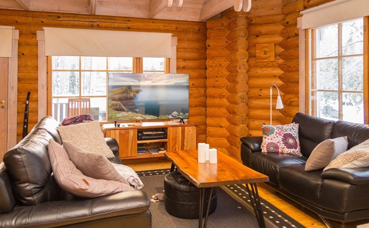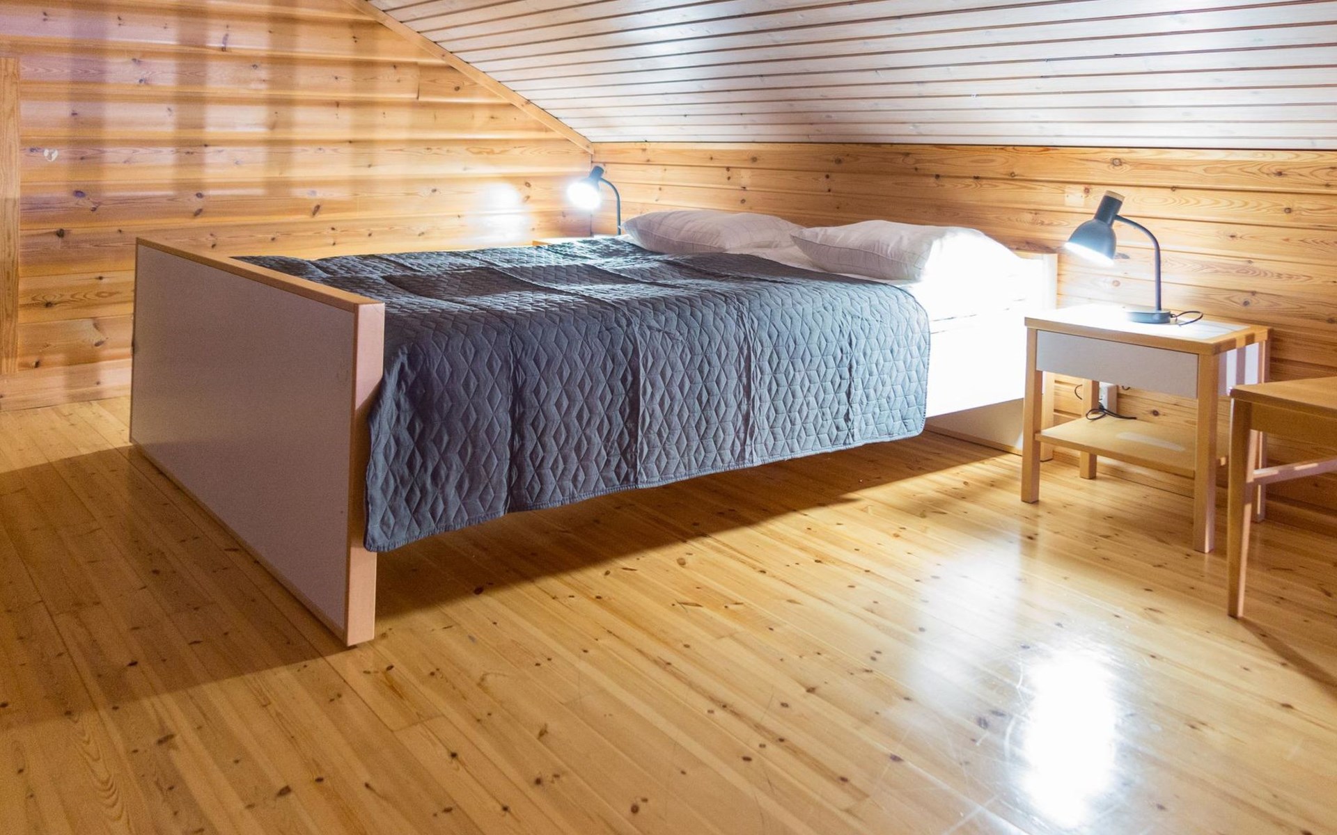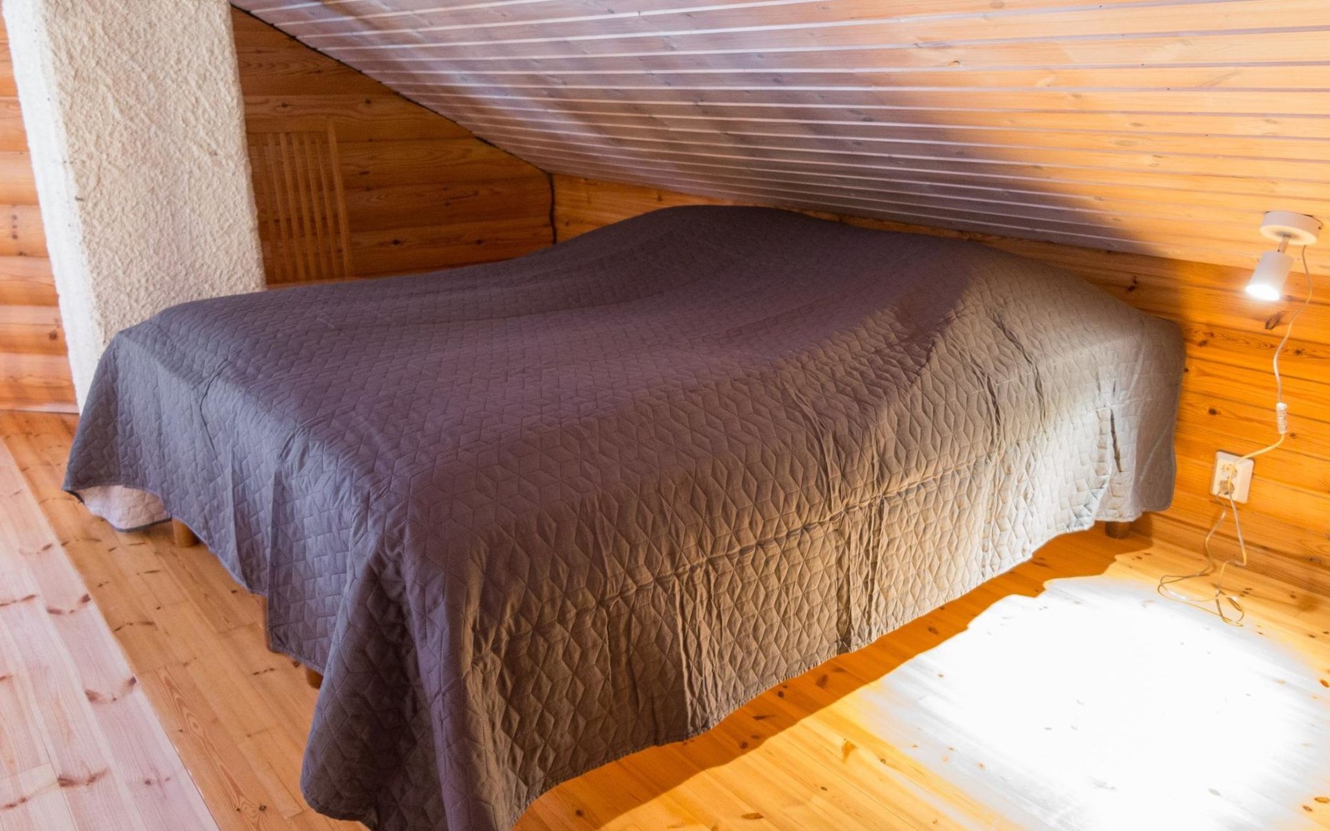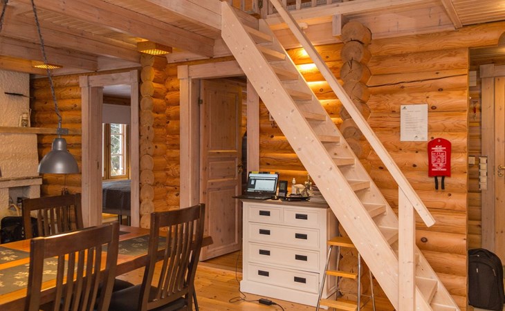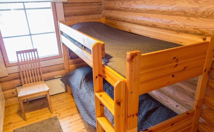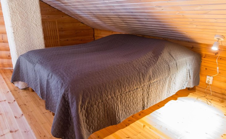 Log cabin, kitchen/living room, bedroom with a double bed, small bedroom with a bunk bed, double bed and 2 beds in the loft. As an alternative to the upper bed for the bunk bed, there is also an extra bed in the loft.