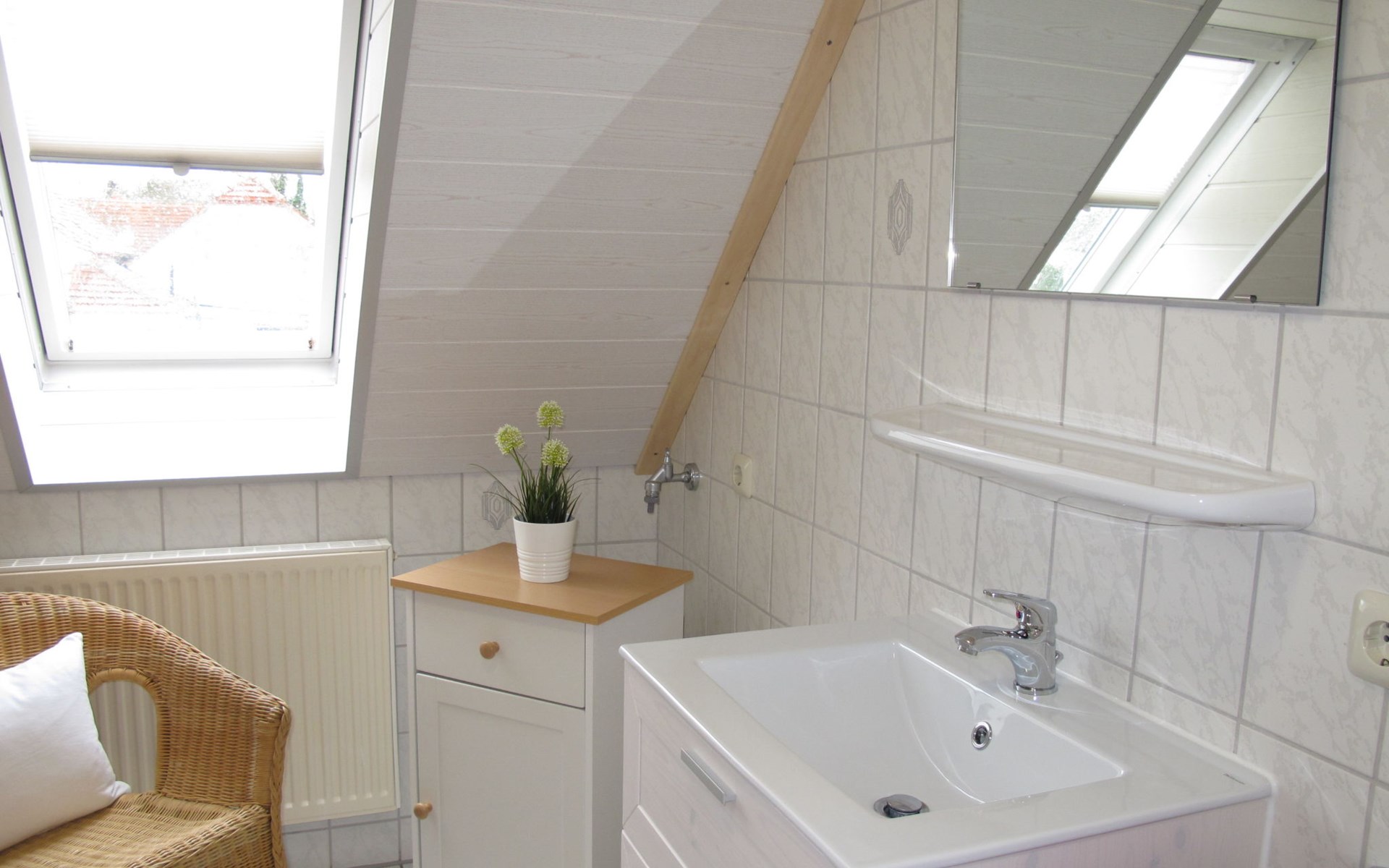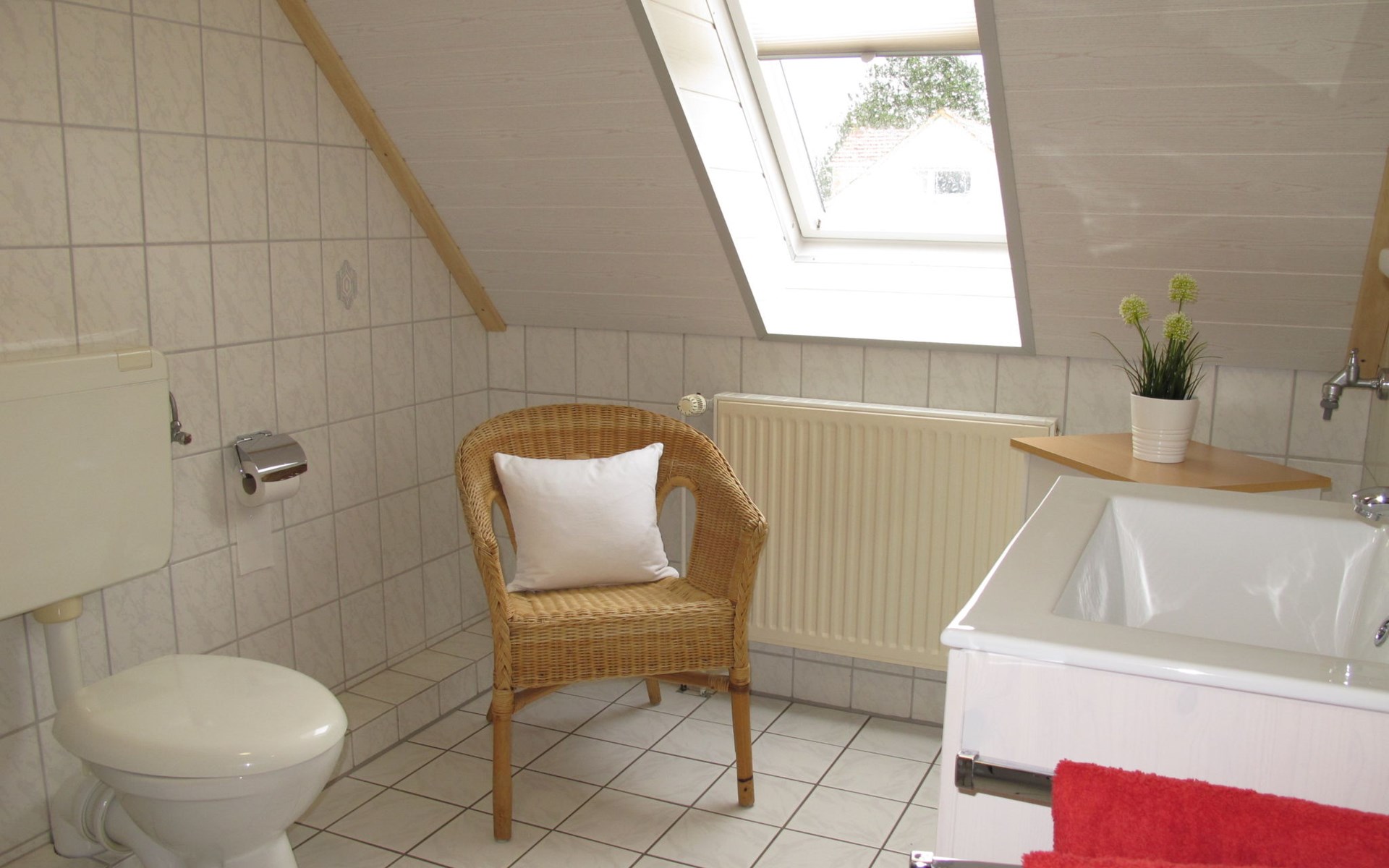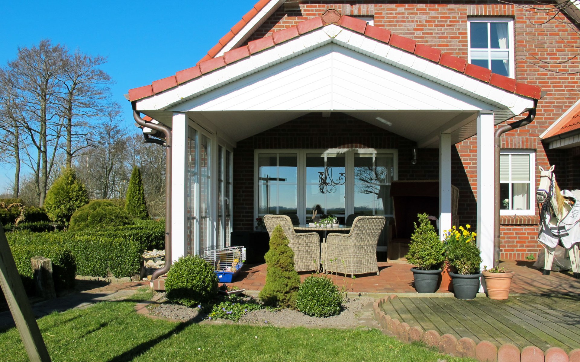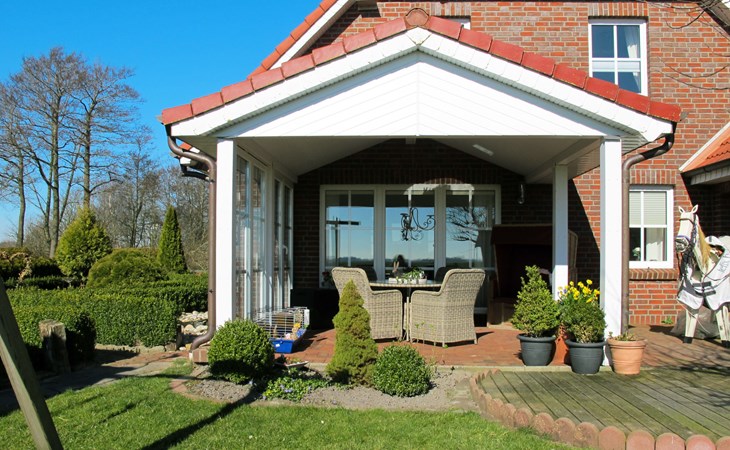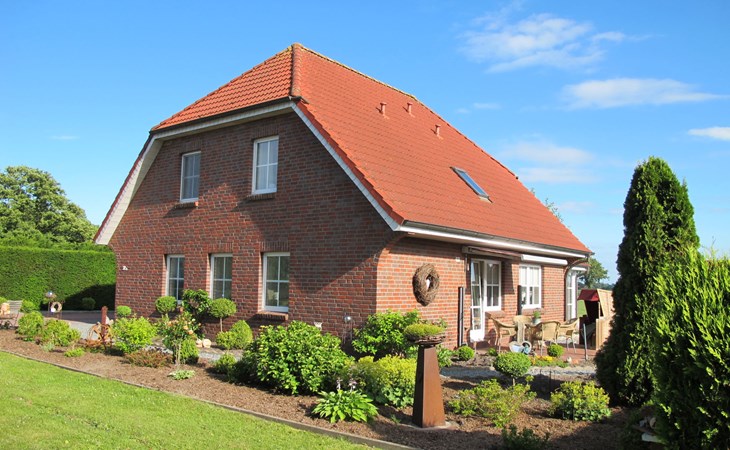 Wiarden 6 km from Horumersiel: 2-family house "Rosenboom". On the outskirts, 24 km from the centre of Wilhelmshaven, 6 km from the sea, 8 km from the lake. Private: property 700 m2 (fenced), well-kept garden with lawn and wildlife garden. Terrace, garden furniture, barbecue. In the house: storage room for bicycles, central heating system. Parking at the house. Supermarket 3 km, bus stop 100 m, railway station "Jever" 16 km, sandy beach "Hooksiel" 6 km, grass beach "Horumersiel" 6 km, outdoor swimming pool 6 km, indoor swimming pool 6 km. Marina 6 km. Storage room for bicycles is lockable.