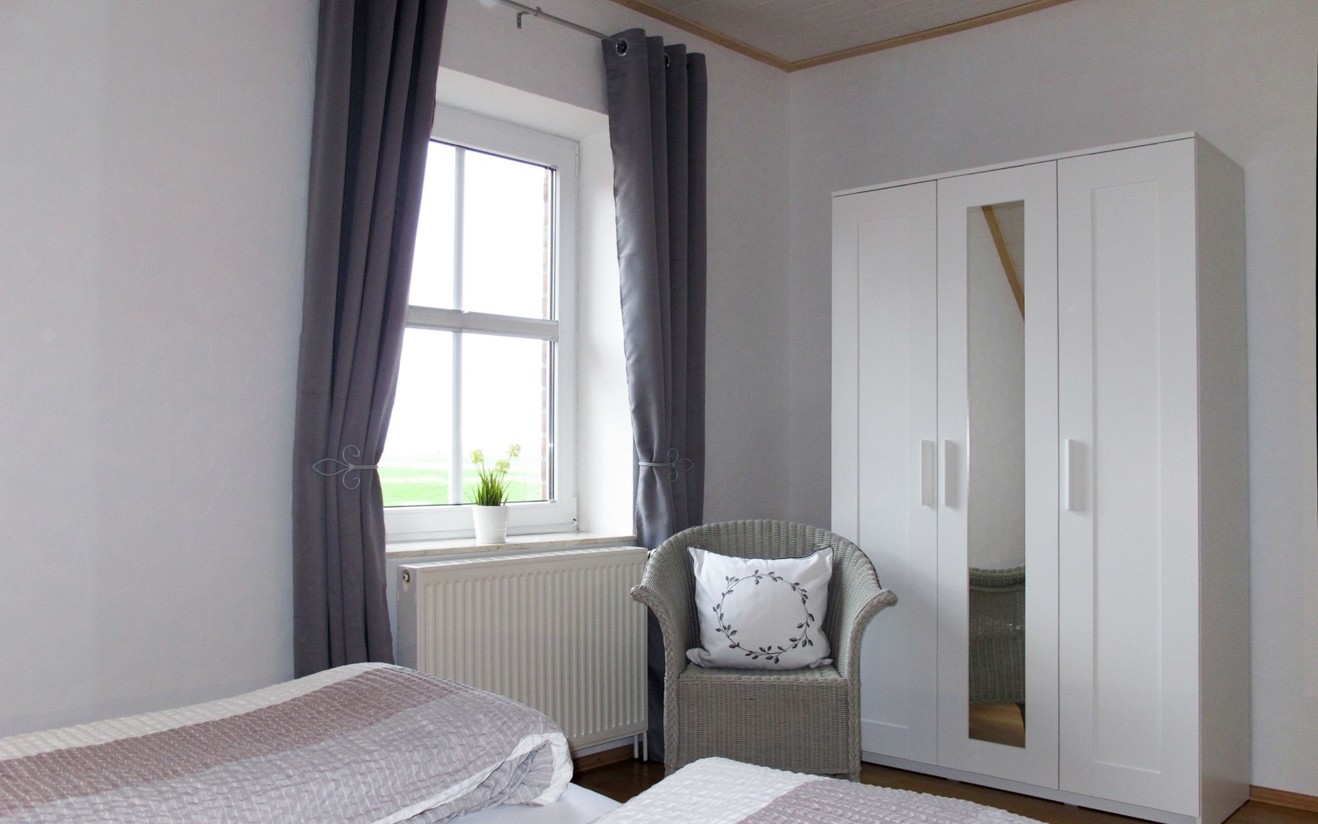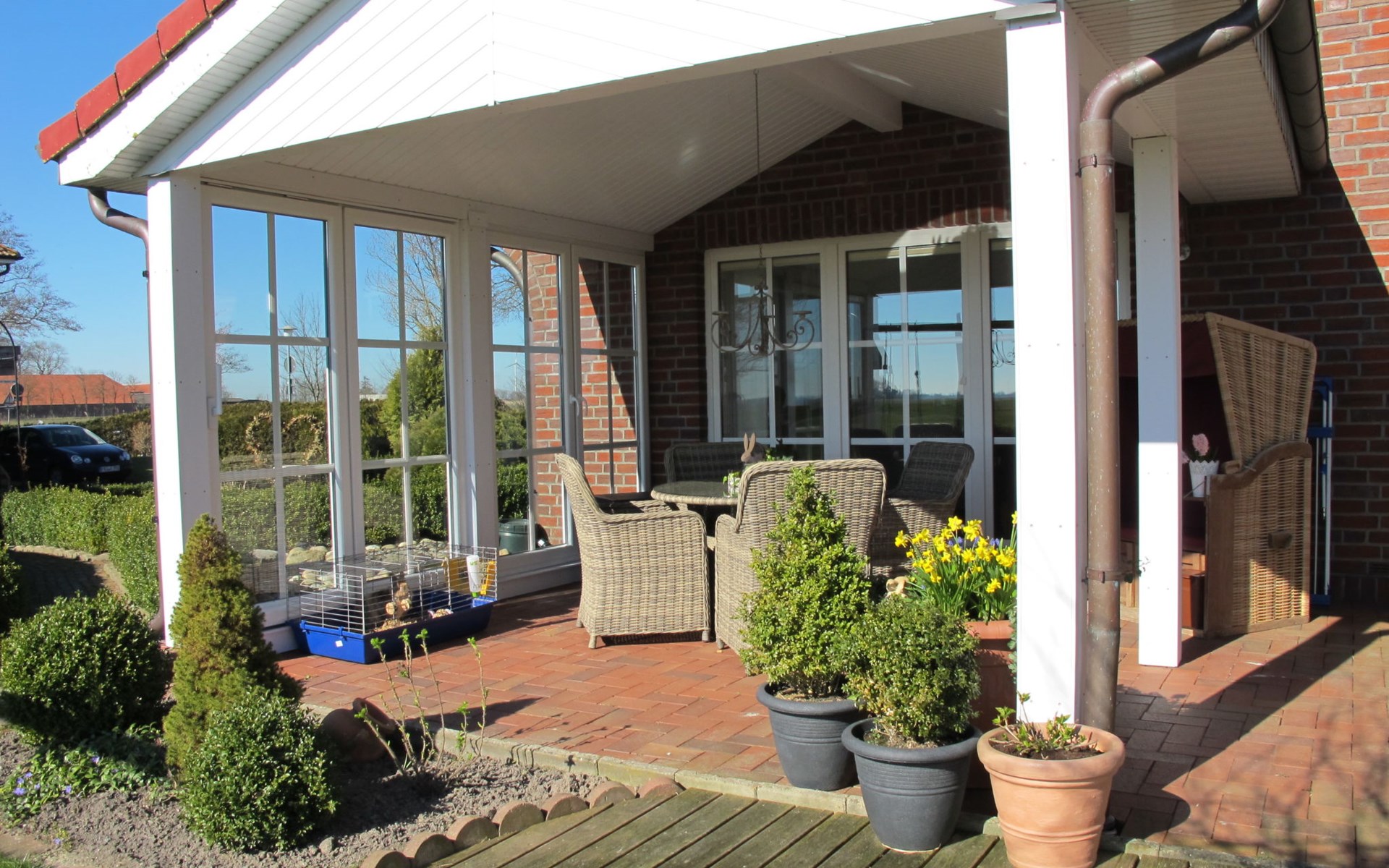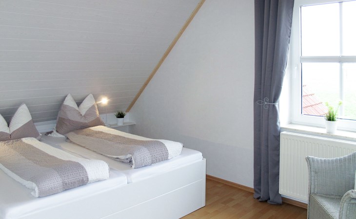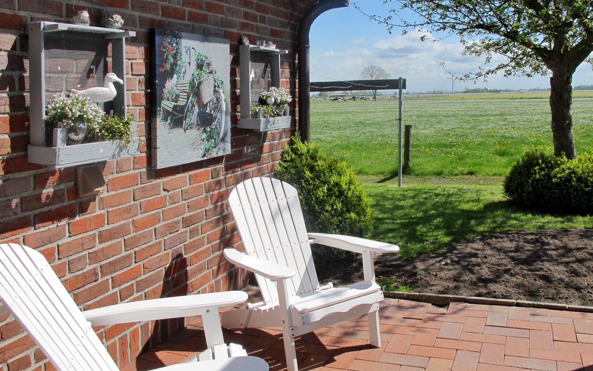 Wiarden 6 km from Horumersiel: 2-family house "Rosenboom". On the outskirts, 24 km from the centre of Wilhelmshaven, 6 km from the sea, 8 km from the lake. Private: property 700 m2 (fenced), well-kept garden with lawn and wildlife garden. Terrace, garden furniture, barbecue. In the house: storage room for bicycles, central heating system. Parking at the house. Supermarket 3 km, bus stop 100 m, railway station "Jever" 16 km, sandy beach "Hooksiel" 6 km, grass beach "Horumersiel" 6 km, outdoor swimming pool 6 km, indoor swimming pool 6 km. Marina 6 km. Storage room for bicycles is lockable.