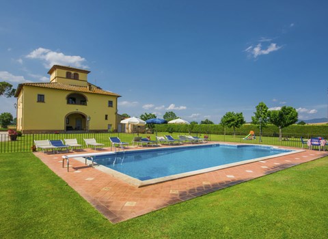 Casale il Poggino, located in a hilly position in the heart of the Chianti Classico, consists of two units, the farmhouse which is divided into three apartments (for 12 people) communicating with each other from the outside and the annex (for 04 people). Country house "Casale Il Poggino", 400 m a.s.l.. 2 houses in the residence. 5.8 km from the centre of Castellina in Chianti, 26 km from the centre of Siena, 42 km from the centre of Firenze, in a secluded, quiet, sunny position on top of a hill, in the countryside. Private: garden 1 ha (fenced), swimming pool fenced (12 x 6 m, depth 120 - 240 cm, seasonal availability: 01.Apr. - 31.Oct.). Outdoor shower, table tennis, pergola, garden furniture, barbecue. In the complex: fitness room, storage room for bicycles, heating to be paid on the spot, heating available only from 01.Nov. - 07.Apr., bicycle rental. Available: bicycles (4). Cook on request (extra). Motor access to the house (1.5 km via unmade road). Roofed, parking on the premises. Grocery 5.8 km, supermarket 5.8 km, restaurant 5.8 km, bus stop 3.5 km, thermal baths "Rapolano Terme" 50 km. Nearby attractions: San Donato in Poggio 16 km, Radda in Chianti 16 km, Monteriggioni 18 km, Gaiole in Chianti 19 km, Greve in Chianti 25 km, San Gimignano 47 km. Residence with electric gates. Video surveillance in the outdoor area.