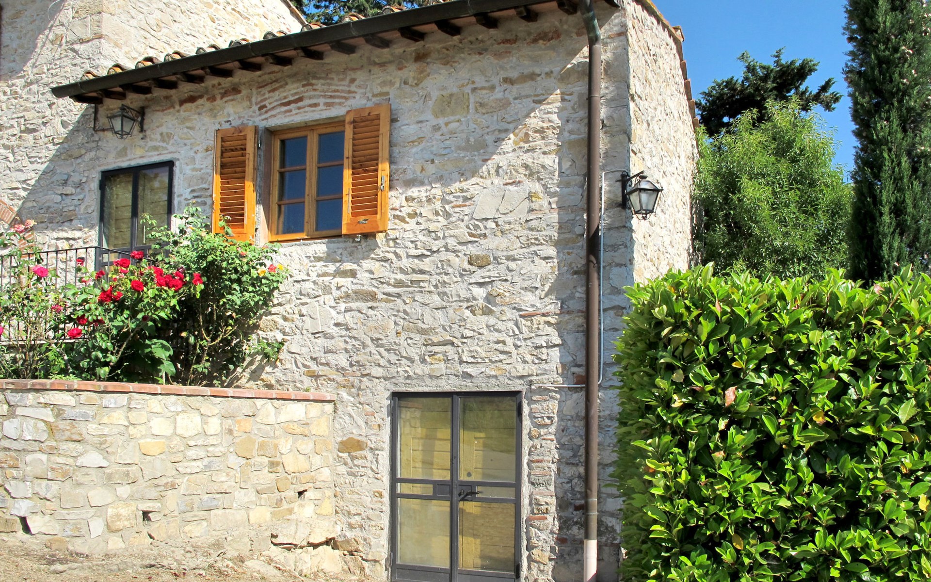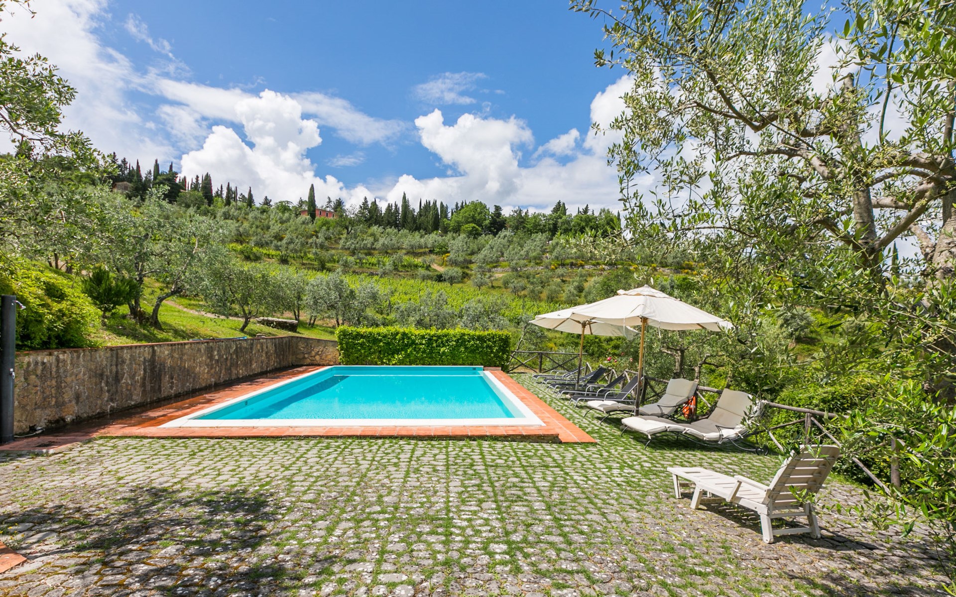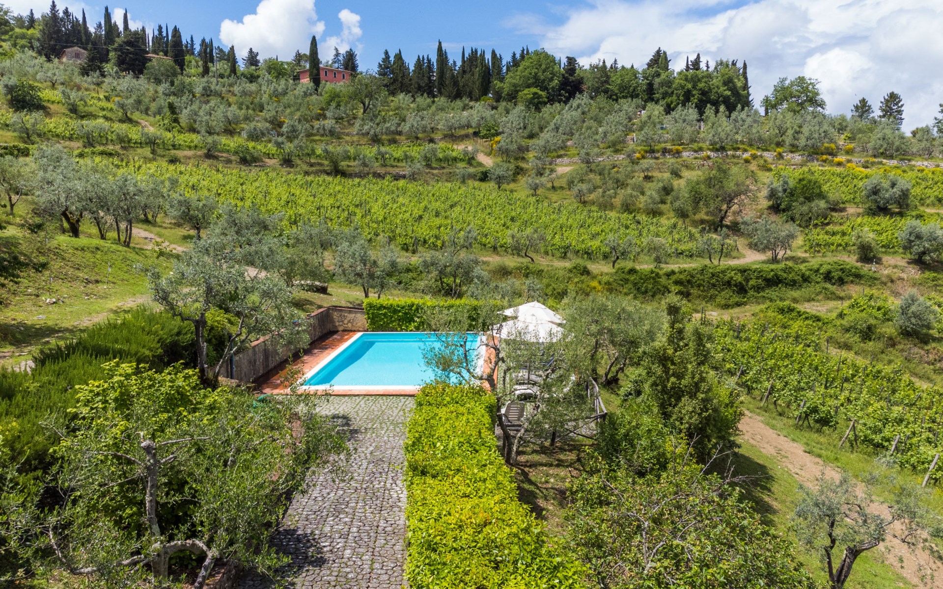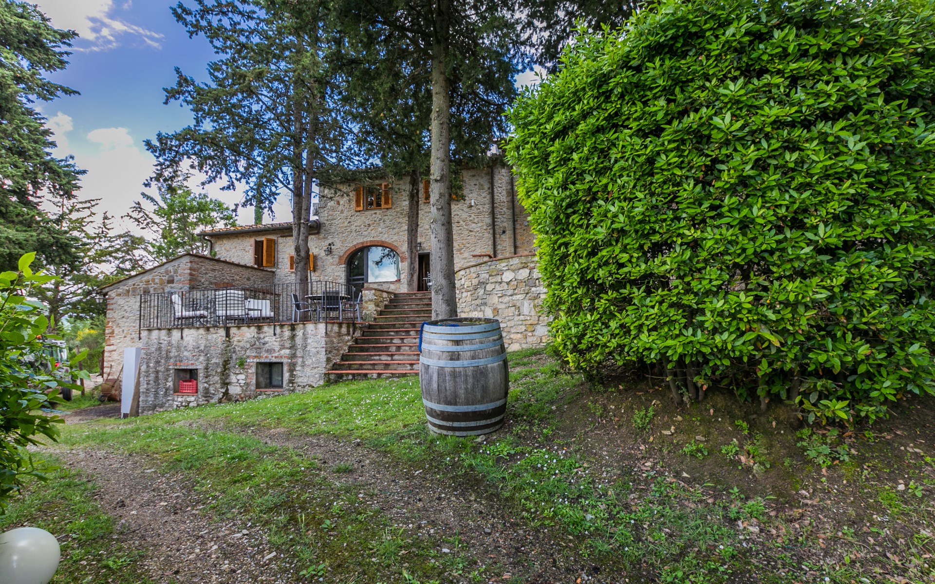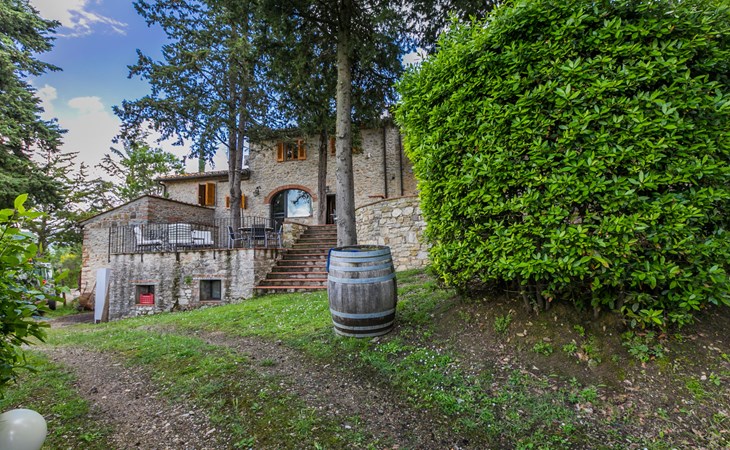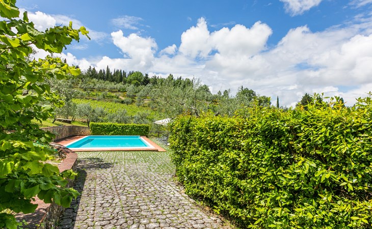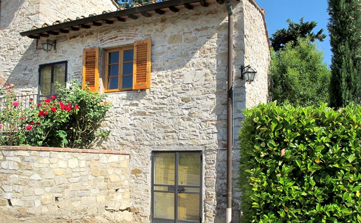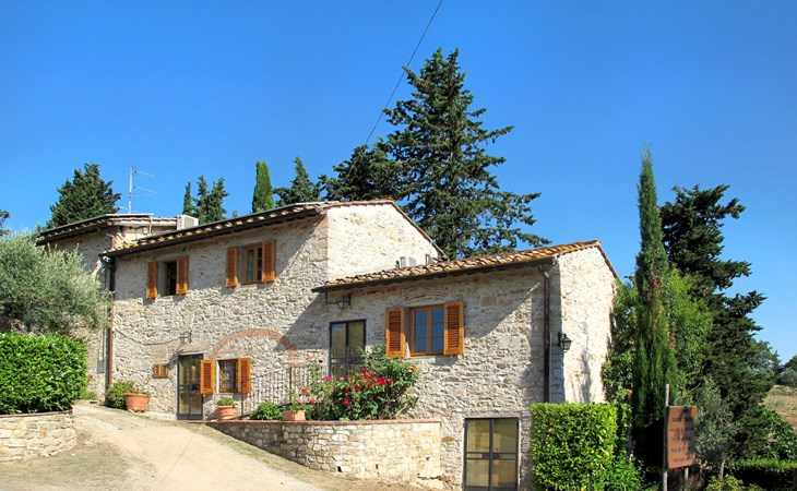 Montefioralle 3 km from Greve in Chianti: Agriturismo on a vinyard "San Rocco", 2 storeys, from the 19th century, surrounded by trees, fields and vineyards. 3 apartments in the residence. 3 km from the centre of Greve in Chianti, 1 km from the centre of Montefioralle, outside the resort, 25 km from the centre of Firenze, in a sunny position, in the countryside. For shared use: terraced garden, 4 ha (not fenced) with plants and trees, natural garden, swimming pool (12 x 6 m, depth 120 - 180 cm, seasonal availability: 02.May. - 03.Oct. pool opening hours: 08:00-20:00). Outdoor shower, barbecue, pool maintenance by the owner/gardener. In the house: washing machine (extra). Parking on the premises. Grocery 3 km, restaurant 3 km, bus stop 3 km, outdoor swimming pool 3 km. Golf course (18 hole) 18 km. Local sale of farm products. Owner lives in separate semi-detached house.