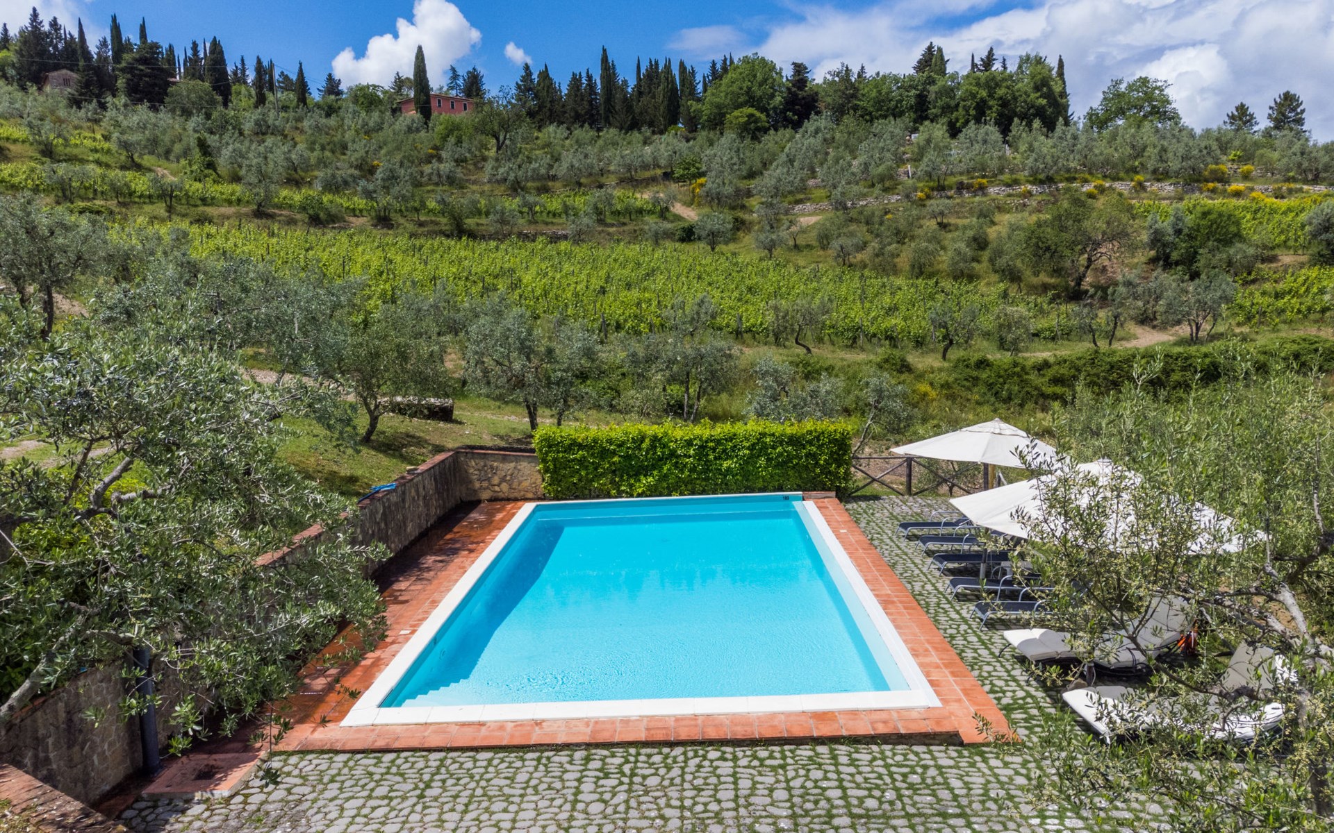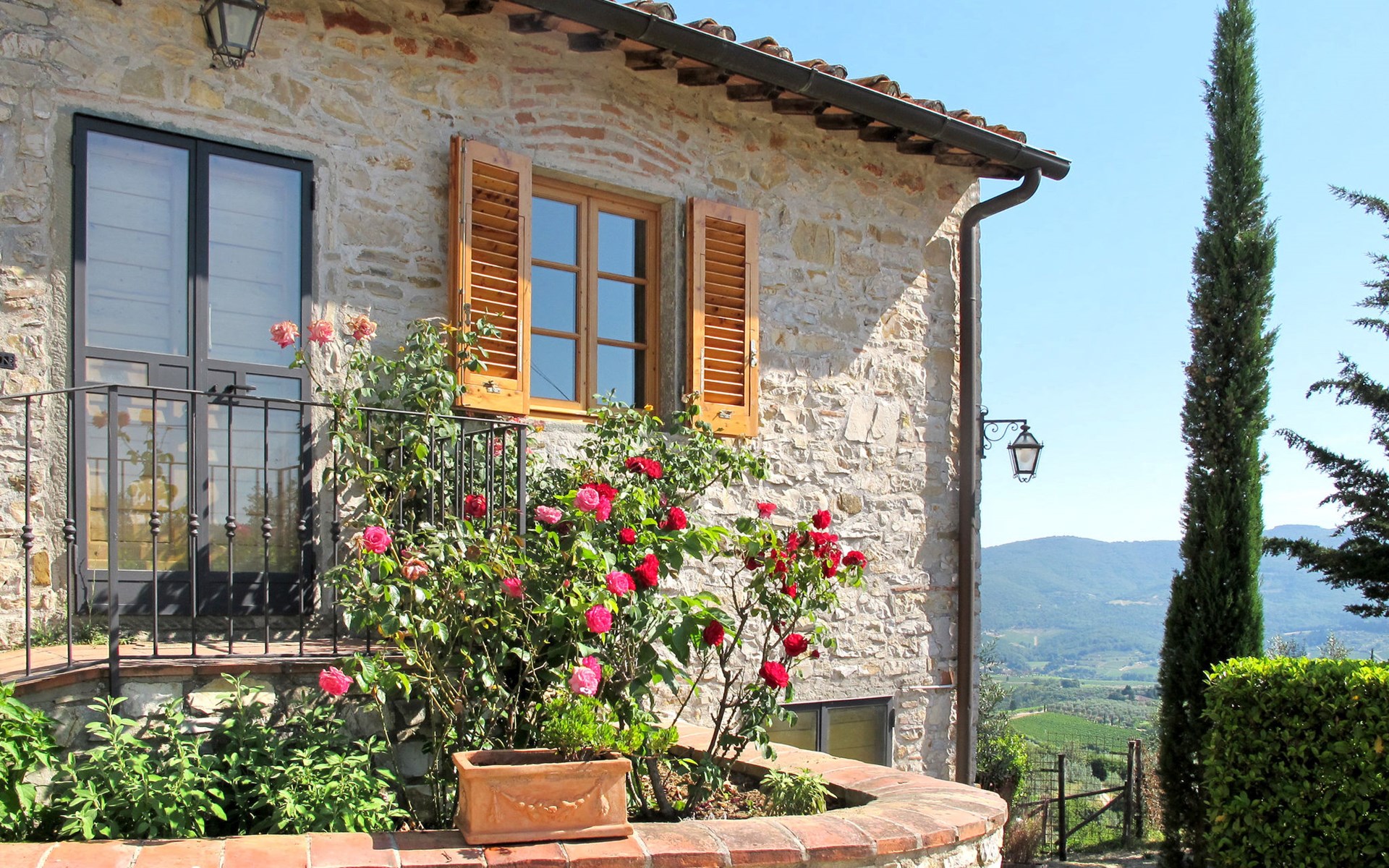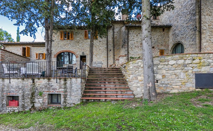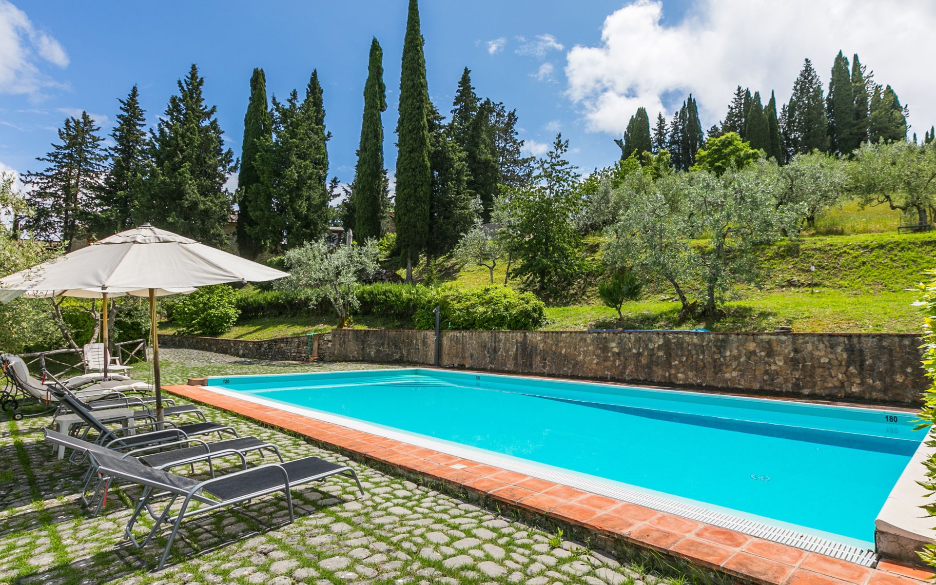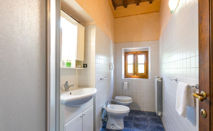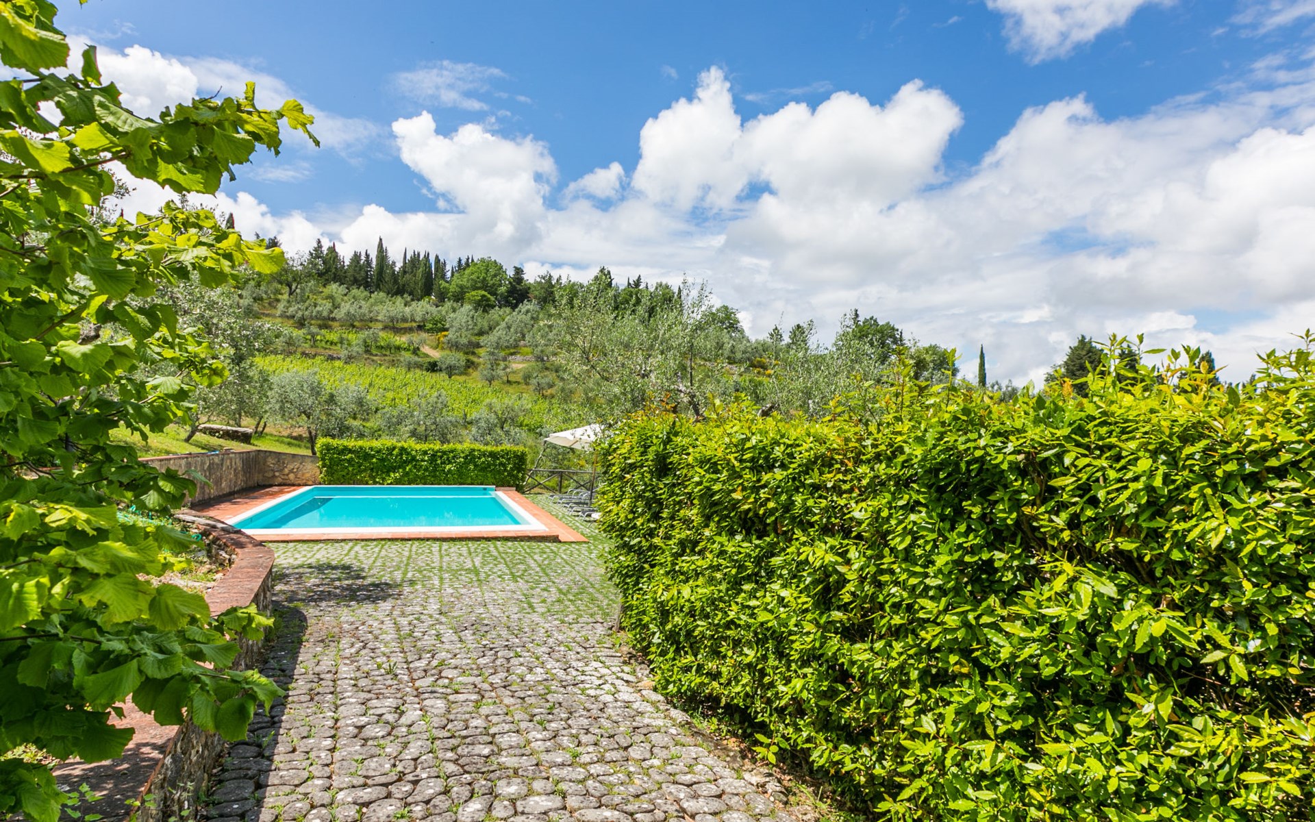 Montefioralle 3 km from Greve in Chianti: Agriturismo on a vinyard "San Rocco", 2 storeys, from the 19th century, surrounded by trees, fields and vineyards. 3 apartments in the residence. 3 km from the centre of Greve in Chianti, 1 km from the centre of Montefioralle, outside the resort, 25 km from the centre of Firenze, in a sunny position, in the countryside. For shared use: terraced garden, 4 ha (not fenced) with plants and trees, natural garden, swimming pool (12 x 6 m, depth 120 - 180 cm, seasonal availability: 02.May. - 03.Oct. pool opening hours: 08:00-20:00). Outdoor shower, barbecue, pool maintenance by the owner/gardener. In the house: washing machine (extra). Parking on the premises. Grocery 3 km, restaurant 3 km, bus stop 3 km, outdoor swimming pool 3 km. Golf course (18 hole) 18 km. Local sale of farm products. Owner lives in separate semi-detached house.