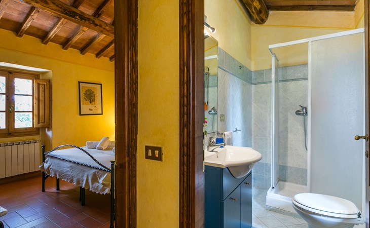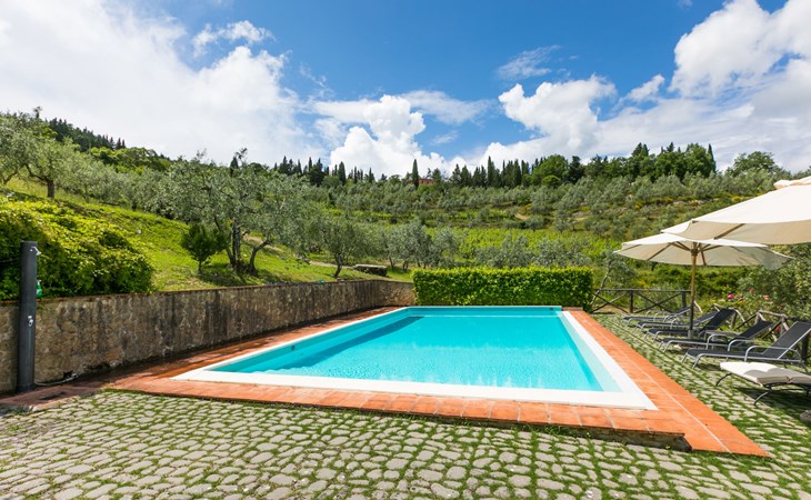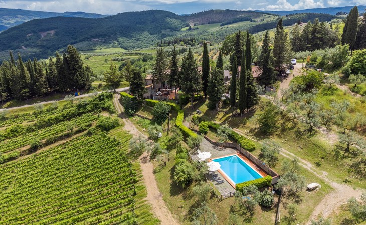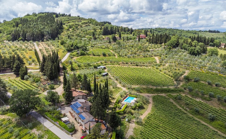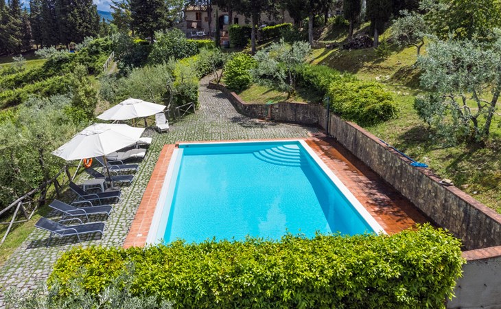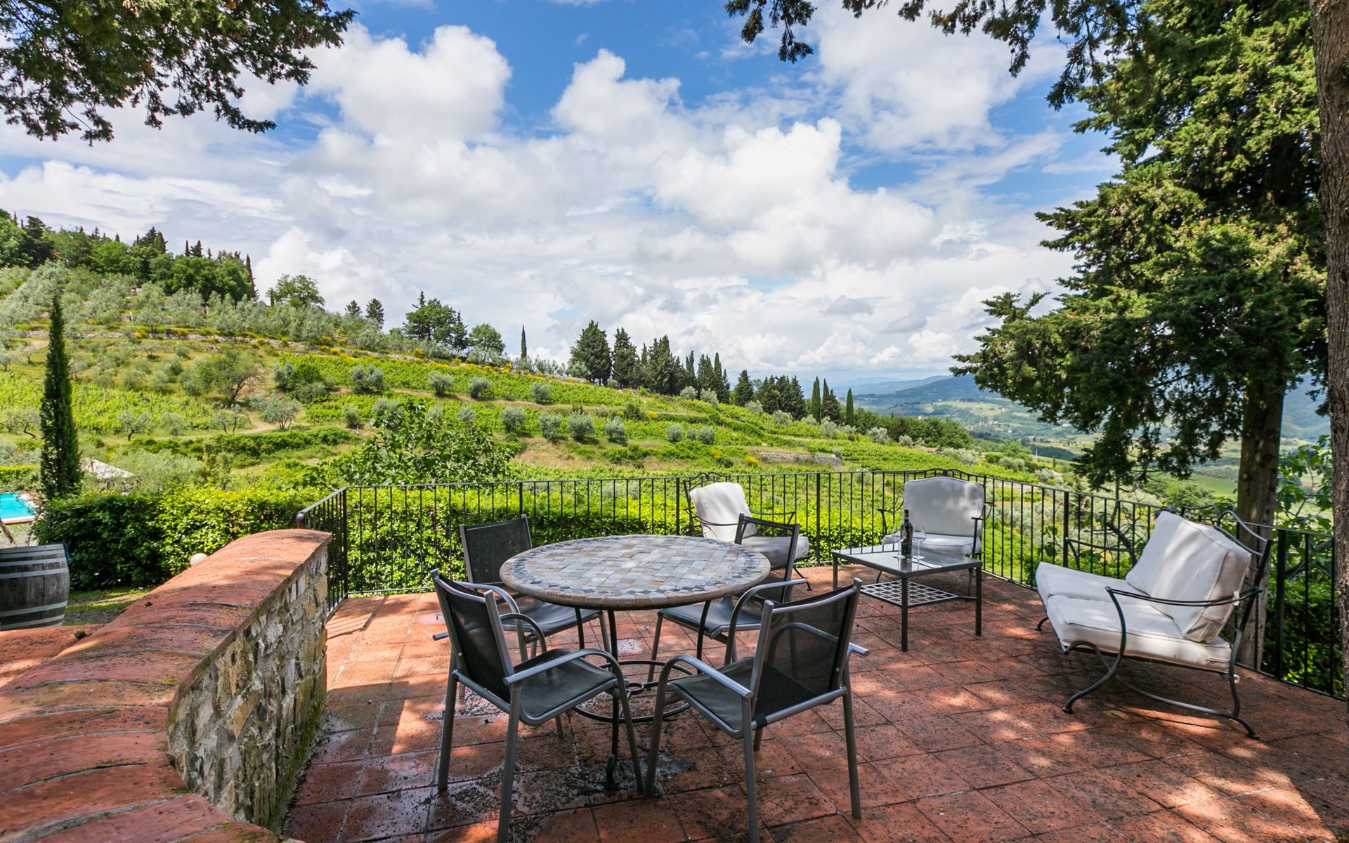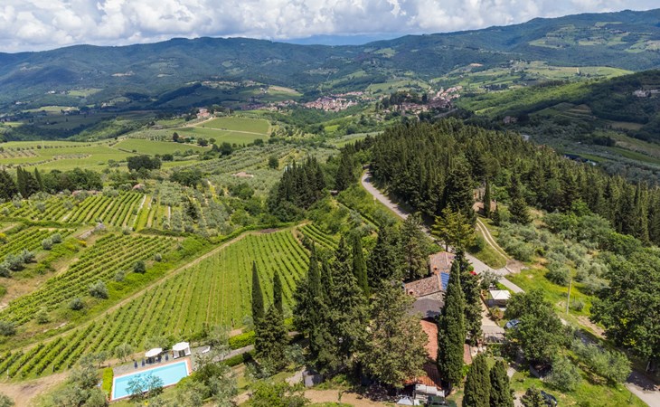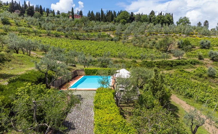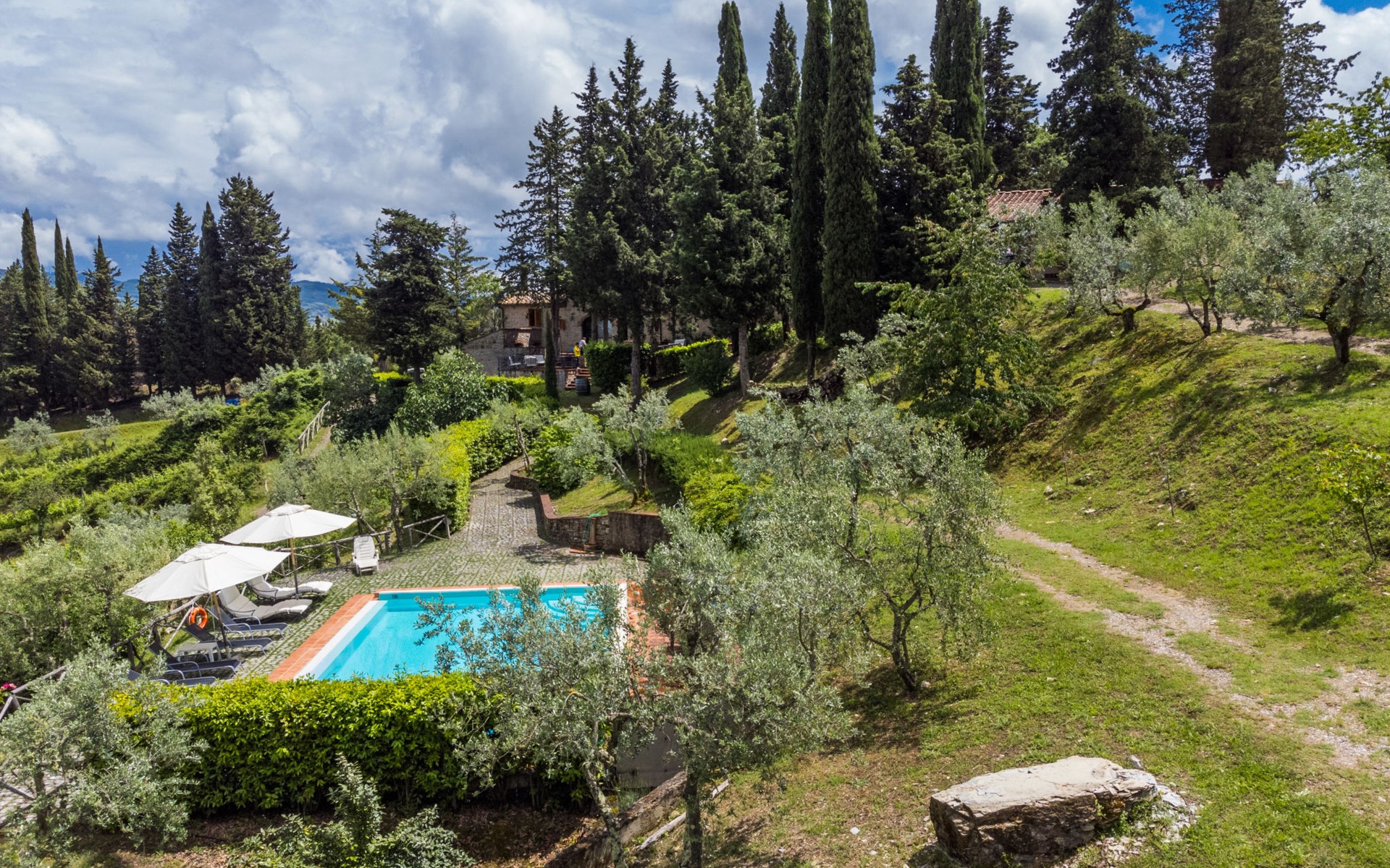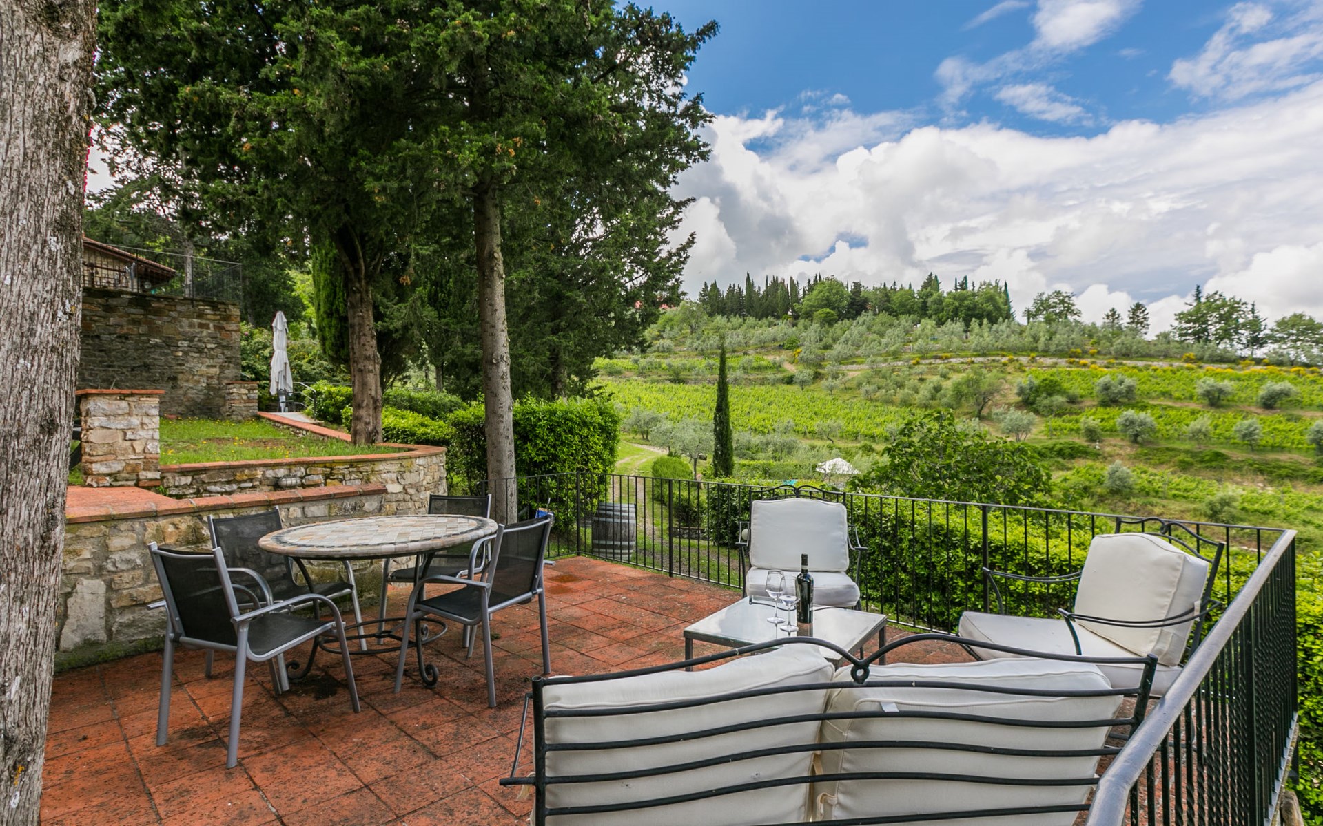 Montefioralle 3 km from Greve in Chianti: Agriturismo on a vinyard "San Rocco", 2 storeys, from the 19th century, surrounded by trees, fields and vineyards. 3 apartments in the residence. 3 km from the centre of Greve in Chianti, 1 km from the centre of Montefioralle, outside the resort, 25 km from the centre of Firenze, in a sunny position, in the countryside. For shared use: terraced garden, 4 ha (not fenced) with plants and trees, natural garden, swimming pool (12 x 6 m, depth 120 - 180 cm, seasonal availability: 02.May. - 03.Oct. pool opening hours: 08:00-20:00). Outdoor shower, barbecue, pool maintenance by the owner/gardener. In the house: washing machine (extra). Parking on the premises. Grocery 3 km, restaurant 3 km, bus stop 3 km, outdoor swimming pool 3 km. Golf course (18 hole) 18 km. Local sale of farm products. Owner lives in separate semi-detached house.