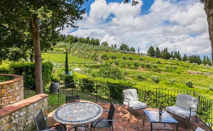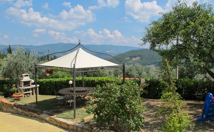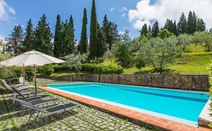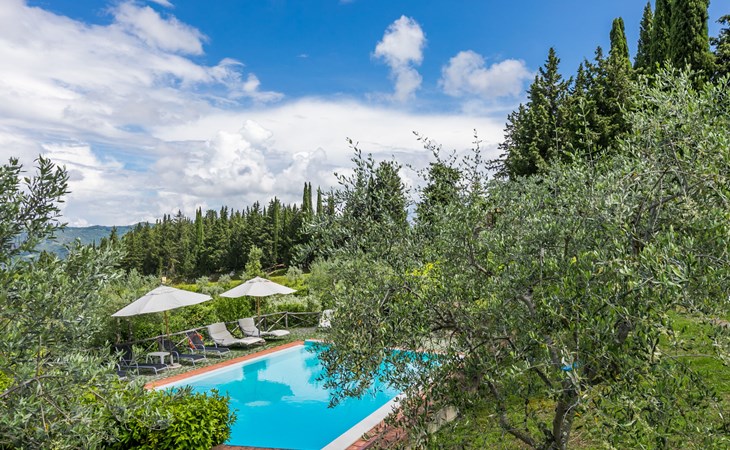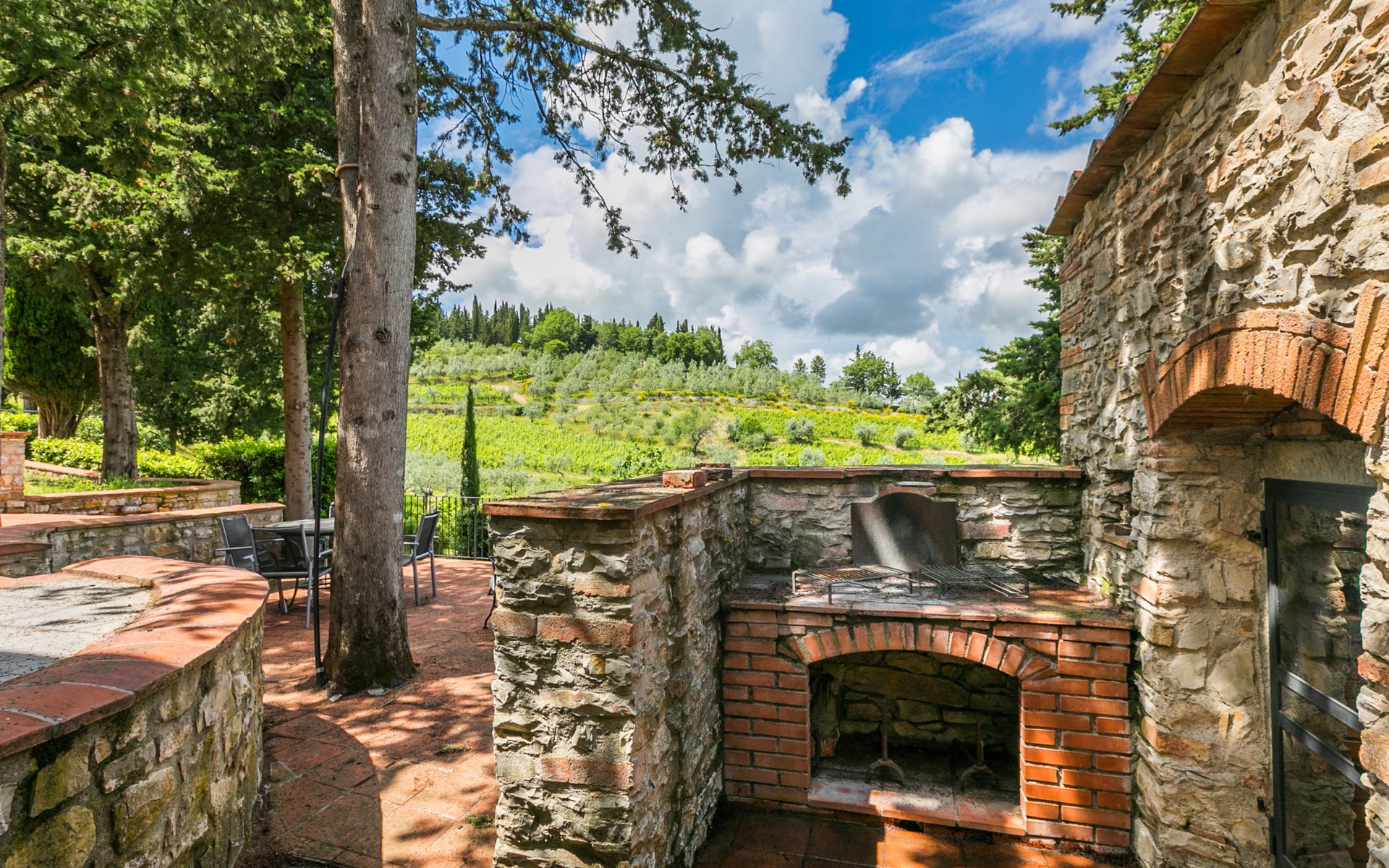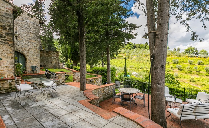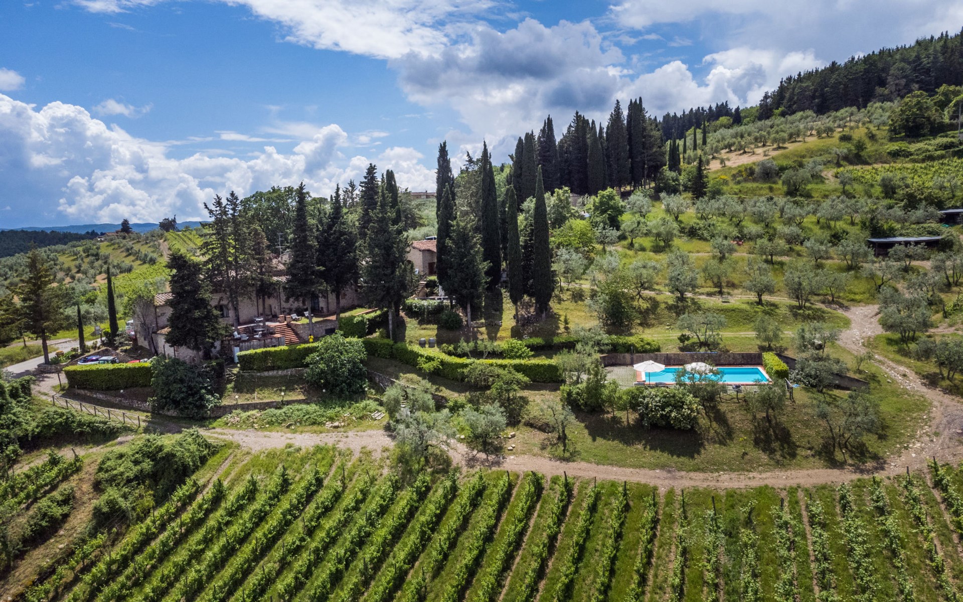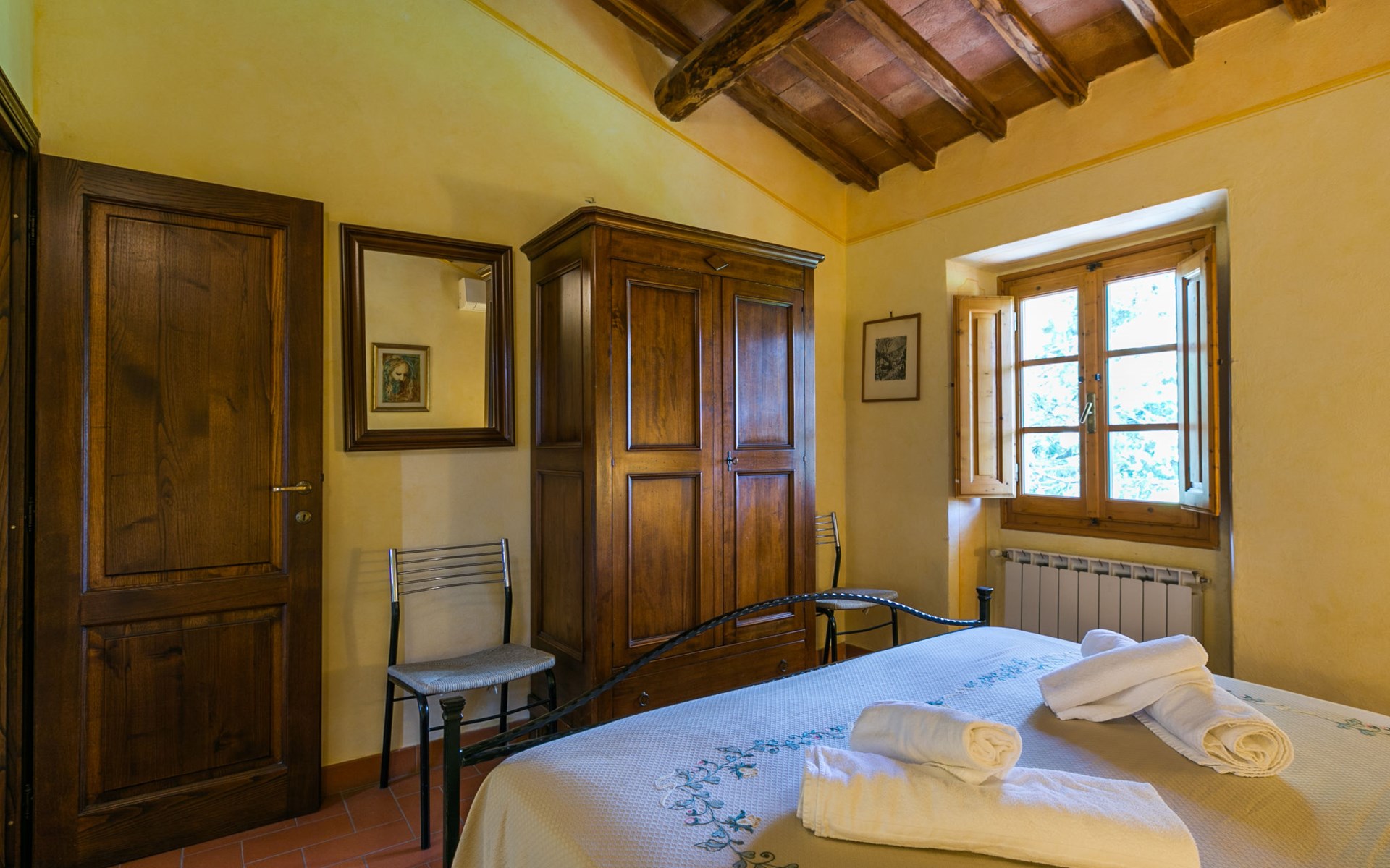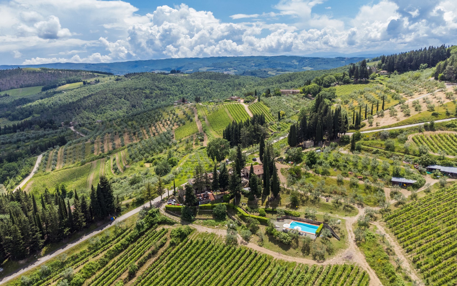Montefioralle 3 km from Greve in Chianti: Agriturismo on a vinyard "San Rocco", 2 storeys, from the 19th century, surrounded by trees, fields and vineyards. 3 apartments in the residence. 3 km from the centre of Greve in Chianti, 1 km from the centre of Montefioralle, outside the resort, 25 km from the centre of Firenze, in a sunny position, in the countryside. For shared use: terraced garden, 4 ha (not fenced) with plants and trees, natural garden, swimming pool (12 x 6 m, depth 120 - 180 cm, seasonal availability: 02.May. - 03.Oct. pool opening hours: 08:00-20:00). Outdoor shower, barbecue, pool maintenance by the owner/gardener. In the house: washing machine (extra). Parking on the premises. Grocery 3 km, restaurant 3 km, bus stop 3 km, outdoor swimming pool 3 km. Golf course (18 hole) 18 km. Local sale of farm products. Owner lives in separate semi-detached house.