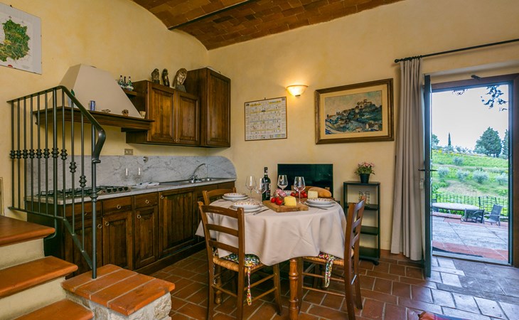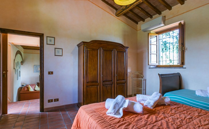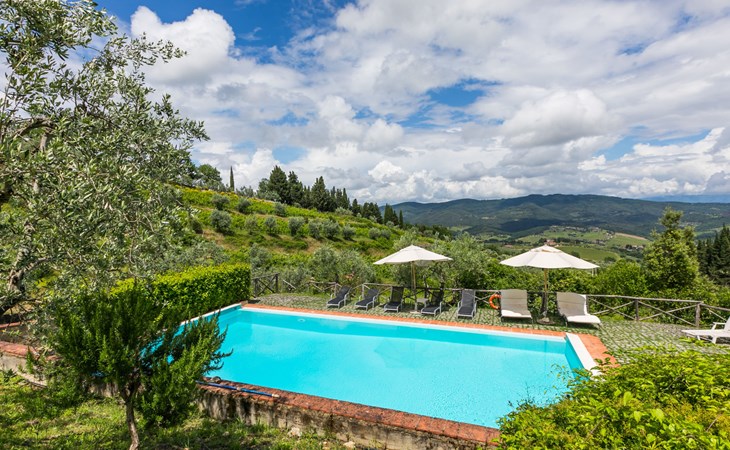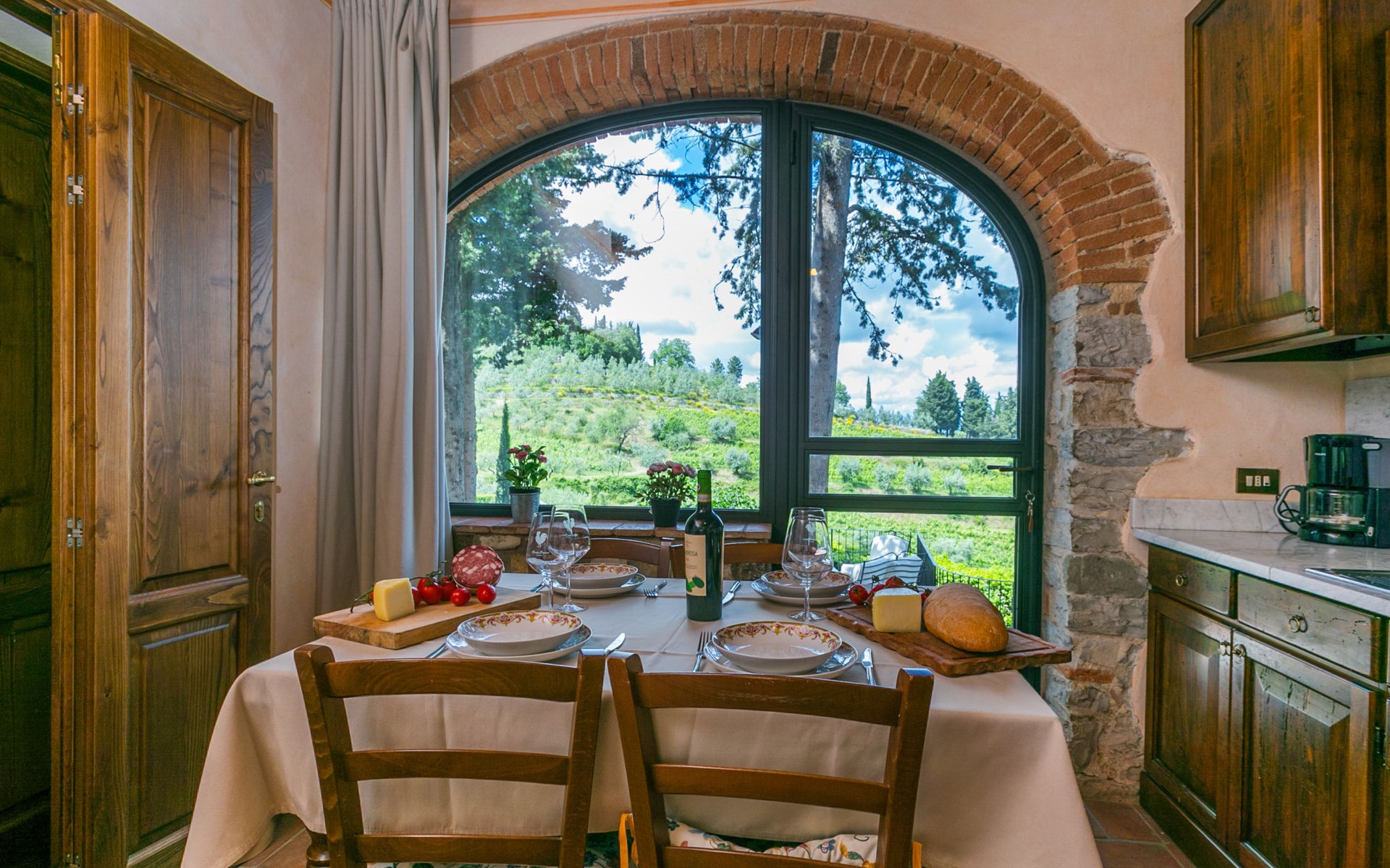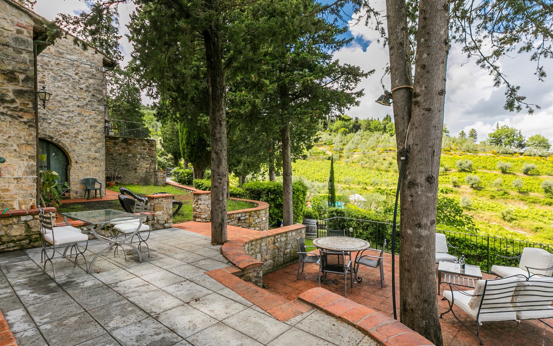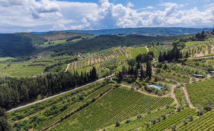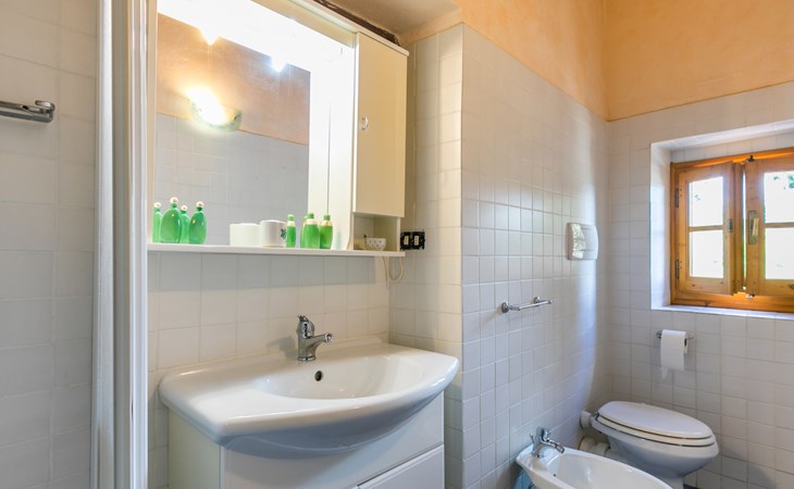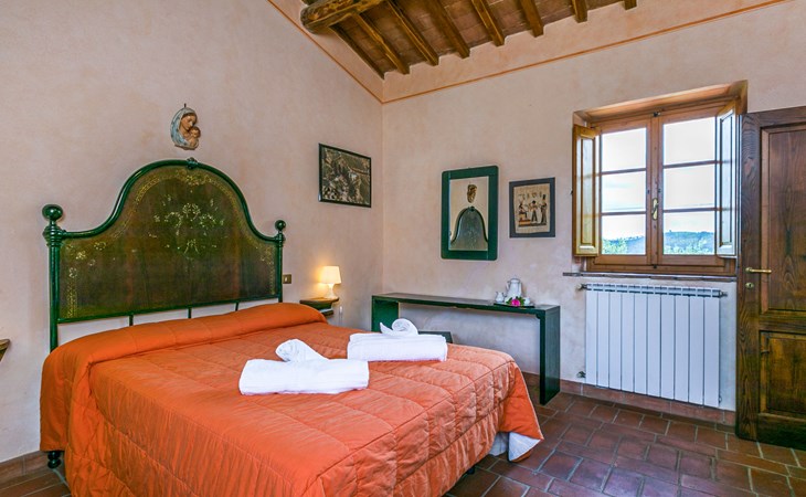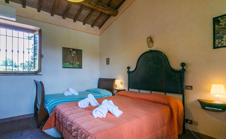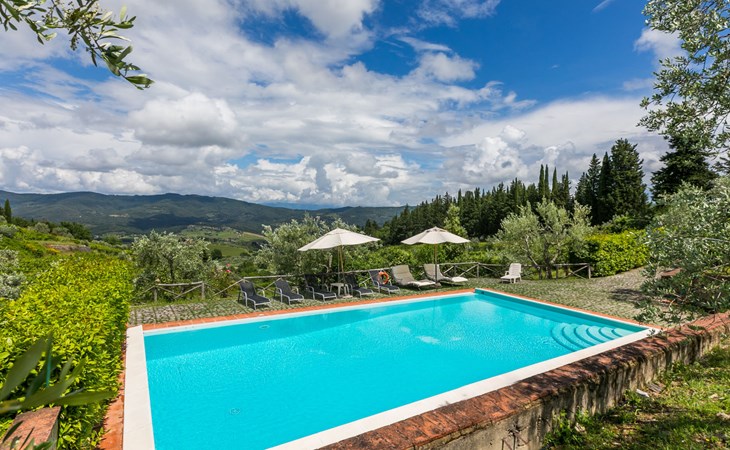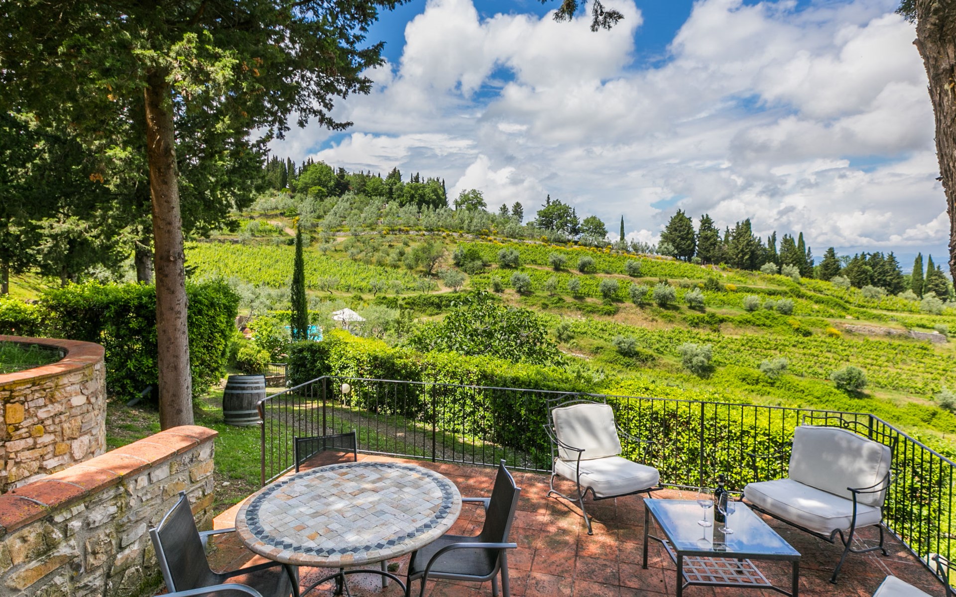 Montefioralle 3 km from Greve in Chianti: Agriturismo on a vinyard "San Rocco", 2 storeys, from the 19th century, surrounded by trees, fields and vineyards. 3 apartments in the residence. 3 km from the centre of Greve in Chianti, 1 km from the centre of Montefioralle, outside the resort, 25 km from the centre of Firenze, in a sunny position, in the countryside. For shared use: terraced garden, 4 ha (not fenced) with plants and trees, natural garden, swimming pool (12 x 6 m, depth 120 - 180 cm, seasonal availability: 02.May. - 03.Oct. pool opening hours: 08:00-20:00). Outdoor shower, barbecue, pool maintenance by the owner/gardener. In the house: washing machine (extra). Parking on the premises. Grocery 3 km, restaurant 3 km, bus stop 3 km, outdoor swimming pool 3 km. Golf course (18 hole) 18 km. Local sale of farm products. Owner lives in separate semi-detached house.