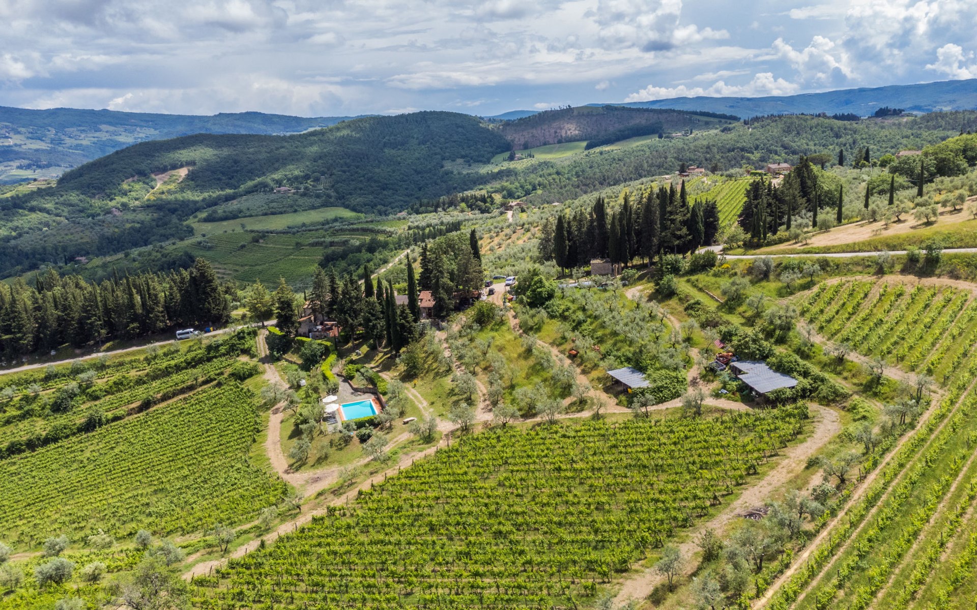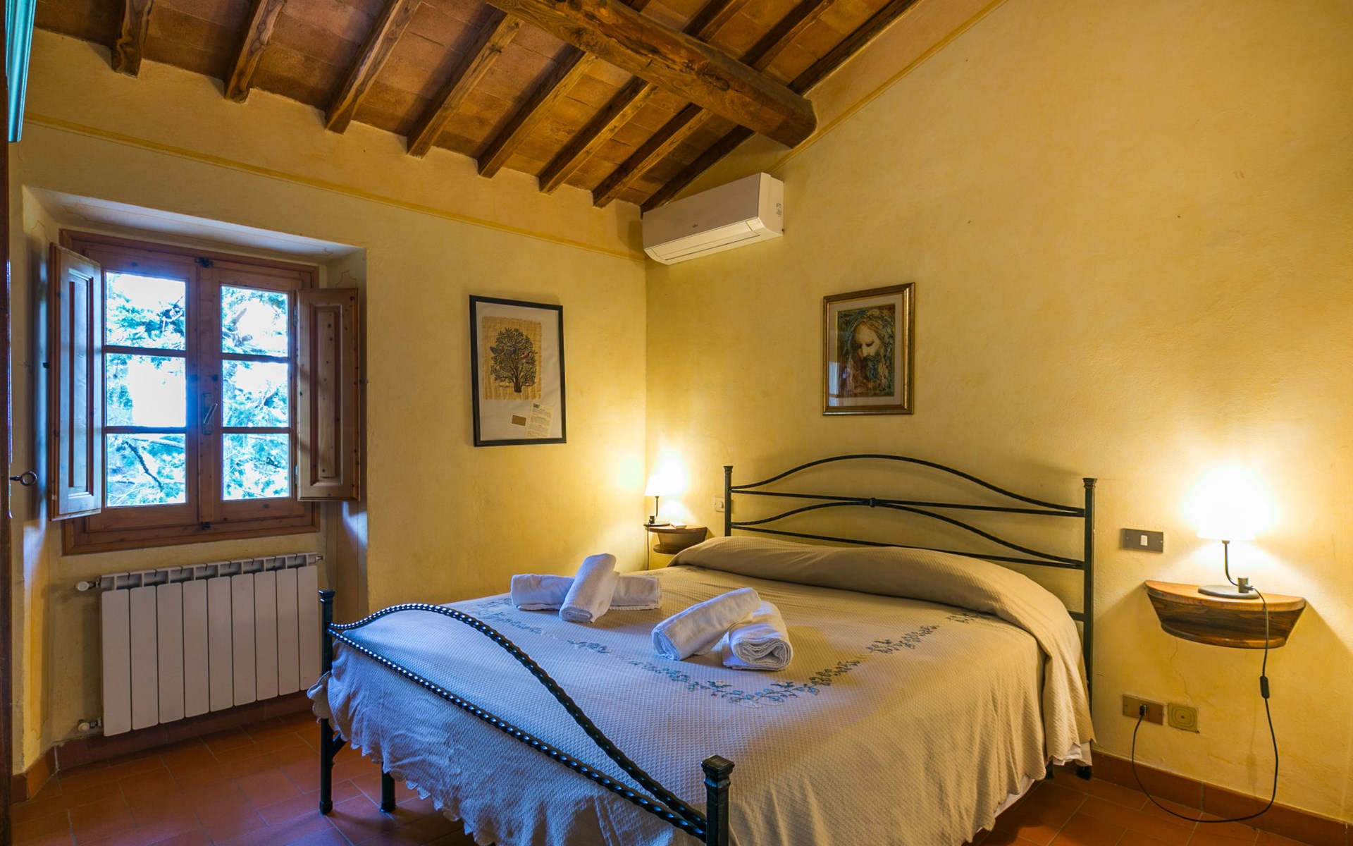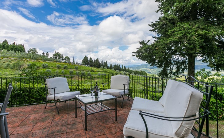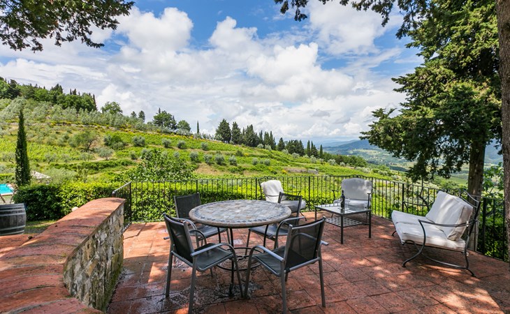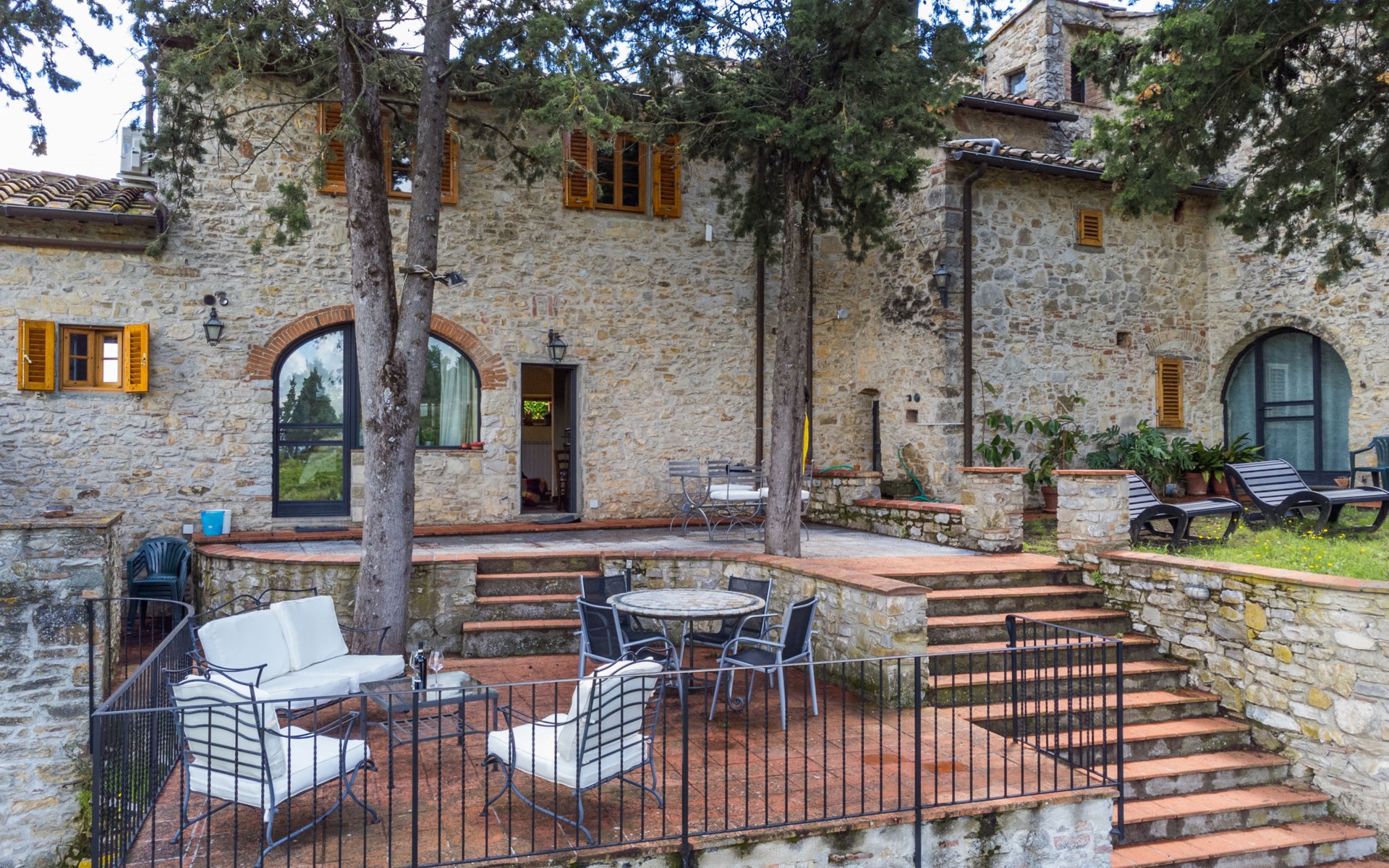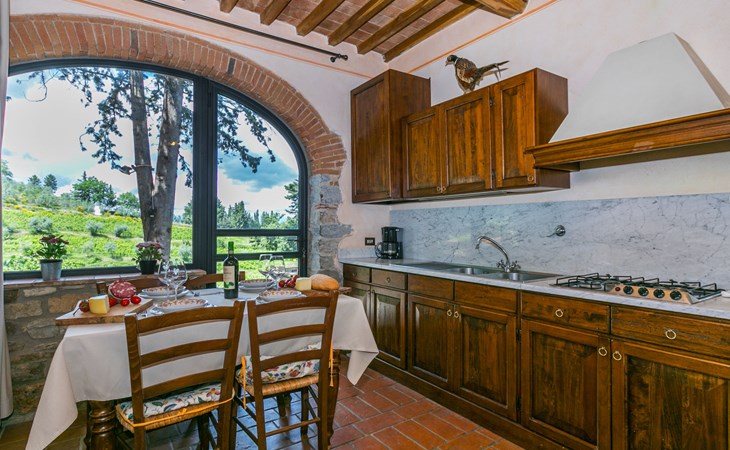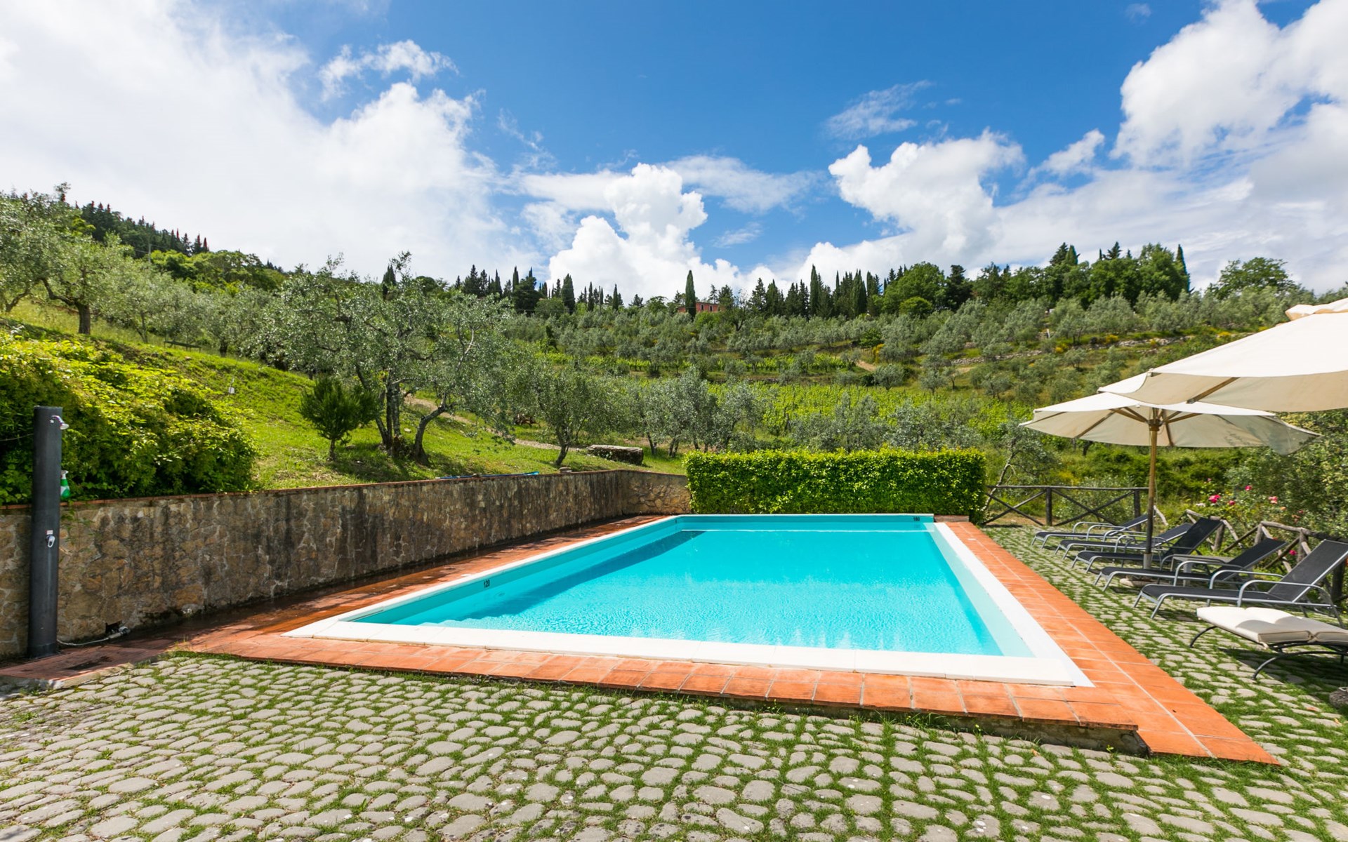 Montefioralle 3 km from Greve in Chianti: Agriturismo on a vinyard "San Rocco", 2 storeys, from the 19th century, surrounded by trees, fields and vineyards. 3 apartments in the residence. 3 km from the centre of Greve in Chianti, 1 km from the centre of Montefioralle, outside the resort, 25 km from the centre of Firenze, in a sunny position, in the countryside. For shared use: terraced garden, 4 ha (not fenced) with plants and trees, natural garden, swimming pool (12 x 6 m, depth 120 - 180 cm, seasonal availability: 02.May. - 03.Oct. pool opening hours: 08:00-20:00). Outdoor shower, barbecue, pool maintenance by the owner/gardener. In the house: washing machine (extra). Parking on the premises. Grocery 3 km, restaurant 3 km, bus stop 3 km, outdoor swimming pool 3 km. Golf course (18 hole) 18 km. Local sale of farm products. Owner lives in separate semi-detached house.