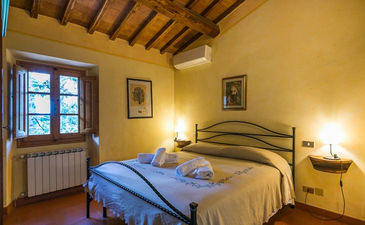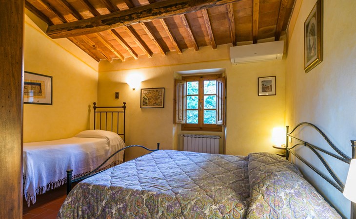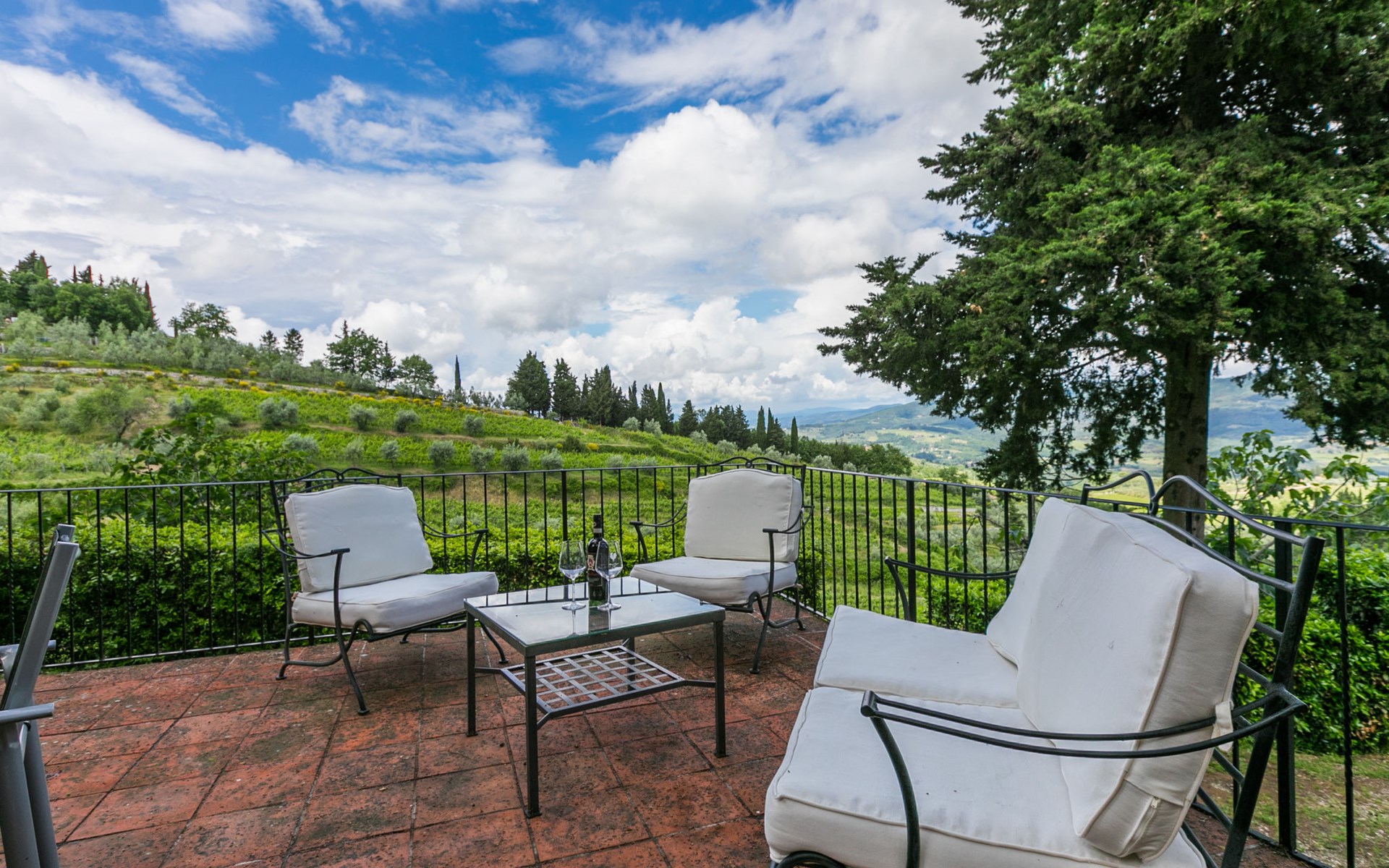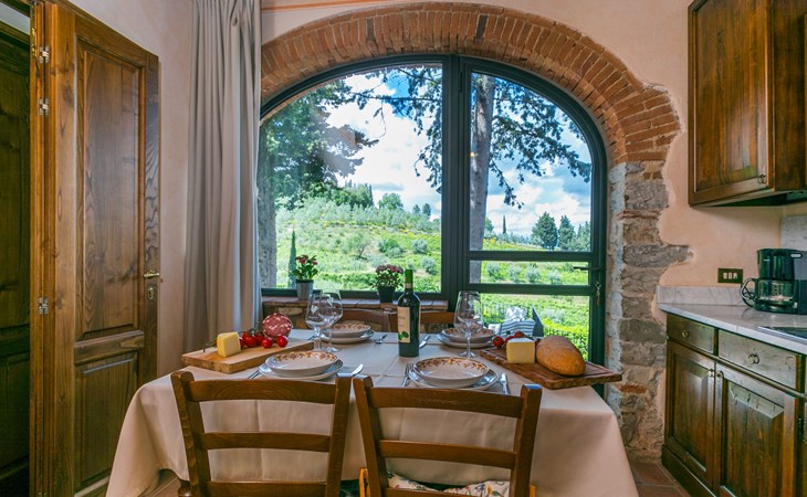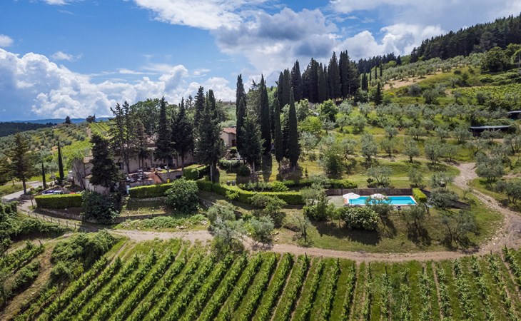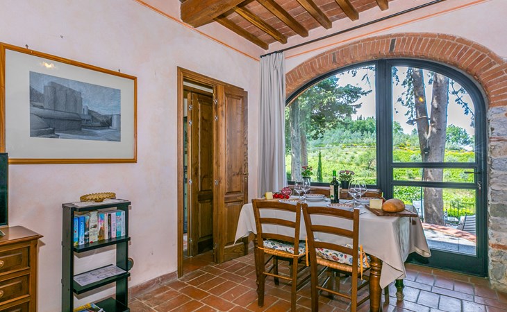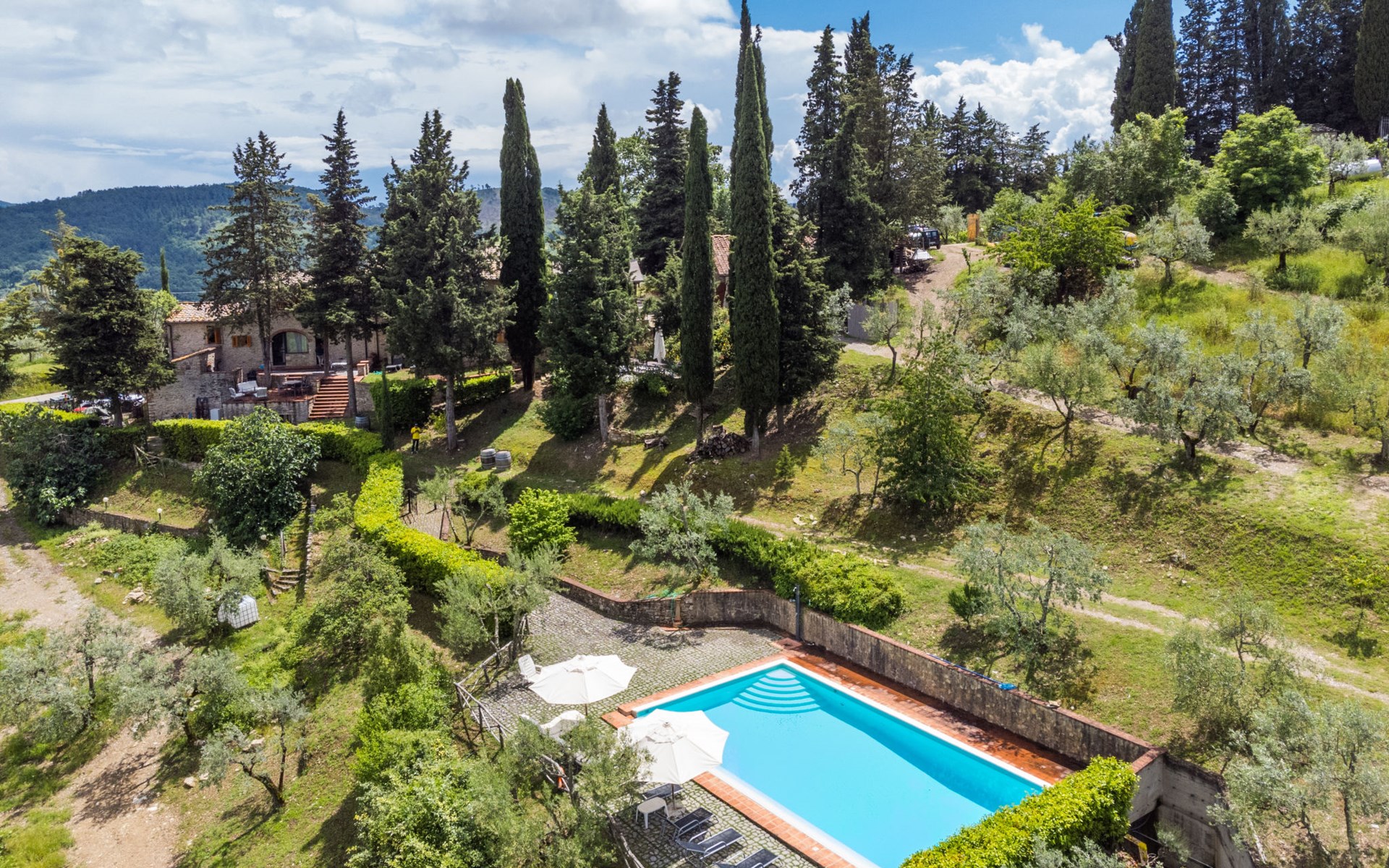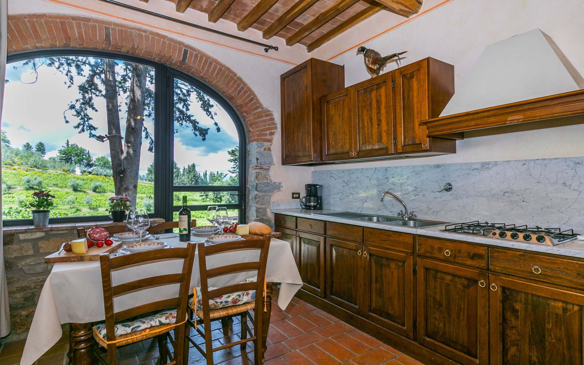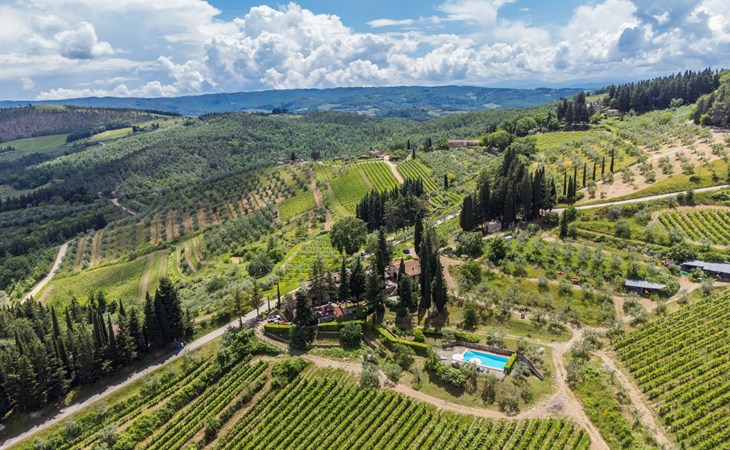 Montefioralle 3 km from Greve in Chianti: Agriturismo on a vinyard "San Rocco", 2 storeys, from the 19th century, surrounded by trees, fields and vineyards. 3 apartments in the residence. 3 km from the centre of Greve in Chianti, 1 km from the centre of Montefioralle, outside the resort, 25 km from the centre of Firenze, in a sunny position, in the countryside. For shared use: terraced garden, 4 ha (not fenced) with plants and trees, natural garden, swimming pool (12 x 6 m, depth 120 - 180 cm, seasonal availability: 02.May. - 03.Oct. pool opening hours: 08:00-20:00). Outdoor shower, barbecue, pool maintenance by the owner/gardener. In the house: washing machine (extra). Parking on the premises. Grocery 3 km, restaurant 3 km, bus stop 3 km, outdoor swimming pool 3 km. Golf course (18 hole) 18 km. Local sale of farm products. Owner lives in separate semi-detached house.