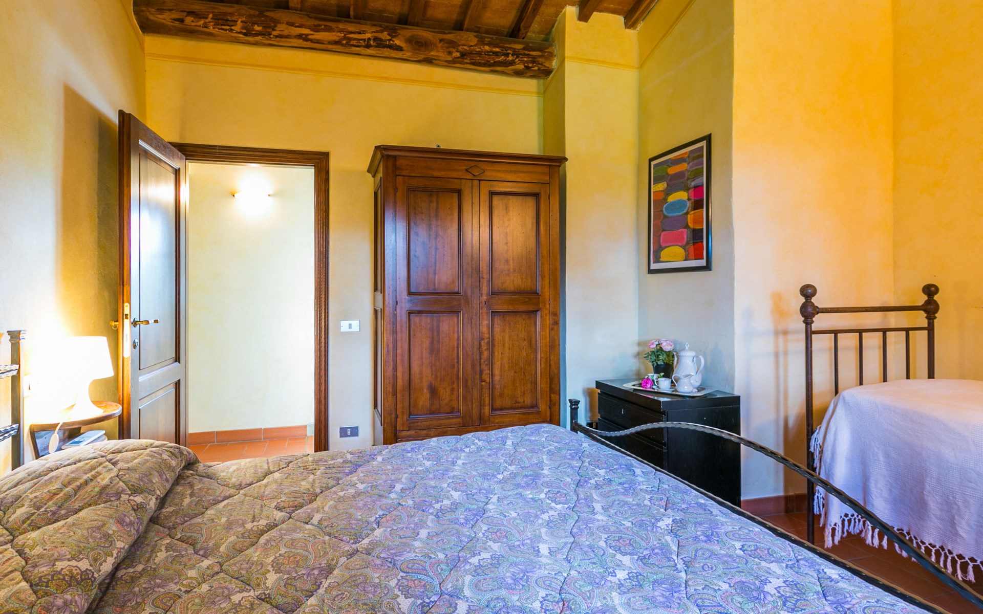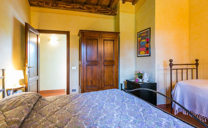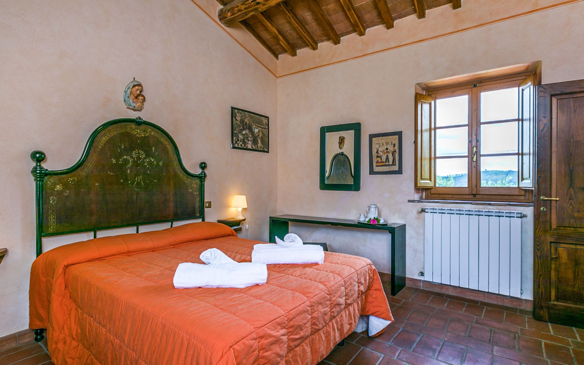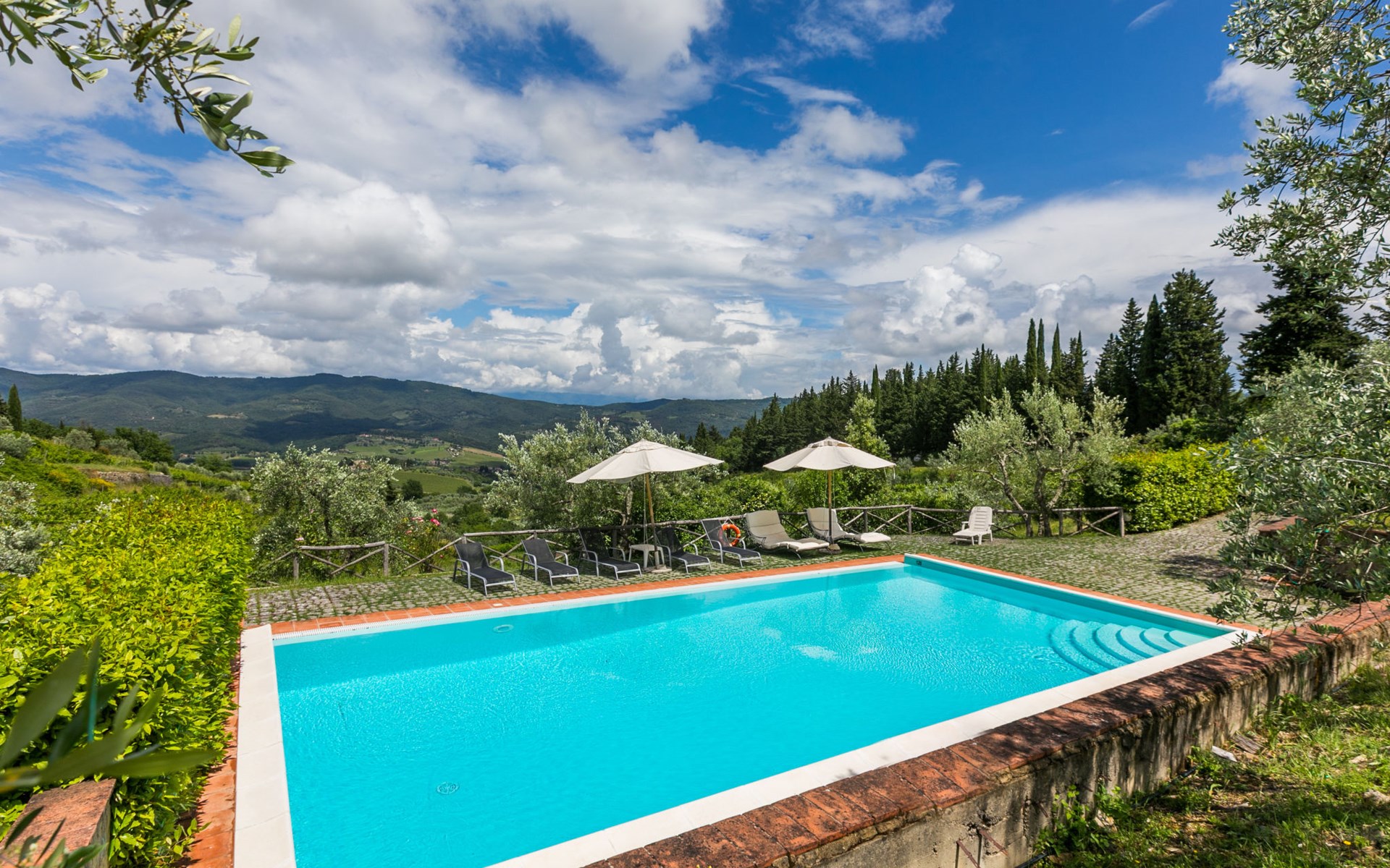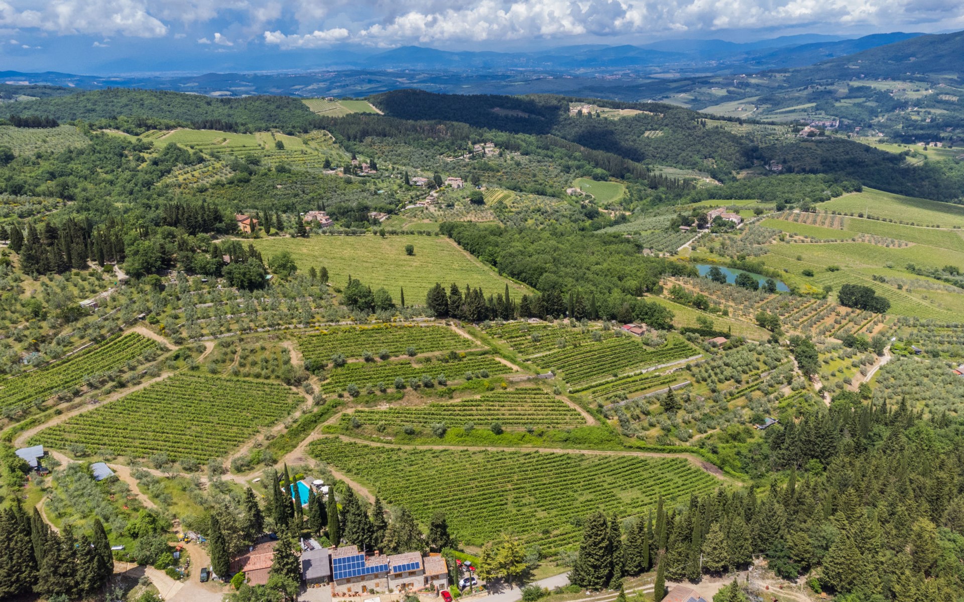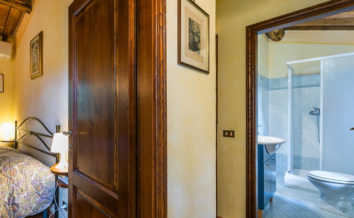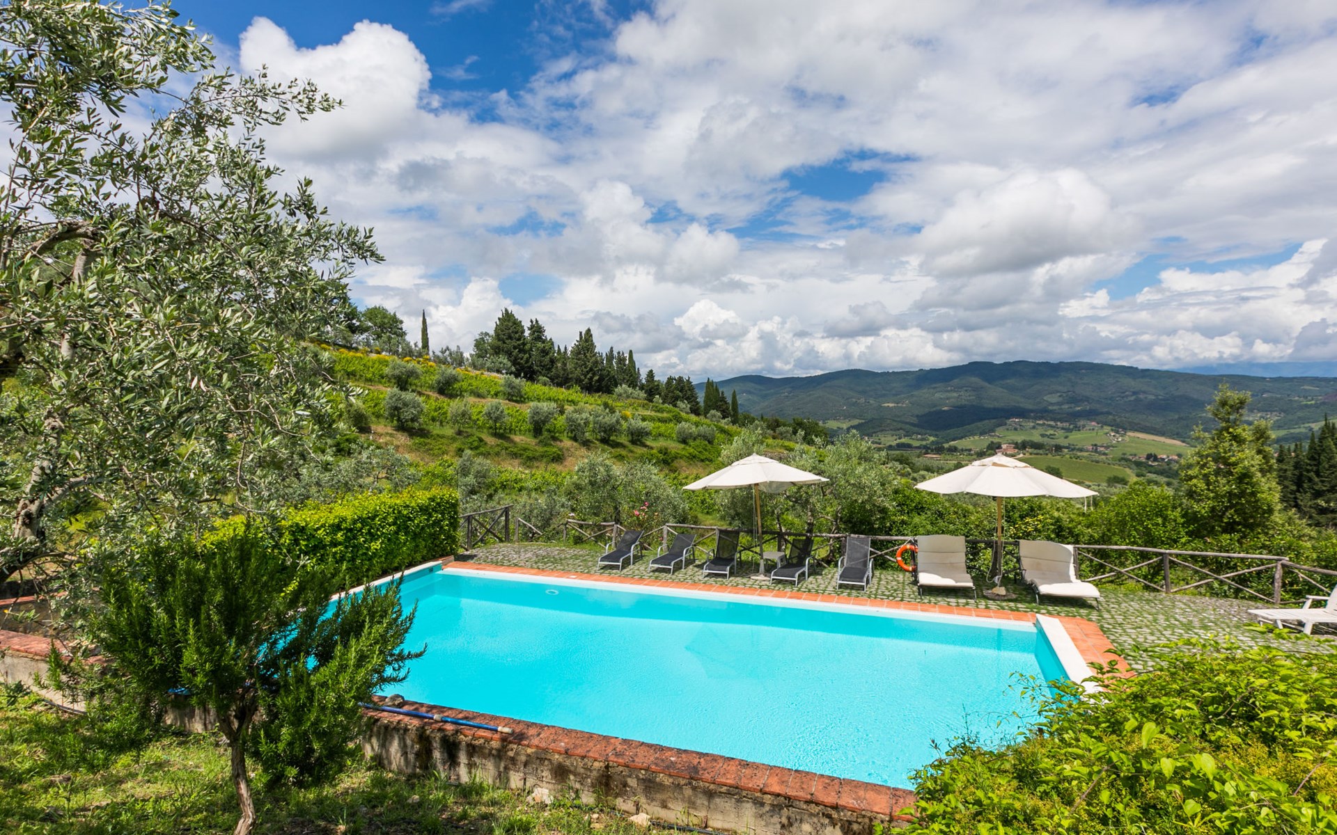 Montefioralle 3 km from Greve in Chianti: Agriturismo on a vinyard "San Rocco", 2 storeys, from the 19th century, surrounded by trees, fields and vineyards. 3 apartments in the residence. 3 km from the centre of Greve in Chianti, 1 km from the centre of Montefioralle, outside the resort, 25 km from the centre of Firenze, in a sunny position, in the countryside. For shared use: terraced garden, 4 ha (not fenced) with plants and trees, natural garden, swimming pool (12 x 6 m, depth 120 - 180 cm, seasonal availability: 02.May. - 03.Oct. pool opening hours: 08:00-20:00). Outdoor shower, barbecue, pool maintenance by the owner/gardener. In the house: washing machine (extra). Parking on the premises. Grocery 3 km, restaurant 3 km, bus stop 3 km, outdoor swimming pool 3 km. Golf course (18 hole) 18 km. Local sale of farm products. Owner lives in separate semi-detached house.