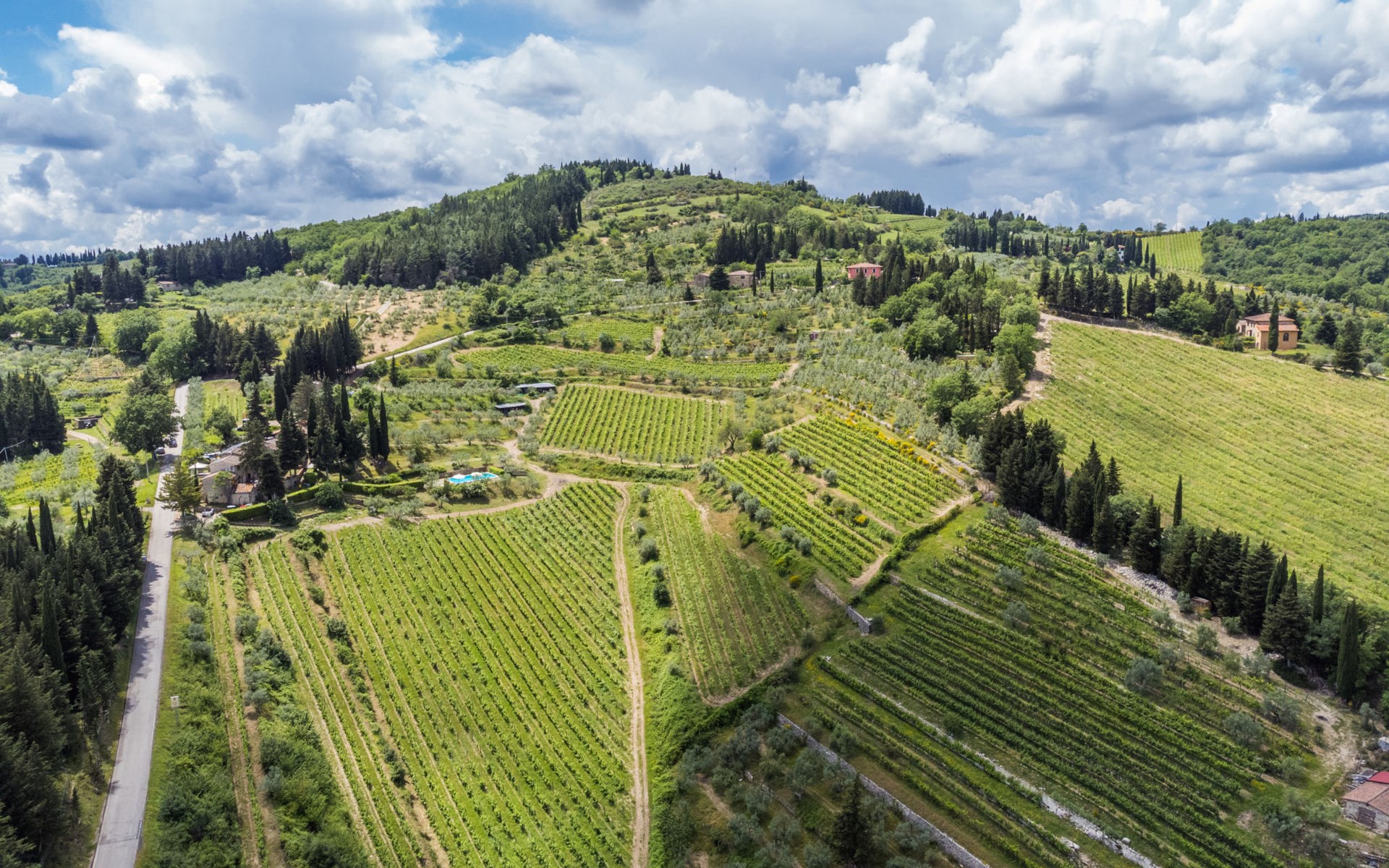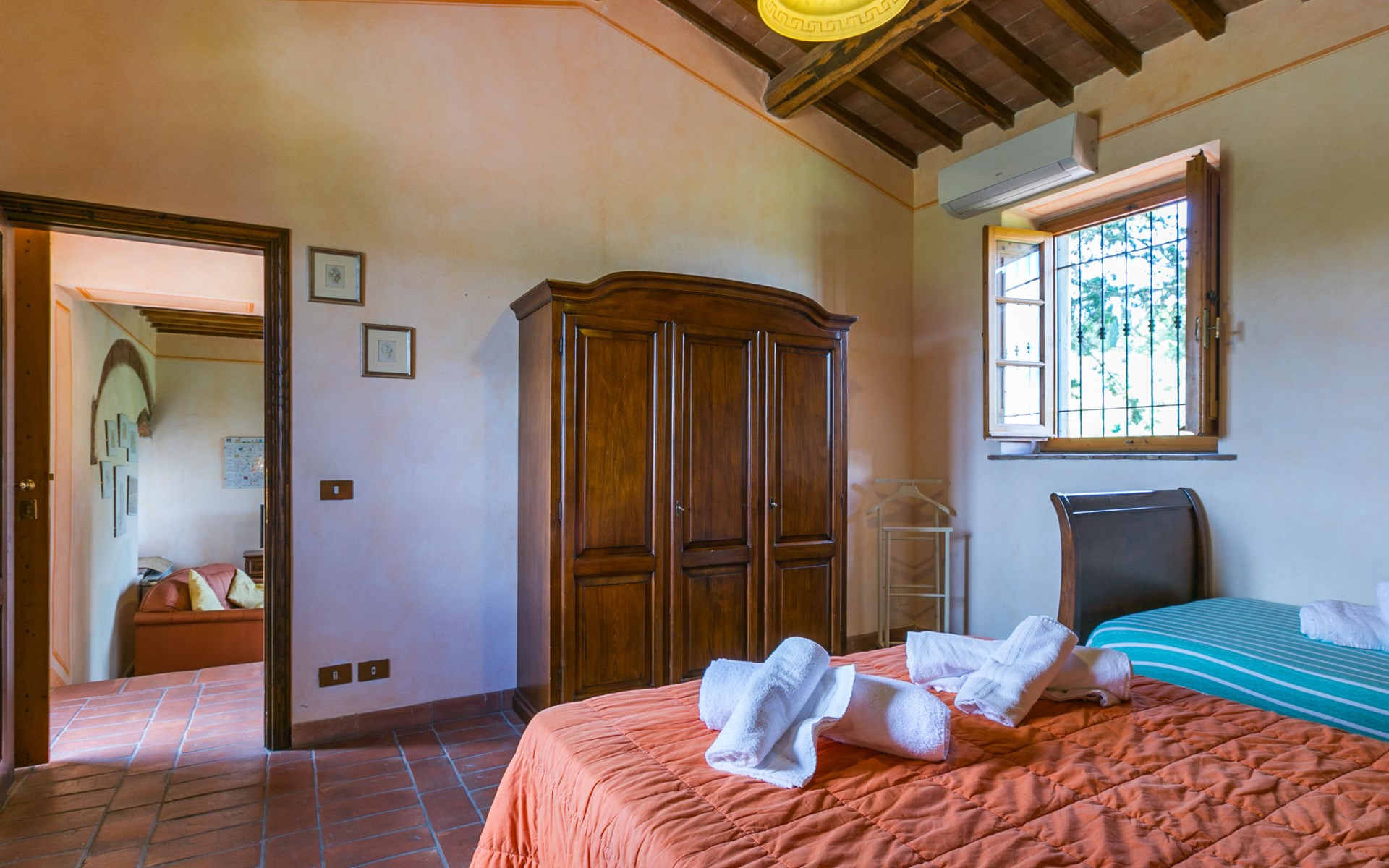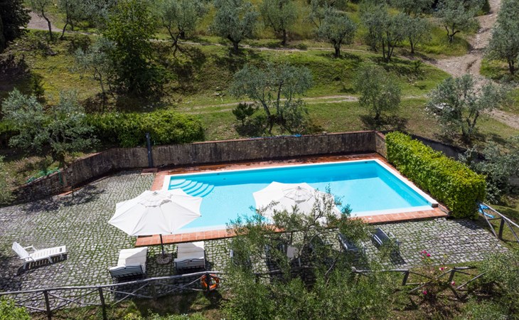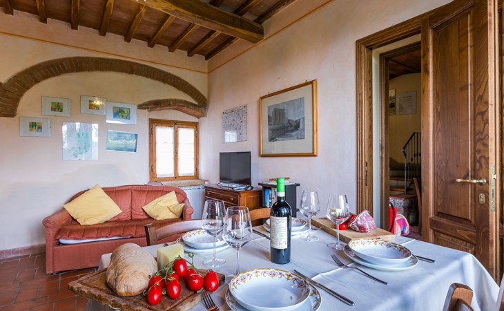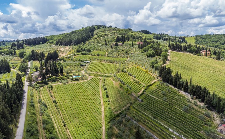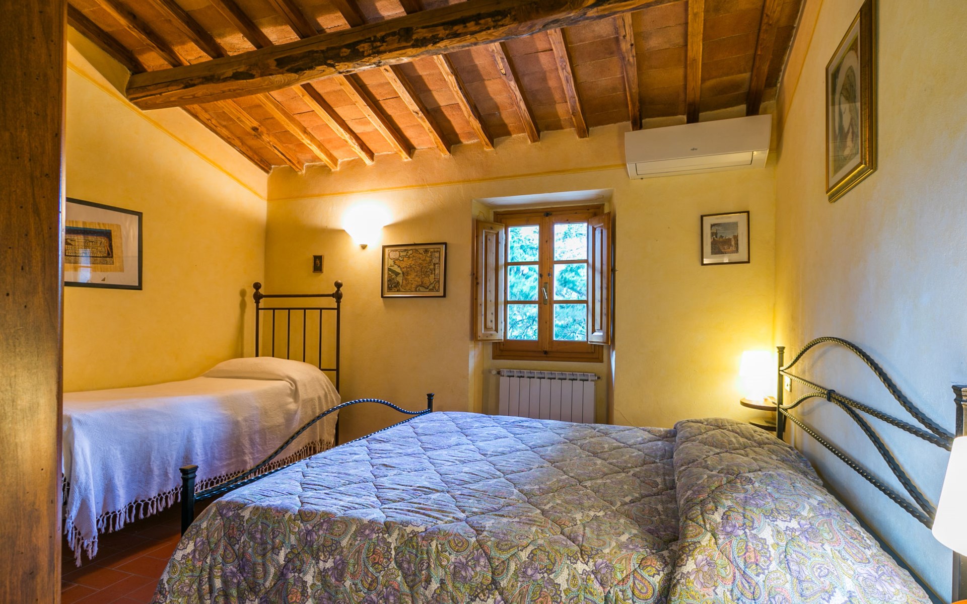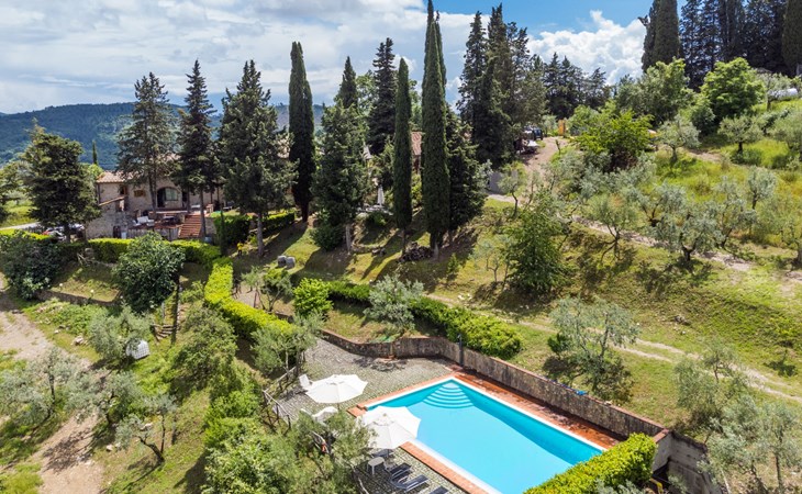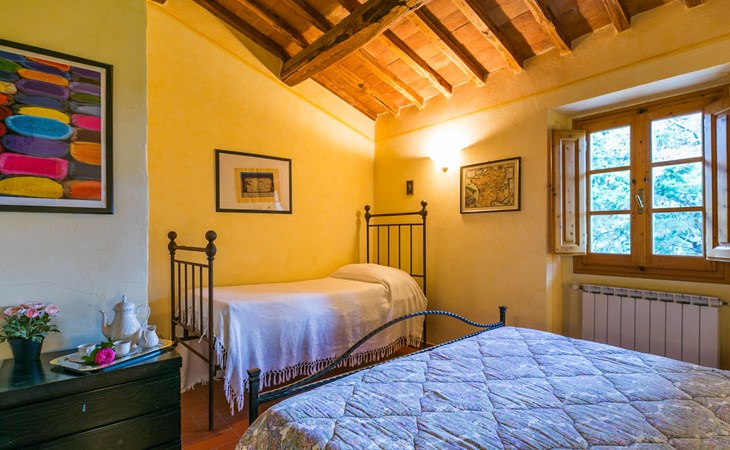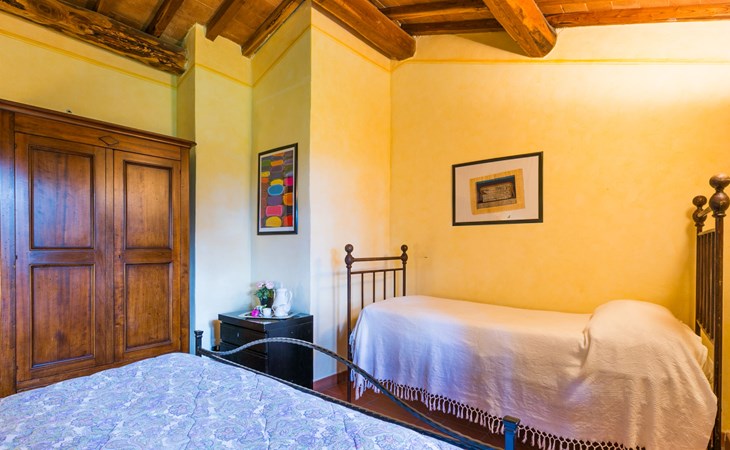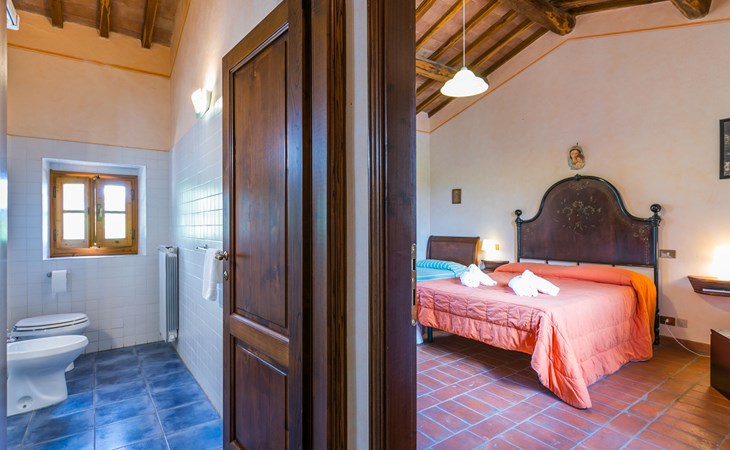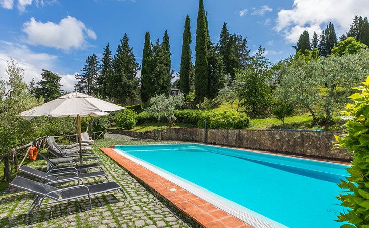Montefioralle 3 km from Greve in Chianti: Agriturismo on a vinyard "San Rocco", 2 storeys, from the 19th century, surrounded by trees, fields and vineyards. 3 apartments in the residence. 3 km from the centre of Greve in Chianti, 1 km from the centre of Montefioralle, outside the resort, 25 km from the centre of Firenze, in a sunny position, in the countryside. For shared use: terraced garden, 4 ha (not fenced) with plants and trees, natural garden, swimming pool (12 x 6 m, depth 120 - 180 cm, seasonal availability: 02.May. - 03.Oct. pool opening hours: 08:00-20:00). Outdoor shower, barbecue, pool maintenance by the owner/gardener. In the house: washing machine (extra). Parking on the premises. Grocery 3 km, restaurant 3 km, bus stop 3 km, outdoor swimming pool 3 km. Golf course (18 hole) 18 km. Local sale of farm products. Owner lives in separate semi-detached house.