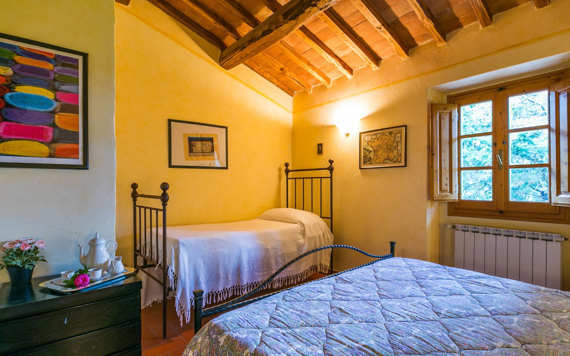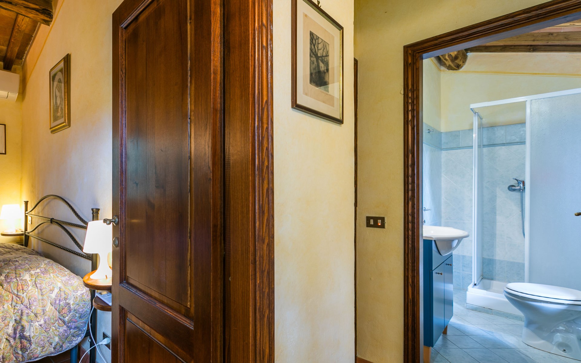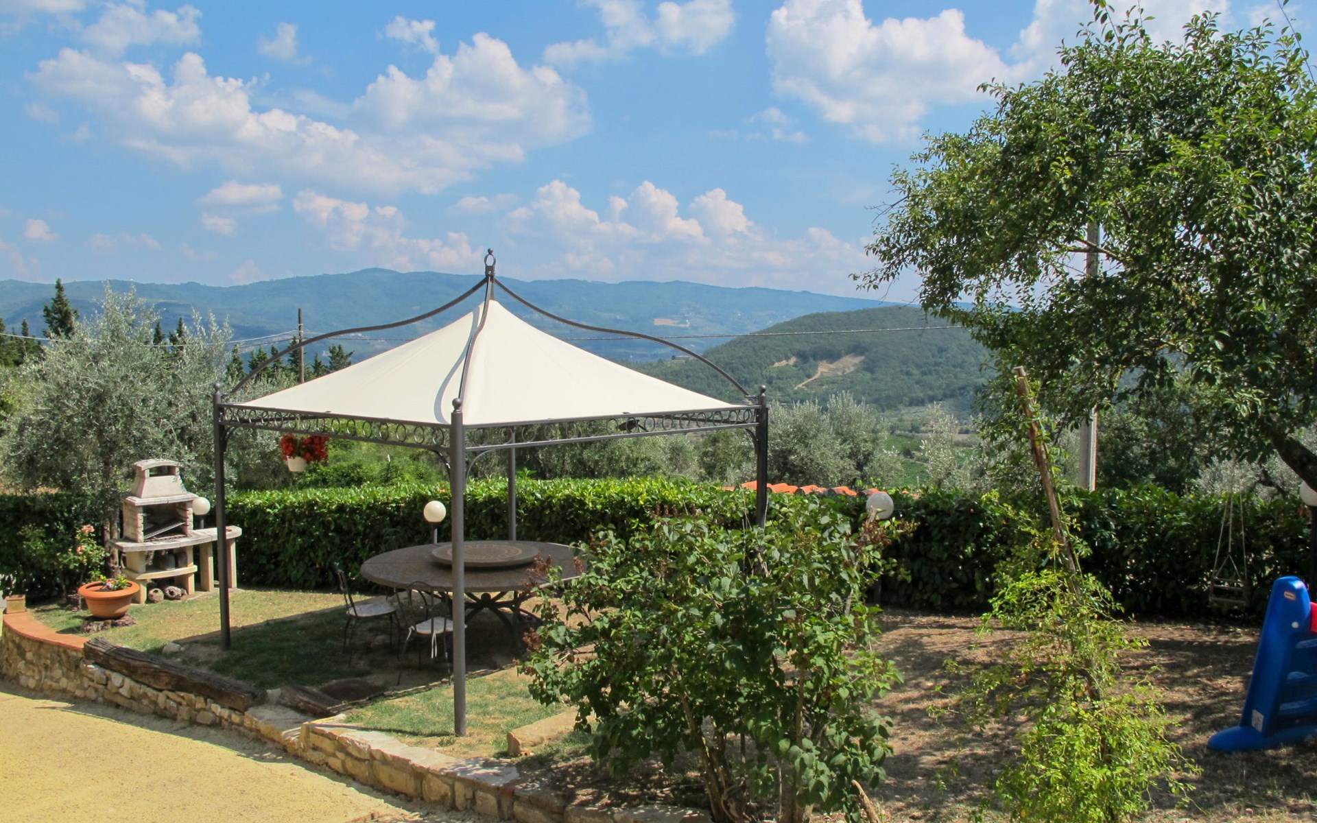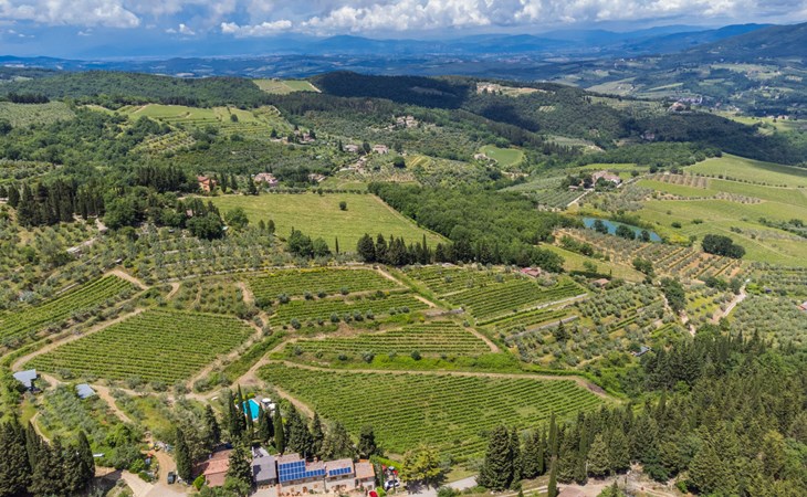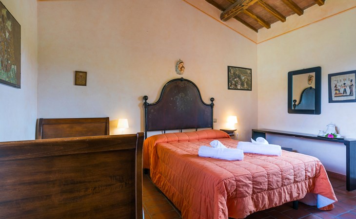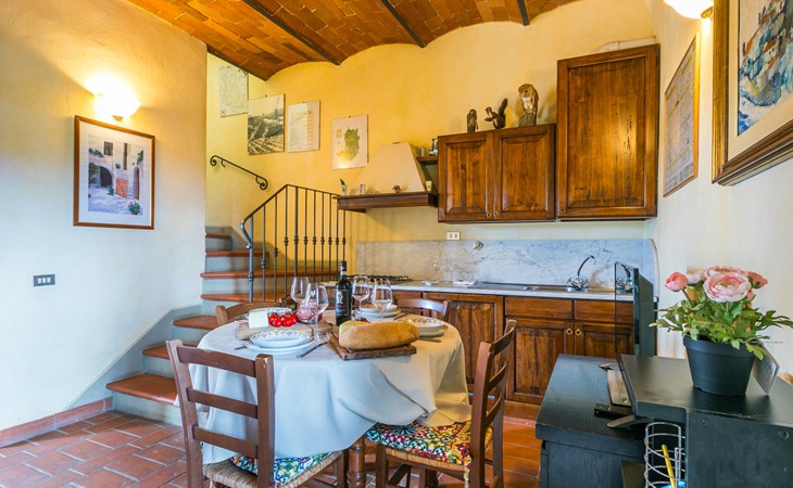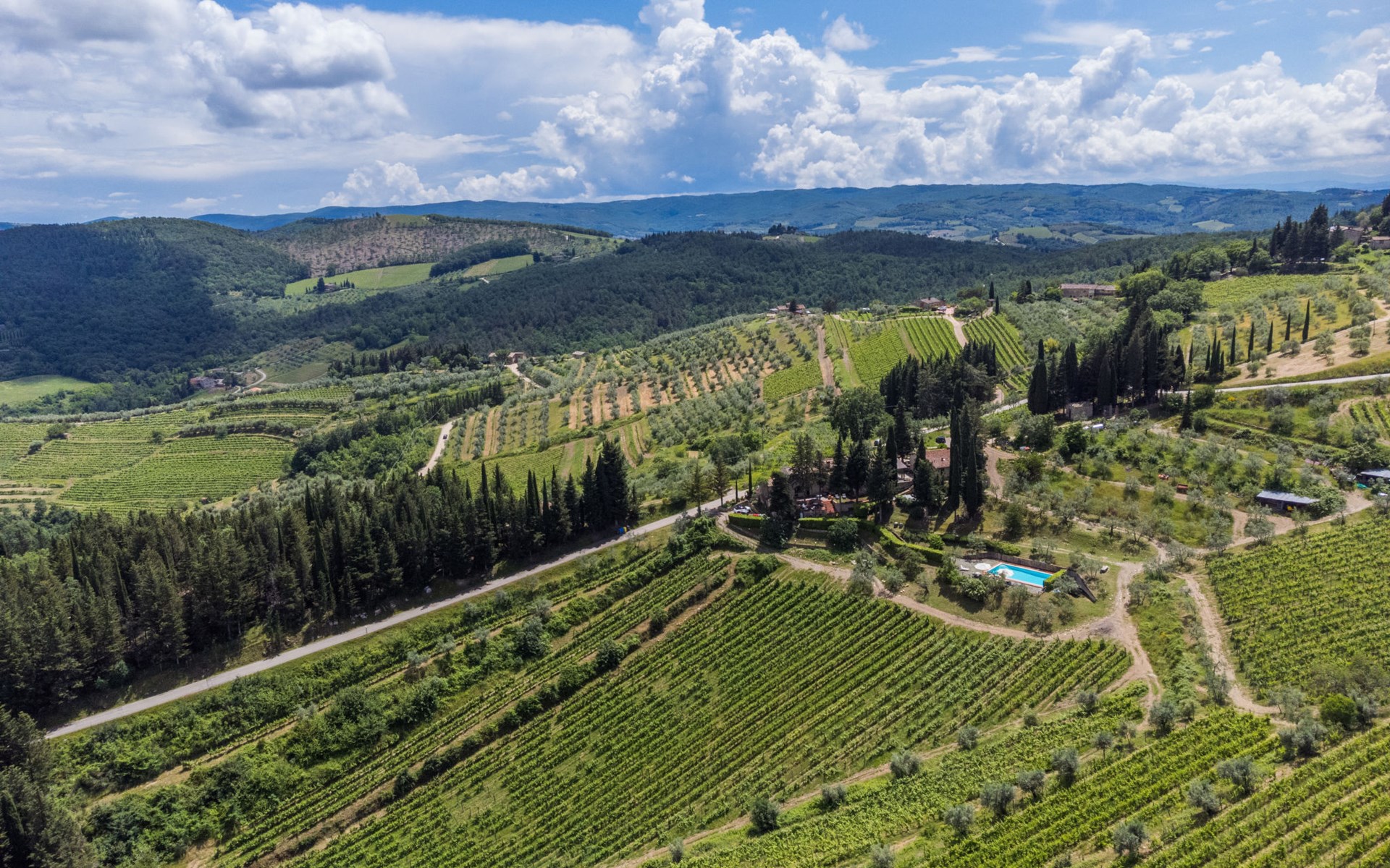 Montefioralle 3 km from Greve in Chianti: Agriturismo on a vinyard "San Rocco", 2 storeys, from the 19th century, surrounded by trees, fields and vineyards. 3 apartments in the residence. 3 km from the centre of Greve in Chianti, 1 km from the centre of Montefioralle, outside the resort, 25 km from the centre of Firenze, in a sunny position, in the countryside. For shared use: terraced garden, 4 ha (not fenced) with plants and trees, natural garden, swimming pool (12 x 6 m, depth 120 - 180 cm, seasonal availability: 02.May. - 03.Oct. pool opening hours: 08:00-20:00). Outdoor shower, barbecue, pool maintenance by the owner/gardener. In the house: washing machine (extra). Parking on the premises. Grocery 3 km, restaurant 3 km, bus stop 3 km, outdoor swimming pool 3 km. Golf course (18 hole) 18 km. Local sale of farm products. Owner lives in separate semi-detached house.