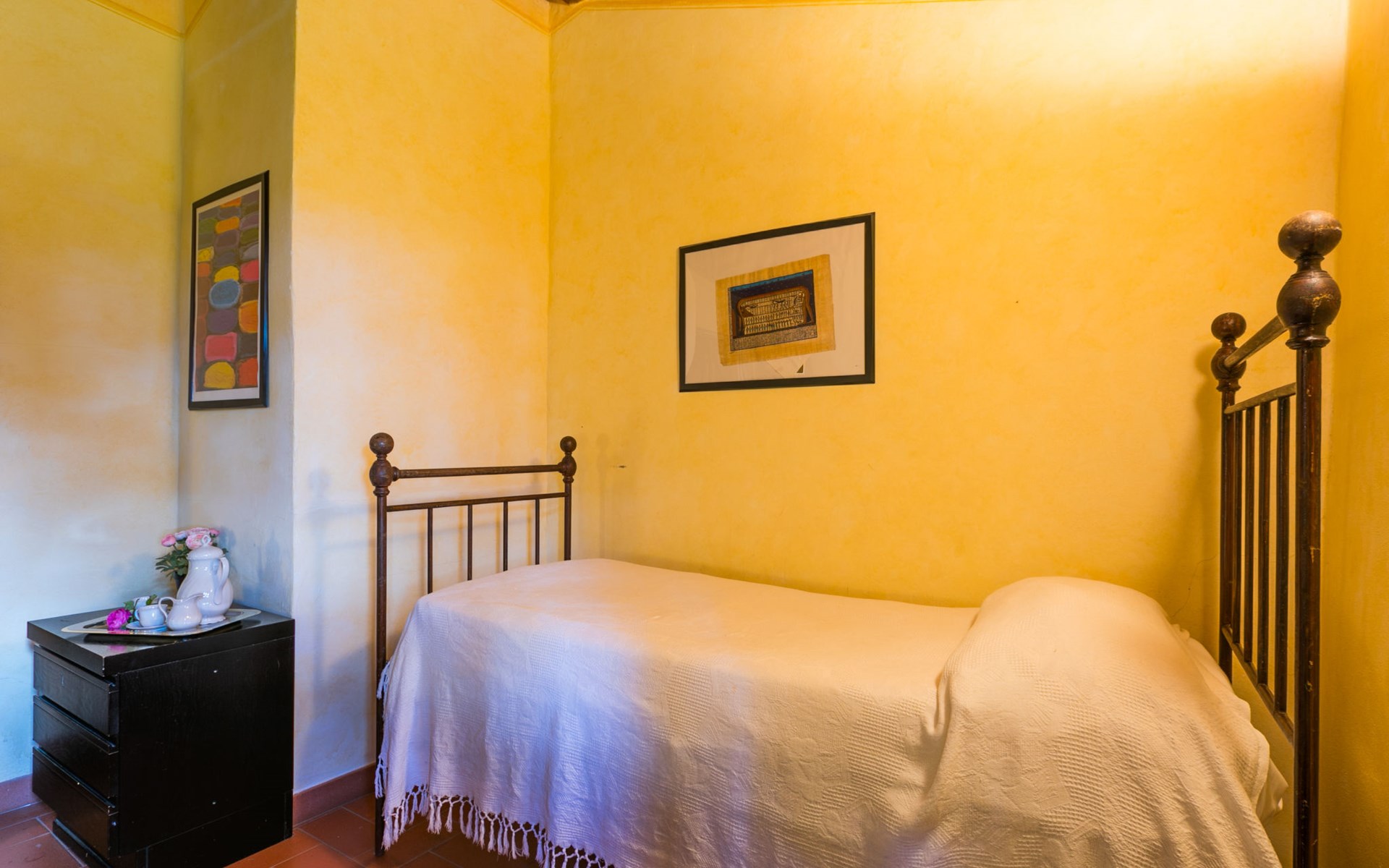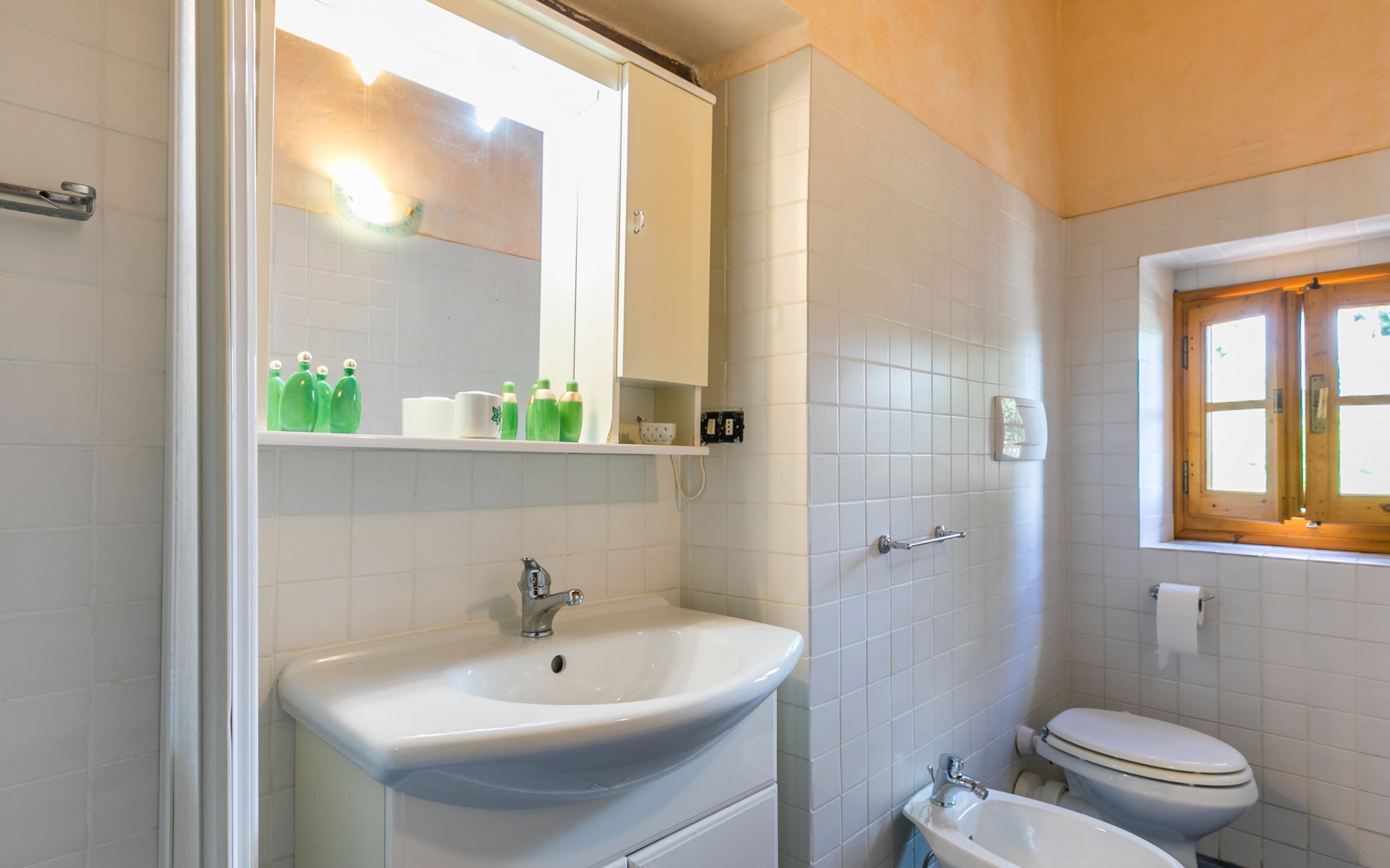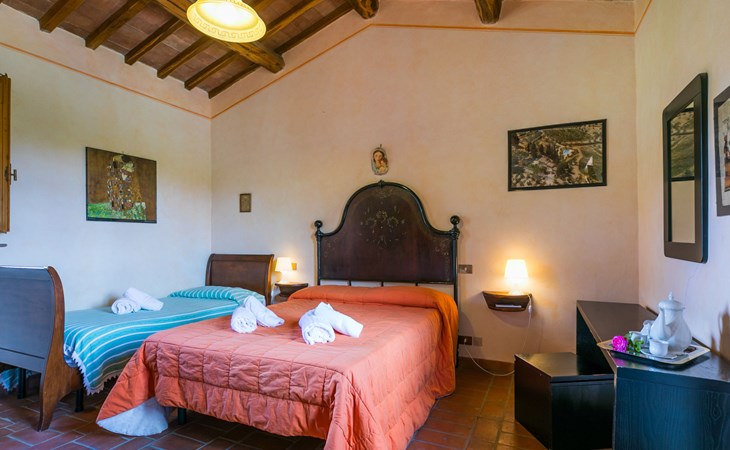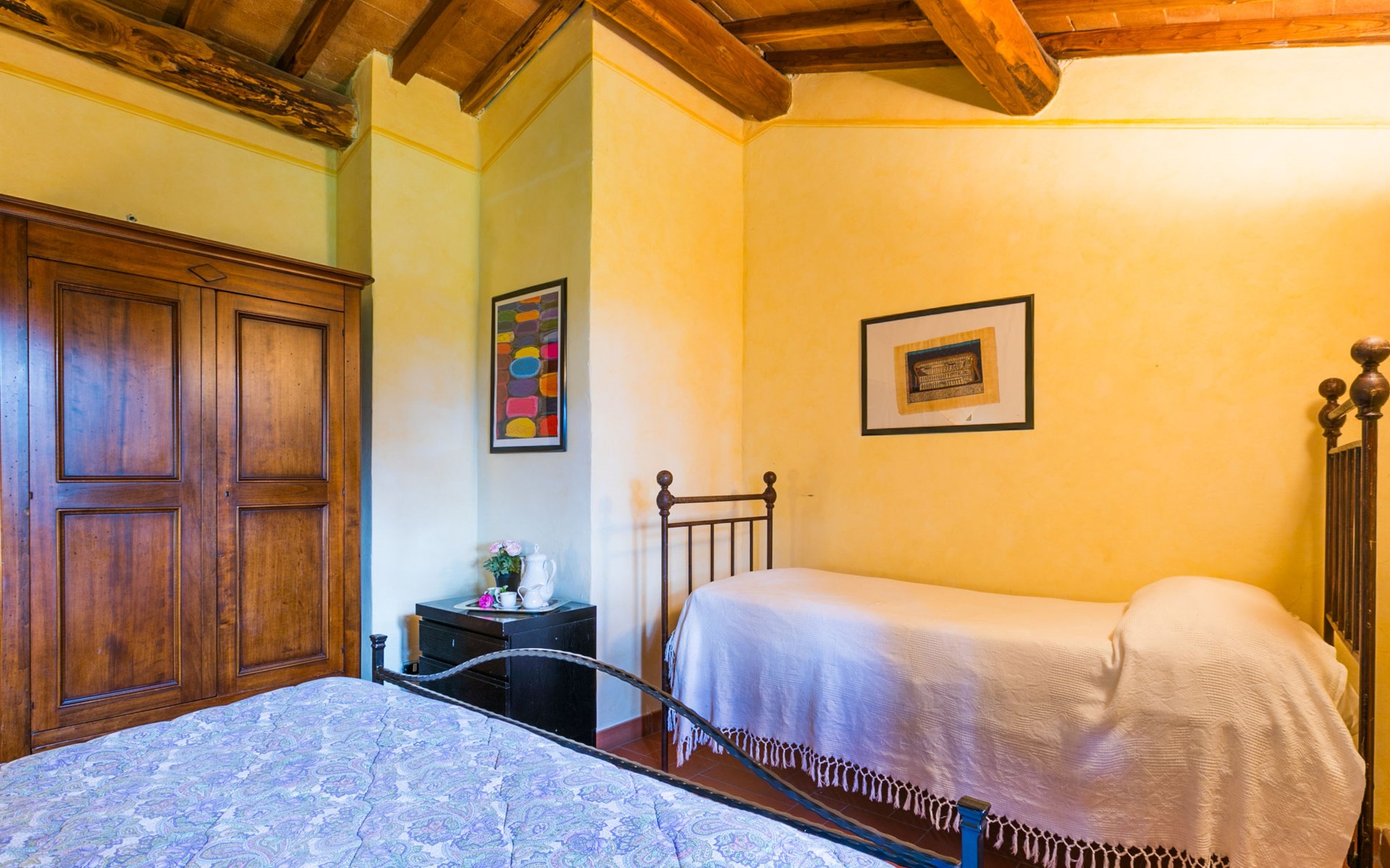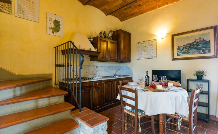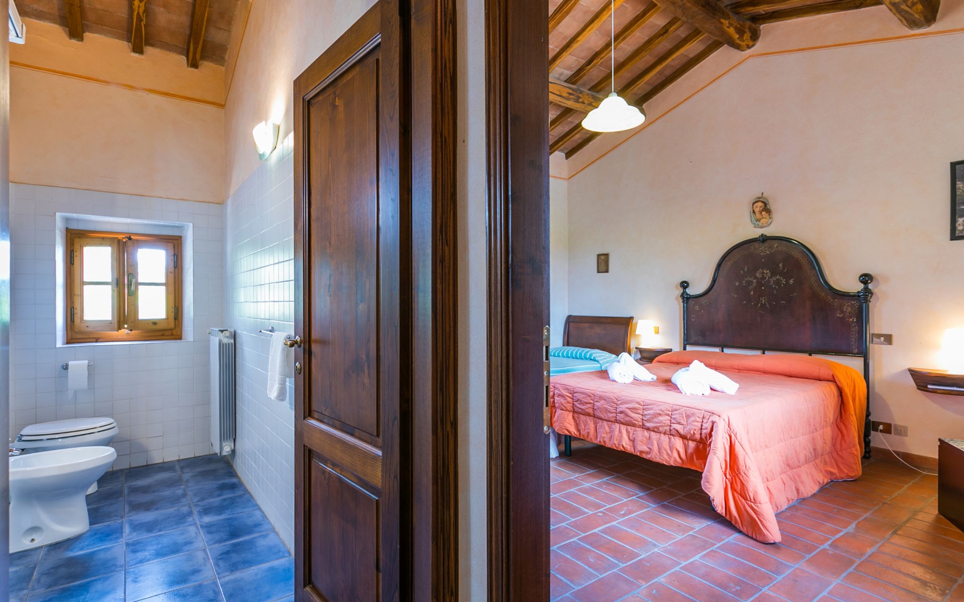 Montefioralle 3 km from Greve in Chianti: Agriturismo on a vinyard "San Rocco", 2 storeys, from the 19th century, surrounded by trees, fields and vineyards. 3 apartments in the residence. 3 km from the centre of Greve in Chianti, 1 km from the centre of Montefioralle, outside the resort, 25 km from the centre of Firenze, in a sunny position, in the countryside. For shared use: terraced garden, 4 ha (not fenced) with plants and trees, natural garden, swimming pool (12 x 6 m, depth 120 - 180 cm, seasonal availability: 02.May. - 03.Oct. pool opening hours: 08:00-20:00). Outdoor shower, barbecue, pool maintenance by the owner/gardener. In the house: washing machine (extra). Parking on the premises. Grocery 3 km, restaurant 3 km, bus stop 3 km, outdoor swimming pool 3 km. Golf course (18 hole) 18 km. Local sale of farm products. Owner lives in separate semi-detached house.