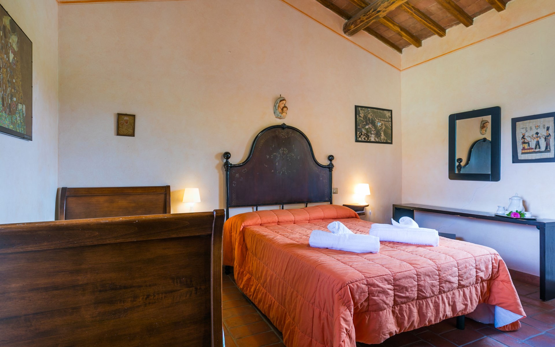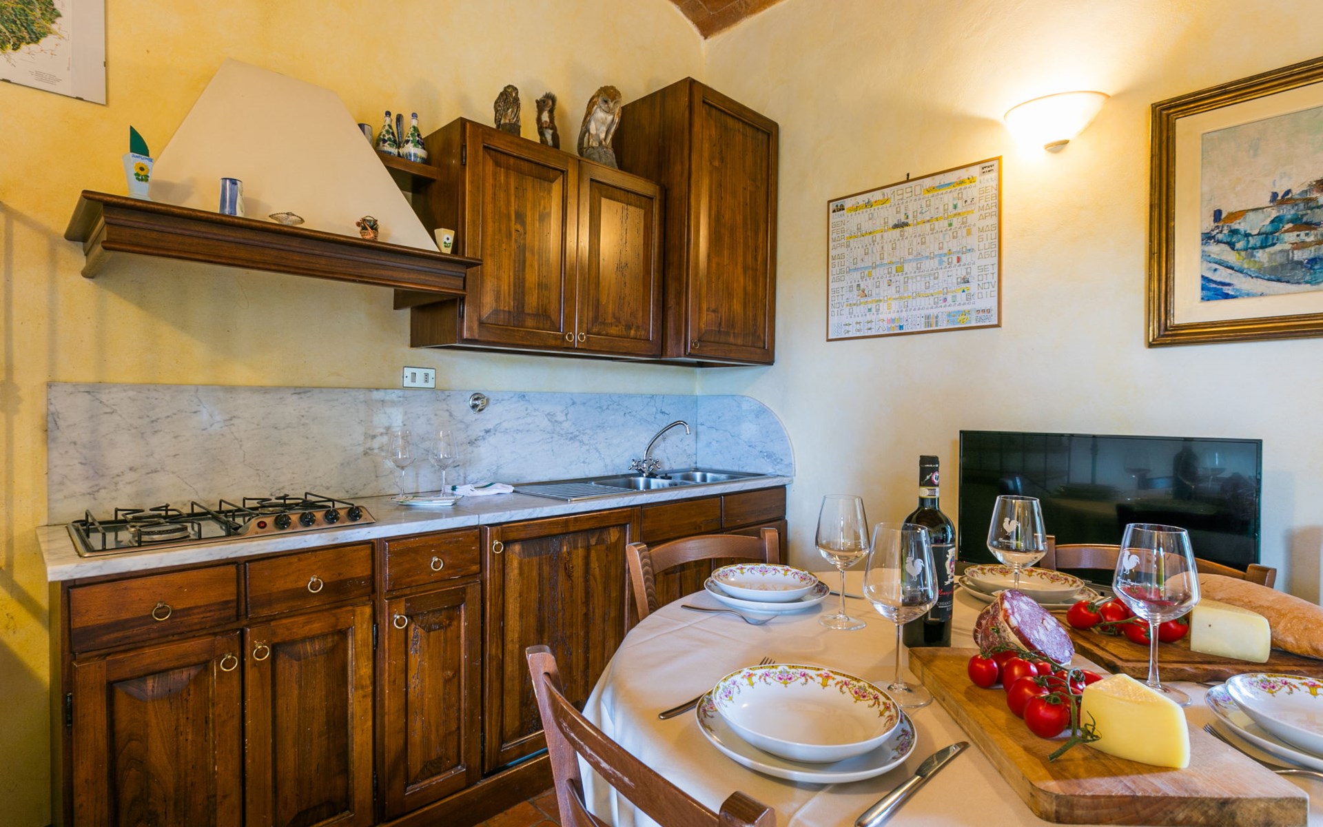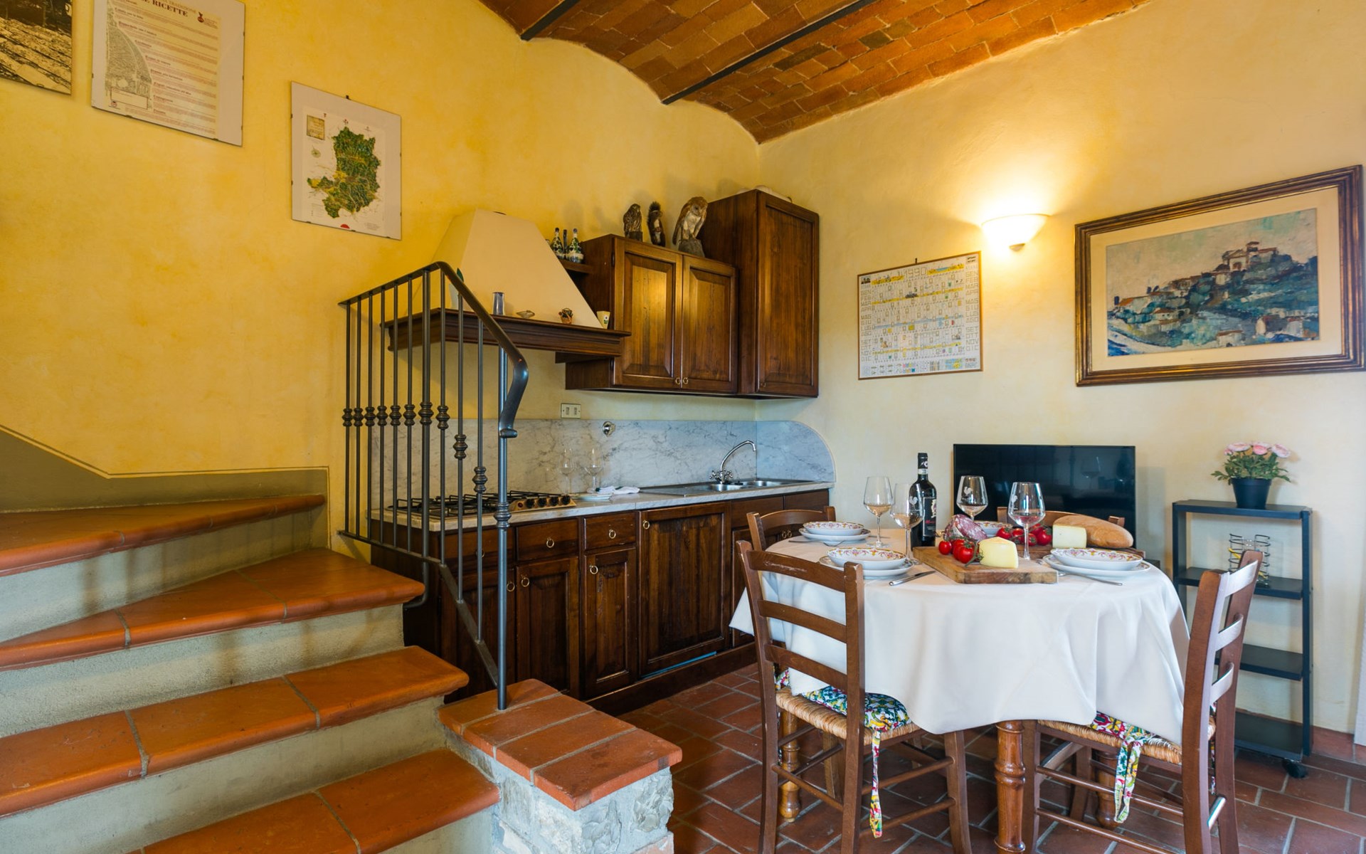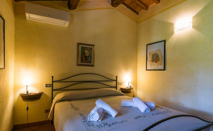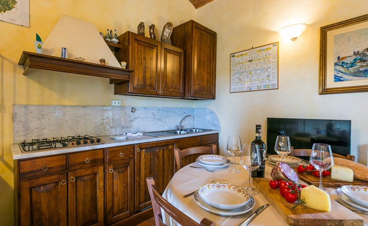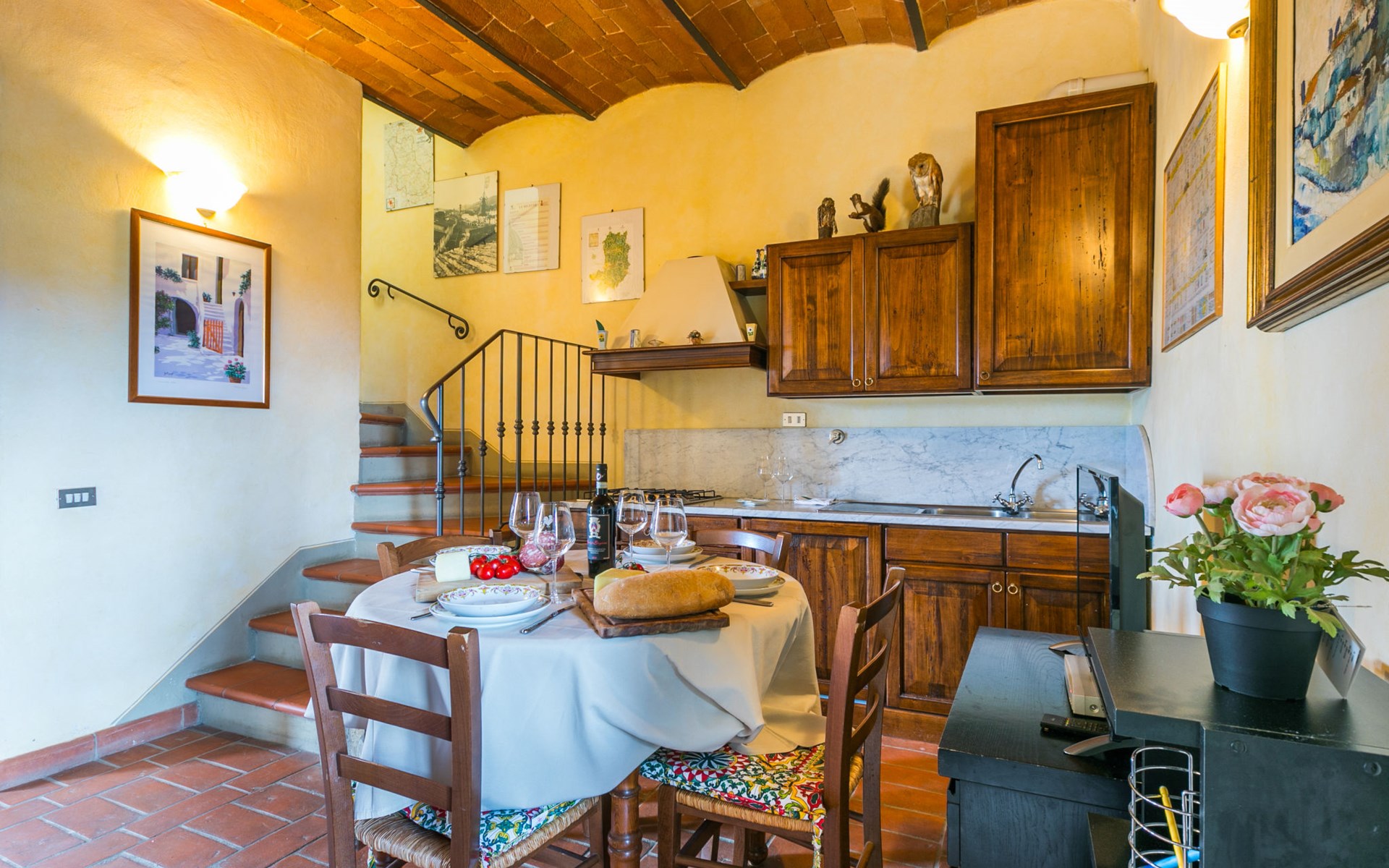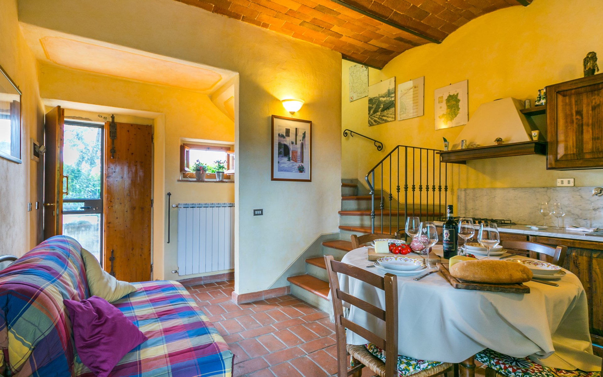 Montefioralle 3 km from Greve in Chianti: Agriturismo on a vinyard "San Rocco", 2 storeys, from the 19th century, surrounded by trees, fields and vineyards. 3 apartments in the residence. 3 km from the centre of Greve in Chianti, 1 km from the centre of Montefioralle, outside the resort, 25 km from the centre of Firenze, in a sunny position, in the countryside. For shared use: terraced garden, 4 ha (not fenced) with plants and trees, natural garden, swimming pool (12 x 6 m, depth 120 - 180 cm, seasonal availability: 02.May. - 03.Oct. pool opening hours: 08:00-20:00). Outdoor shower, barbecue, pool maintenance by the owner/gardener. In the house: washing machine (extra). Parking on the premises. Grocery 3 km, restaurant 3 km, bus stop 3 km, outdoor swimming pool 3 km. Golf course (18 hole) 18 km. Local sale of farm products. Owner lives in separate semi-detached house.