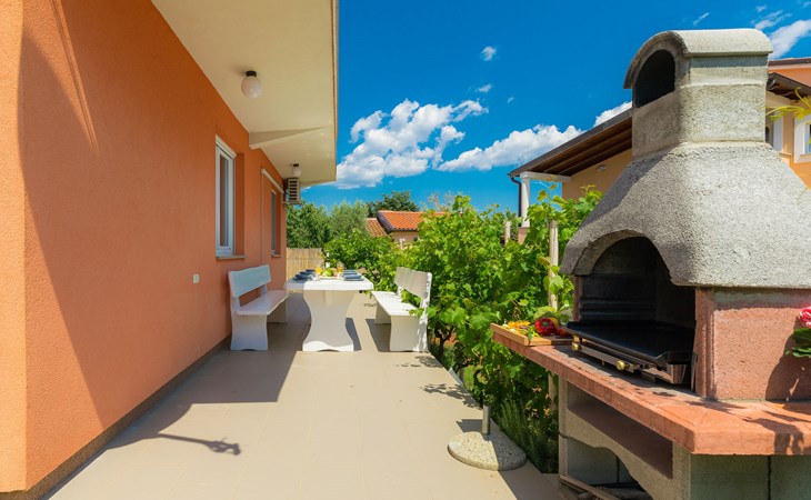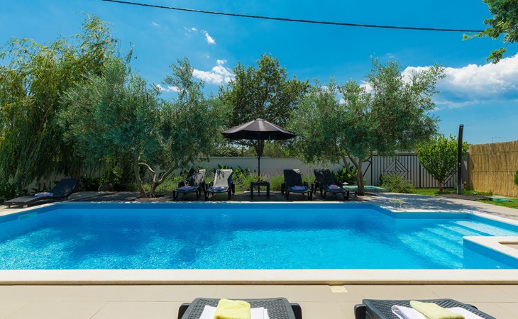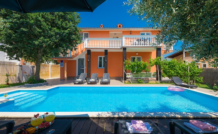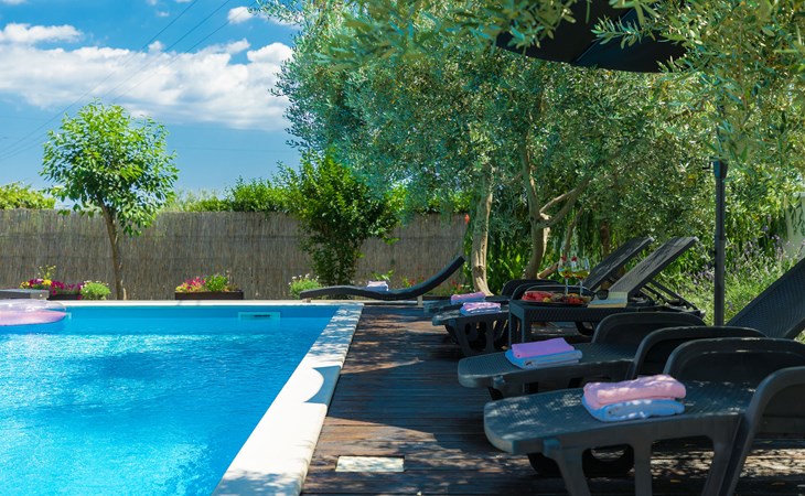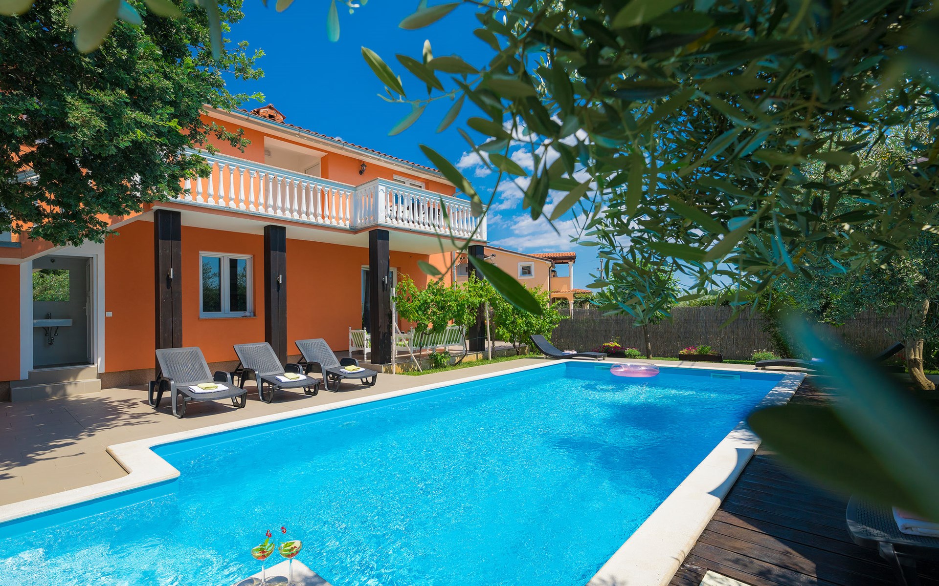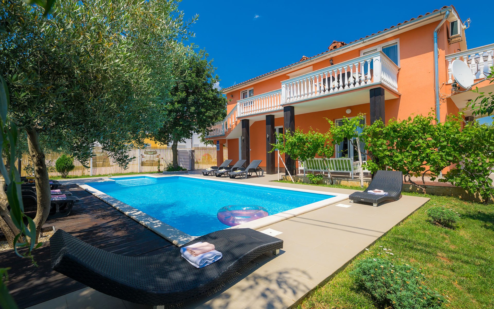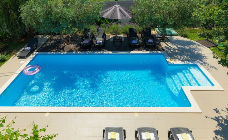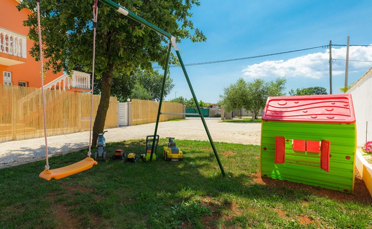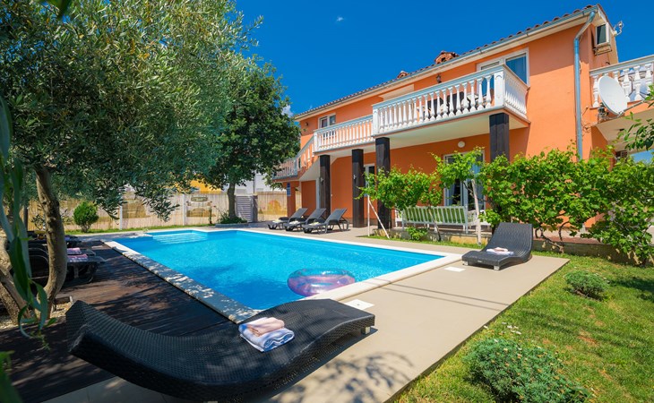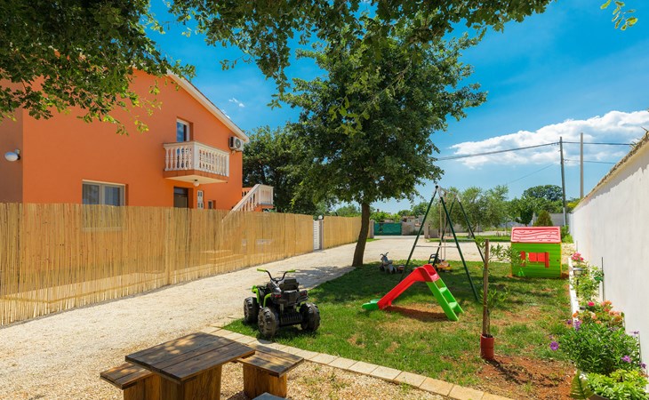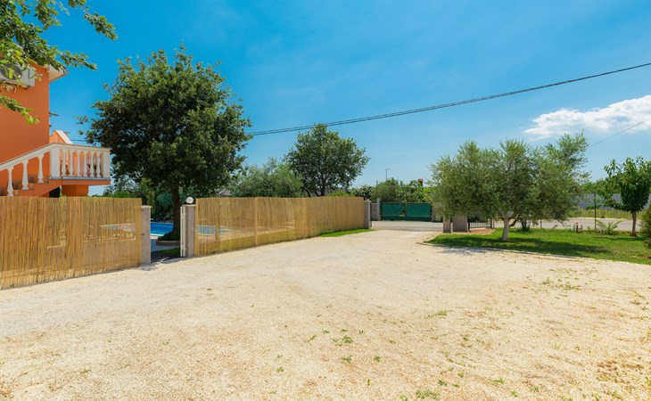 Single-family house "Neja", 2 storeys. In the hamlet Loborika 6 km from the centre of Marčana, 6 km from the centre of Pula, in a quiet, sunny position, 8 km from the sea. Private: property 500 m2 (fenced), garden with wildlife garden and trees, swimming pool angular (8 x 4 m, depth 140 cm, seasonal availability: 29.Apr. - 07.Oct.) with internal staircase. Shower/WC in the pool area, outdoor shower, terrace (30 m2), garden furniture, barbecue (swing). In the house: internet access, washing machine. Parking at the house. Shop 1.5 km, supermarket 4 km, restaurant 2 km, café 1.5 km, bus stop 1.4 km, sandy beach 17 km pebble beach 10 km. Tennis 15 km, riding stable 5 km, walking paths from the house 100 m, cycle lane 150 m. Nearby attractions: Amphitheater 8 km, National park Brijuni 13 km, Nature park Rt. Kamenjak 18 km. Groups of teenagers on request only. By groups of young people double deposit is requested on arrival. The house consists of 3 apartments rented as one unit: one apartment on the ground floor and two apartments on the first floor.