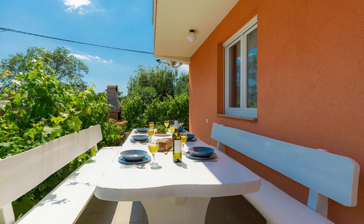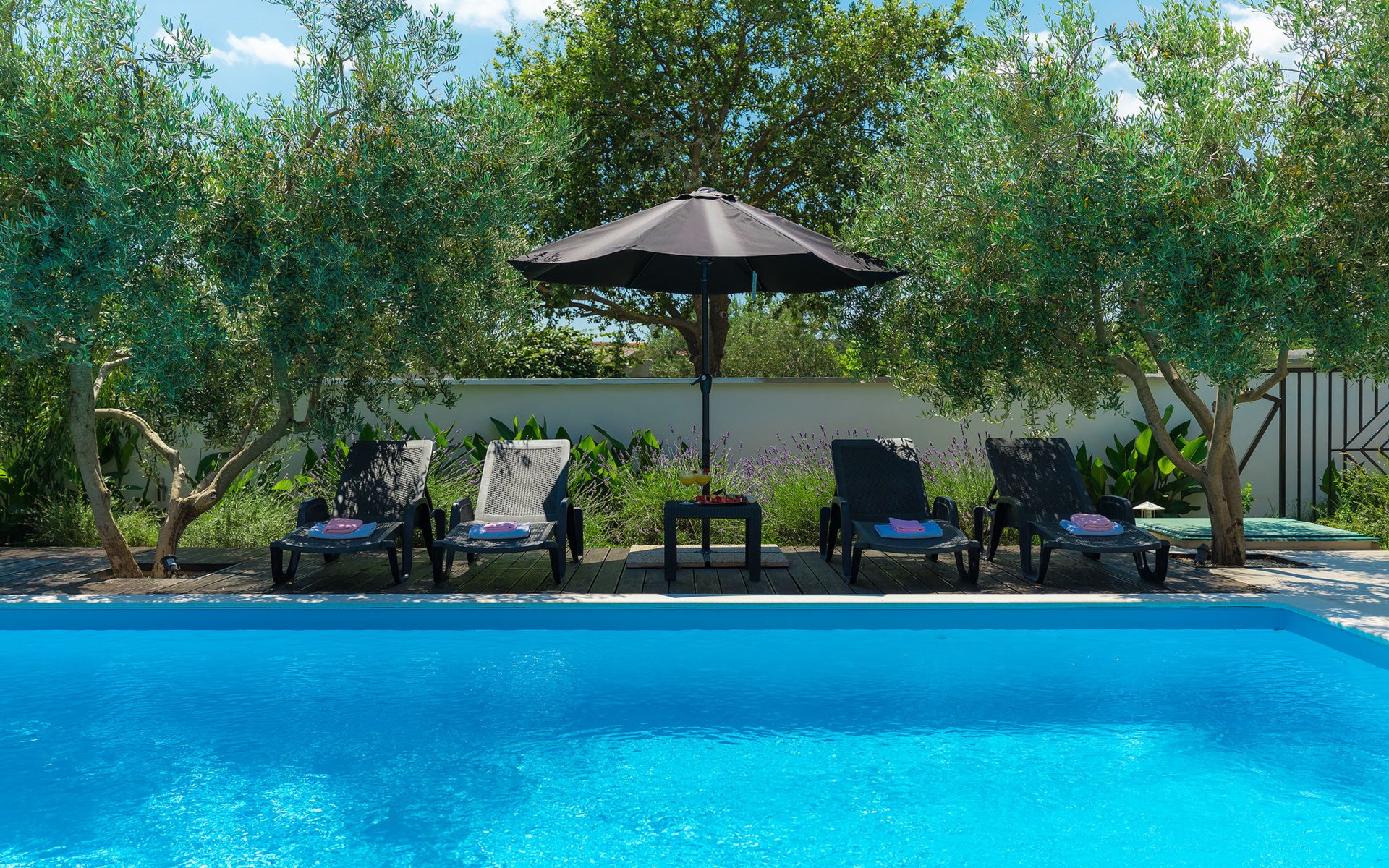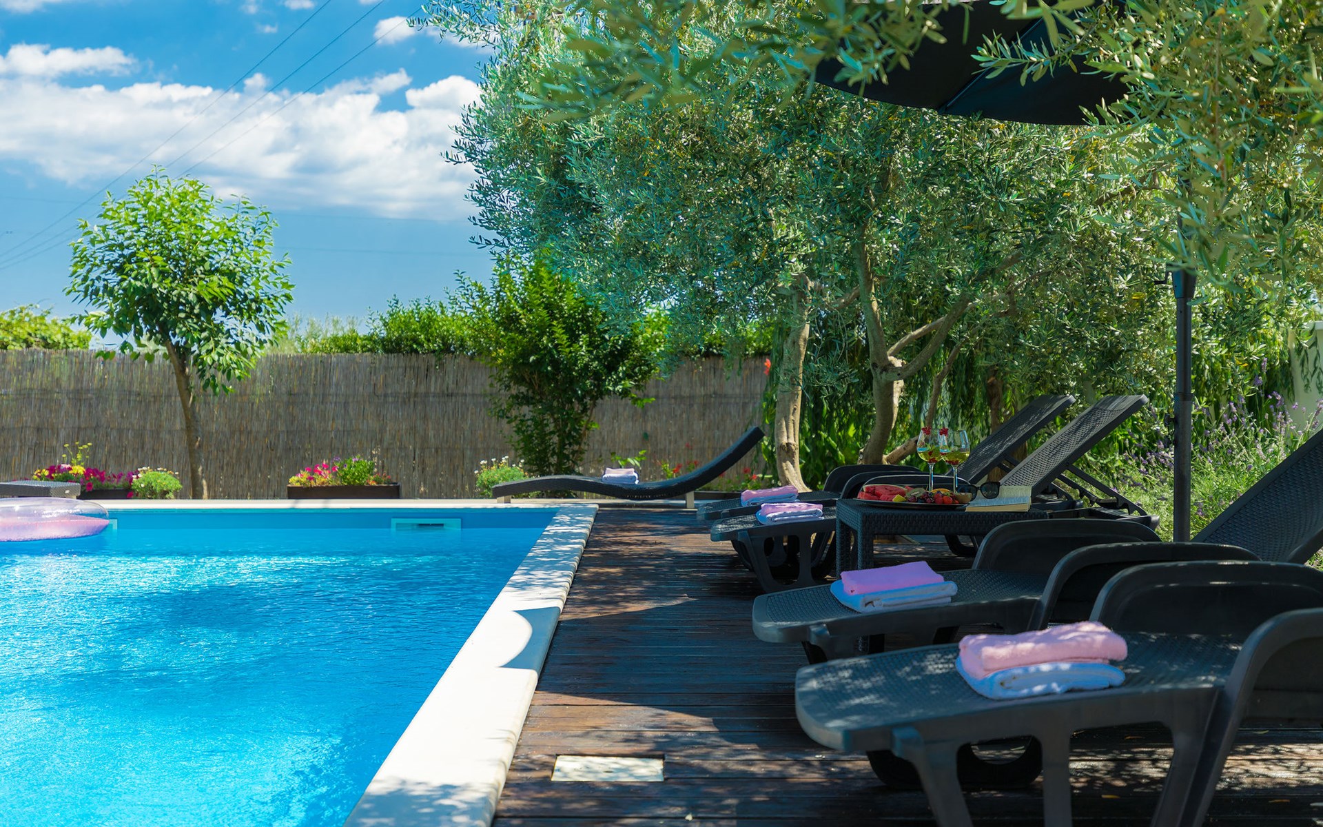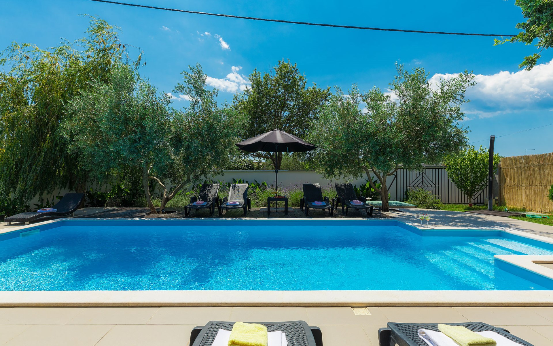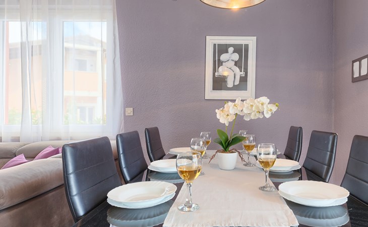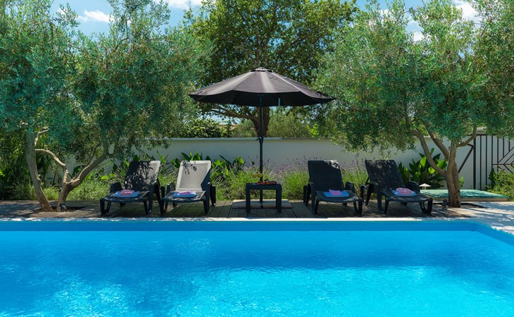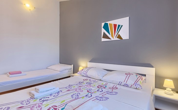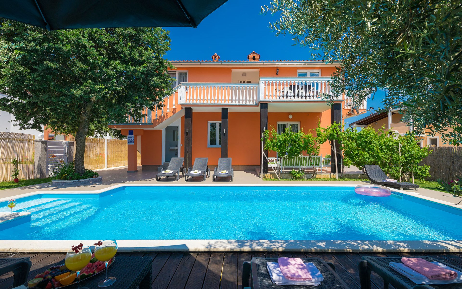 Single-family house "Neja", 2 storeys. In the hamlet Loborika 6 km from the centre of Marčana, 6 km from the centre of Pula, in a quiet, sunny position, 8 km from the sea. Private: property 500 m2 (fenced), garden with wildlife garden and trees, swimming pool angular (8 x 4 m, depth 140 cm, seasonal availability: 29.Apr. - 07.Oct.) with internal staircase. Shower/WC in the pool area, outdoor shower, terrace (30 m2), garden furniture, barbecue (swing). In the house: internet access, washing machine. Parking at the house. Shop 1.5 km, supermarket 4 km, restaurant 2 km, café 1.5 km, bus stop 1.4 km, sandy beach 17 km pebble beach 10 km. Tennis 15 km, riding stable 5 km, walking paths from the house 100 m, cycle lane 150 m. Nearby attractions: Amphitheater 8 km, National park Brijuni 13 km, Nature park Rt. Kamenjak 18 km. Groups of teenagers on request only. By groups of young people double deposit is requested on arrival. The house consists of 3 apartments rented as one unit: one apartment on the ground floor and two apartments on the first floor.