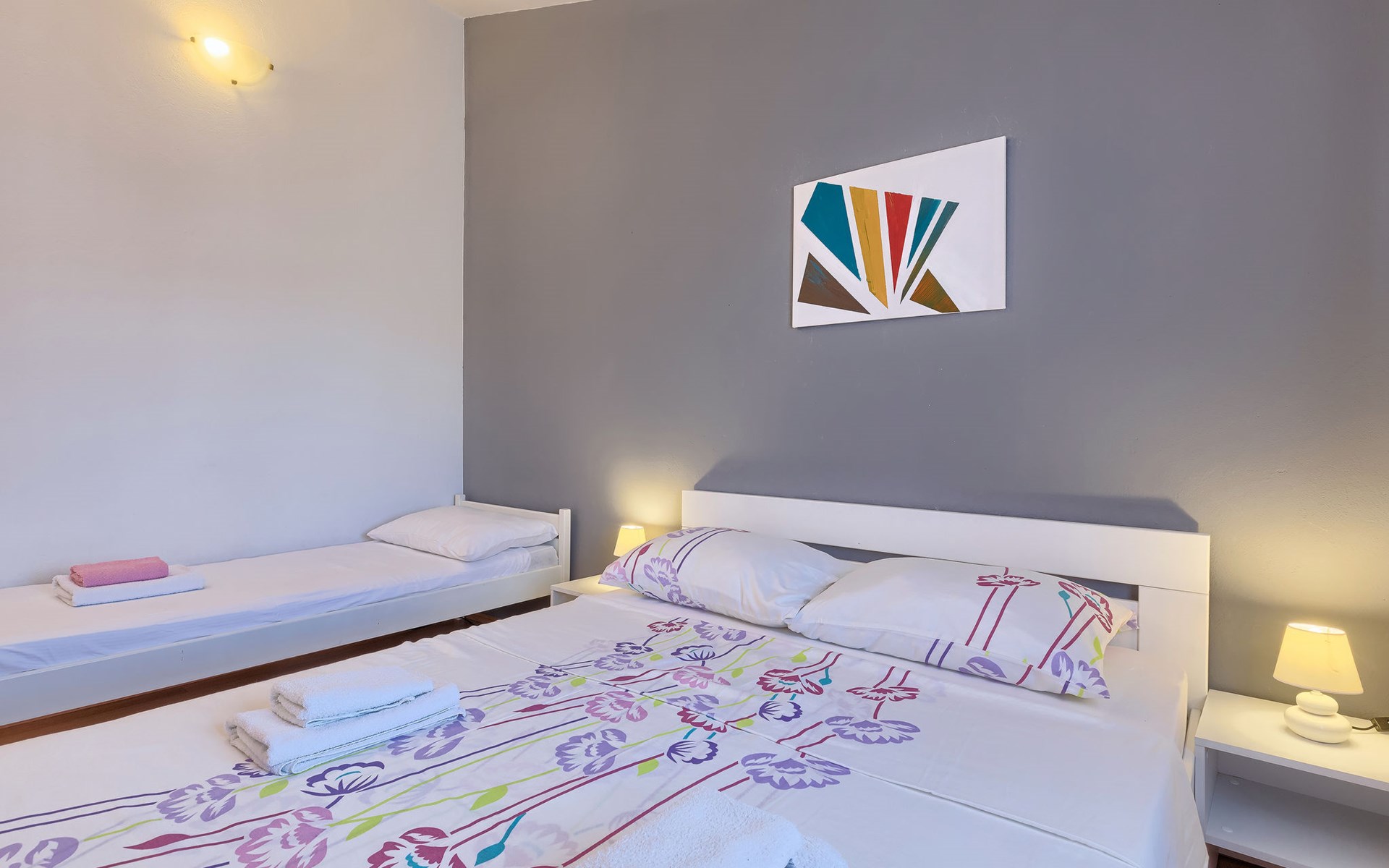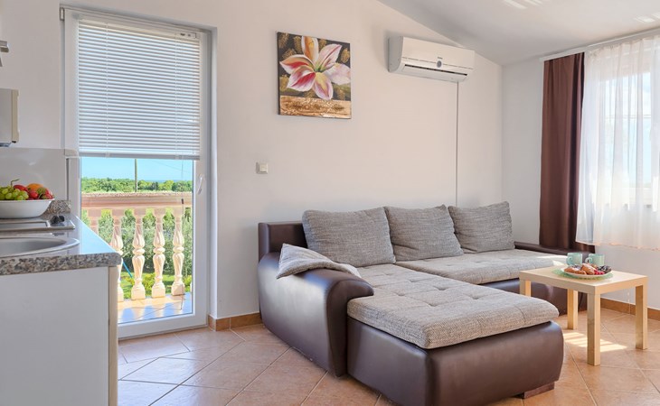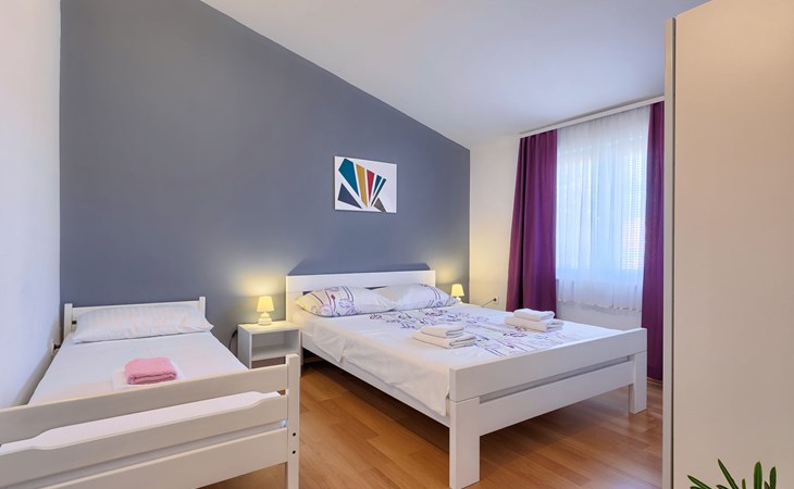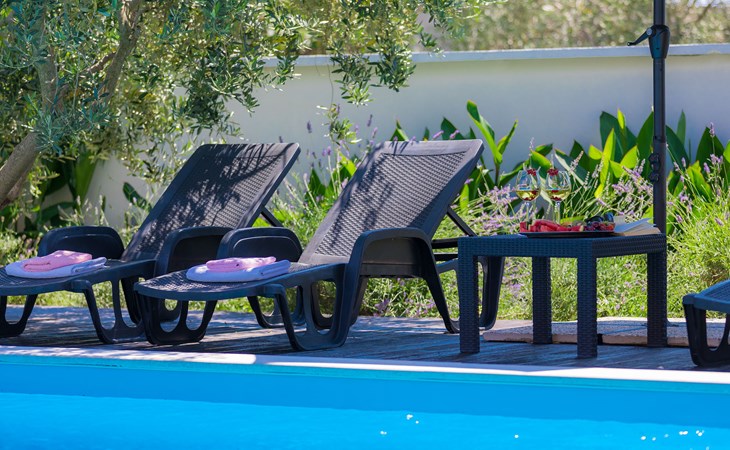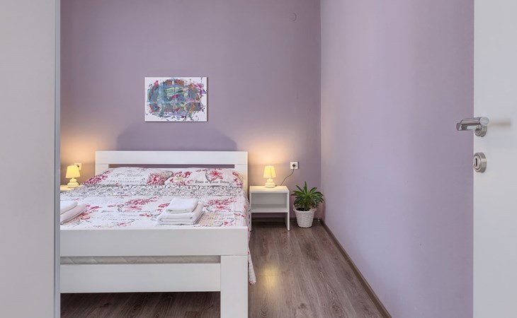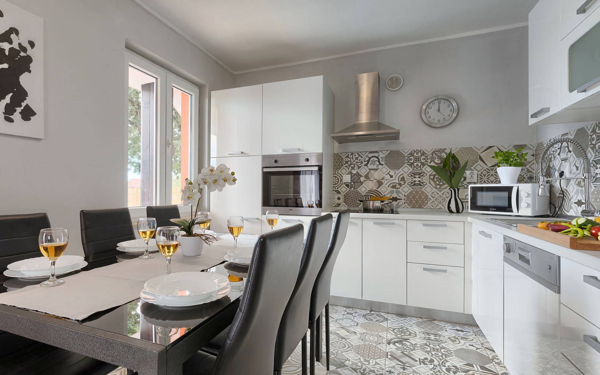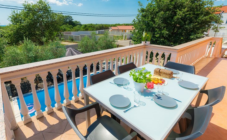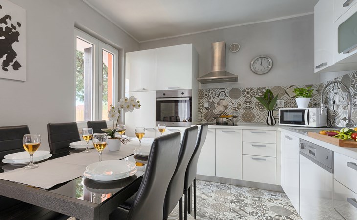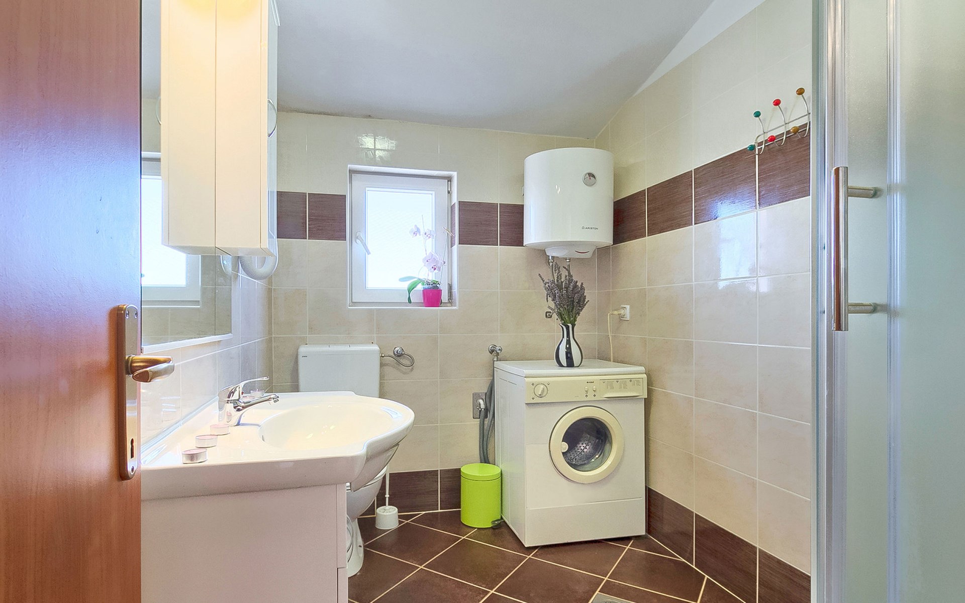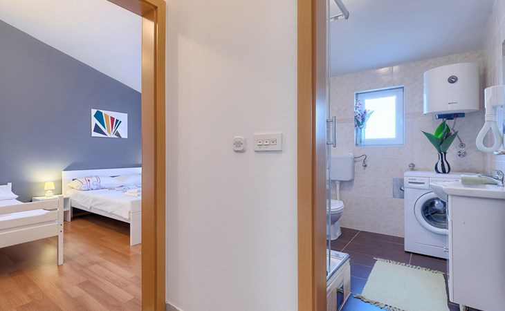 Single-family house "Neja", 2 storeys. In the hamlet Loborika 6 km from the centre of Marčana, 6 km from the centre of Pula, in a quiet, sunny position, 8 km from the sea. Private: property 500 m2 (fenced), garden with wildlife garden and trees, swimming pool angular (8 x 4 m, depth 140 cm, seasonal availability: 29.Apr. - 07.Oct.) with internal staircase. Shower/WC in the pool area, outdoor shower, terrace (30 m2), garden furniture, barbecue (swing). In the house: internet access, washing machine. Parking at the house. Shop 1.5 km, supermarket 4 km, restaurant 2 km, café 1.5 km, bus stop 1.4 km, sandy beach 17 km pebble beach 10 km. Tennis 15 km, riding stable 5 km, walking paths from the house 100 m, cycle lane 150 m. Nearby attractions: Amphitheater 8 km, National park Brijuni 13 km, Nature park Rt. Kamenjak 18 km. Groups of teenagers on request only. By groups of young people double deposit is requested on arrival. The house consists of 3 apartments rented as one unit: one apartment on the ground floor and two apartments on the first floor.