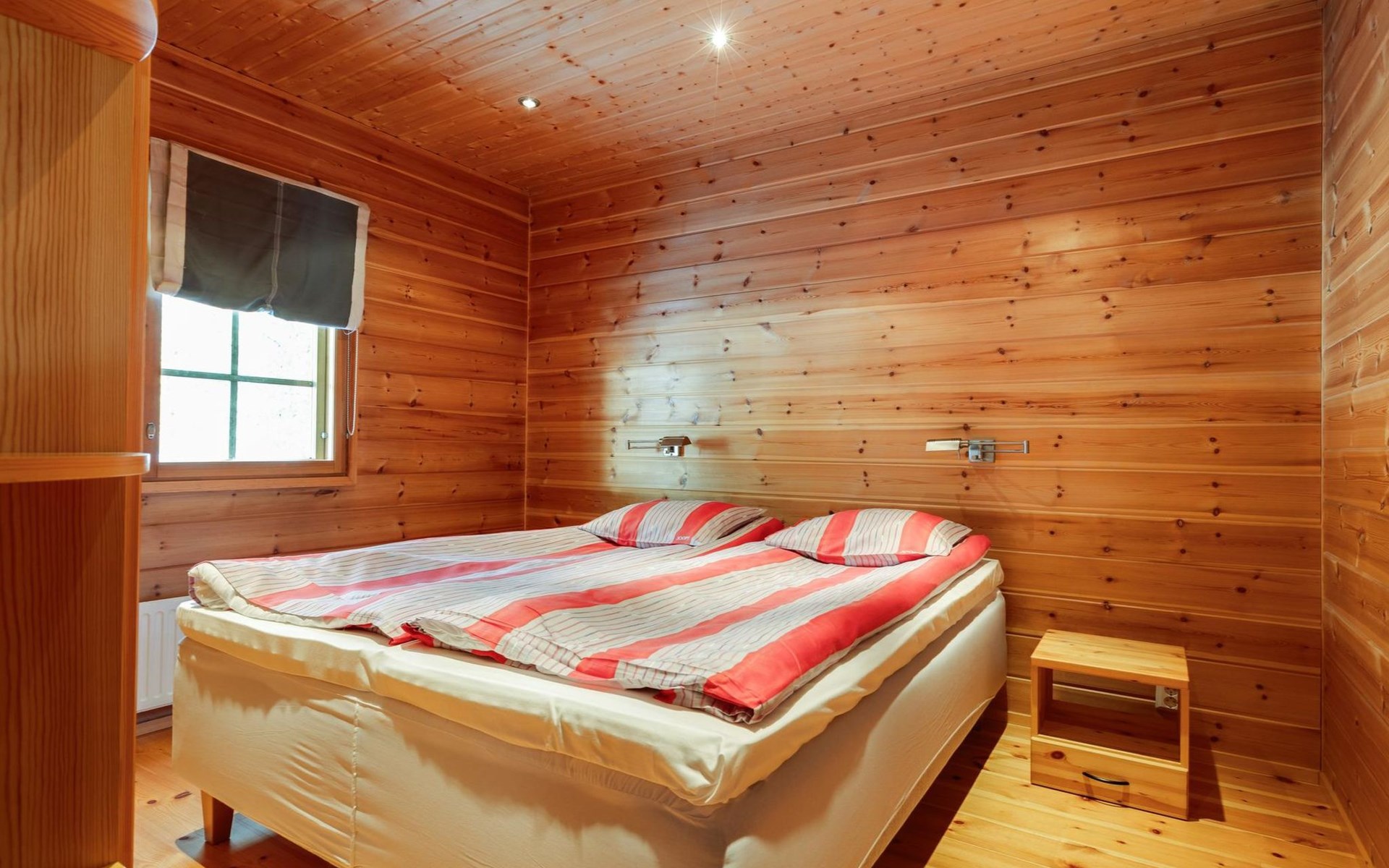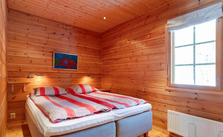 Log cabin, inner walls are paneled, built in 2002. Living room/kitchen, 2 bedrooms, both with double bed (width 200 cm and 180 cm), downstairs there is also a sofa bed (bed size 140x190cm).