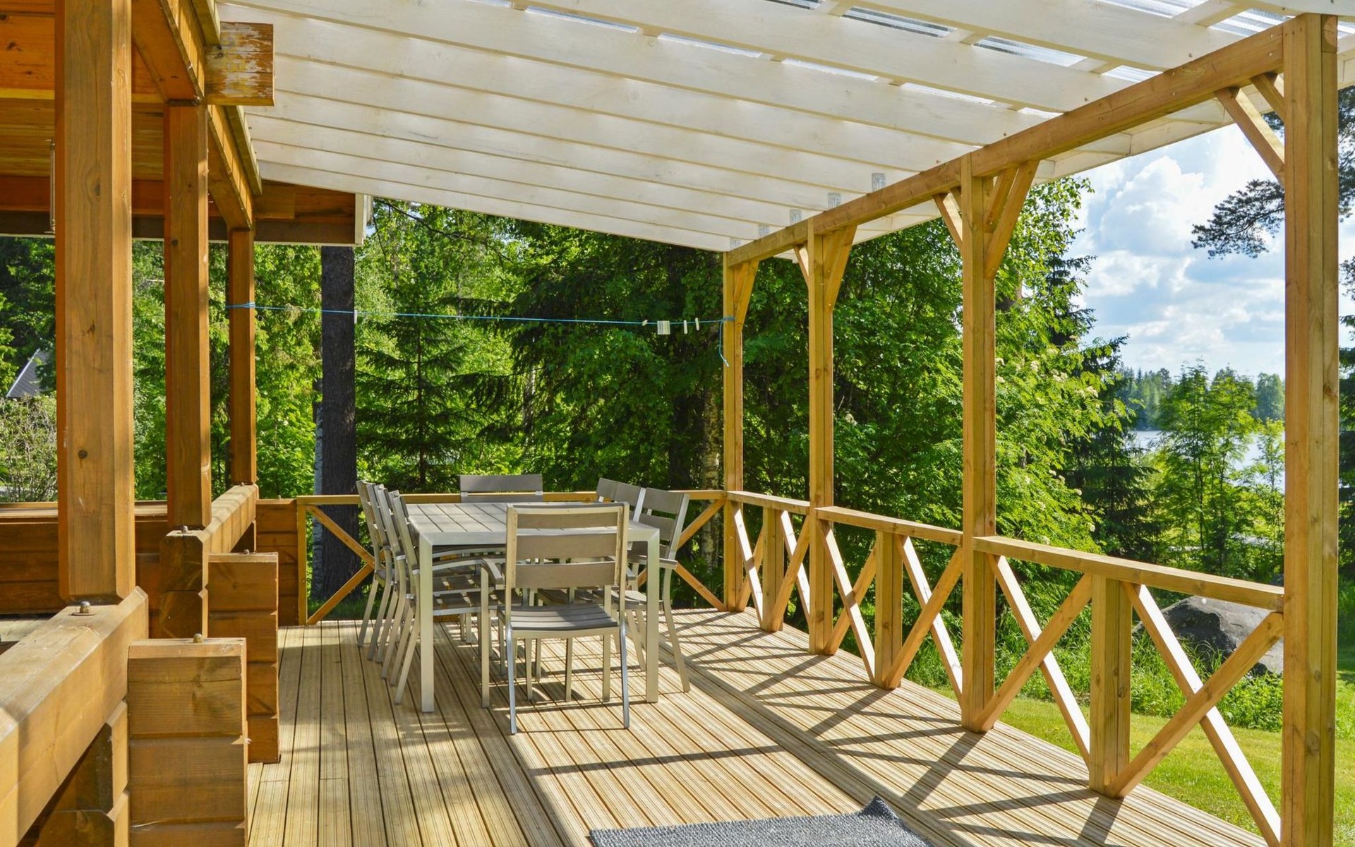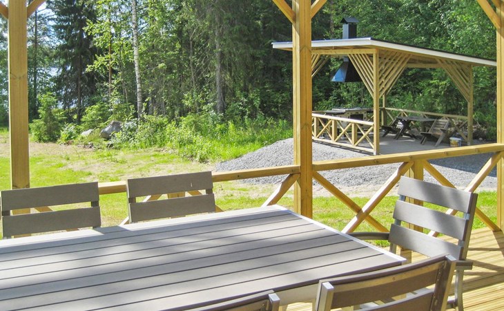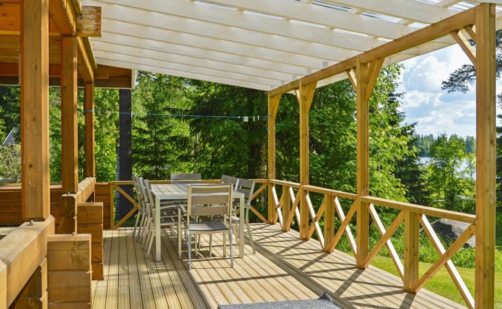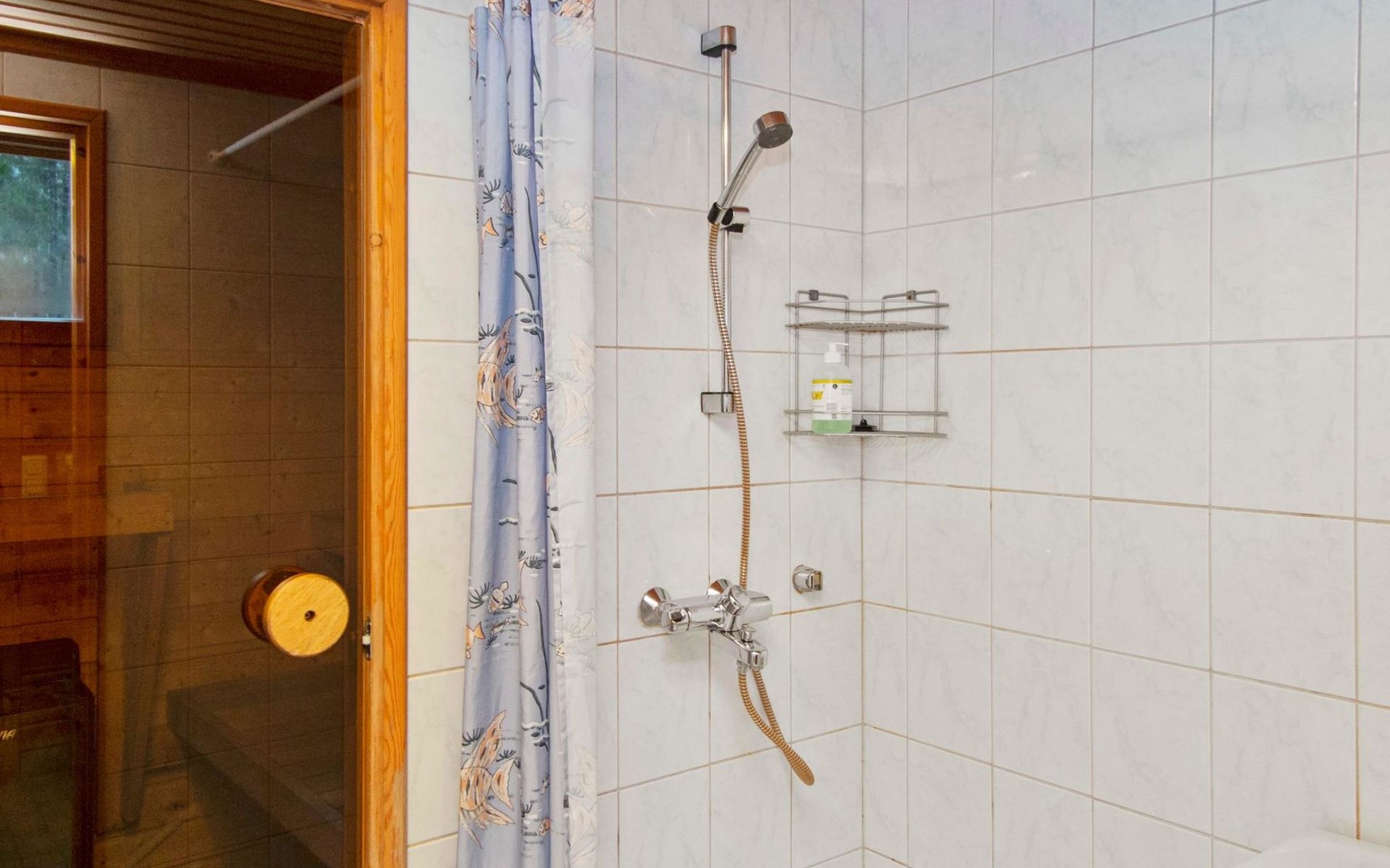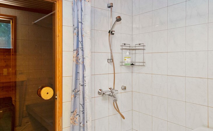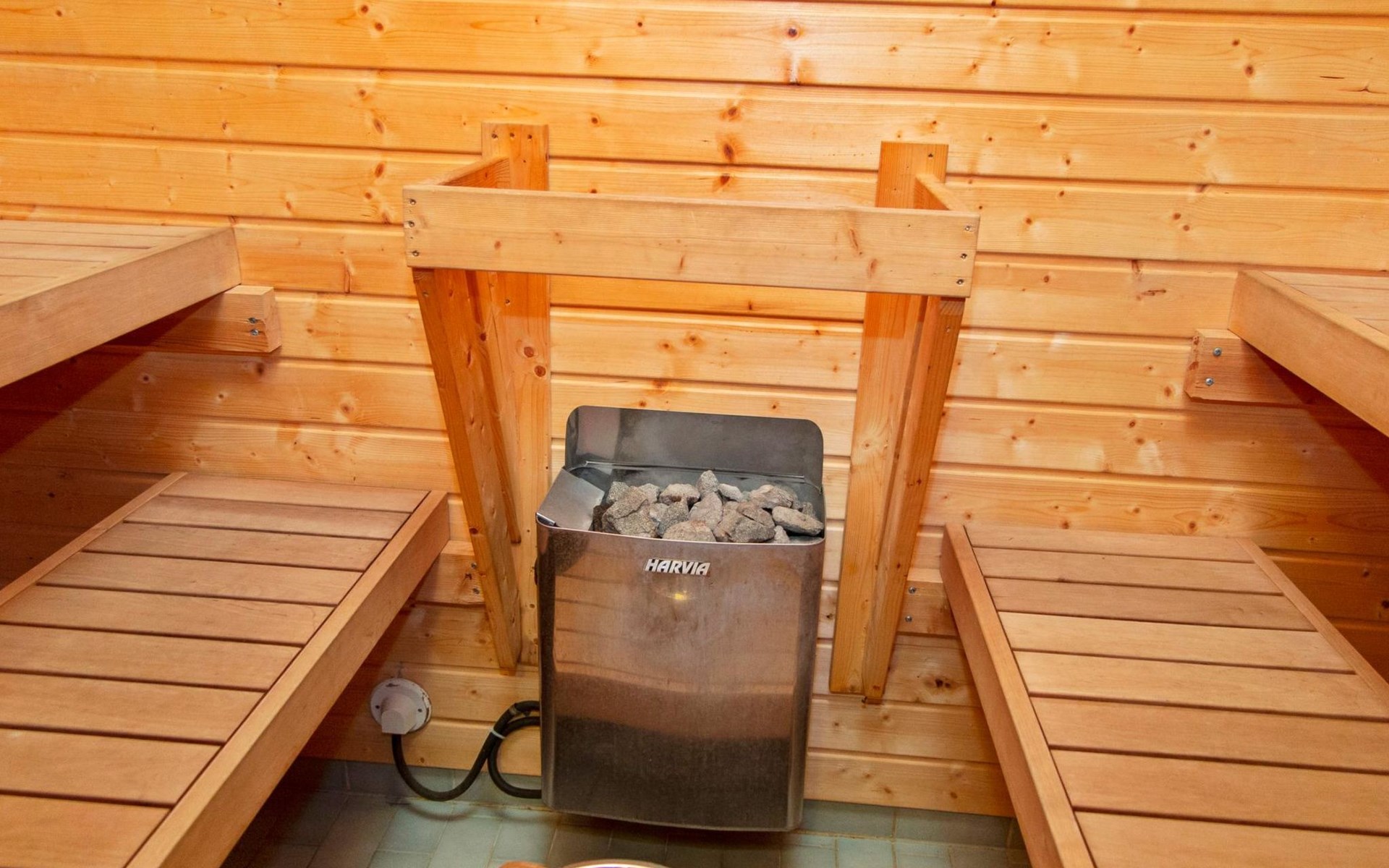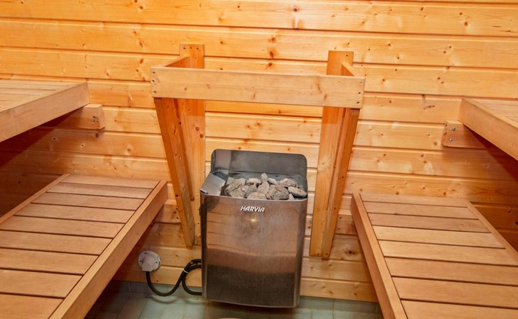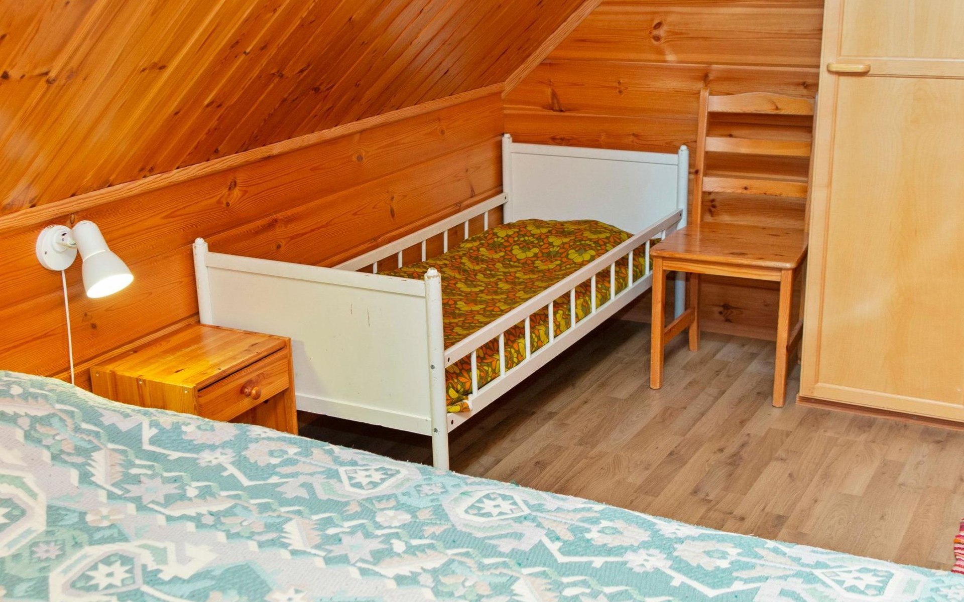 In upper floor 2 bedrooms with 2 beds in each, bed room 3 beds, dressing room, washroom, sauna (electric sauna stove), terrace. For children safety gates on stairs.
