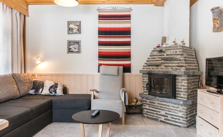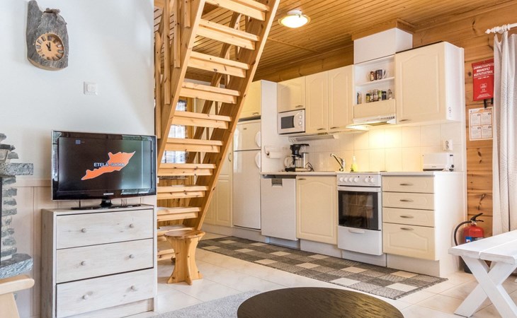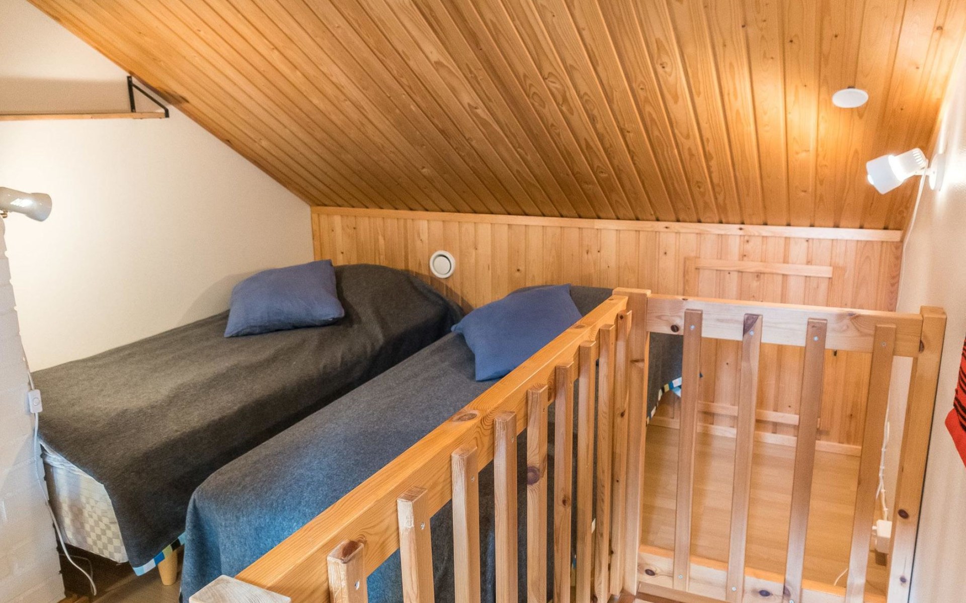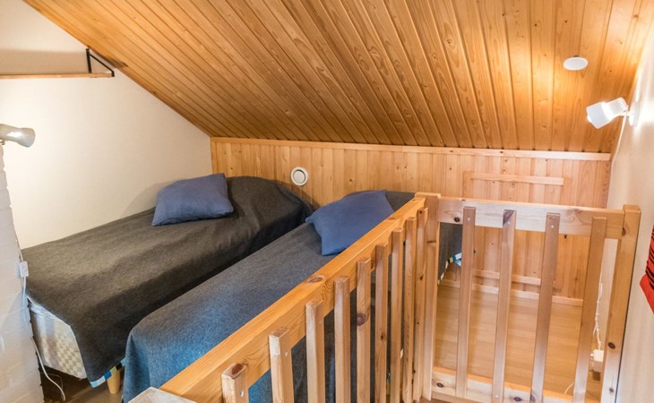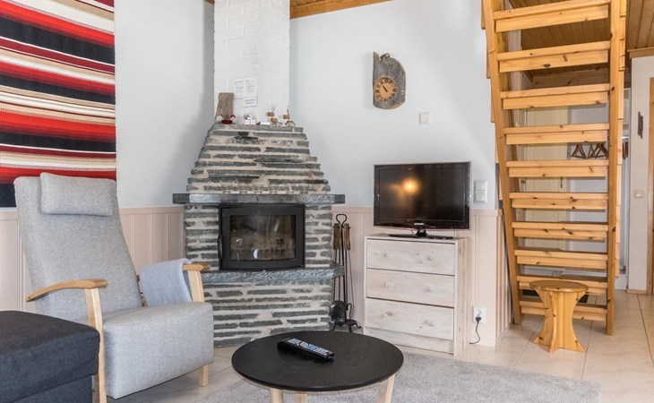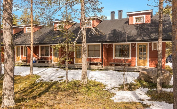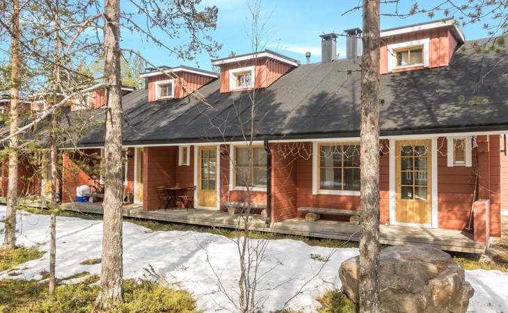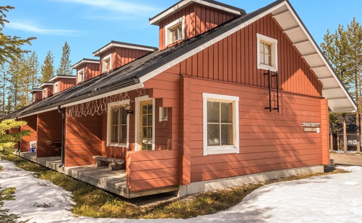 Log-built gable apartment in a row house, built in 2002. Living room/kitchen with sofa bed, sleeping alcove with 2 beds in connection with loft, 2 beds in loft, steep stairs to the loft, sauna, washroom/WC, shower cubicle in washroom, small terrace and storage.