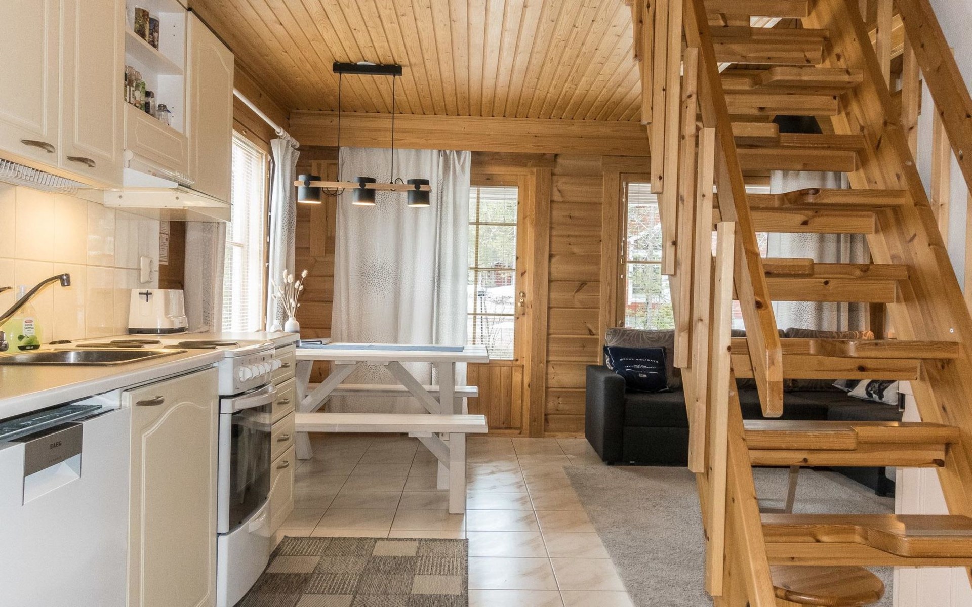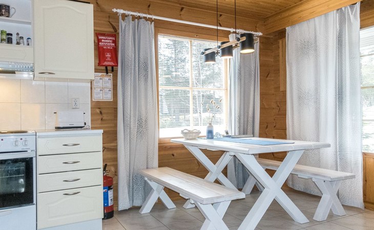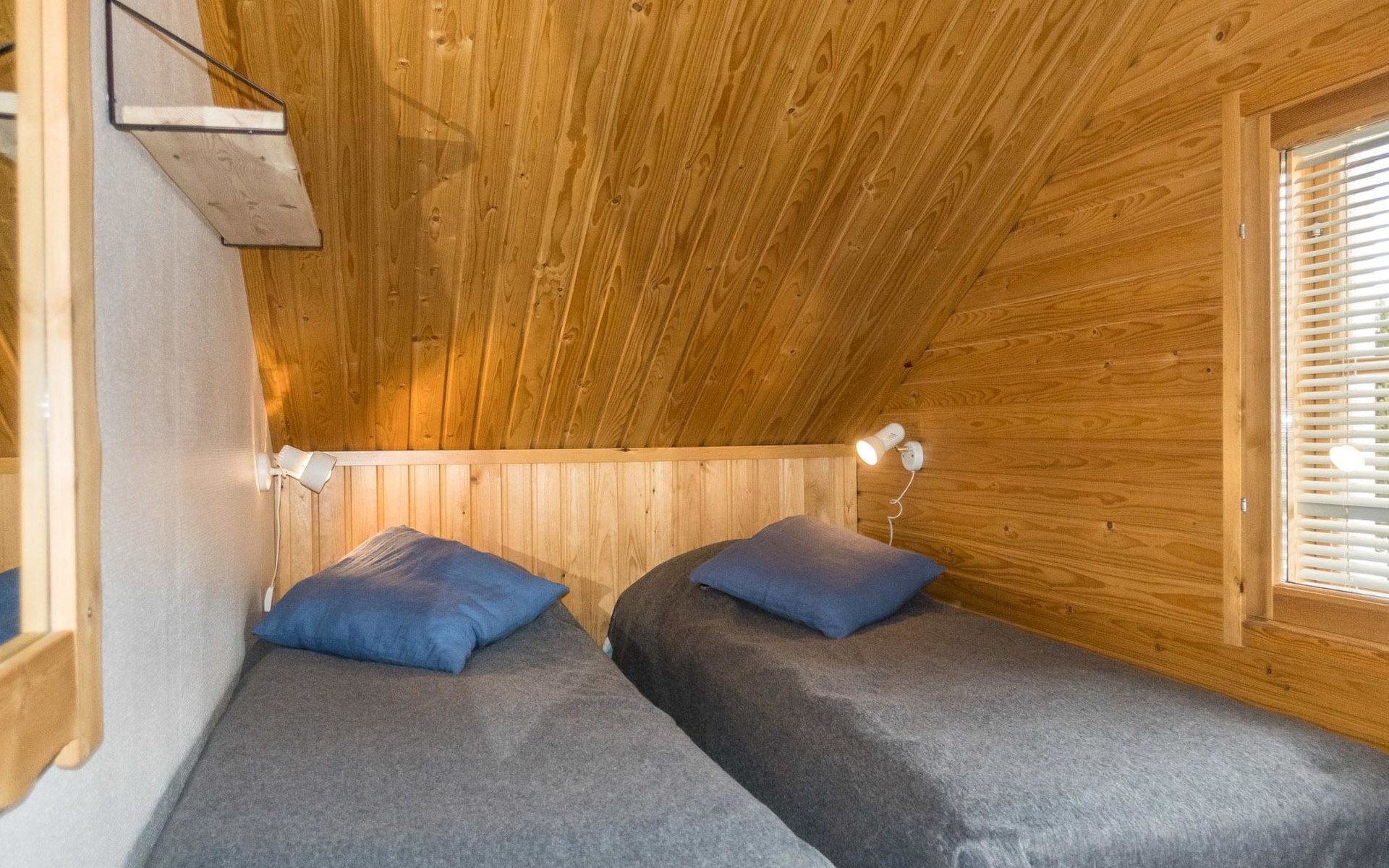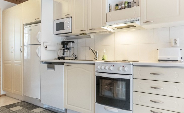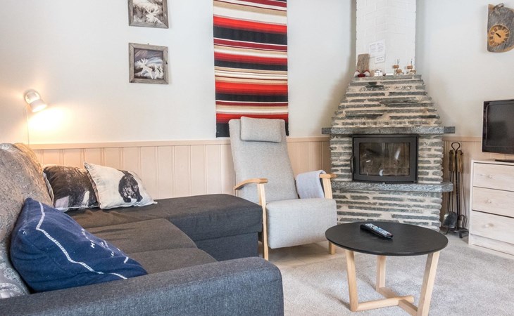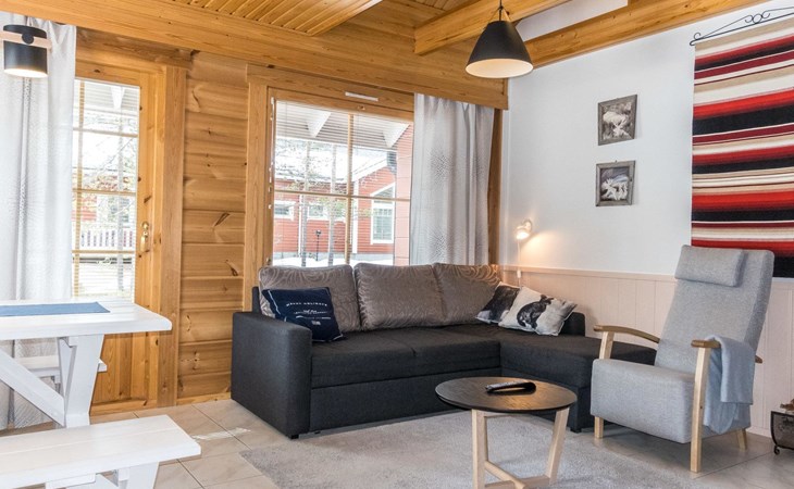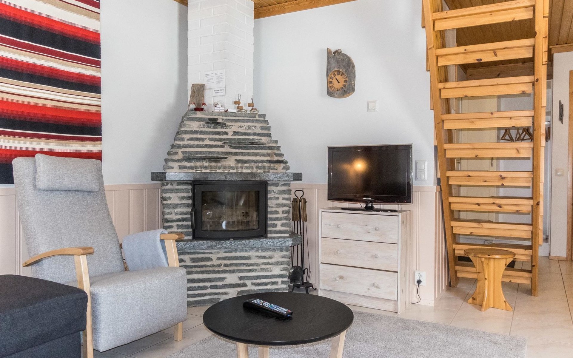 Log-built gable apartment in a row house, built in 2002. Living room/kitchen with sofa bed, sleeping alcove with 2 beds in connection with loft, 2 beds in loft, steep stairs to the loft, sauna, washroom/WC, shower cubicle in washroom, small terrace and storage.