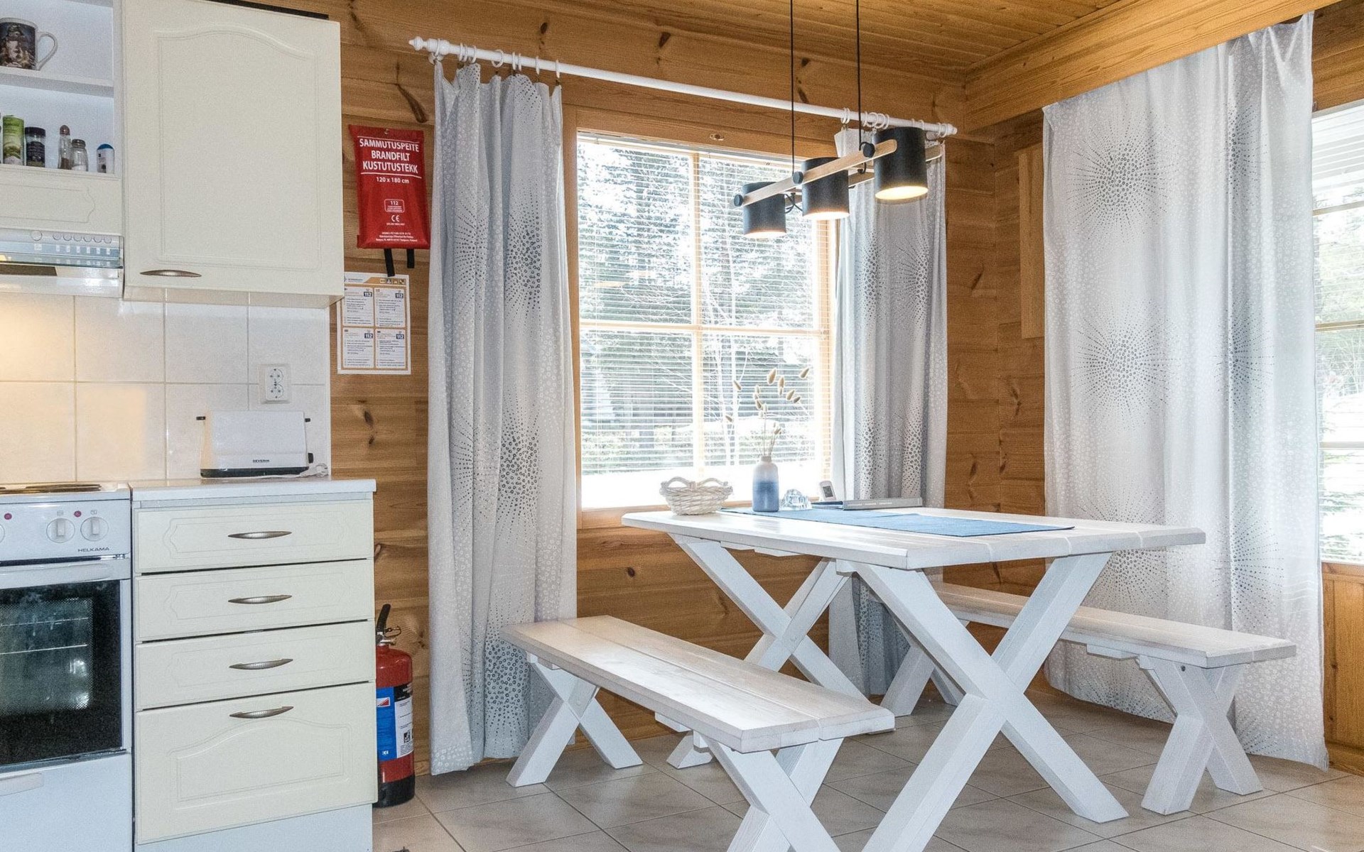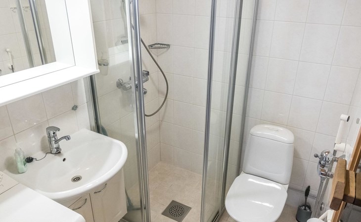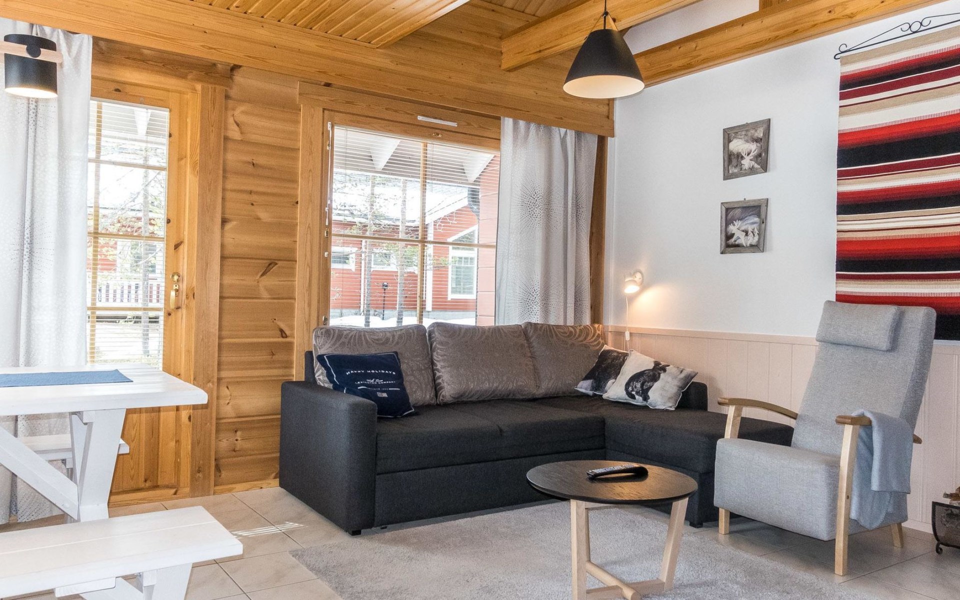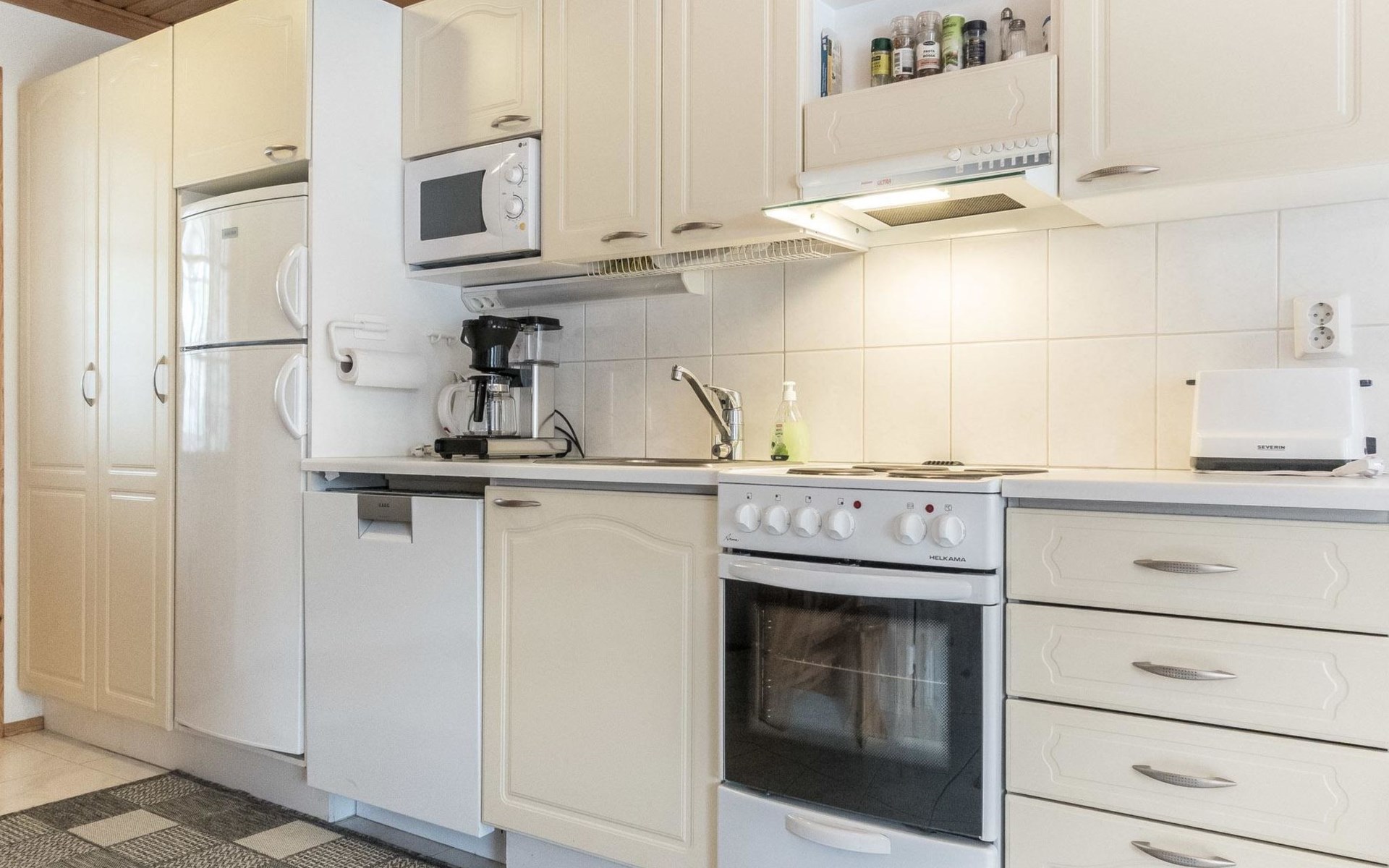 Log-built gable apartment in a row house, built in 2002. Living room/kitchen with sofa bed, sleeping alcove with 2 beds in connection with loft, 2 beds in loft, steep stairs to the loft, sauna, washroom/WC, shower cubicle in washroom, small terrace and storage.
